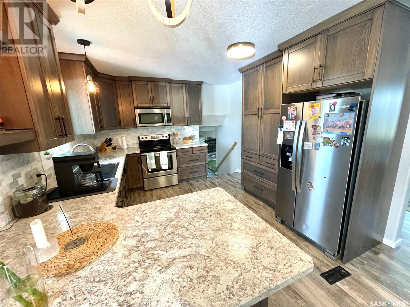 Do not miss out on this four level family home located in Fairview Heights North Battleford. This 1189 square foot 4 bedroom home features stainless appliances, fireplace, hot tub, and newer furnace and windows. The lowest level has a bedroom/office, hot tub room, utility room, and recreation room. The second level offers a large family room with fireplace, office/bedroom, and laundry room with access to the back yard. On the main level you will enjoy the newly renovated kitchen, living room, and dining room with access to a composite constructed deck from the dining area. The upper level has three bedrooms, a four piece bath, and the master bedroom has a three piece ensuite. The back yard has been freshly landscaped with a two car garage and is across the street from a community play ground area. Recent upgrades include flooring, kitchen, paint, and central A/C. Call today for more information. (id:43042)