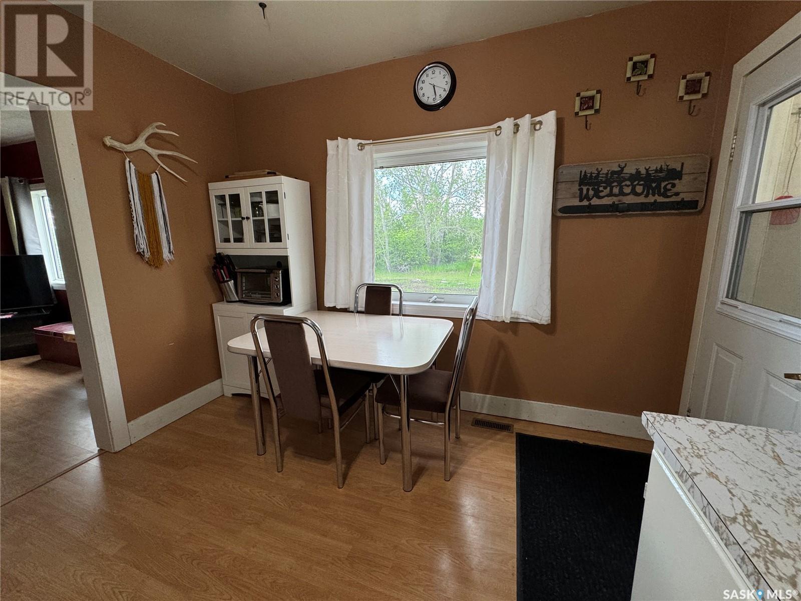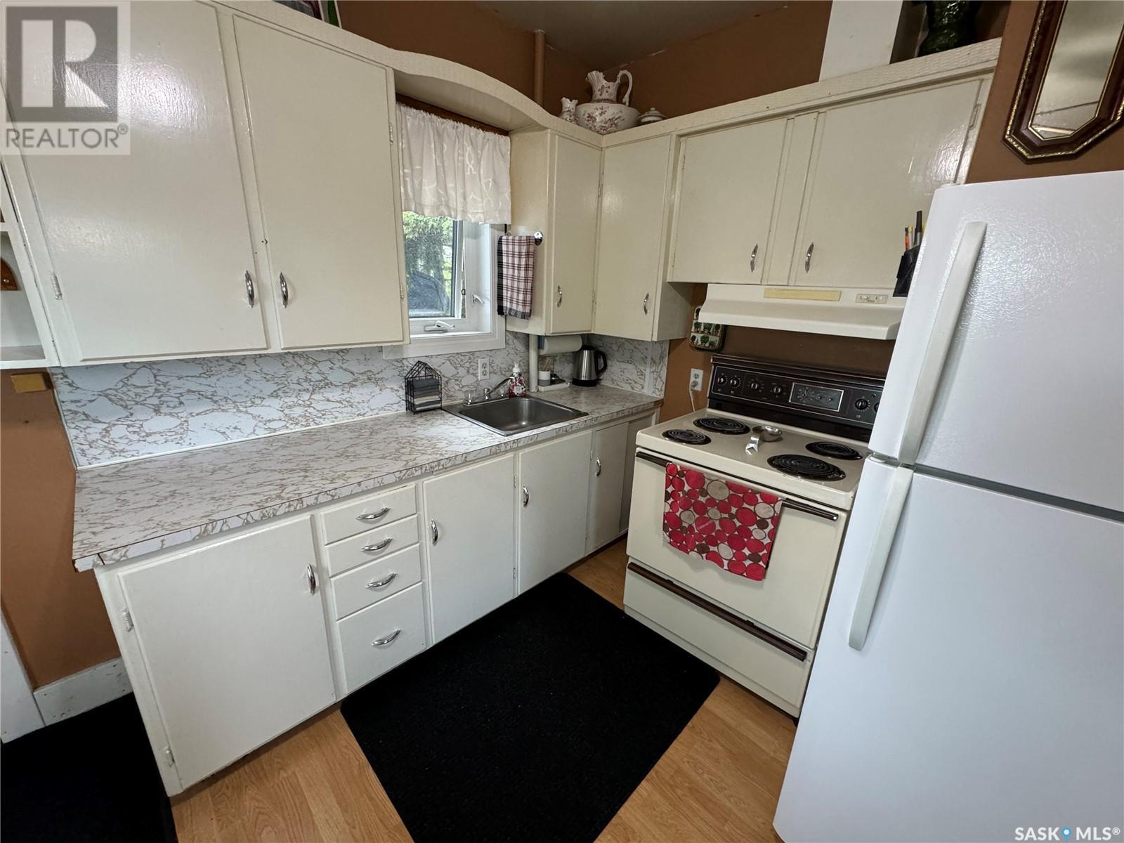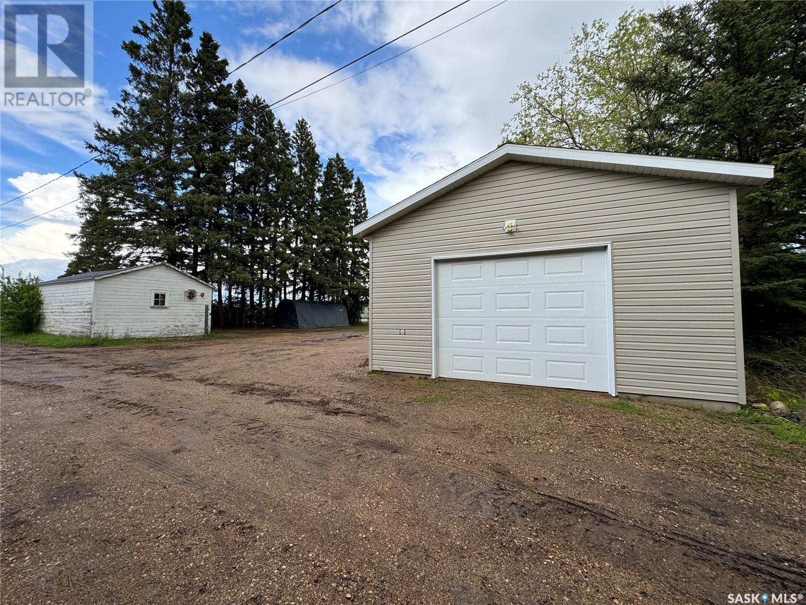 Welcome to Hyas SK! Are you looking for an acreage within a village? The feel of this property gives you the loveliness of having an acreage with town/village amenities! This affordable home has excellent options for the first time home buyer, someone who would like to retire and/or downsize, or an someone that would like an income property. This property could get around $800 per month rent. The extra large double lot comes with a 575 square foot home with natural gas, town water, and town sewer. The main entrance of the property starts off with a porch area that leads into the dining room/kitchen area. Kitchen window faces west and includes fridge and stove. The dining room area window faces south. A few steps over will take you to the living room with east and south facing windows. The main floor is completed with 2 bedrooms and a main bathroom. The basement is used for storage and houses the HE furnace (new heat exchange) and water heater (2020). Panel box is 100amp service. Windows are updated PVC. The yard has been freshly landscaped with brand new grass. The fully insulated garage garage is 20x40 has 200 amp service. Garage/Shop is heated with electric heat and optional wood heat in the 2nd part. A short drive to Sturgis, Norquay, and Crystal Lake for all your basic needs. One hour drive to Yorkton SK (city). This area is surrounded by beautiful scenery and lakes within a half hour drive in each direction. This home is not for rent or rent to own. (id:43042)