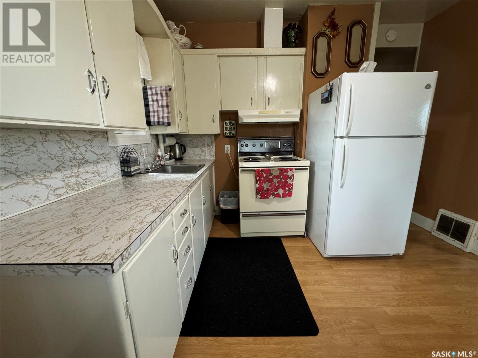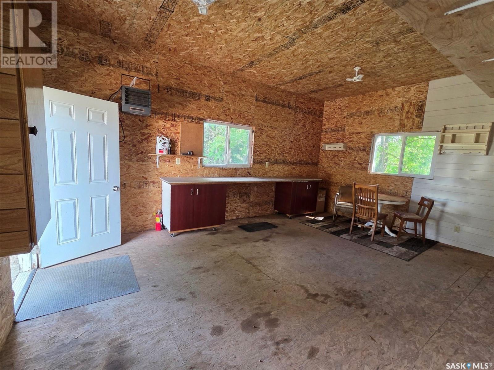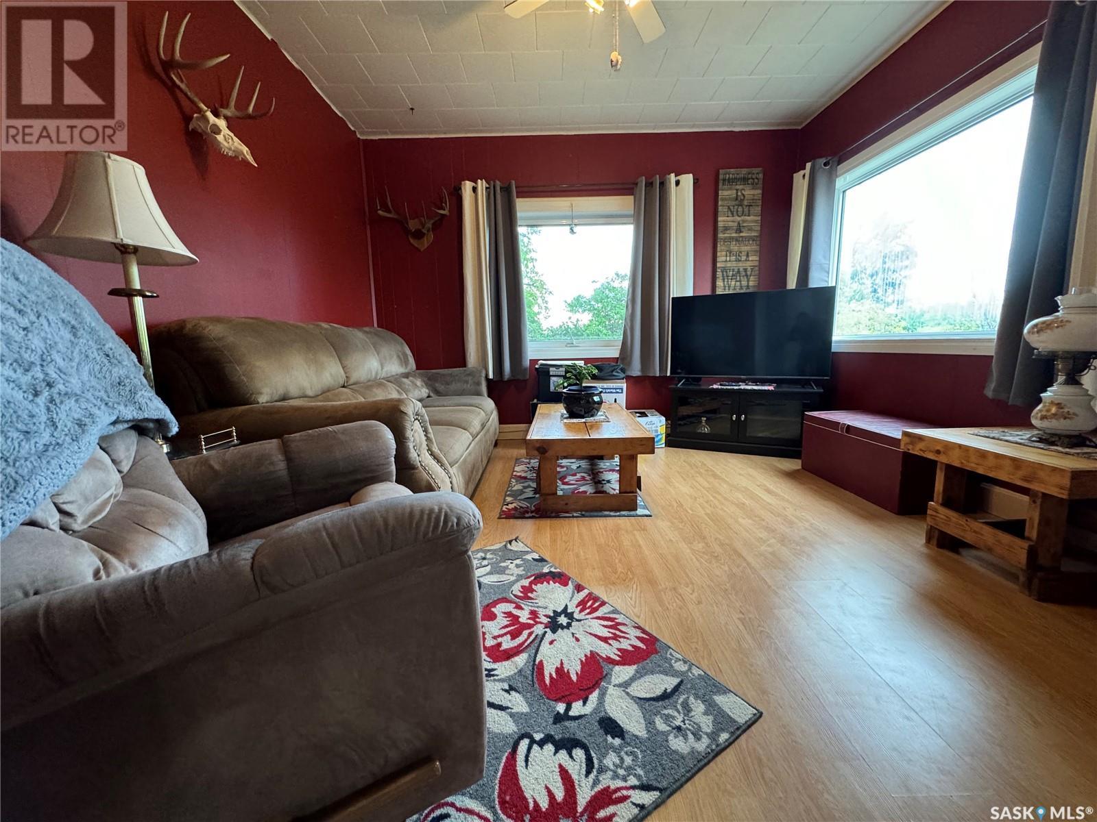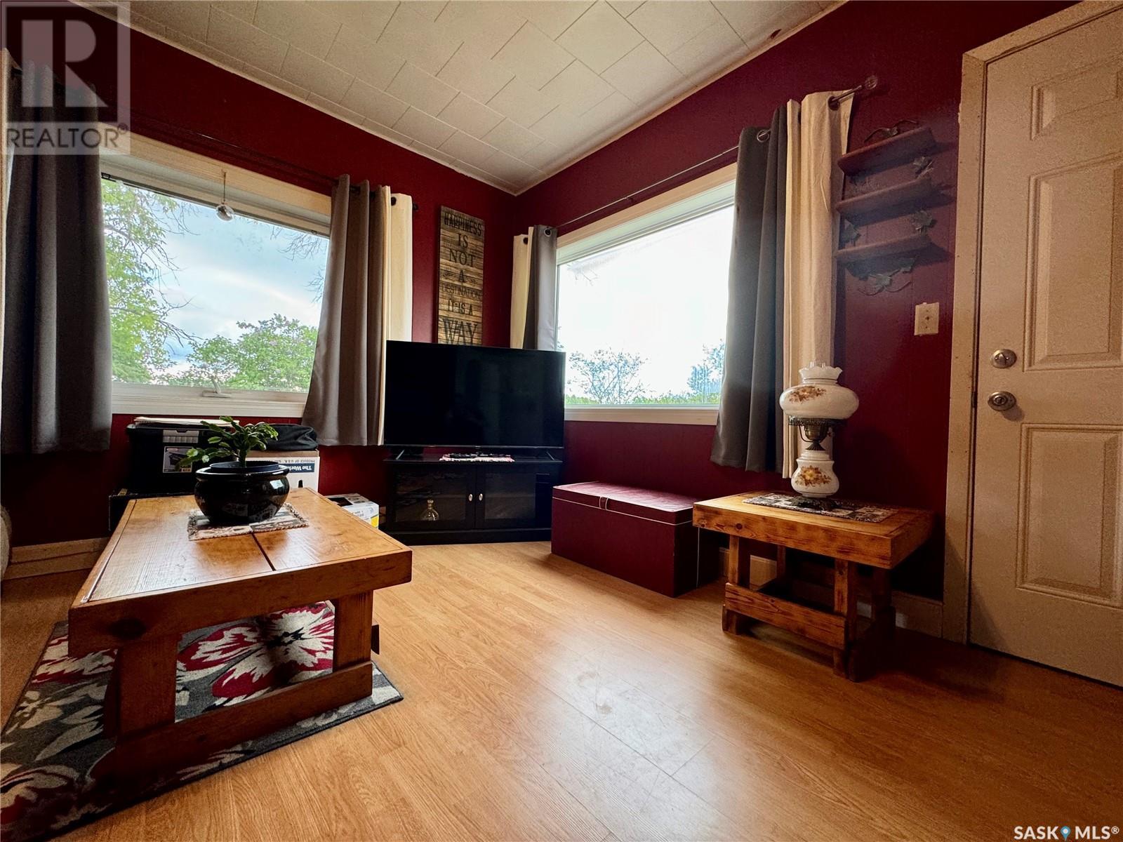 Welcome to Hyas SK! Are you looking for an acreage within a village? The feel of this property gives you the loveliness of having an acreage with town/village amenities! This affordable home has excellent options for the first time home buyer, someone who would like to retire and/or downsize, or an someone that would like an income property. This property could get around $800 per month rent. The extra large double lot comes with a 575 square foot home with natural gas, town water, and town sewer. The main entrance of the property starts off with a porch area that leads into the dining room/kitchen area. Kitchen window faces west and includes fridge and stove. The dining room area window faces south. A few steps over will take you to the living room with east and south facing windows. The main floor is completed with 2 bedrooms and a main bathroom. The basement is used for storage and houses the HE furnace (new heat exchange) and water heater (2020). Panel box is 100amp service. Windows are updated PVC. The yard has been freshly landscaped with brand new grass. The fully insulated garage garage is 20x40 has 200 amp service. Garage/Shop is heated with electric heat and optional wood heat in the 2nd part. A short drive to Sturgis, Norquay, and Crystal Lake for all your basic needs. One hour drive to Yorkton SK (city). This area is surrounded by beautiful scenery and lakes within a half hour drive in each direction. This home is not for rent or rent to own. (id:43042)