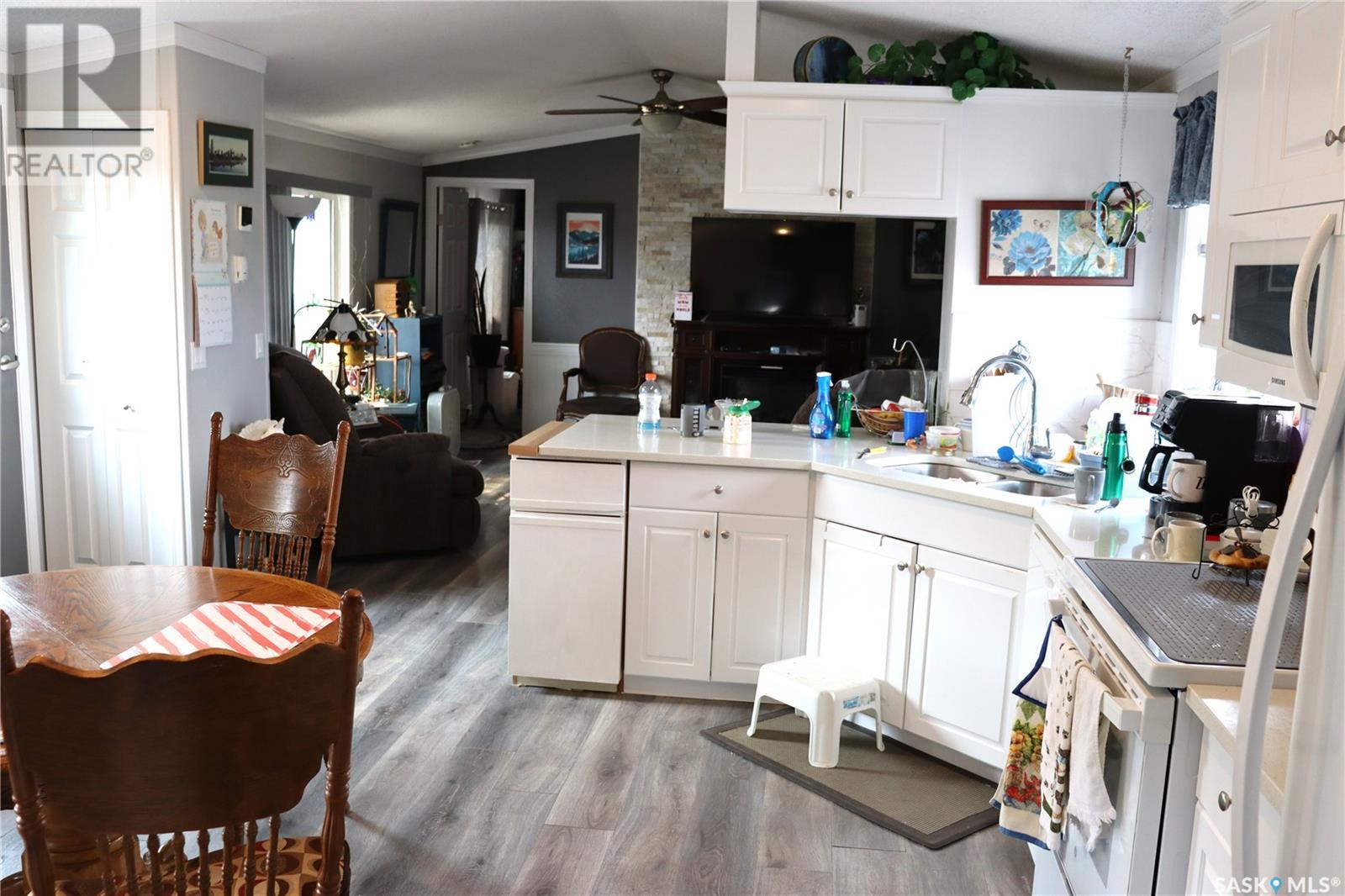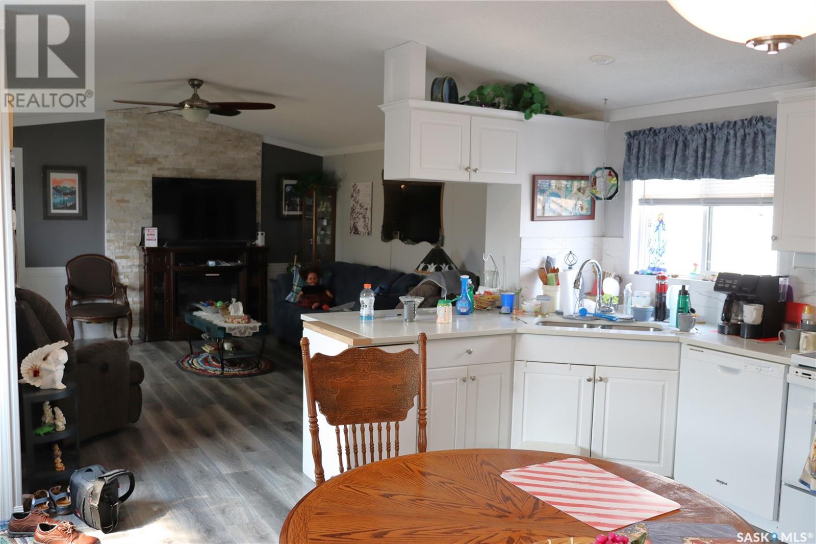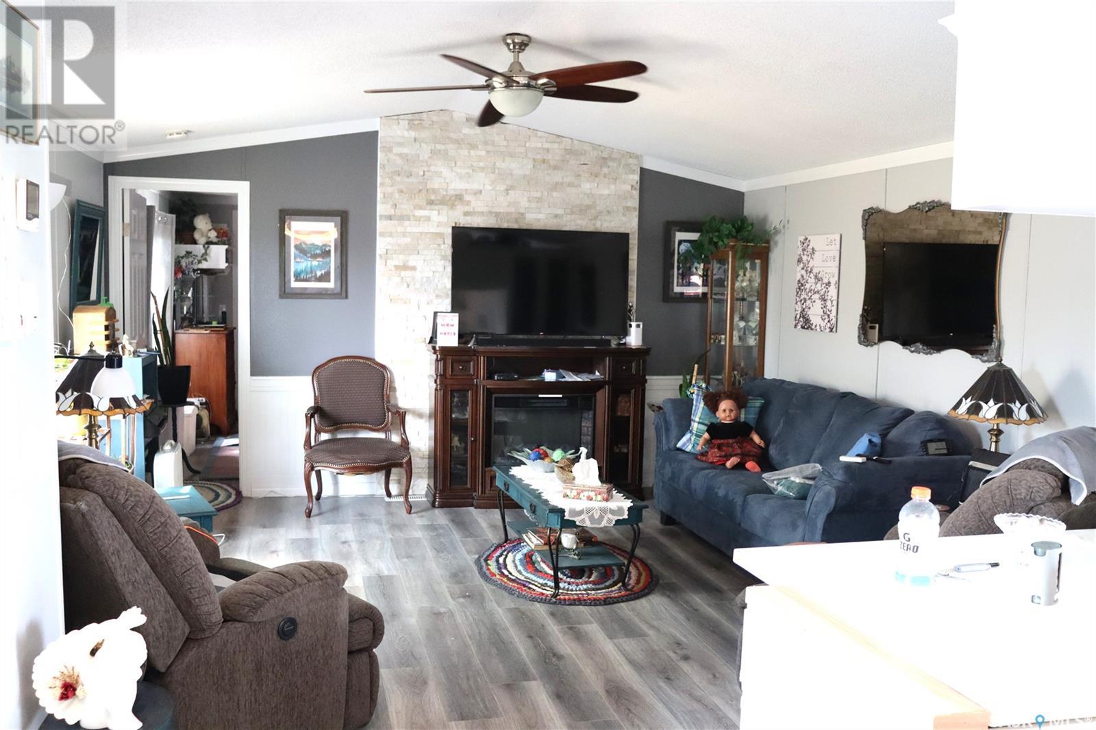 Welcome to this spacious 3-bedroom, 2-bathroom mobile home offering both comfort and convenience. As you enter, you're greeted by a generous entrance and storage area. Inside you will find a nice open concept kitchen/living room area featuring newer appliances, ample cabinetry, and a cozy dining area perfect for family meals. The primary suite boasts a nice sized closet and a 4-piece bath, ideal for relaxation after a long day. Two additional bedrooms and a 4-piece bath on the other end of the home provide flexibility for guests or a home office. Outside, enjoy the convenience of a low-maintenance yard, covered deck and storage shed, offering space for outdoor hobbies, equipment and entertaining. Outside of home has been repainted, shingles are less than 5 years old. Located in a peaceful community, this home combines affordability with modern living essentials. Don't miss the opportunity to make this your new home! (id:43042)