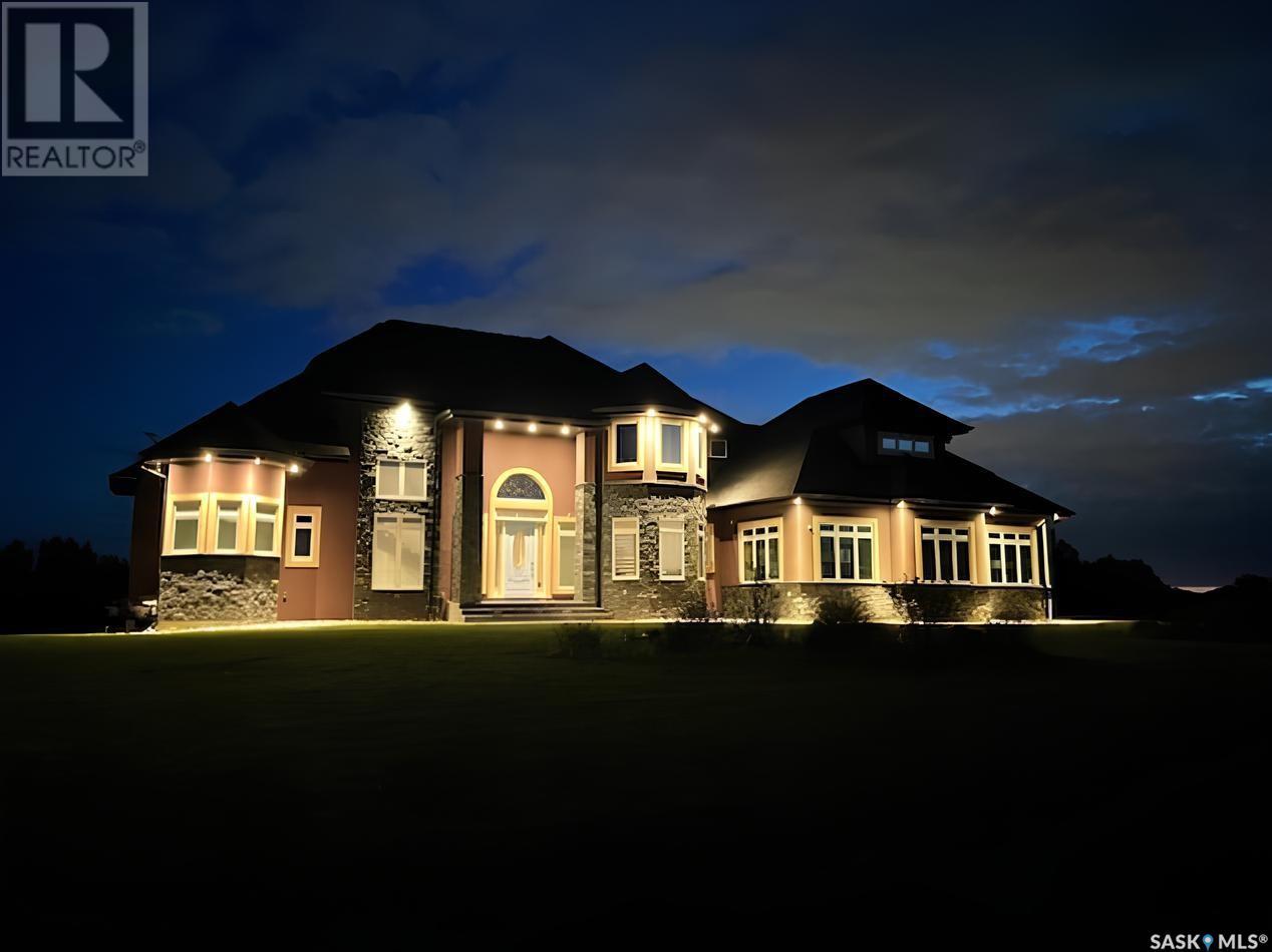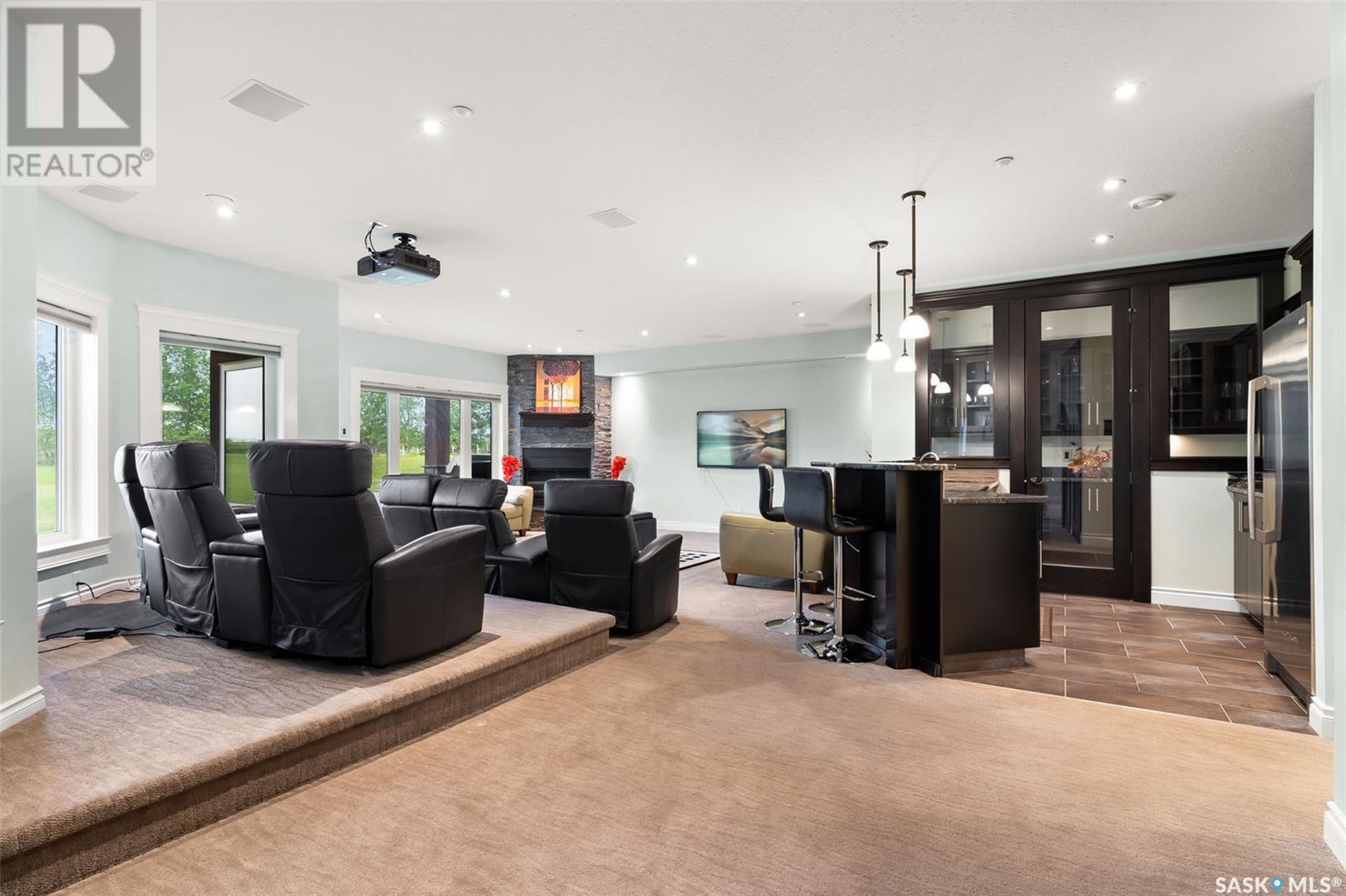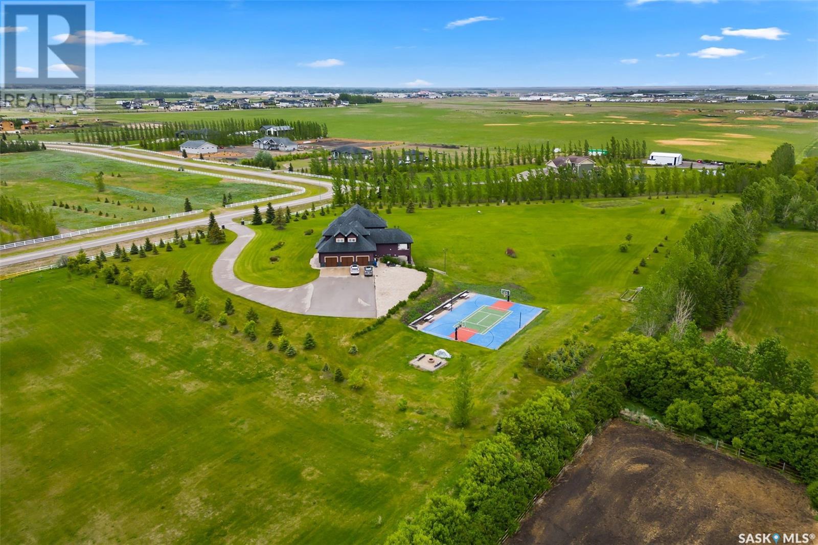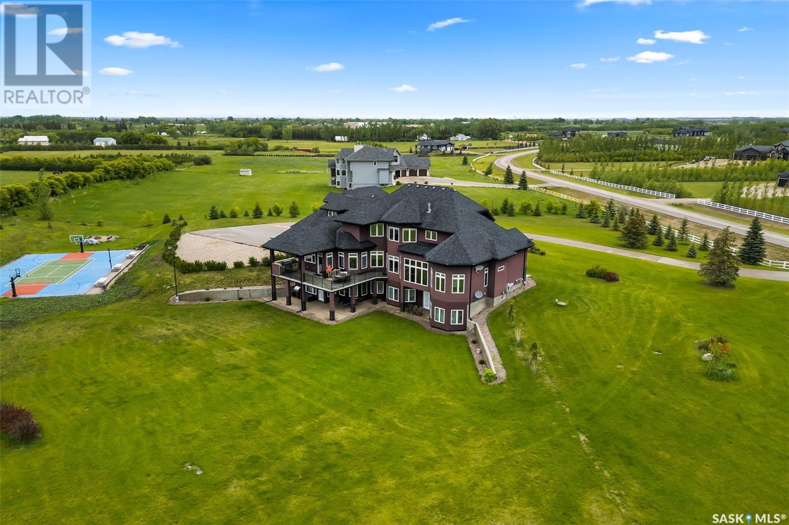 Step into luxury living with this stunning custom-built D&S Home boasting over 4000 sq ft, plus a 2500 sq ft walkout lower level. As you enter through the front door, a grand foyer welcomes you. Spiral staircases lead to both the second floor and the walkout basement. In the living room soaring ceilings and abundant windows create an airy ambiance, complemented by a cozy gas fireplace. African Mahogany hardwood flooring graces much of the main floor. Entertain with ease in the dining area,complete with a wet bar and beverage fridge.The kitchen is a chef's dream with custom cabinets and high-end appliances.The laundry and mudroom include a sizable pantry and provides access to the 5-car garage. Step outside onto the expansive deck with a built-in BBQ.The main floor also hosts a music room,half bath,and an office with access to a three-season sunroom.The primary bedroom exudes luxury with his and her walk-in closets and an ensuite featuring heated tile floors,a heated and lighted soaker tub,and a built-in TV within the vanity mirror.The primary bedroom also allows access to the sunroom.Ascend to the second floor with three bedrooms and three bathrooms providing comfort and privacy.Two of the bedrooms feature their own three-piece baths, while the third bedroom has access to a shared full bathroom.A spacious bonus room offers an additional versatile living space.The lower level features a library/office space,family room with a wet bar,wine room,and a dedicated exercise room. There are also two additional bedrooms,each with walk-in closets and patio access. Completing the lower level is a half bath,3-piece bath,and ample storage.Most of the lower level has in-floor heating and there is also garage access. Outside, enjoy recreation on the multi-purpose sports court with lighting. A private well conveniently provides irrigation to all the grass and trees on the expansive property. This home blends sophistication with convenience for an unparalleled living experience. (id:43042)