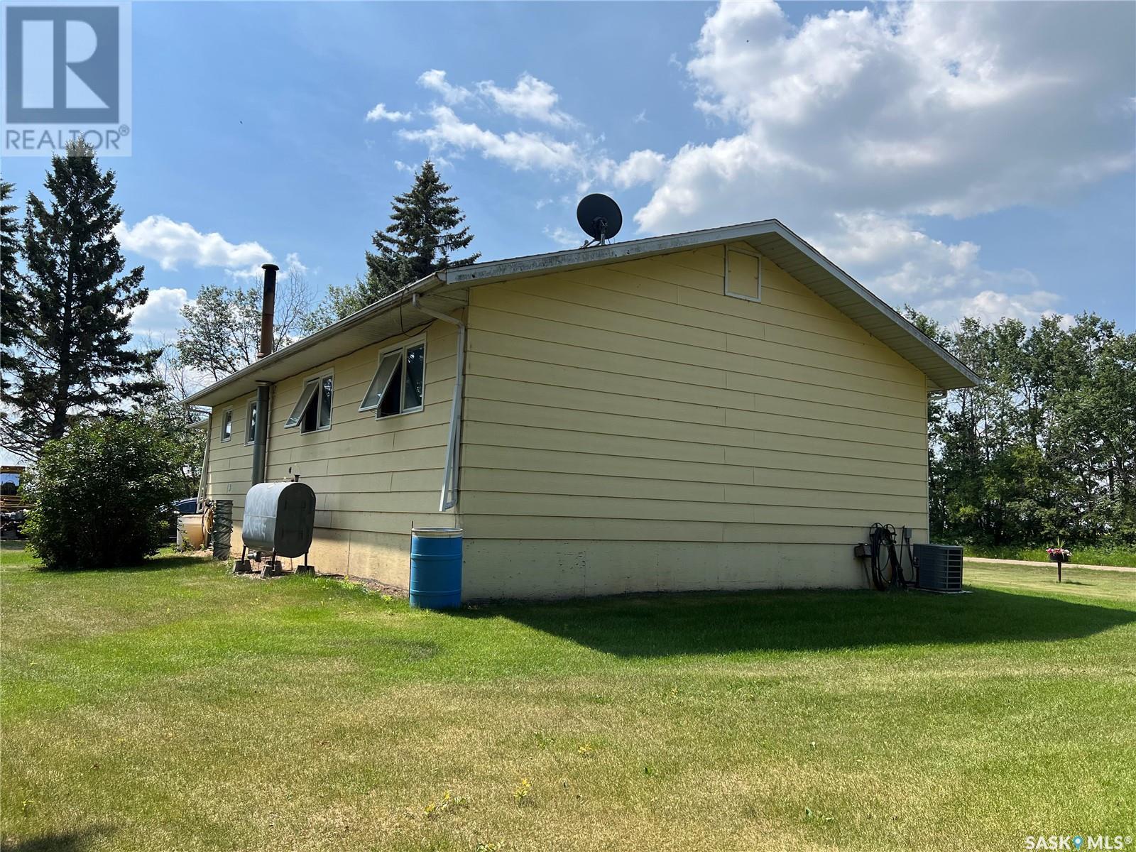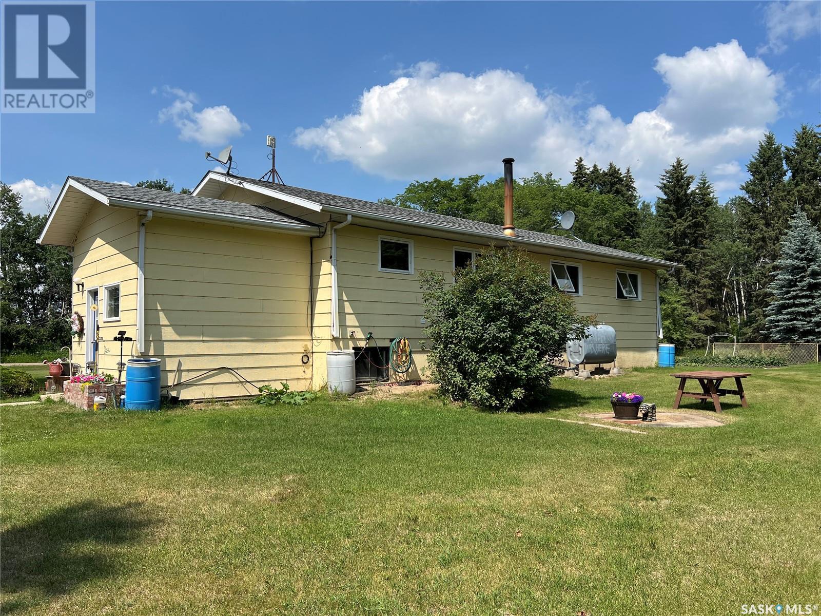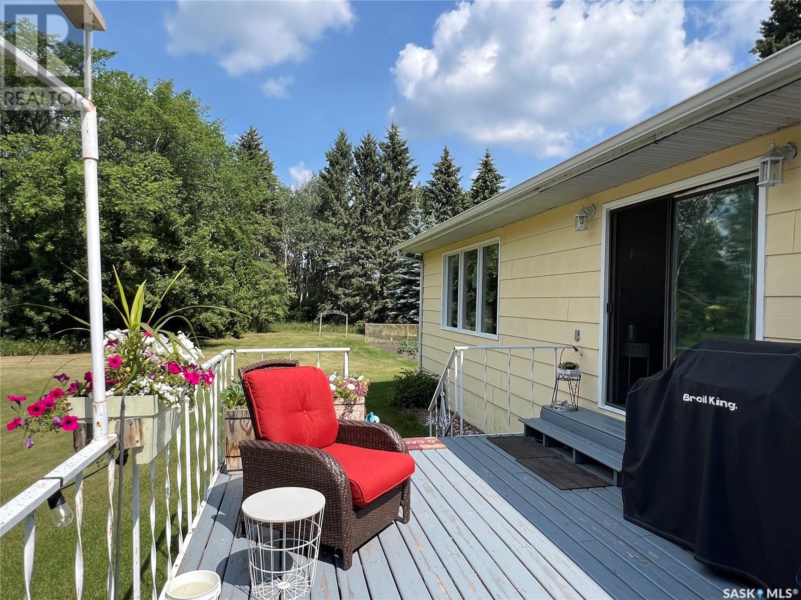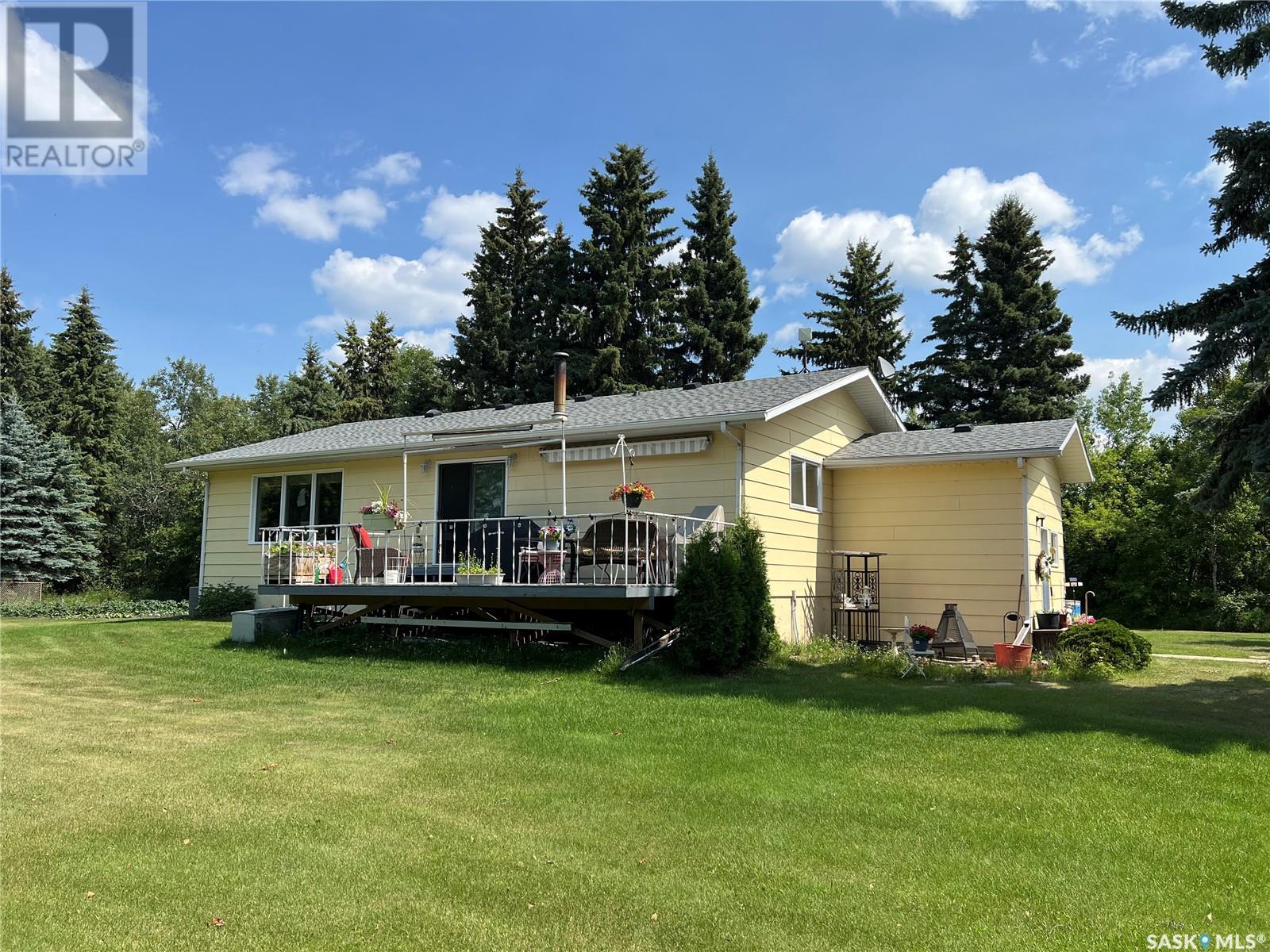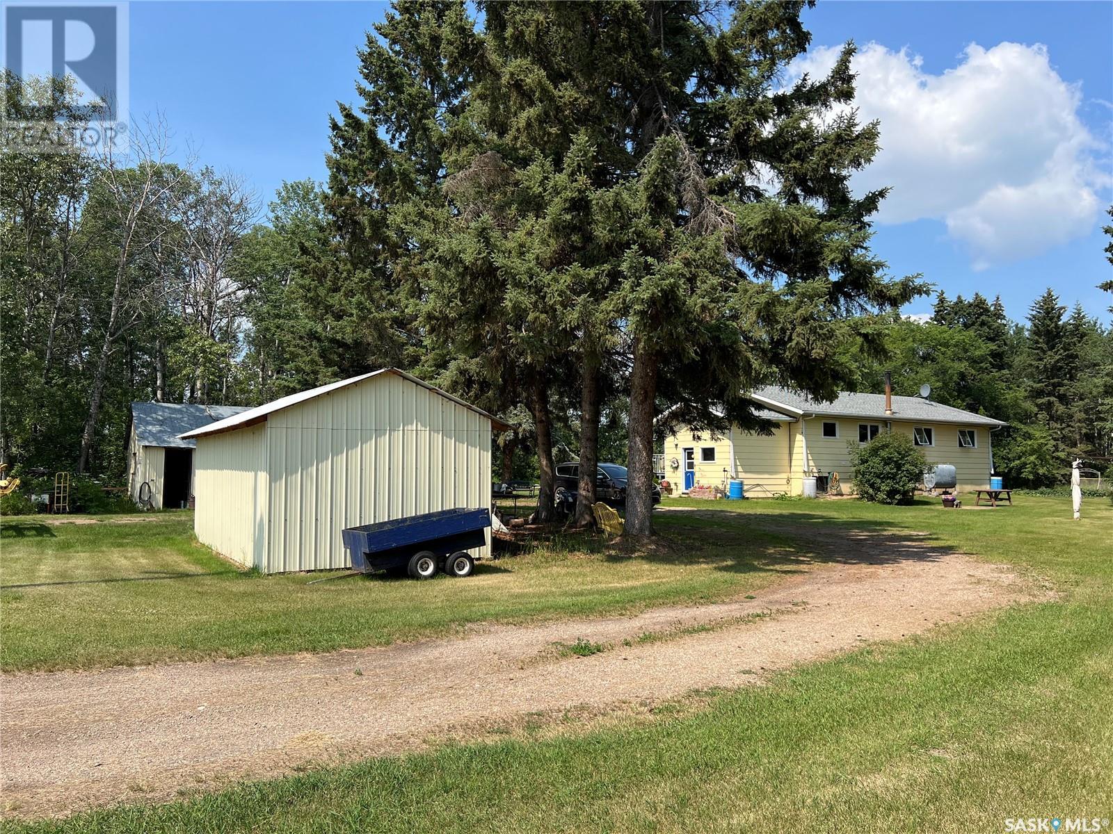 This well maintained acreage could be what you're looking for! Located 13kms East of Meadow Lake and only a few minutes from the Pulp Mill. Situated on 153 acres, this 1578 sq foot bungalow has 3 bedrooms, 2 bathrooms with a partially developed lower level. Recent upgrades include shingles 2023, Central A/C in 2024 and new interior paint 2024. Open concept kitchen, dining and living room with lots of natural light throughout. Dining room has patio doors leading to a beautiful west facing deck which is great for barbecuing. Nice sized entry with plenty of room for storage. Main floor laundry. Yard is well manicured with mature trees, garden, flower beds, barn, corrals, 2 watering bowls, 5 steel grain bins, wooden grain bin, 50 ft lean to for machinery/storage plus numerous sheds. This property needs to be seen to be fully appreciated. Dehumidifier and freezer in basement included. Satellite dish is Shaw and internet is Xplornet. One dugout located in SW Corner of Property. (id:43042)