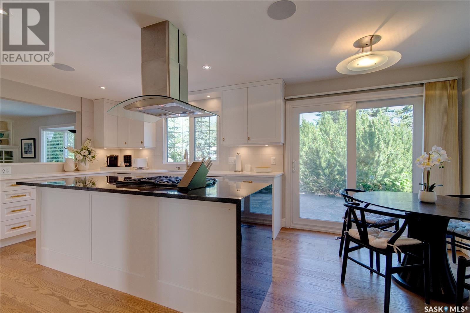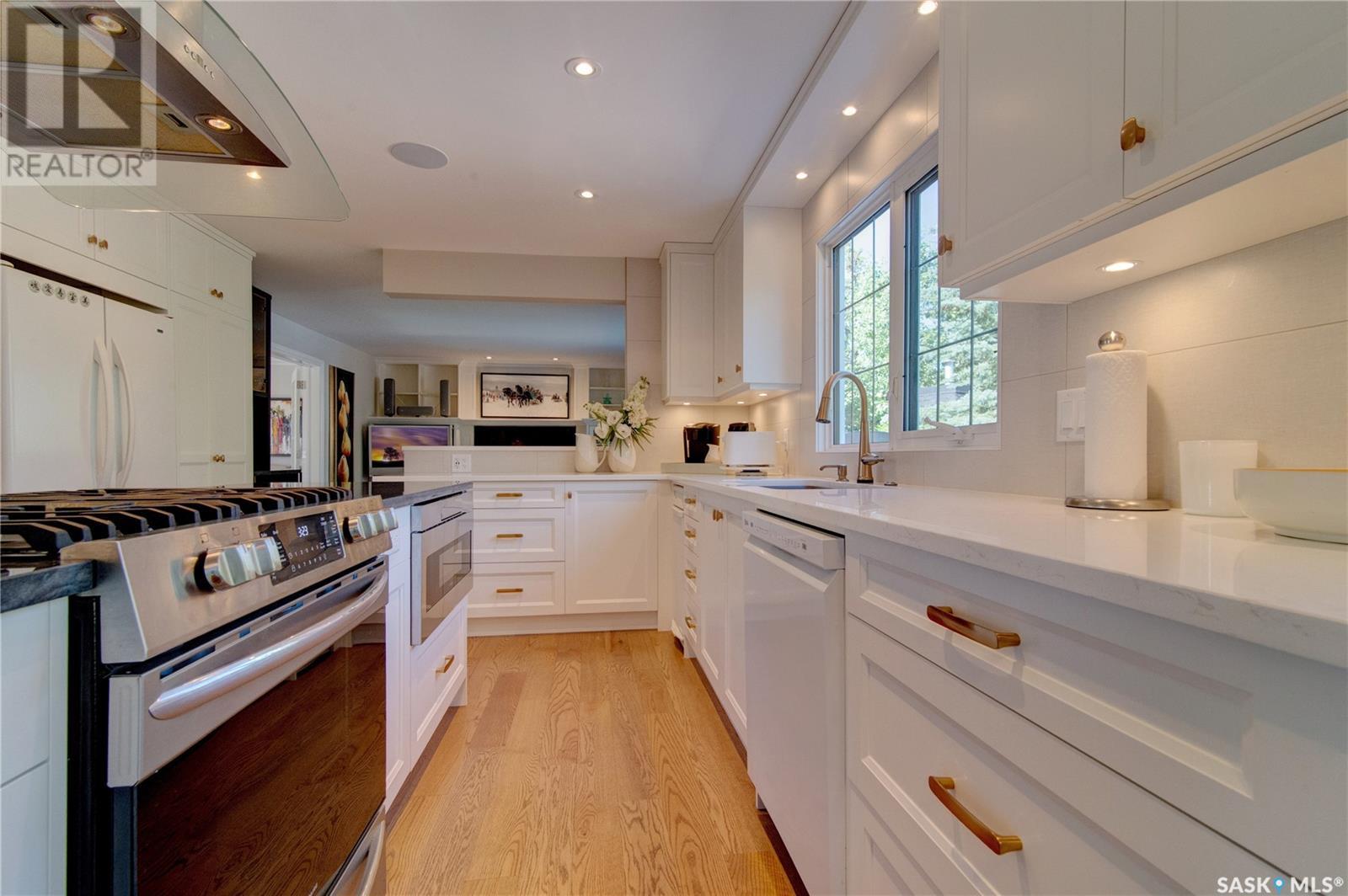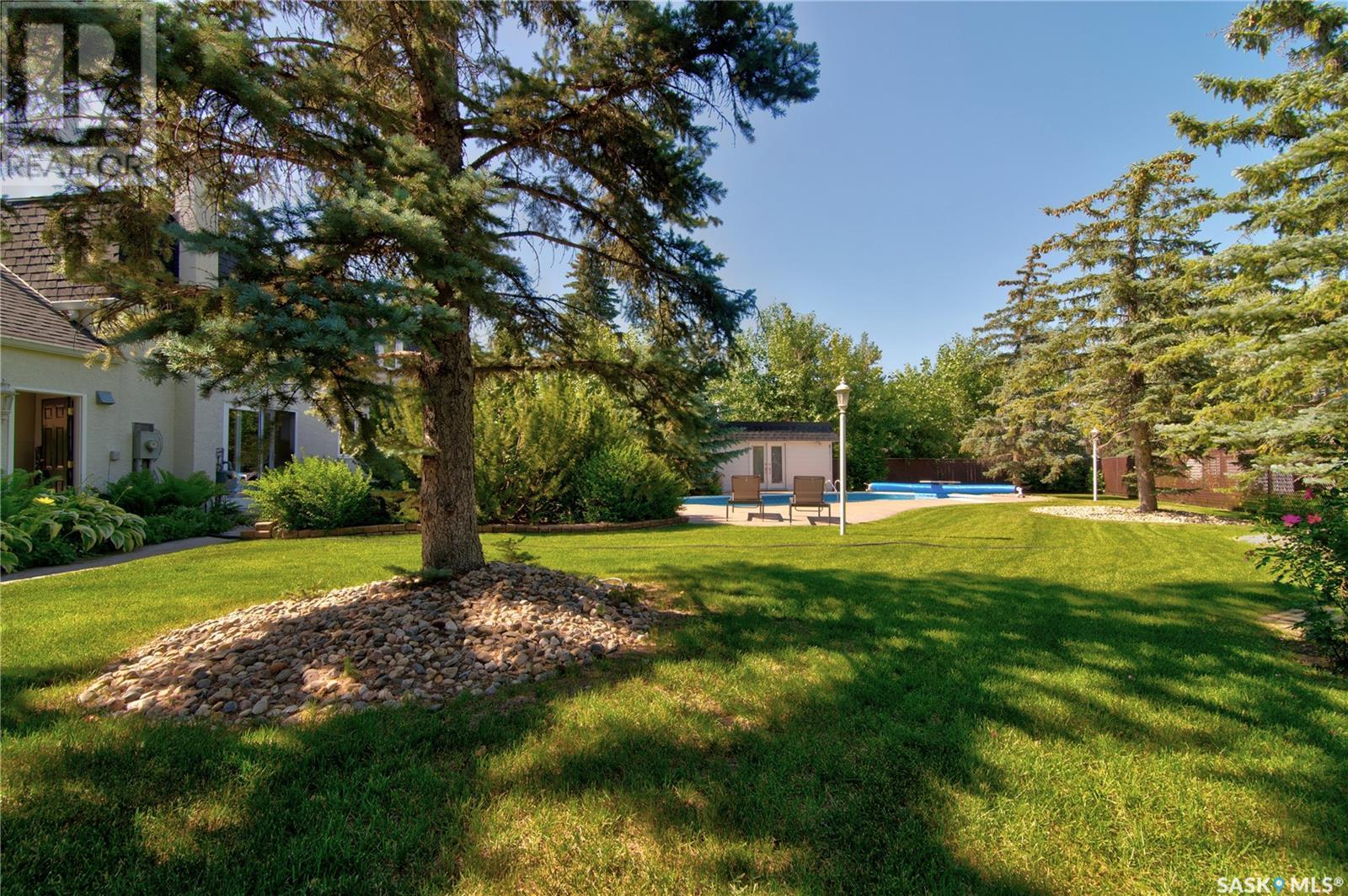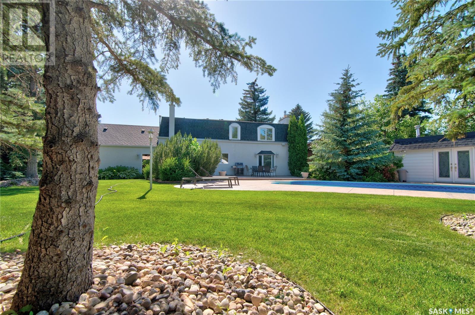 Don't miss the opportunity to own one of the most iconic homes in Regina, located on a quiet prestigious cul-de-sac in Albert Park. This classic executive two storey home with Mansard style roof and brick front has fabulous curb appeal. Main floor offers a large formal dining room, spacious living room, and lovely family room with gas fireplace and built-in bar, wine storage and custom cabinets. The recently renovated kitchen must be seen to be appreciated. Beautiful custom cabinetry, quartz and quartzite counter tops, imported ceramic tile backsplashes, a true gourmet's delight. A two piece bathroom with porcelain tile flooring complete the main level. Hardwood flooring throughout the main floor, sound system throughout the main floor and outdoor patio. Second floor offers primary bedroom with amazing walk-in closet and luxurious spa ensuite with electric fireplace, soaker tub and steam shower. Two additional bedrooms with large windows plus 5 piece bathroom complete the second floor. Basement features spacious recreation room with gas fireplace and large wall mounted TV, den, 3 piece bathroom, laundry room (fridge & freezer included), utility room with 2 high efficient furnaces with 2 AC units. Double attached garage, drywalled and heated, with a second central vacuum and lots of storage. Direct entry into the house and ample extra parking on the stamped concrete driveway. Park like back yard professionally landscaped with mature trees and perennials. 36 ft. in ground pool and pool house. This house must be seen to be truly appreciated. NOTE: Supplement includes the history of the house and all the main floor and basement renovations in 2022. (id:43042)