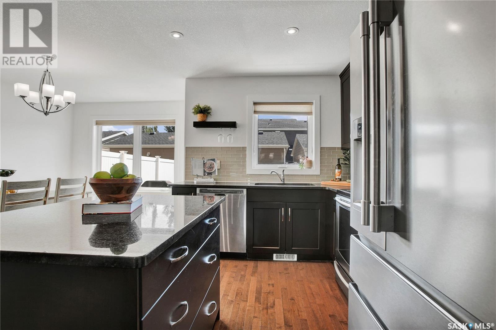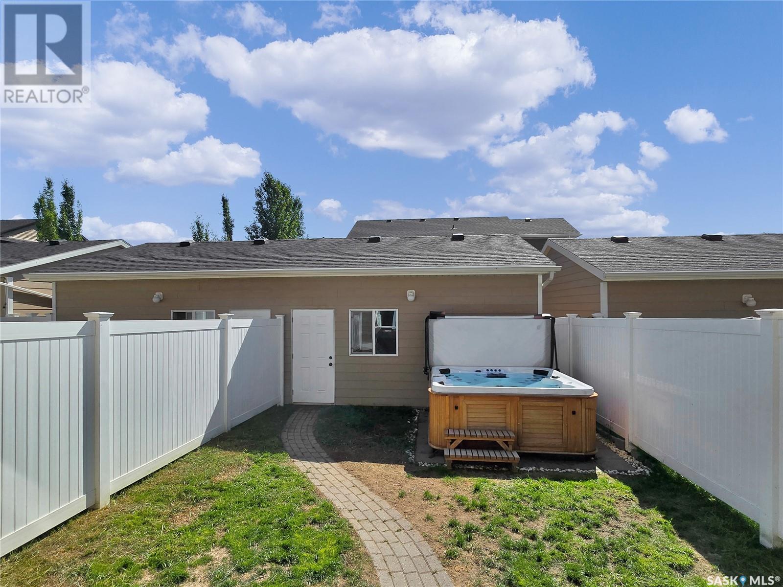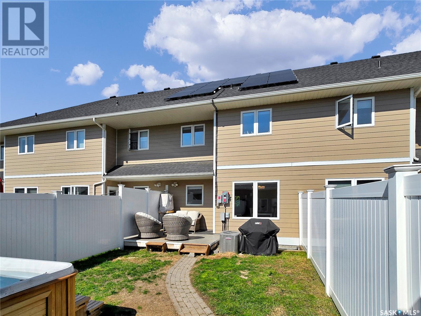 This bright and stylish 2-storey home offers 1,359 sq ft of well-planned space—with absolutely NO condo fees. Built in 2014 and freshly painted throughout, it combines everyday comfort with long-term value in one of Saskatoon’s most sought-after neighbourhoods. Let’s talk solar: a $30K panel system is already installed and currently saving you approximately $150/month in power bills. That’s real, ongoing value—month after month, year after year. The open-concept main floor features hardwood floors, a sunny bay window, and a modern kitchen with granite countertops, stainless steel appliances, and a generous dining area. Upstairs, the spacious primary bedroom includes another bay window and a 3-piece ensuite, plus two more bedrooms and a full bath down the hall. Out back, relax in your almost-new hot tub, or entertain on the deck in your private, fenced yard. You’ll also love the 18 x 20 insulated garage (with a gas line ready for a future heater). The front yard includes a discreet gated enclosure to keep garbage and recycling bins out of sight. Set on a paved alley, just steps from parks, schools, and all the amenities of Stonebridge, this home is the full package: no fees, lower utility bills, and modern updates in a prime location. (id:43042)