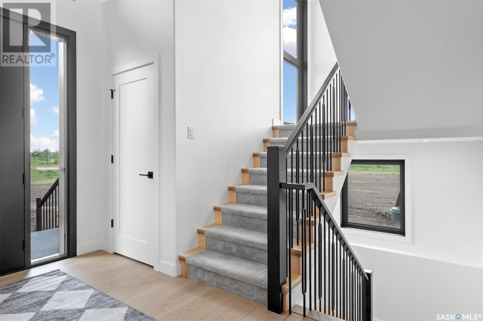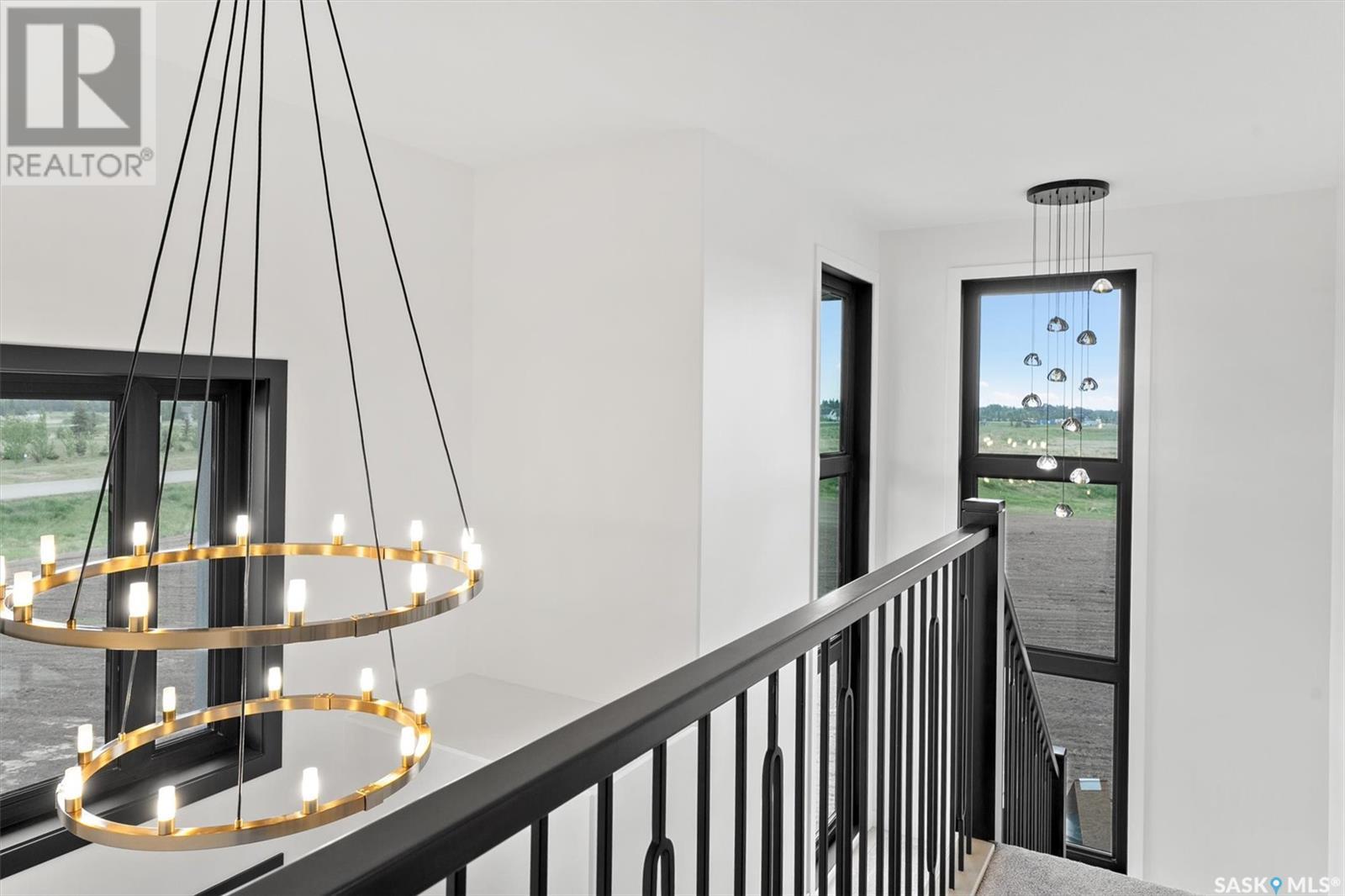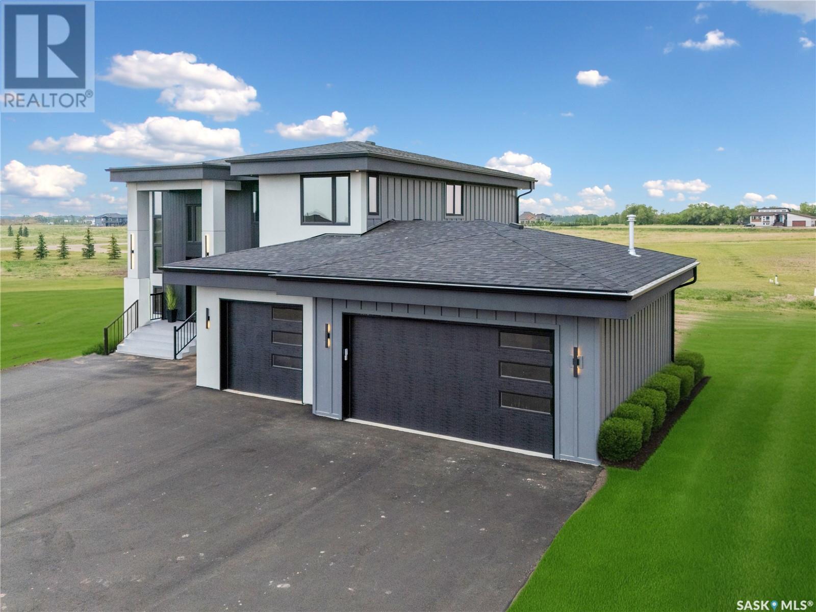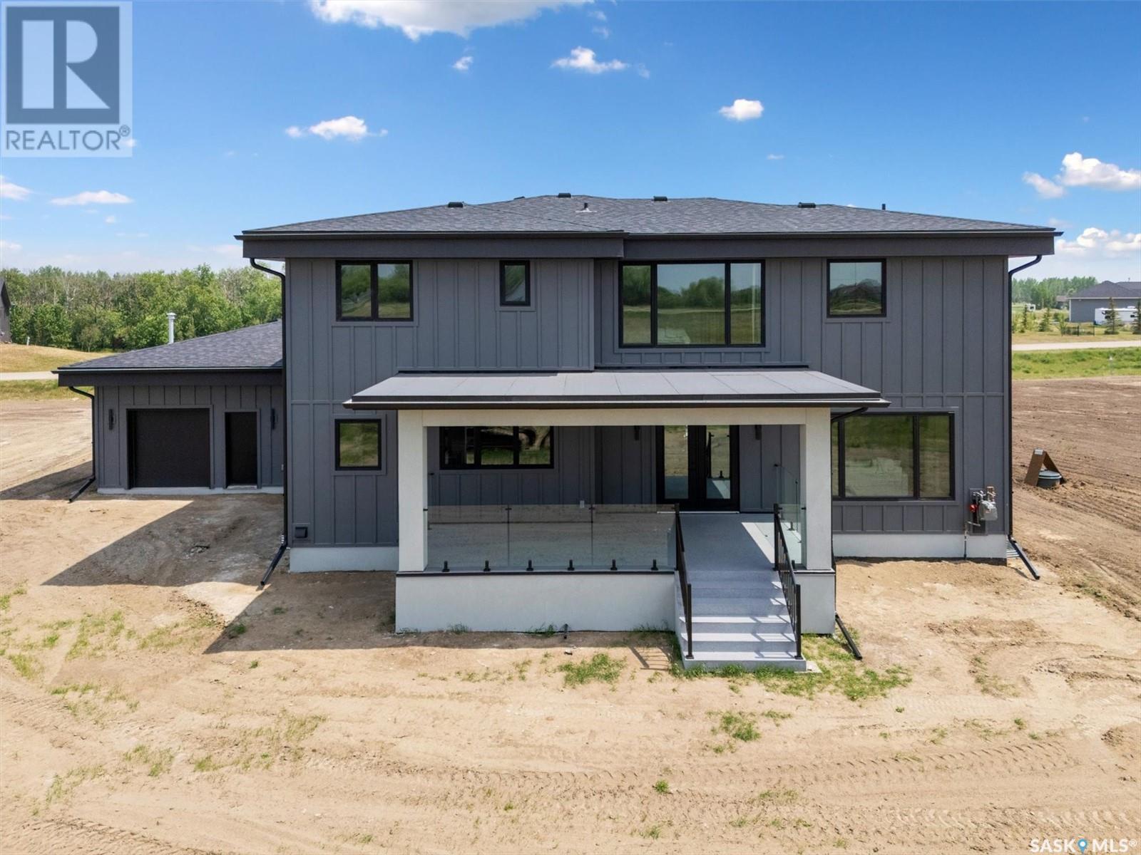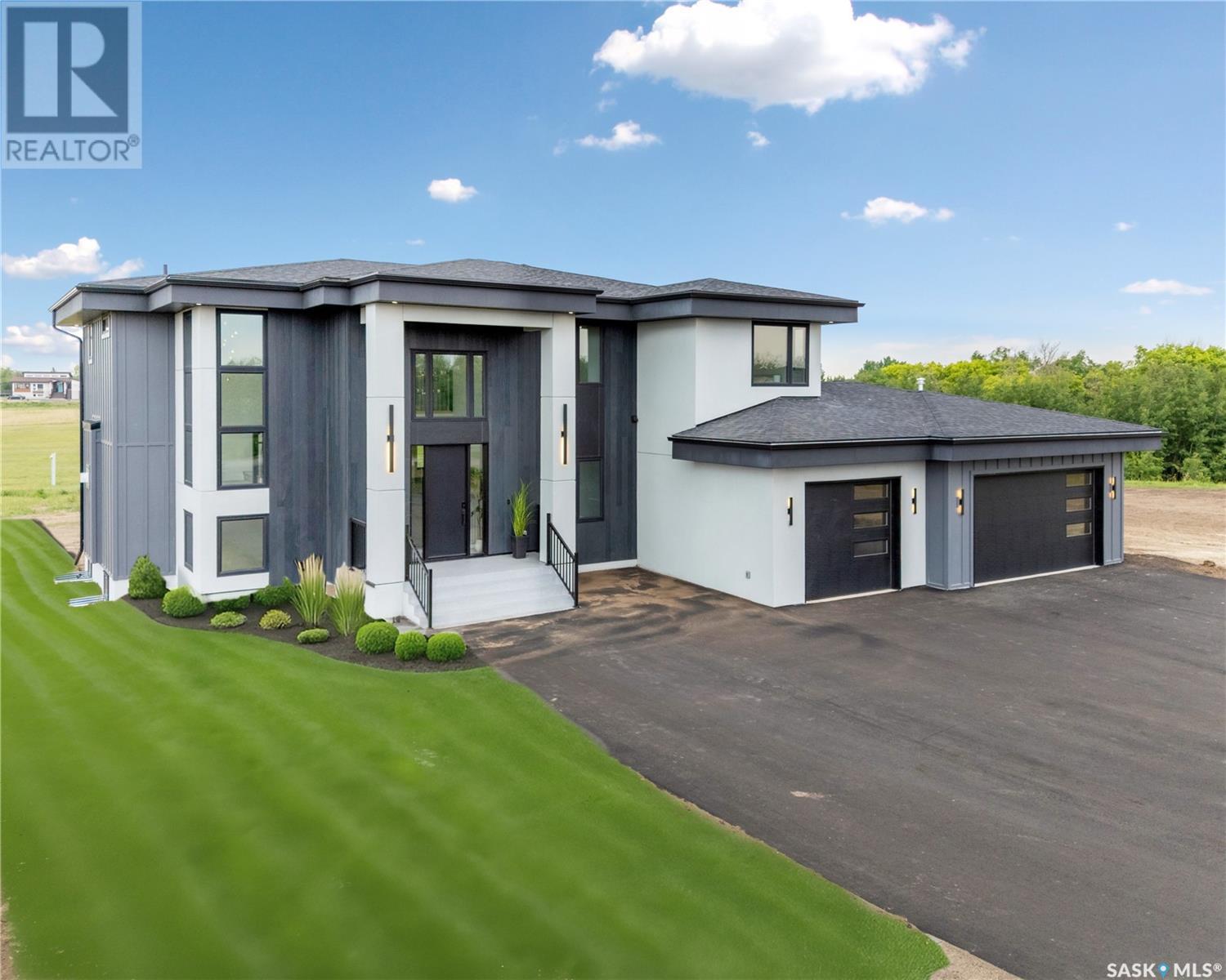 Luxury Acreage Living — Just Minutes South of the City Pavement to your doorstep and every detail beyond expectation. Welcome to this breathtaking new construction in prestigious Grasswood Estates — a stately 2-storey offering 2881 sq ft, 4+1 bedrooms, 4 bathrooms, and a triple attached garage on 2.63 acres of scenic land. A winding asphalt drive leads to this showpiece residence, where elegance, privacy, and convenience blend seamlessly. Step inside the grand two-storey foyer and prepare to be amazed by the expansive main floor, bathed in light from oversized black-clad windows. The heart of the home is an exquisite open-concept living area featuring a dramatic gas fireplace with stone surround and arched alcoves, flowing into an oversized dining area and chef’s kitchen. Culinary enthusiasts will love the oversize island, custom cabinetry, Venetian plaster hood fan, gas 6 burner range, wall ovens, 2 refrigerators and fully outfitted butler’s pantry. A private hallway leads to a stylish powder room and a spacious, well-designed mudroom with 24’ porcelain tile flooring. A versatile den on the main floor offers space for a home office or library. Upstairs, discover 4 bedrooms, a full laundry room, reading nook and 2 lux bathrooms. The primary suite is a retreat with a walk-in closet, hotel-chic coffee bar, and a divine spa-style ensuite. The fully developed lower level is perfectly designed for entertaining or family lounging — great room w/ a 2nd fireplace, wet bar, bedroom, play nook, a 4-piece bath, and a hidden speakeasy wine room behind a discreet door-truly unique!. Highlights include: soaring ceilings, custom millwork, heated triple w/ drive through overhead, covered composite deck, premium black window package, and landscaping including expansive grass area and a concrete patio extending outdoor living off the rear deck. Best of all, you’re minutes the city and the highly coveted neighbourhood Corman Park School- the best of rural living and urban convenience. (id:43042)