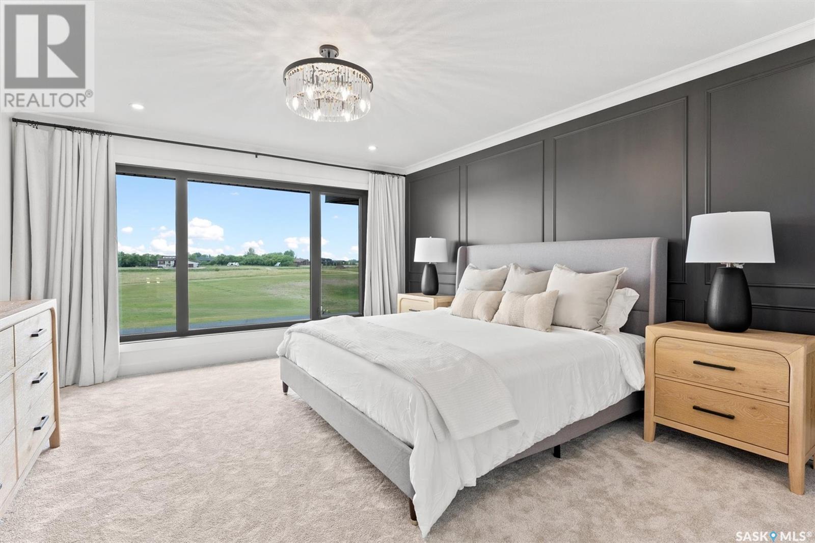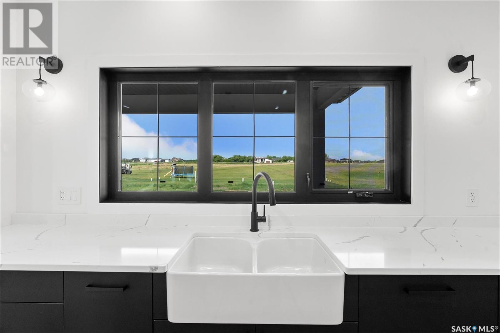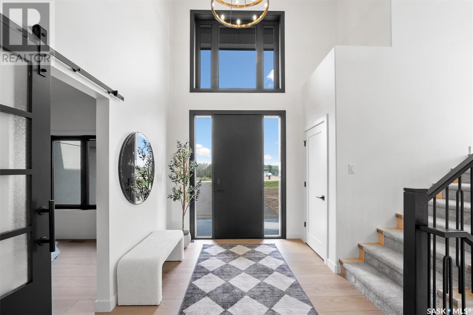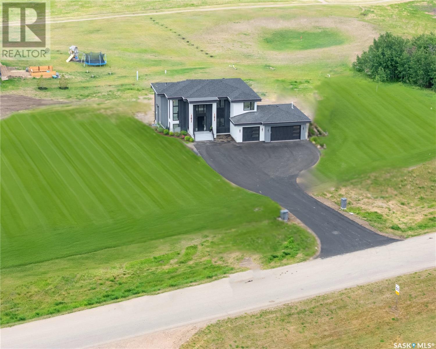 Luxury Acreage Living — Just Minutes South of the City Pavement to your doorstep and every detail beyond expectation. Welcome to this breathtaking new construction in prestigious Grasswood Estates — a stately 2-storey offering 2881 sq ft, 4+1 bedrooms, 4 bathrooms, and a triple attached garage on 2.63 acres of scenic land. A winding asphalt drive leads to this showpiece residence, where elegance, privacy, and convenience blend seamlessly. Step inside the grand two-storey foyer and prepare to be amazed by the expansive main floor, bathed in light from oversized black-clad windows. The heart of the home is an exquisite open-concept living area featuring a dramatic gas fireplace with stone surround and arched alcoves, flowing into an oversized dining area and chef’s kitchen. Culinary enthusiasts will love the oversize island, custom cabinetry, Venetian plaster hood fan, gas 6 burner range, wall ovens, 2 refrigerators and fully outfitted butler’s pantry. A private hallway leads to a stylish powder room and a spacious, well-designed mudroom with 24’ porcelain tile flooring. A versatile den on the main floor offers space for a home office or library. Upstairs, discover 4 bedrooms, a full laundry room, reading nook and 2 lux bathrooms. The primary suite is a retreat with a walk-in closet, hotel-chic coffee bar, and a divine spa-style ensuite. The fully developed lower level is perfectly designed for entertaining or family lounging — great room w/ a 2nd fireplace, wet bar, bedroom, play nook, a 4-piece bath, and a hidden speakeasy wine room behind a discreet door-truly unique!. Highlights include: soaring ceilings, custom millwork, heated triple w/ drive through overhead, covered composite deck, premium black window package, and landscaping including expansive grass area and a concrete patio extending outdoor living off the rear deck. Best of all, you’re minutes the city and the highly coveted neighbourhood Corman Park School- the best of rural living and urban convenience. (id:43042)