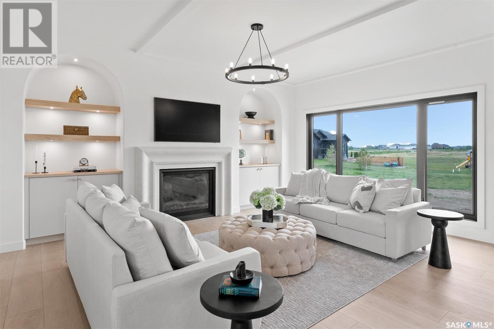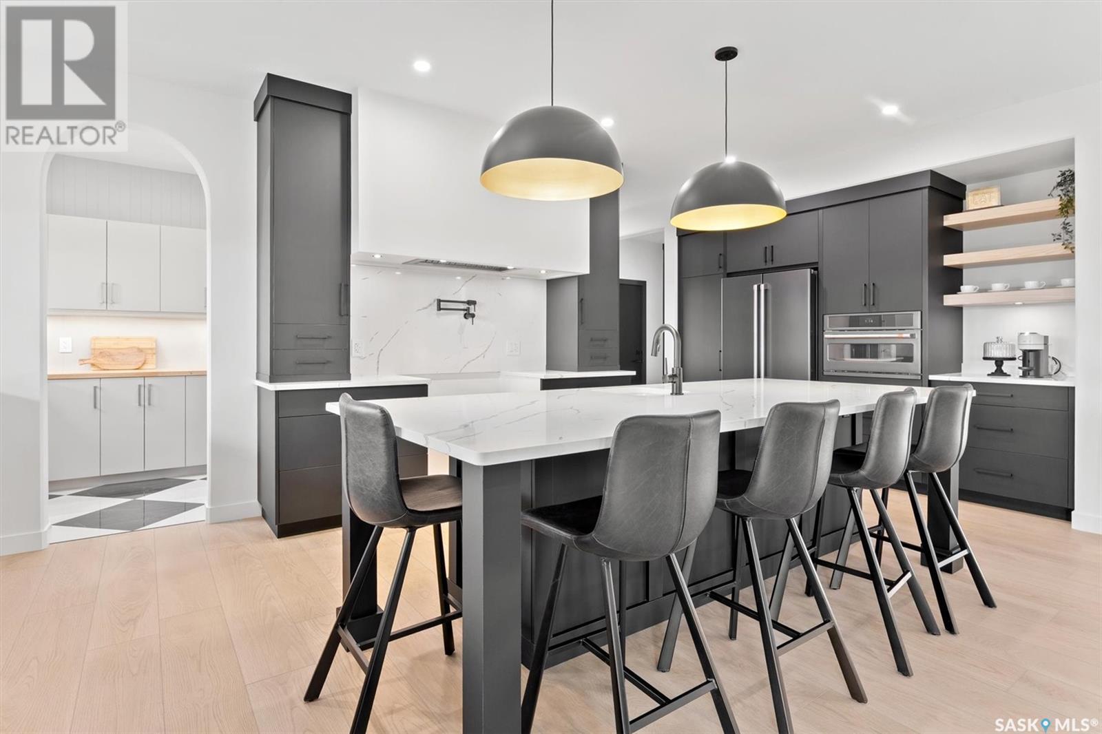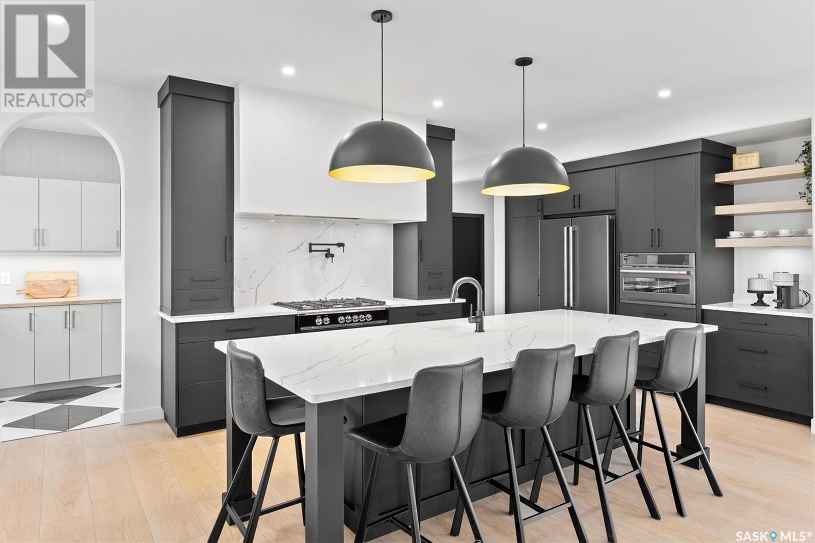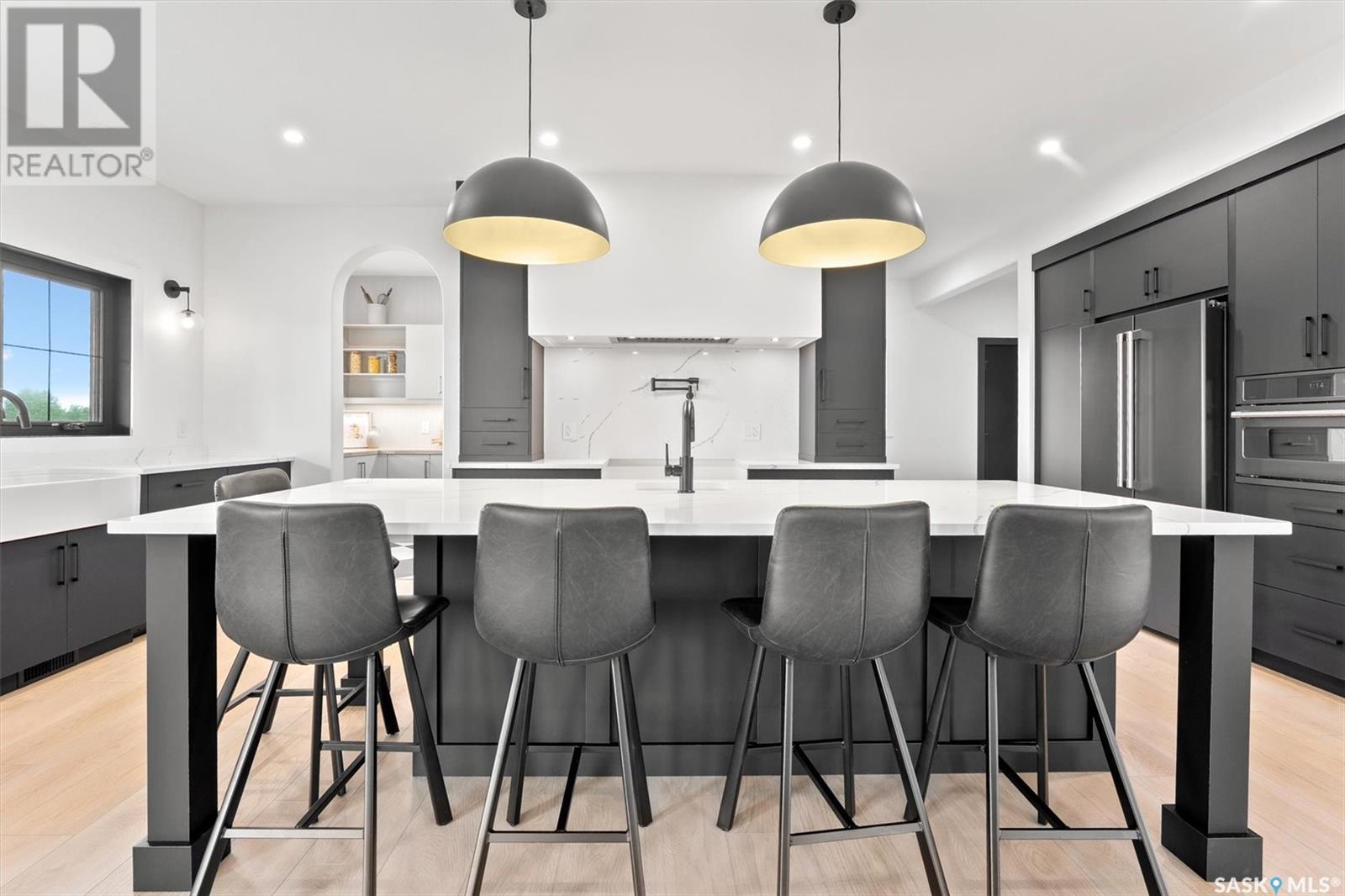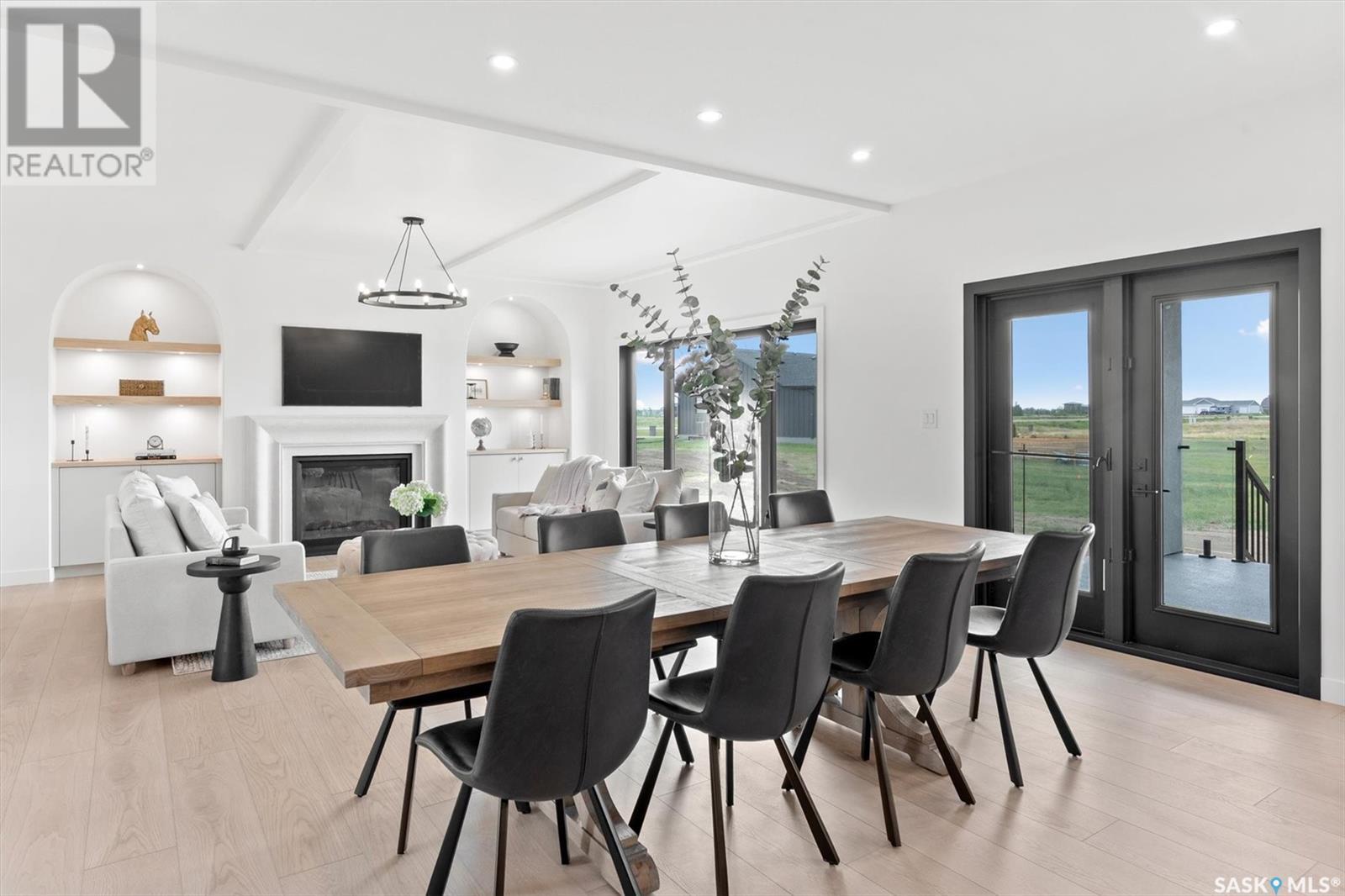 Luxury Acreage Living — Just Minutes South of the City Pavement to your doorstep and every detail beyond expectation. Welcome to this breathtaking new construction in prestigious Grasswood Estates — a stately 2-storey offering 2881 sq ft, 4+1 bedrooms, 4 bathrooms, and a triple attached garage on 2.63 acres of scenic land. A winding asphalt drive leads to this showpiece residence, where elegance, privacy, and convenience blend seamlessly. Step inside the grand two-storey foyer and prepare to be amazed by the expansive main floor, bathed in light from oversized black-clad windows. The heart of the home is an exquisite open-concept living area featuring a dramatic gas fireplace with stone surround and arched alcoves, flowing into an oversized dining area and chef’s kitchen. Culinary enthusiasts will love the oversize island, custom cabinetry, Venetian plaster hood fan, gas 6 burner range, wall ovens, 2 refrigerators and fully outfitted butler’s pantry. A private hallway leads to a stylish powder room and a spacious, well-designed mudroom with 24’ porcelain tile flooring. A versatile den on the main floor offers space for a home office or library. Upstairs, discover 4 bedrooms, a full laundry room, reading nook and 2 lux bathrooms. The primary suite is a retreat with a walk-in closet, hotel-chic coffee bar, and a divine spa-style ensuite. The fully developed lower level is perfectly designed for entertaining or family lounging — great room w/ a 2nd fireplace, wet bar, bedroom, play nook, a 4-piece bath, and a hidden speakeasy wine room behind a discreet door-truly unique!. Highlights include: soaring ceilings, custom millwork, heated triple w/ drive through overhead, covered composite deck, premium black window package, and landscaping including expansive grass area and a concrete patio extending outdoor living off the rear deck. Best of all, you’re minutes the city and the highly coveted neighbourhood Corman Park School- the best of rural living and urban convenience. (id:43042)