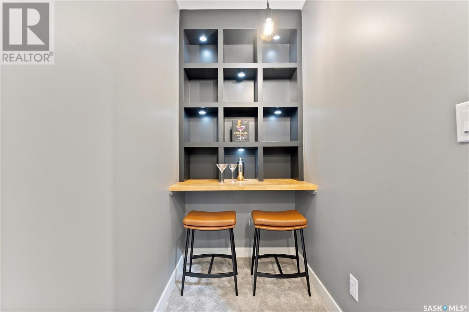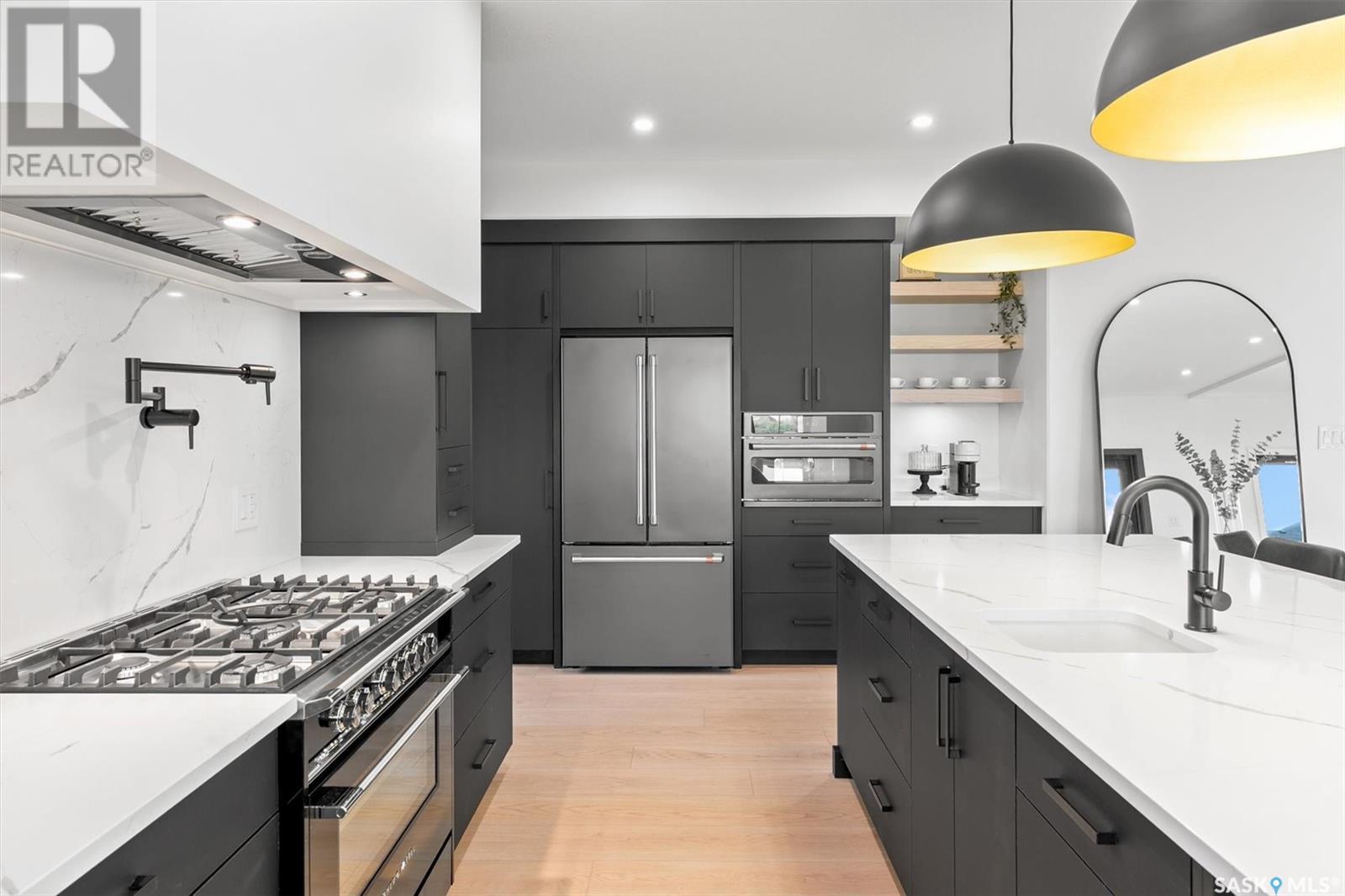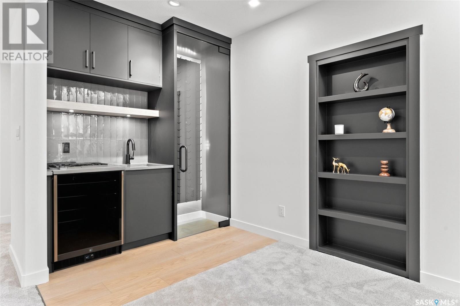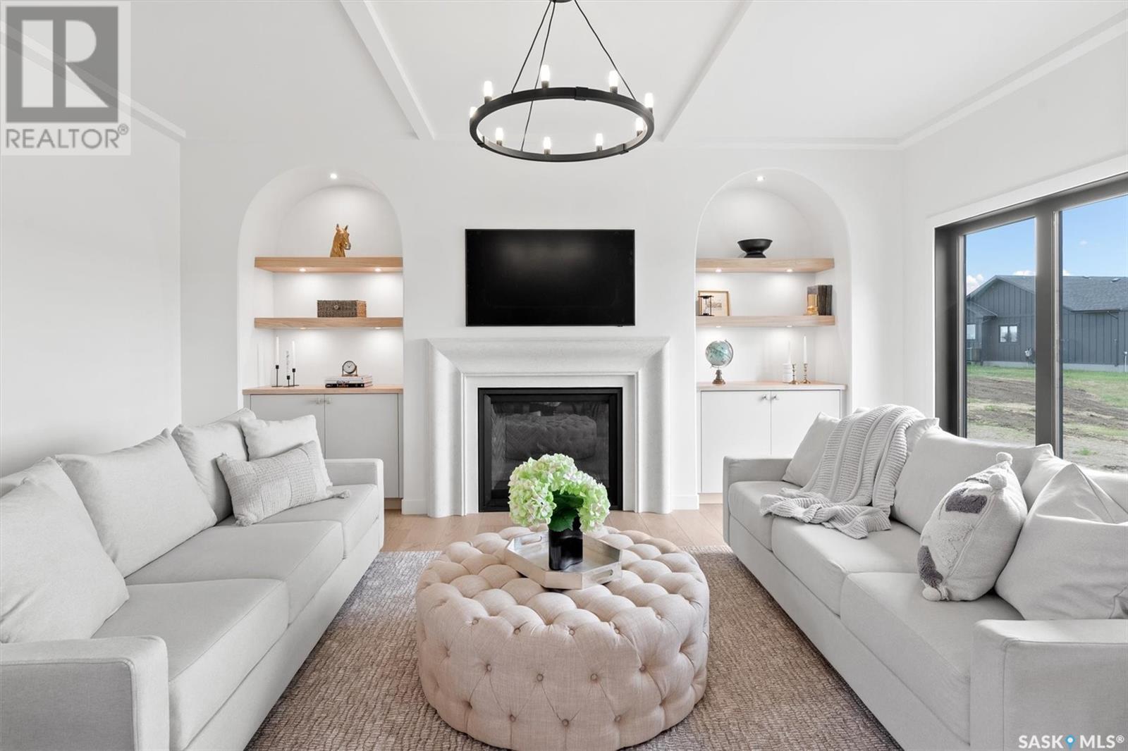 Luxury Acreage Living — Just Minutes South of the City Pavement to your doorstep and every detail beyond expectation. Welcome to this breathtaking new construction in prestigious Grasswood Estates — a stately 2-storey offering 2881 sq ft, 4+1 bedrooms, 4 bathrooms, and a triple attached garage on 2.63 acres of scenic land. A winding asphalt drive leads to this showpiece residence, where elegance, privacy, and convenience blend seamlessly. Step inside the grand two-storey foyer and prepare to be amazed by the expansive main floor, bathed in light from oversized black-clad windows. The heart of the home is an exquisite open-concept living area featuring a dramatic gas fireplace with stone surround and arched alcoves, flowing into an oversized dining area and chef’s kitchen. Culinary enthusiasts will love the oversize island, custom cabinetry, Venetian plaster hood fan, gas 6 burner range, wall ovens, 2 refrigerators and fully outfitted butler’s pantry. A private hallway leads to a stylish powder room and a spacious, well-designed mudroom with 24’ porcelain tile flooring. A versatile den on the main floor offers space for a home office or library. Upstairs, discover 4 bedrooms, a full laundry room, reading nook and 2 lux bathrooms. The primary suite is a retreat with a walk-in closet, hotel-chic coffee bar, and a divine spa-style ensuite. The fully developed lower level is perfectly designed for entertaining or family lounging — great room w/ a 2nd fireplace, wet bar, bedroom, play nook, a 4-piece bath, and a hidden speakeasy wine room behind a discreet door-truly unique!. Highlights include: soaring ceilings, custom millwork, heated triple w/ drive through overhead, covered composite deck, premium black window package, and landscaping including expansive grass area and a concrete patio extending outdoor living off the rear deck. Best of all, you’re minutes the city and the highly coveted neighbourhood Corman Park School- the best of rural living and urban convenience. (id:43042)