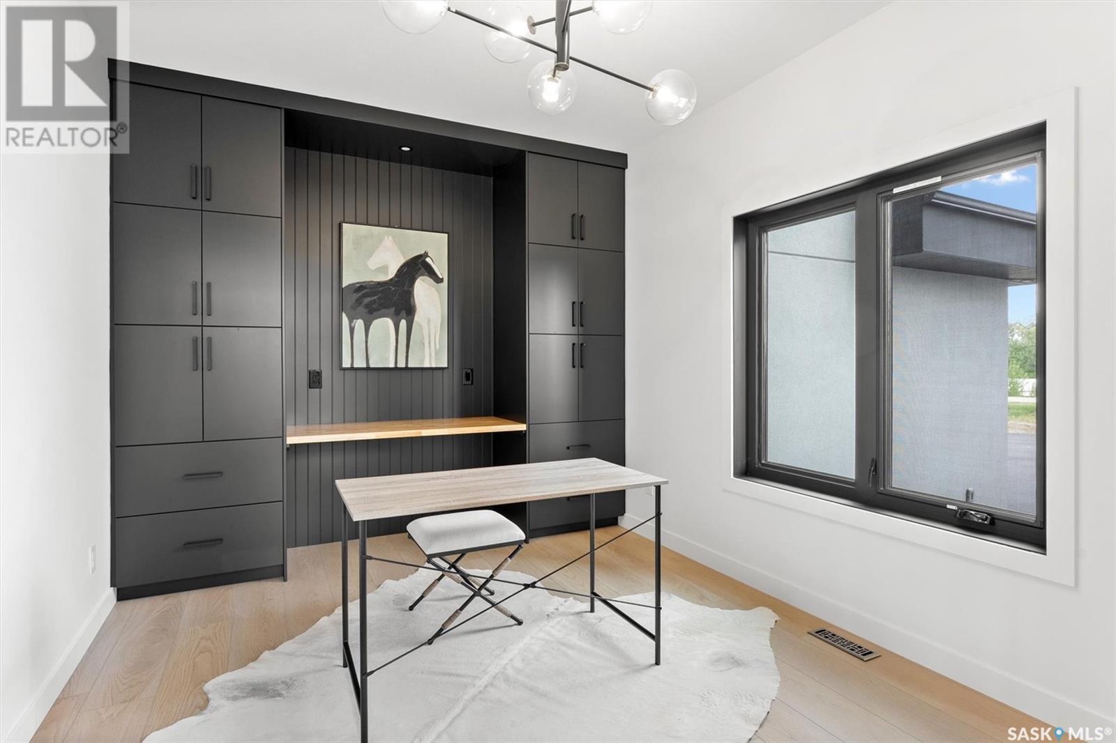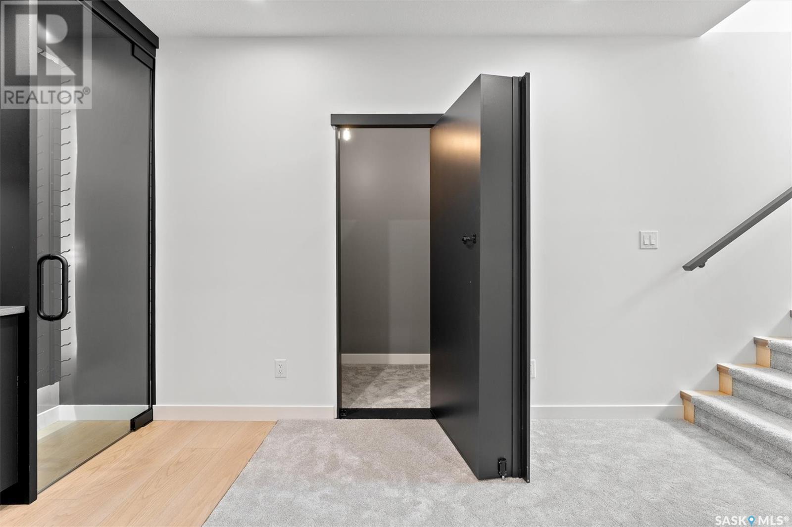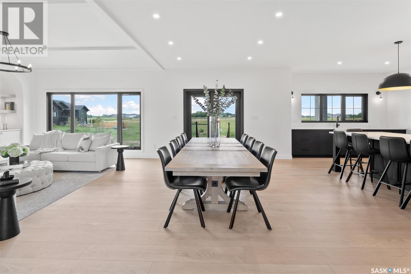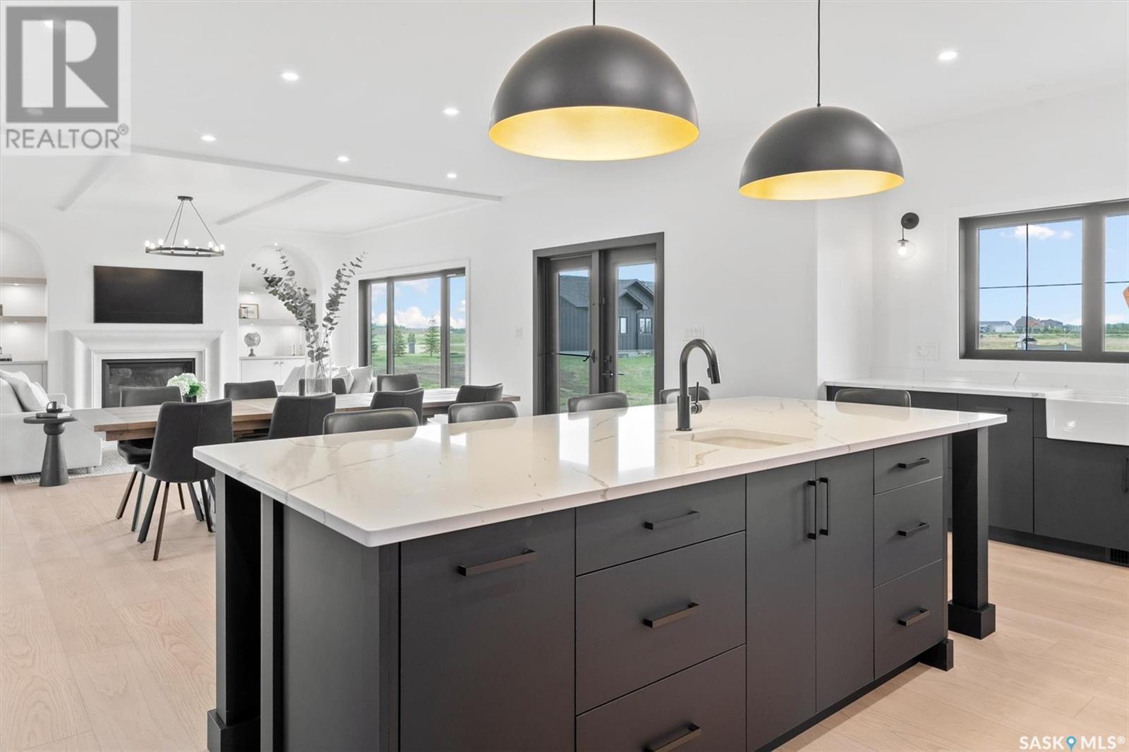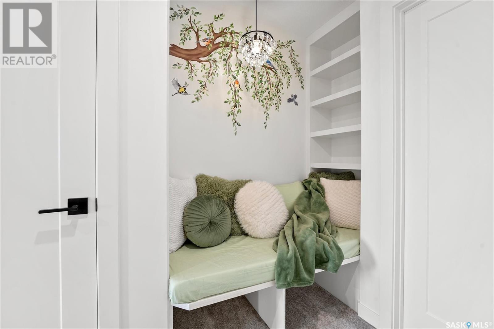 Luxury Acreage Living — Just Minutes South of the City Pavement to your doorstep and every detail beyond expectation. Welcome to this breathtaking new construction in prestigious Grasswood Estates — a stately 2-storey offering 2881 sq ft, 4+1 bedrooms, 4 bathrooms, and a triple attached garage on 2.63 acres of scenic land. A winding asphalt drive leads to this showpiece residence, where elegance, privacy, and convenience blend seamlessly. Step inside the grand two-storey foyer and prepare to be amazed by the expansive main floor, bathed in light from oversized black-clad windows. The heart of the home is an exquisite open-concept living area featuring a dramatic gas fireplace with stone surround and arched alcoves, flowing into an oversized dining area and chef’s kitchen. Culinary enthusiasts will love the oversize island, custom cabinetry, Venetian plaster hood fan, gas 6 burner range, wall ovens, 2 refrigerators and fully outfitted butler’s pantry. A private hallway leads to a stylish powder room and a spacious, well-designed mudroom with 24’ porcelain tile flooring. A versatile den on the main floor offers space for a home office or library. Upstairs, discover 4 bedrooms, a full laundry room, reading nook and 2 lux bathrooms. The primary suite is a retreat with a walk-in closet, hotel-chic coffee bar, and a divine spa-style ensuite. The fully developed lower level is perfectly designed for entertaining or family lounging — great room w/ a 2nd fireplace, wet bar, bedroom, play nook, a 4-piece bath, and a hidden speakeasy wine room behind a discreet door-truly unique!. Highlights include: soaring ceilings, custom millwork, heated triple w/ drive through overhead, covered composite deck, premium black window package, and landscaping including expansive grass area and a concrete patio extending outdoor living off the rear deck. Best of all, you’re minutes the city and the highly coveted neighbourhood Corman Park School- the best of rural living and urban convenience. (id:43042)