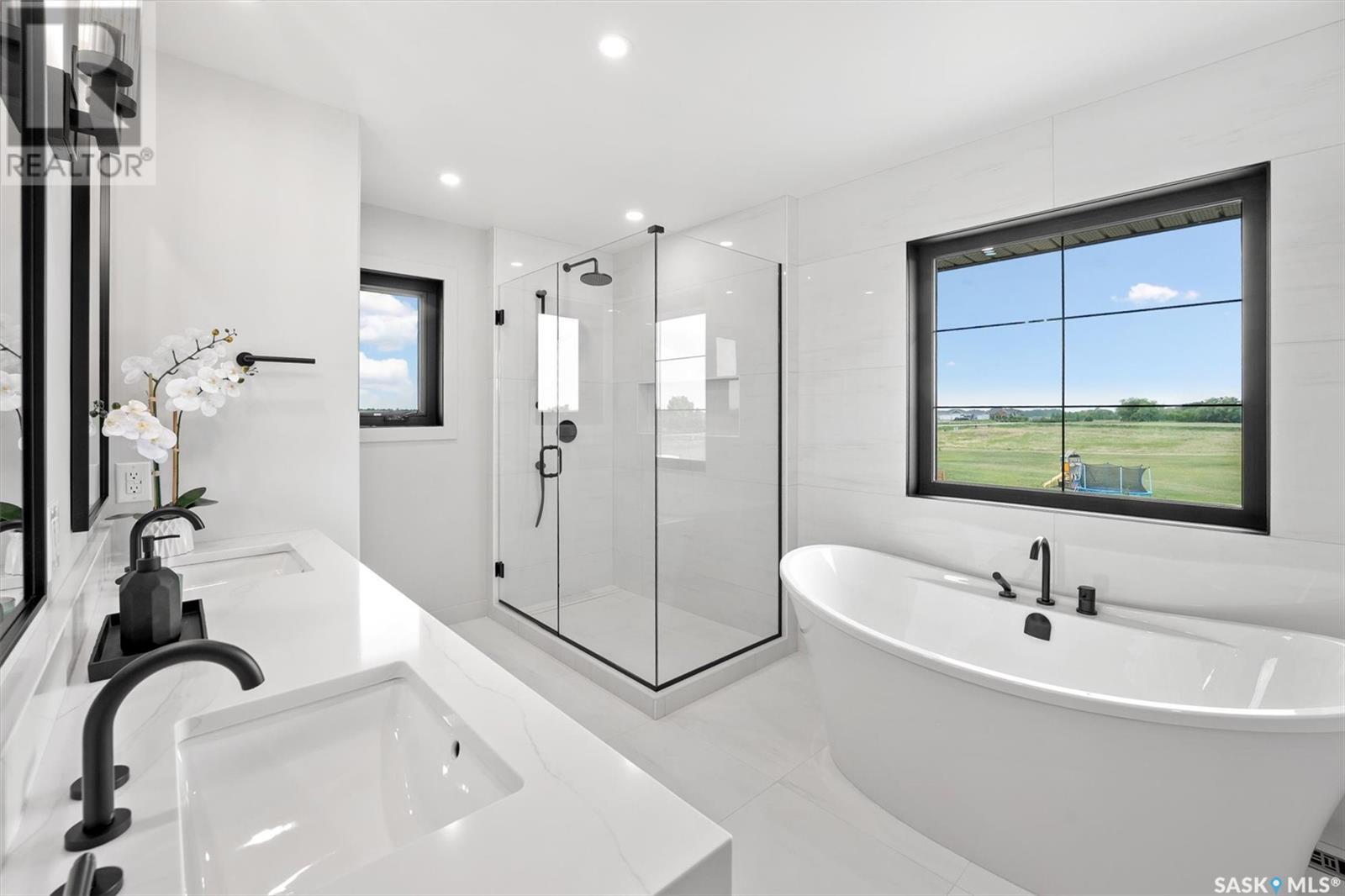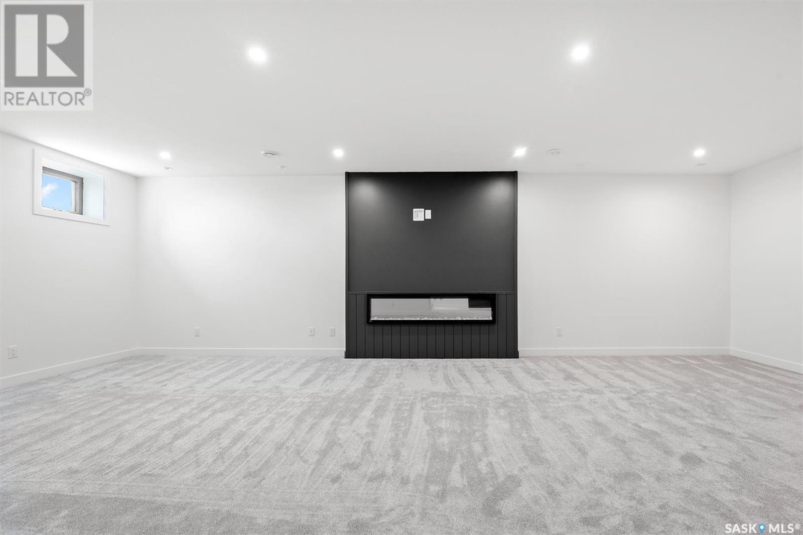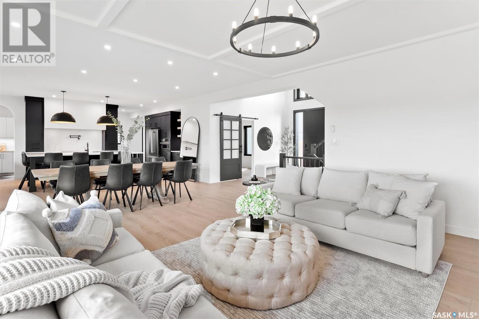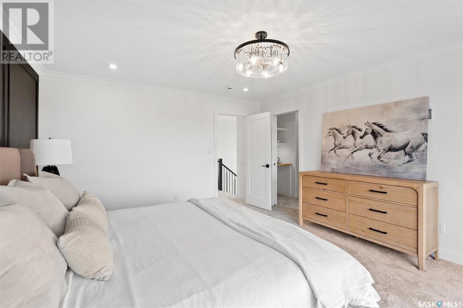 Luxury Acreage Living — Just Minutes South of the City Pavement to your doorstep and every detail beyond expectation. Welcome to this breathtaking new construction in prestigious Grasswood Estates — a stately 2-storey offering 2881 sq ft, 4+1 bedrooms, 4 bathrooms, and a triple attached garage on 2.63 acres of scenic land. A winding asphalt drive leads to this showpiece residence, where elegance, privacy, and convenience blend seamlessly. Step inside the grand two-storey foyer and prepare to be amazed by the expansive main floor, bathed in light from oversized black-clad windows. The heart of the home is an exquisite open-concept living area featuring a dramatic gas fireplace with stone surround and arched alcoves, flowing into an oversized dining area and chef’s kitchen. Culinary enthusiasts will love the oversize island, custom cabinetry, Venetian plaster hood fan, gas 6 burner range, wall ovens, 2 refrigerators and fully outfitted butler’s pantry. A private hallway leads to a stylish powder room and a spacious, well-designed mudroom with 24’ porcelain tile flooring. A versatile den on the main floor offers space for a home office or library. Upstairs, discover 4 bedrooms, a full laundry room, reading nook and 2 lux bathrooms. The primary suite is a retreat with a walk-in closet, hotel-chic coffee bar, and a divine spa-style ensuite. The fully developed lower level is perfectly designed for entertaining or family lounging — great room w/ a 2nd fireplace, wet bar, bedroom, play nook, a 4-piece bath, and a hidden speakeasy wine room behind a discreet door-truly unique!. Highlights include: soaring ceilings, custom millwork, heated triple w/ drive through overhead, covered composite deck, premium black window package, and landscaping including expansive grass area and a concrete patio extending outdoor living off the rear deck. Best of all, you’re minutes the city and the highly coveted neighbourhood Corman Park School- the best of rural living and urban convenience. (id:43042)
