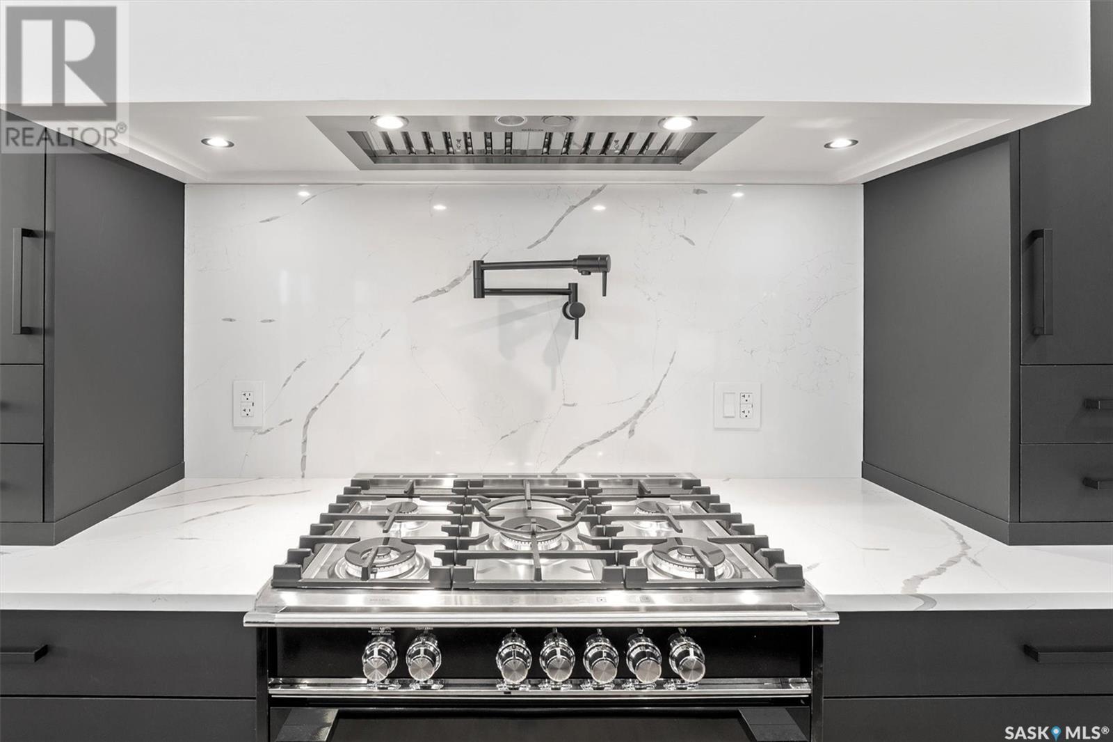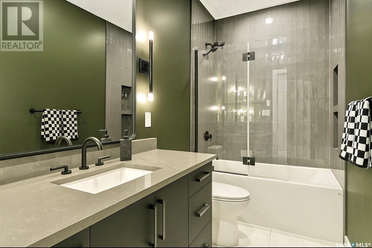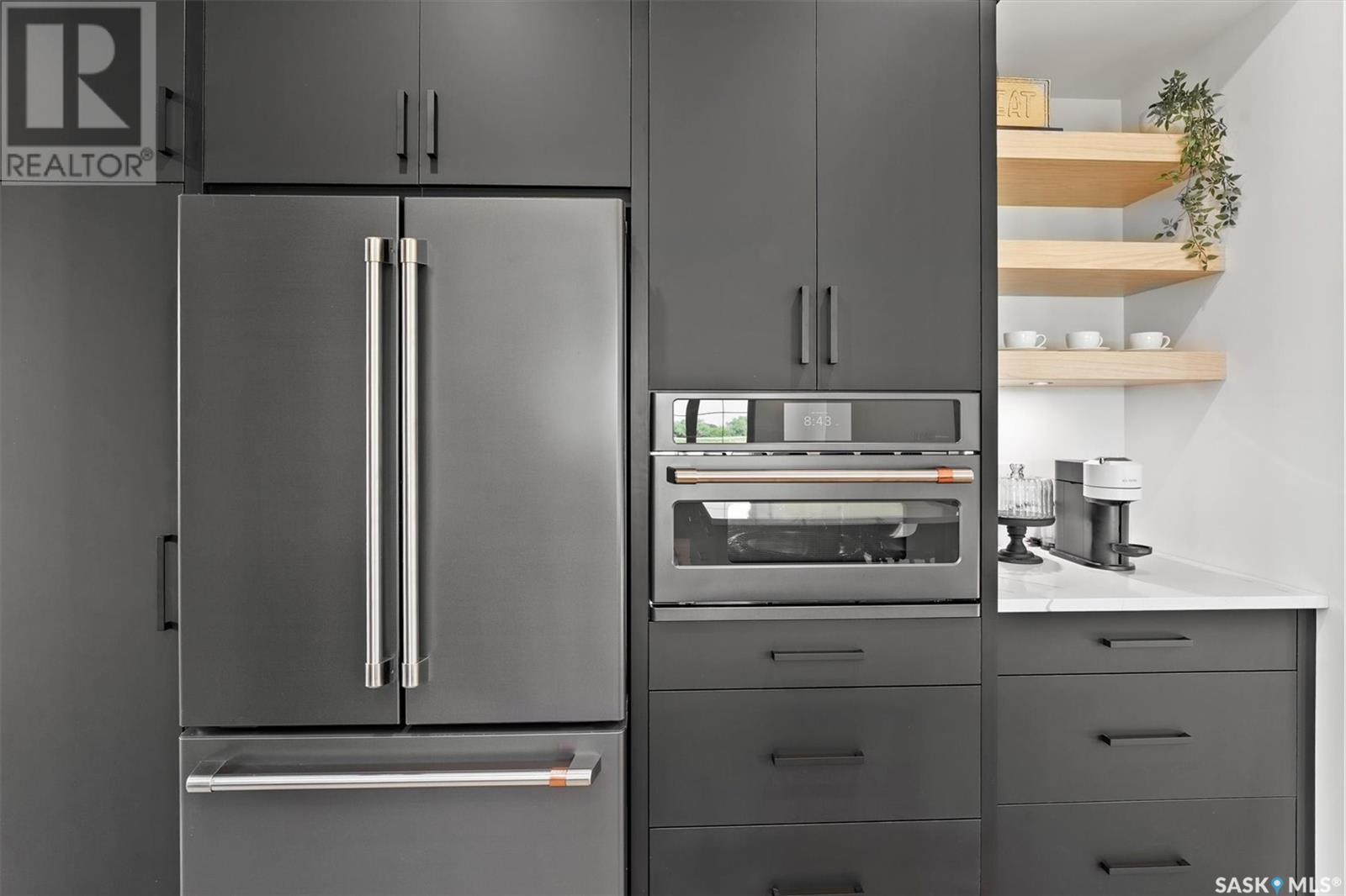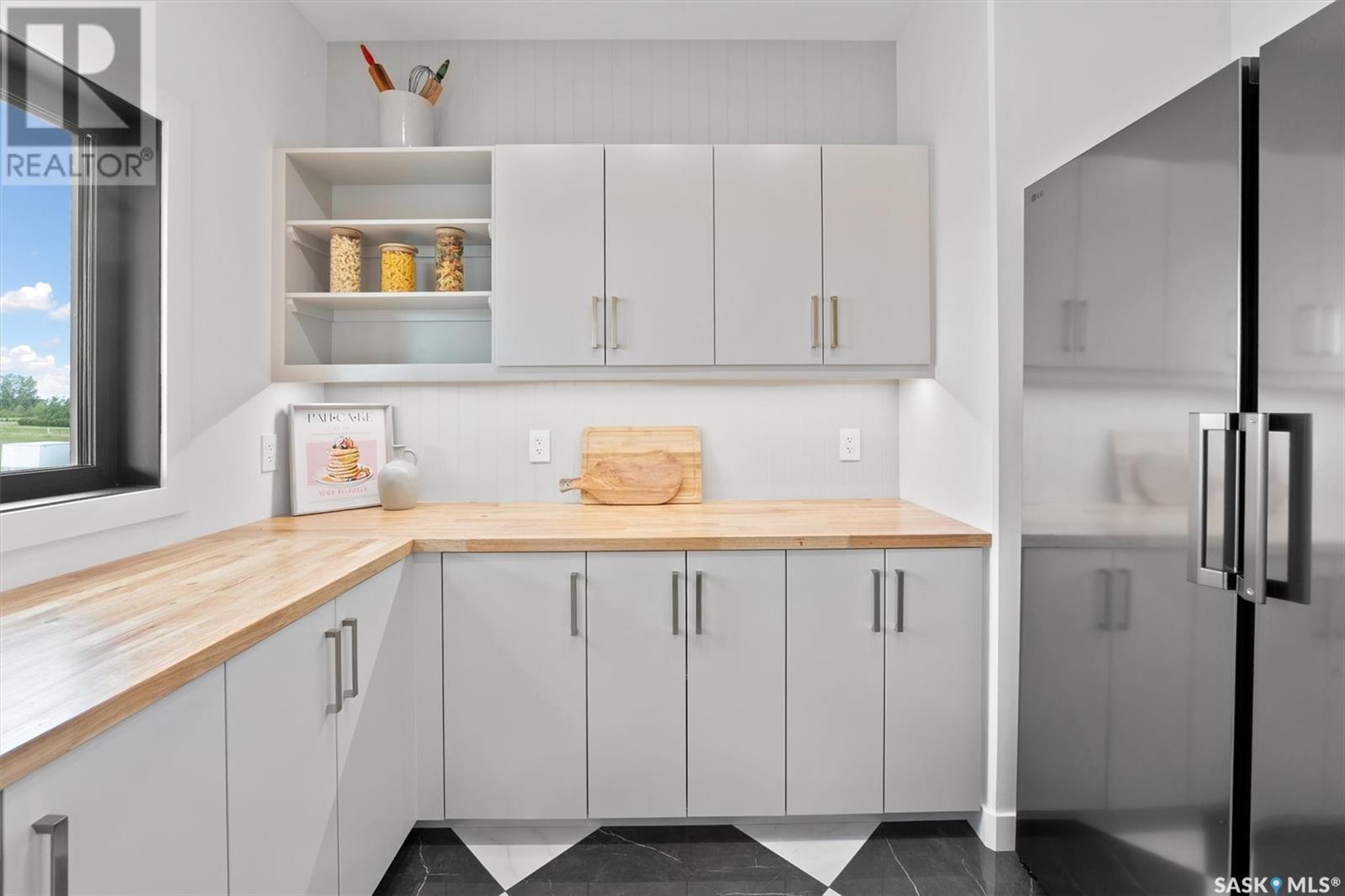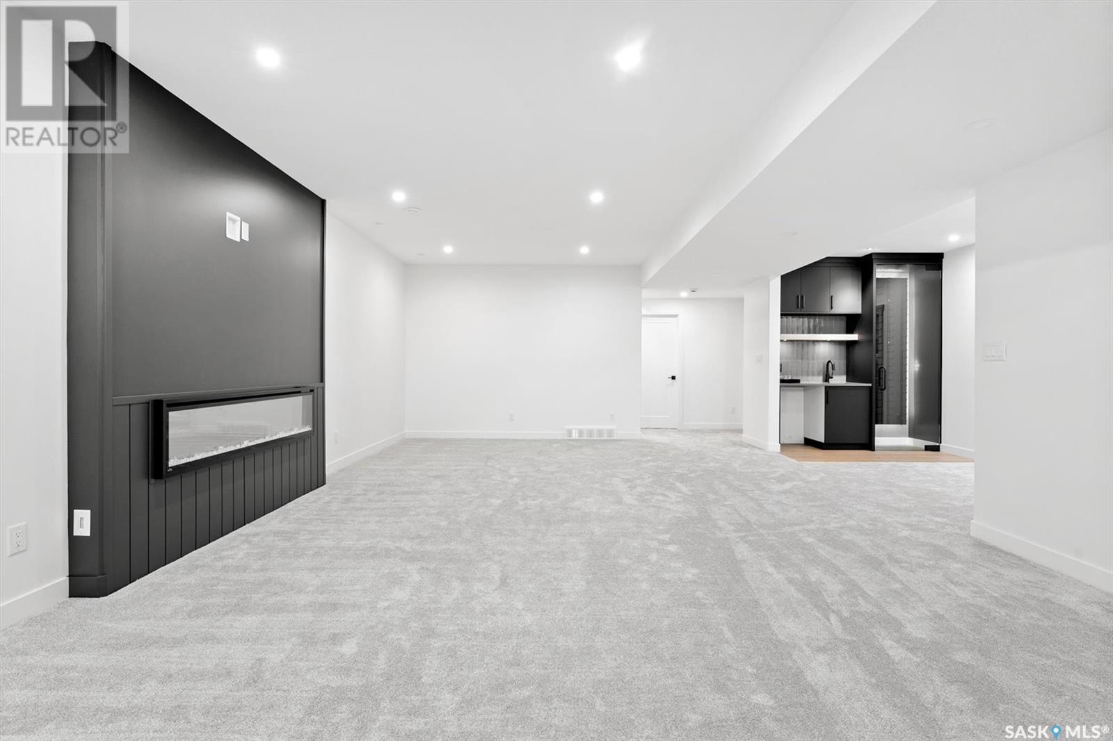 Luxury Acreage Living — Just Minutes South of the City Pavement to your doorstep and every detail beyond expectation. Welcome to this breathtaking new construction in prestigious Grasswood Estates — a stately 2-storey offering 2881 sq ft, 4+1 bedrooms, 4 bathrooms, and a triple attached garage on 2.63 acres of scenic land. A winding asphalt drive leads to this showpiece residence, where elegance, privacy, and convenience blend seamlessly. Step inside the grand two-storey foyer and prepare to be amazed by the expansive main floor, bathed in light from oversized black-clad windows. The heart of the home is an exquisite open-concept living area featuring a dramatic gas fireplace with stone surround and arched alcoves, flowing into an oversized dining area and chef’s kitchen. Culinary enthusiasts will love the oversize island, custom cabinetry, Venetian plaster hood fan, gas 6 burner range, wall ovens, 2 refrigerators and fully outfitted butler’s pantry. A private hallway leads to a stylish powder room and a spacious, well-designed mudroom with 24’ porcelain tile flooring. A versatile den on the main floor offers space for a home office or library. Upstairs, discover 4 bedrooms, a full laundry room, reading nook and 2 lux bathrooms. The primary suite is a retreat with a walk-in closet, hotel-chic coffee bar, and a divine spa-style ensuite. The fully developed lower level is perfectly designed for entertaining or family lounging — great room w/ a 2nd fireplace, wet bar, bedroom, play nook, a 4-piece bath, and a hidden speakeasy wine room behind a discreet door-truly unique!. Highlights include: soaring ceilings, custom millwork, heated triple w/ drive through overhead, covered composite deck, premium black window package, and landscaping including expansive grass area and a concrete patio extending outdoor living off the rear deck. Best of all, you’re minutes the city and the highly coveted neighbourhood Corman Park School- the best of rural living and urban convenience. (id:43042)