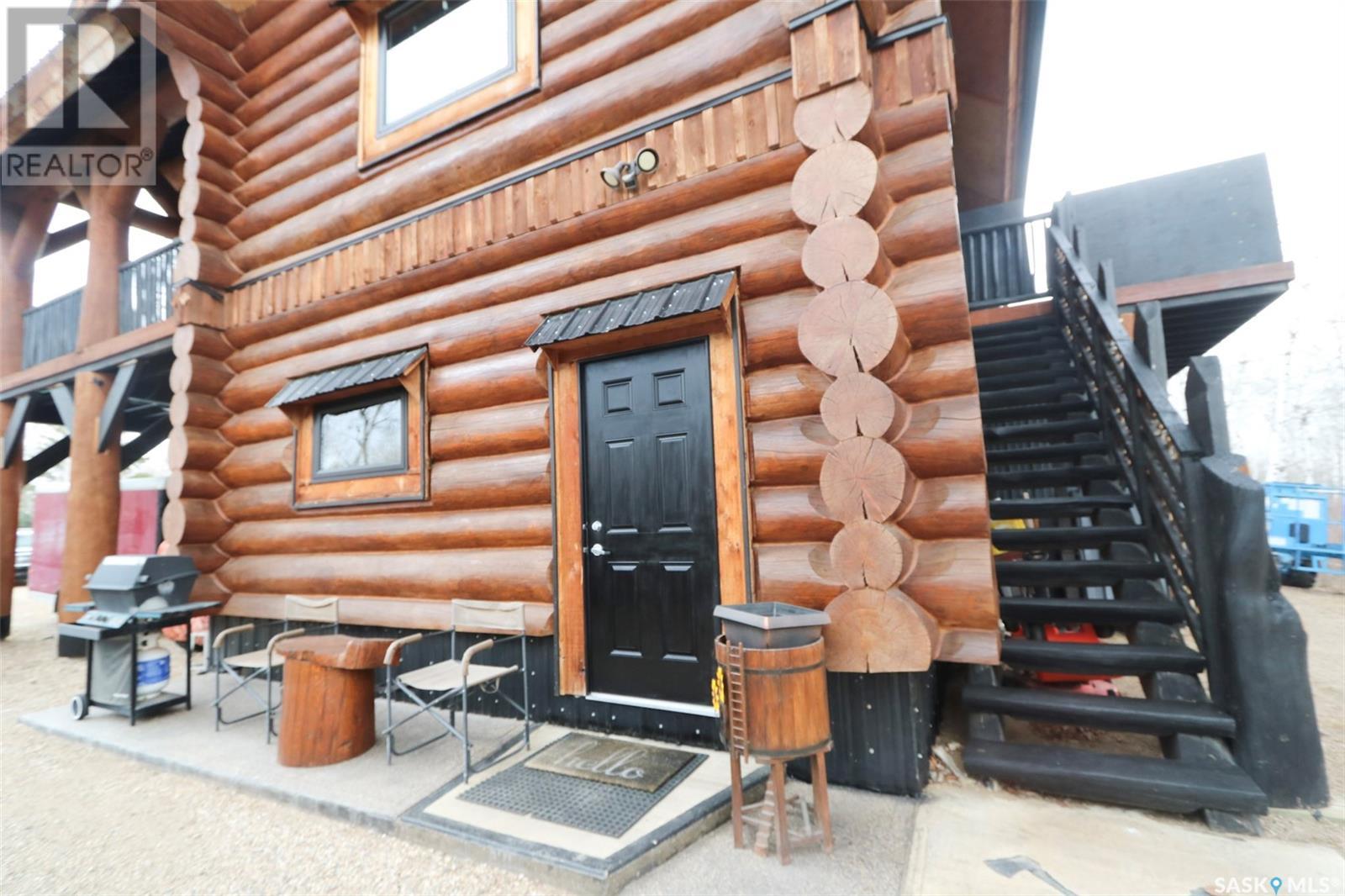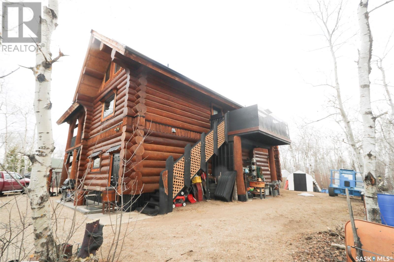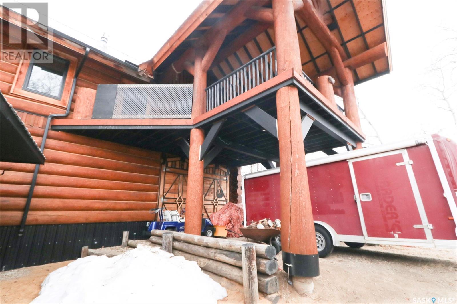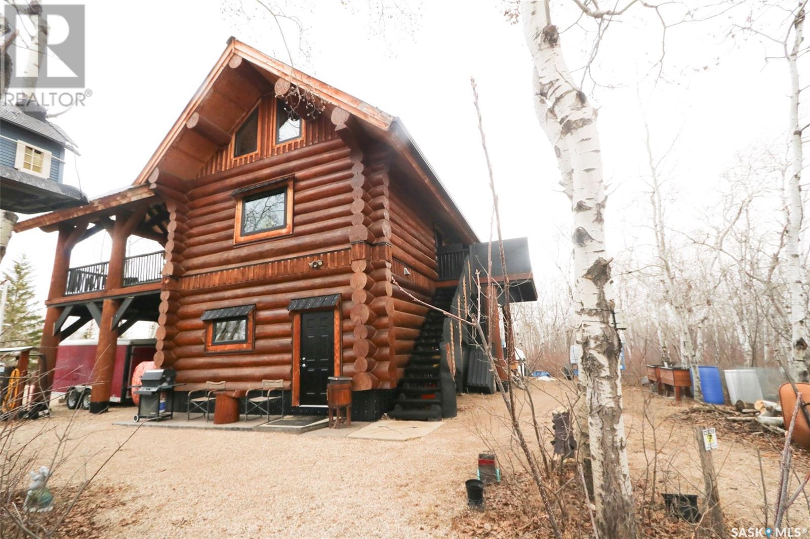 Escape to your private oasis with this stunning custom log home nestled on the south edge of Deerfoot Trail, offering peace and seclusion surrounded by mature trees. Located just 3 minutes from the beach and sand dunes, this home provides quick access to all the outdoor fun your family craves. With ample parking space for your camper, boat, or toys, adventure is always within reach.The property also features a charming guest bunkhouse with a kitchenette and an outhouse for convenience during those cozy fire-lit evenings. Inside the main home, you'll find a spacious family room perfect for games, lounging, and entertaining. Custom side-up counters line both sides of the room, leading to the back door, where you'll find the laundry area and a versatile room that can host two bedrooms, along with a shared 3-piece bath. Large barn-style doors open to a future covered patio, offering additional living space.Upstairs, the craftsmanship continues with beautiful log finishes throughout, creating an inviting and cozy atmosphere with vaulted ceilings. The highlight of this space is the expansive covered concrete balcony, complete with in-floor heating and breathtaking lake views. The custom log table with built-in benches provides the perfect spot for family gatherings and sunset watching. The well-appointed kitchen offers plenty of space for preparing your favorite dishes, while the inviting living room with a fireplace is perfect for those quiet evenings in. The master suite features a luxurious 5-piece bath, a walk-in closet, and stackable laundry for added convenience. A second balcony off the living room is the perfect spot for morning coffee as you take in the sunrise.A custom spiral staircase leads to the loft space, ideal for a bedroom or play area for the kids. Whether you're enjoying nature, spending time with family, or pursuing your hobbies, this home offers a lifestyle that's second to none. (id:43042)