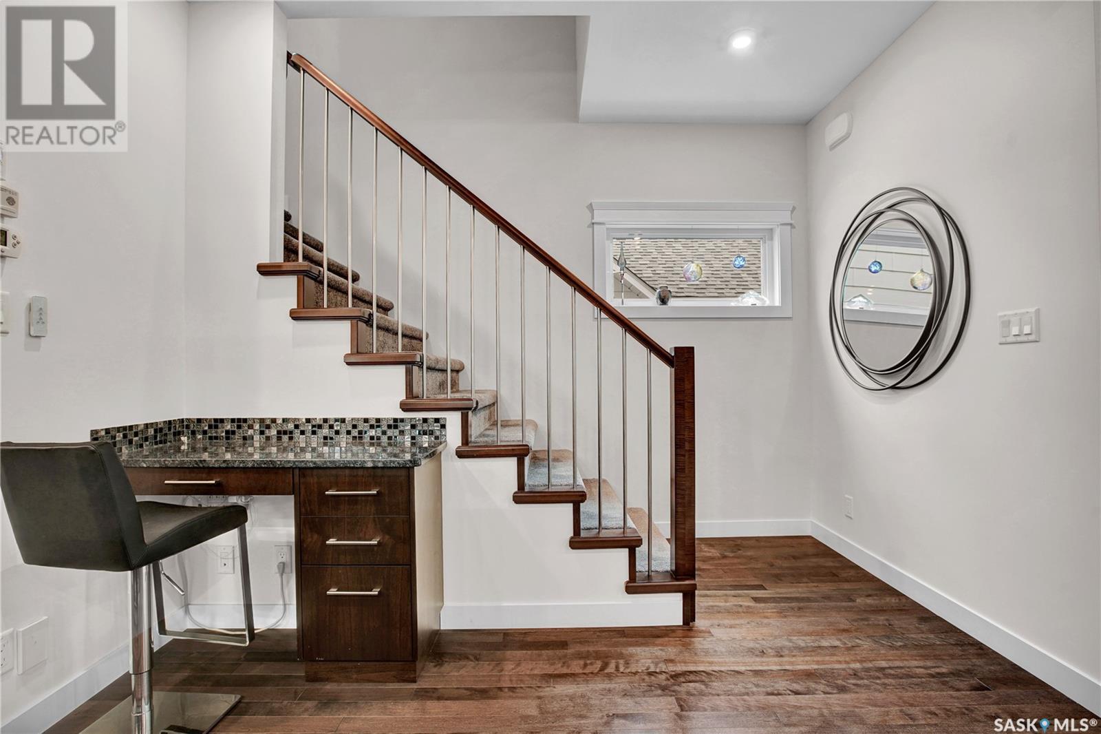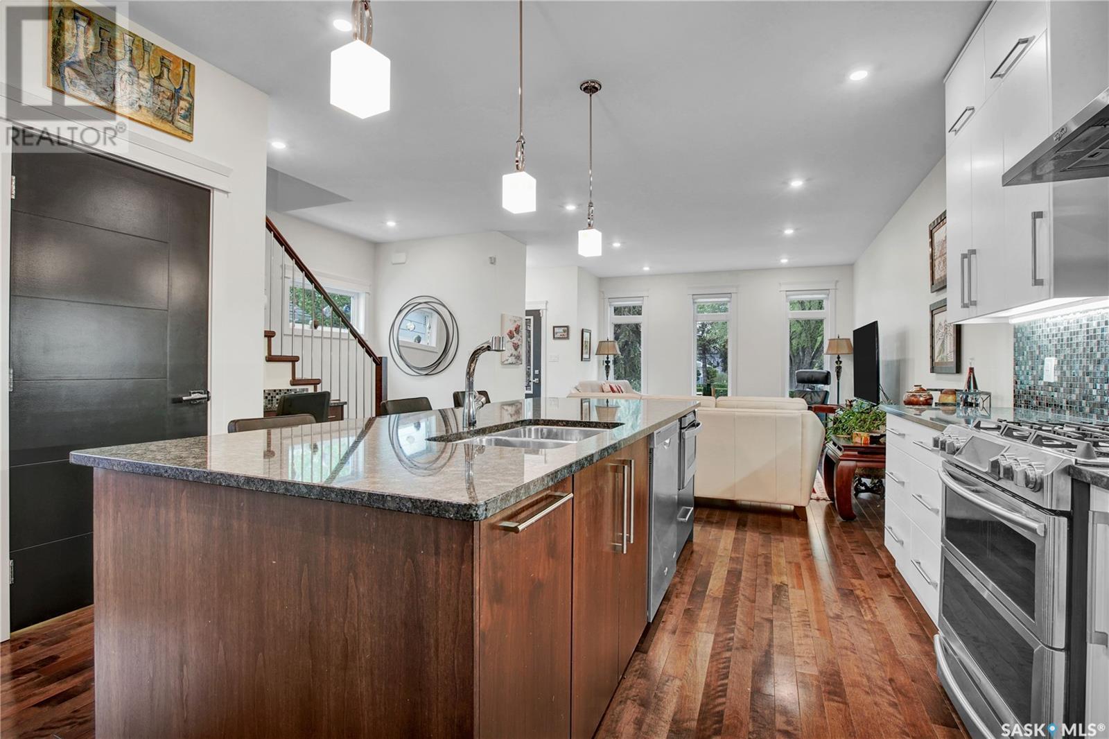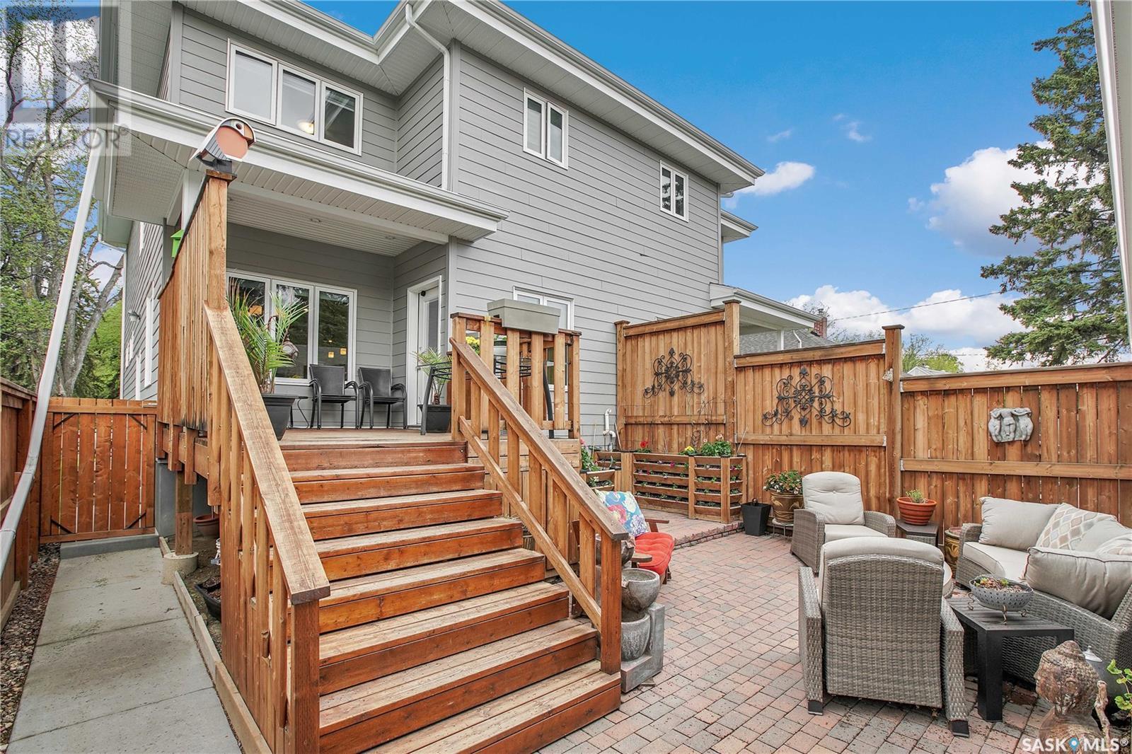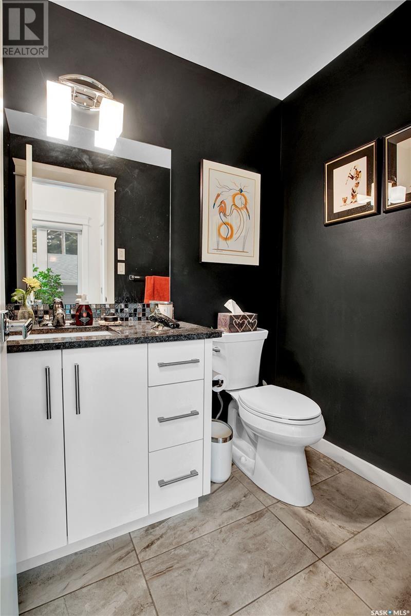 ***View the Video***Here is a dream property nestled in the heart of the Haultain community. This newer infill property boasts grand curb appeal & will for sure catch your eye with its stunning brick exterior accented with hardie board on the remainder. Sitting at 1850sqft, this home is larger than the average newer homes in this area, allowing for extra features & extra room for living & entertaining. Inside you are greeted with 9 foot ceilings & an open floorplan. The main floor is outfitted with hardwood flooring & has a large front room with huge windows allowing for abundance of natural light - with window coverings controlled via remote, another special perk of many in this home! The kitchen separates the living room to a formal dining space that is easily able to house your extra large table for those big gatherings, a rare feature in today's newer homes! The kitchen has a walk-in pantry, gas stove, granite counters & offsetting cabinets featuring a large island ideal for entertaining & food prep!!! There is of course a 2 pc bathroom on the main for convenience. Upstairs houses 3 of the 4 bedrooms in this home along with 2 more bathrooms. The owner's suite is gorgeous - featuring a nice sized walkin closet with custom shelving & a large 4 piece bathroom with dual sinks, walk-in glass & tile shower! There is also upstairs laundry in its own room with a utility sink. Downstairs is developed & continues with the 9 foot ceilings too. There is separate entrance if you choose to put in a basement suite. The basement has a gorgeous wet bar & nice sized sitting room, storage room, 3pc bath, & a good sized bedroom. The utility room has ample storage space that houses the central vac, high efficient furnace & water heater! Outside is tastefully done with a private patio area that leads to your double detached oversized heated garage. Other features include central air conditioning & a natural gas bbq line too! Contact a Realtor today to schedule your private viewing!!! (id:43042)