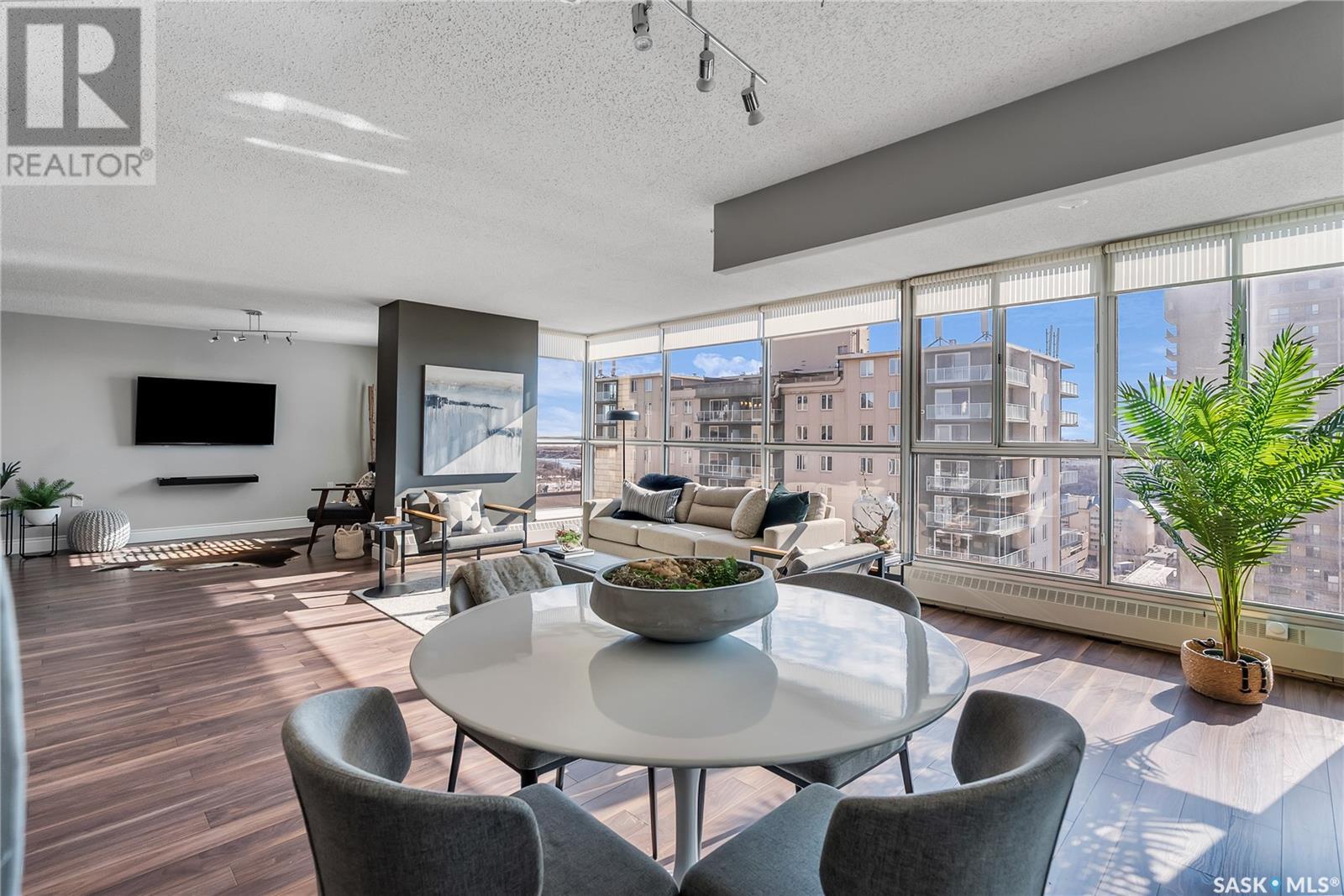 Prime downtown location! Experience the epitome of luxury living in this stunning 20th floor condo, showcasing our city skyline and exquisite river views This home has had many renovations offering a seamless blend of modern style and comfort. This generous 2-bedroom, 2-bathroom unit is designed with an impressive layout delivering over 1500 square feet throughout. Inside you will find the trendy kitchen with brand new quartz countertops, spacious island, stainless steel appliances and tons of cupboard space. The open concept design provides ample space for a dining area and two separate living room spaces to enjoy the beautiful river views from the comfort of your own home. The Master bedroom is huge with a stunning view, his and hers closet space and a 3pc master ensuite. There is a spacious 2nd bedroom featuring a large closet, fireplace along with a full 4pc main bathroom. Additional conveniences include in-suite laundry and in-suite storage. The renowned "Terrace" building features an indoor swimming pool, sauna, hot tub, hospitality suite for guests, a fully equipped amenities room/lounge, a fully equipped outdoor patio with BBQs and the famous rooftop patio for incredible panoramic views of Saskatoon. CONDO FEES INCLUDE ALL UTILITIES!! Making this a hassle-free living experience. This unit includes one underground parking stall. Don’t miss your chance to own this exquisite, move-in ready penthouse style condo with one of the city’s most spectacular riverfront views. Contact today for a private viewing! (id:43042)
