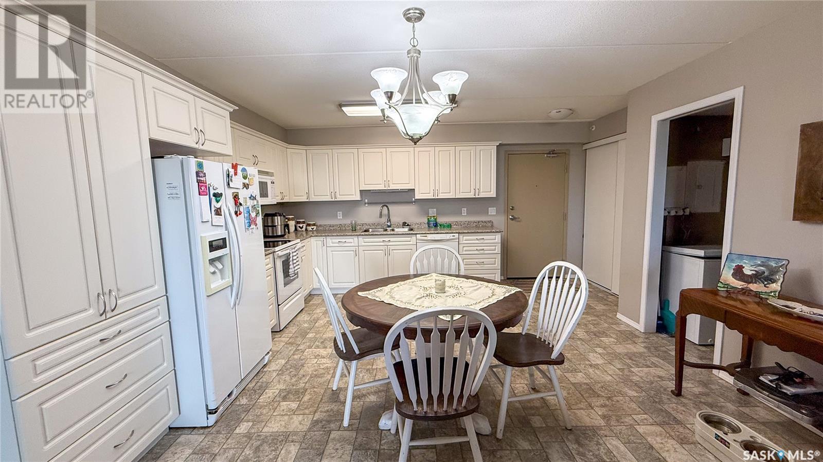 $383 MonthlyCondo in the Prestigious River Valley Estates in Battleford on 2nd level. View of River Valley, green spaces and beautiful sunsets. Spacious 947 sq. ft. open concept kitchen dining area with lots of white kitchen cabinets. Laundry off kitchen. Cozy living room with access to 5x25 ft balcony with storage area. 2 bedrooms, master bedroom has 2 pc ensuite, and large closet. Secure heated parkade provides warmth for winter. Amenities room, exercise area included. (id:43042)