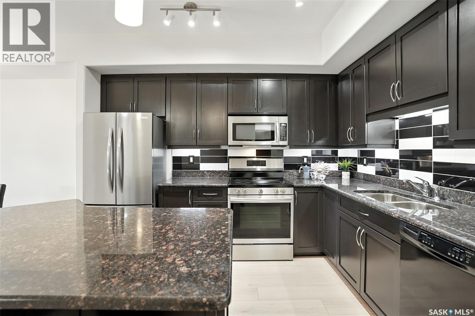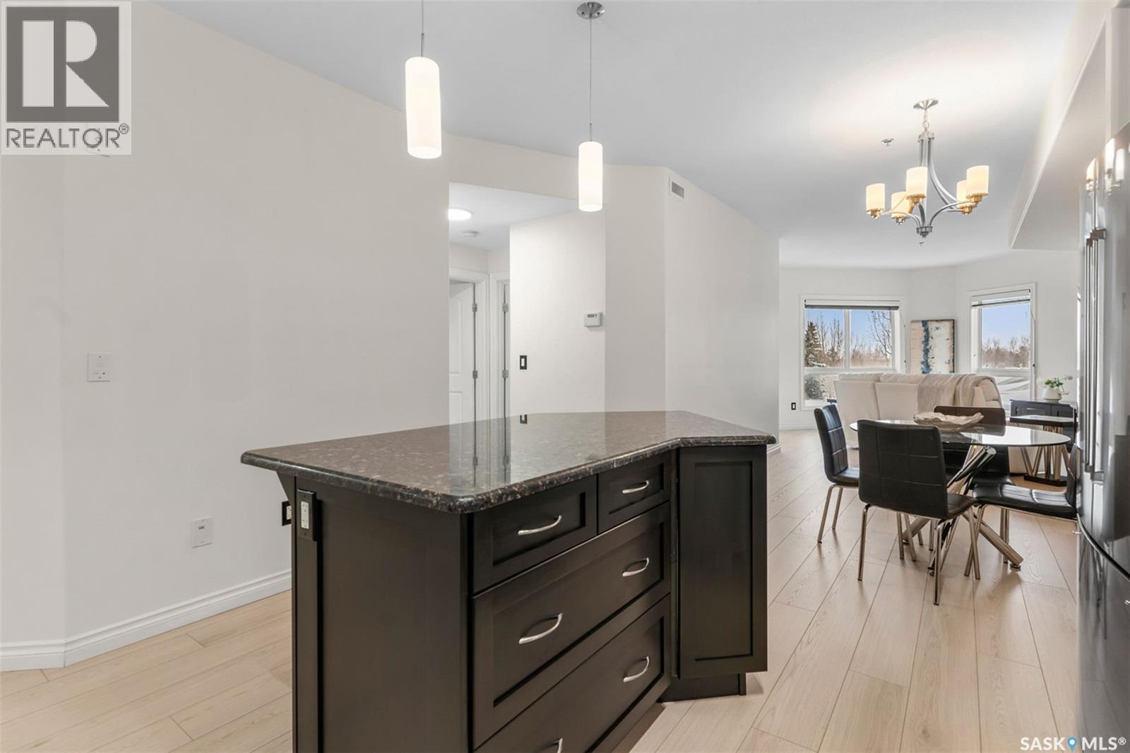 $623 MonthlyWelcome to 206-227 Pinehouse! This south-facing condo has a spacious entry, ample closets and private laundry room with storage. The open layout connects the kitchen, dining and living areas, offering views of fir trees and skyline. The modern kitchen features granite countertops, backsplash, brand new counter depth fridge and range and plenty of cabinet and work space. The sunlit living area, master bedroom with ensuite and walk in closet and a second bedroom with large window offer comfort. There is also a versatile den for office space. Enjoy new laminate flooring and a freshly painted, immaculate space! Relax on your private balcony in the sunshine. Condo includes underground parking and storage unit. The building is equipped with in-floor heating, sound-insulated walls and natural heat in parkade. River Gate condominiums also offers a recreation center, summer garden beds and a gazebo. Located in popular Lawson Heights - near the river, Meewasin Trail and various amenities like a mall, dining and medical services. Move in immediately and seize this fantastic opportunity! Don't let is slip away - call for a viewing today! (id:43042)