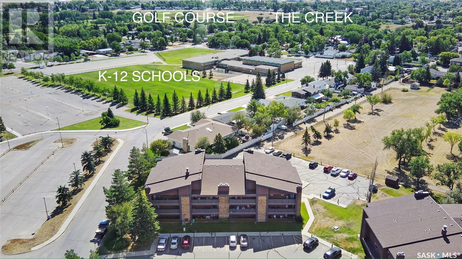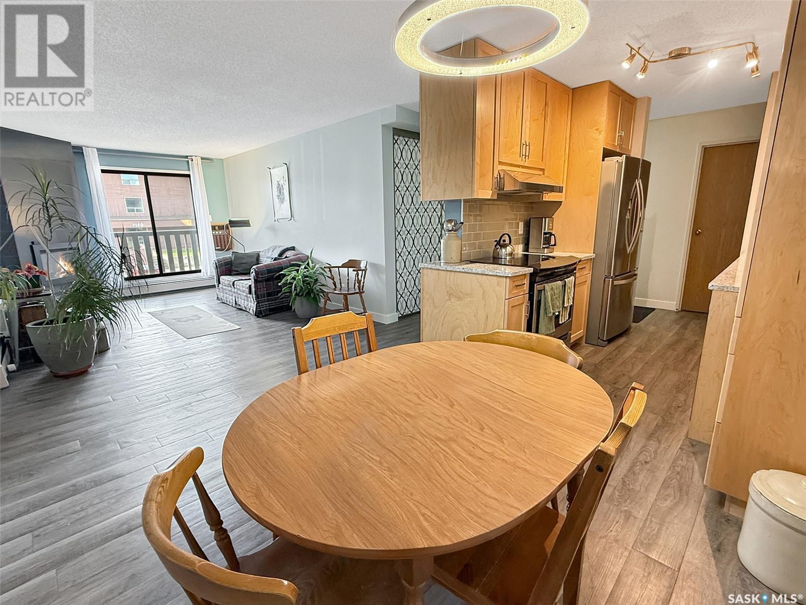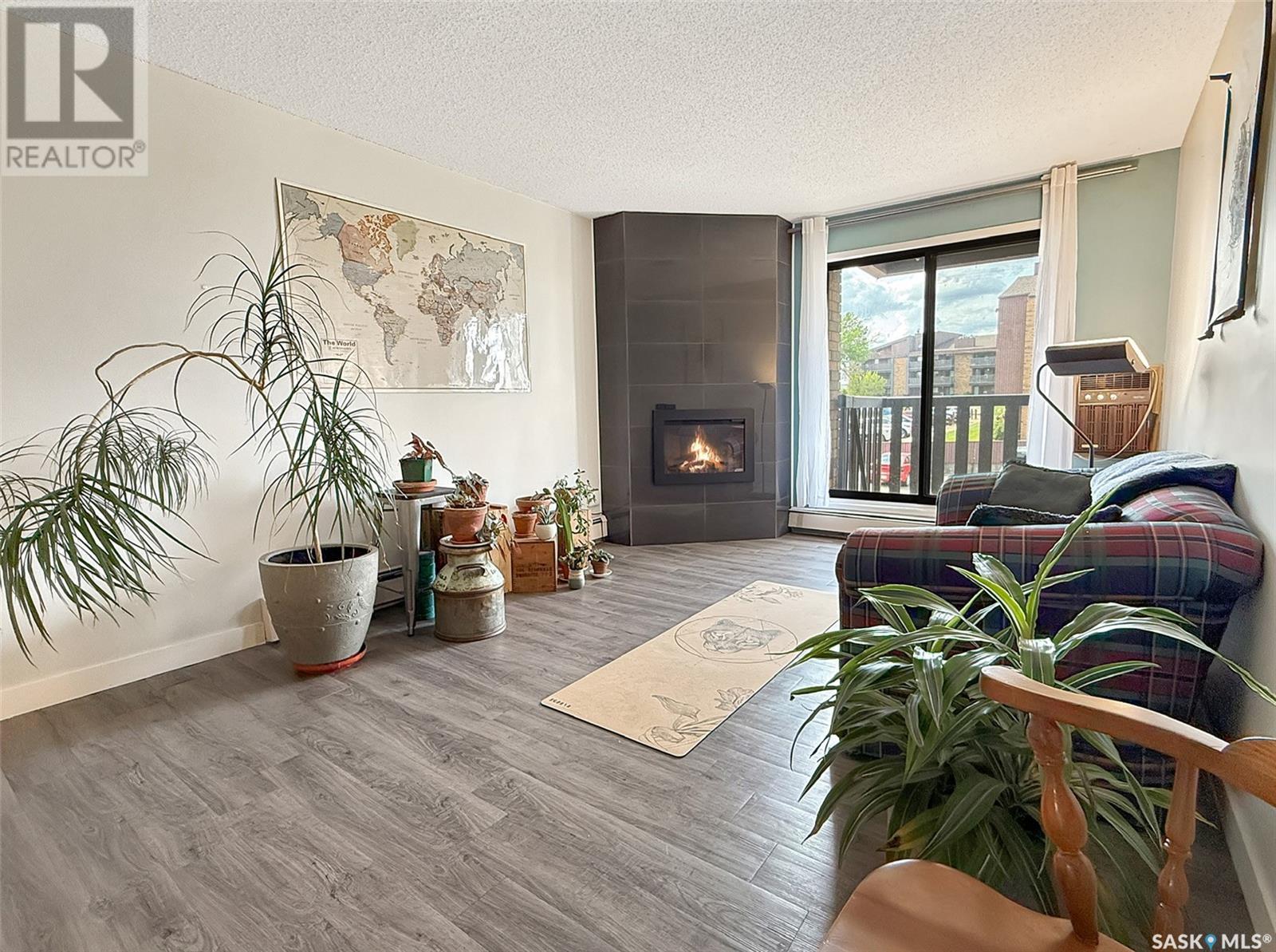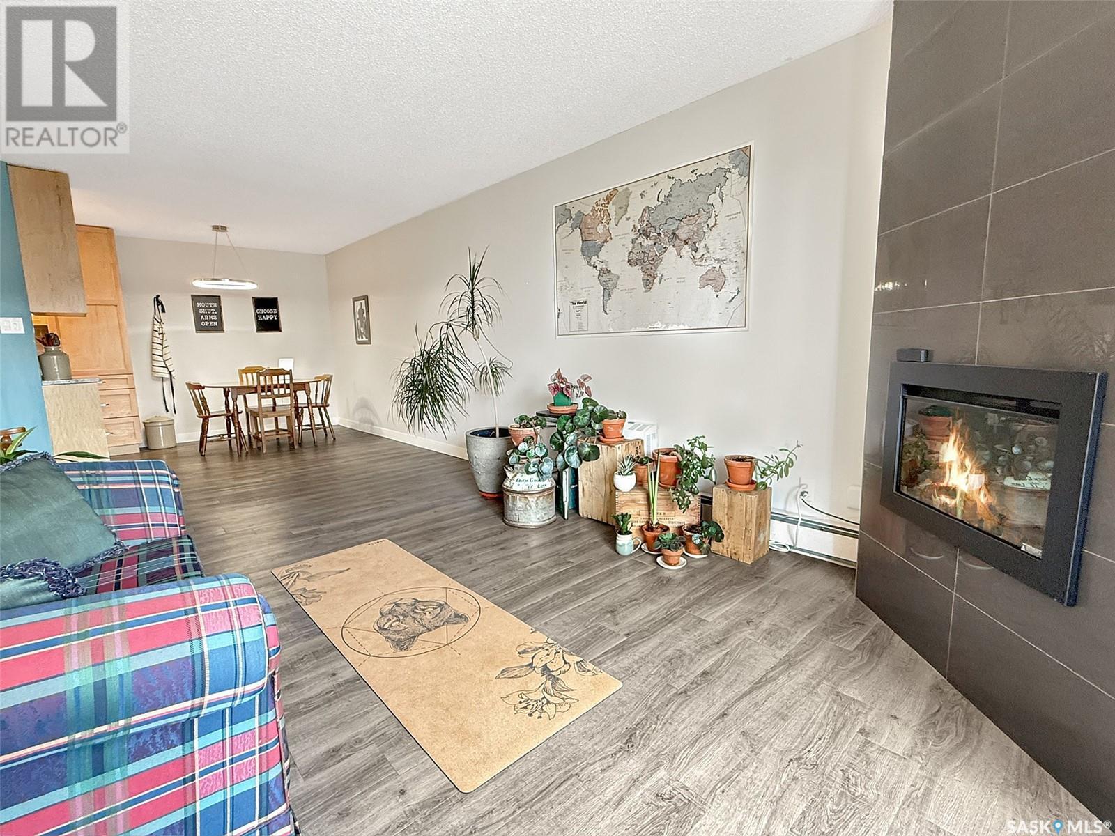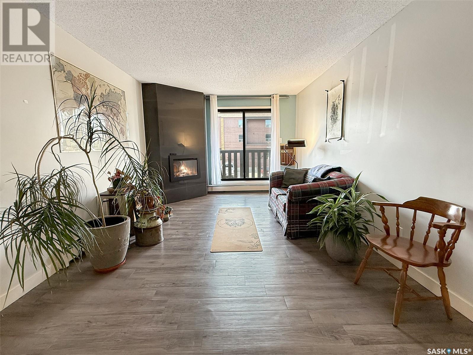 $310 MonthlyExperience the epitome of carefree condo living without compromising on style in this beautiful second-story unit. The interior has been FULLY RENOVATED with modern colours and vinyl plank flooring, creating a welcoming atmosphere throughout. The remodelled galley-style kitchen features granite counter tops, updated cabinetry, stainless steel appliances, and ample workspace for meal preparation. Adjacent to the kitchen is an open-concept living and dining area, highlighted by large, bright windows that flood the space with natural light. An updated electric fireplace adds a touch of elegance and warmth to the room. This condo offers two bedrooms and a fully renovated four-piece bathroom complete with a spacious tub and high profile contemporary sink. Additionally, the unit includes in-suite laundry and an oversized storage room, enhancing convenience. Step outside through the patio doors to discover a private balcony, featuring enclosed storage —perfect for relaxation or entertaining. The location is ideal, with K-12 schools and daycare facilities directly across the street, the indoor swimming pool as well as walking paths, a scenic creek, multiple parks, Elmwood Golf Course, and an array of restaurants and amenities all within walking distance. Further highlights of this exceptional condo include a picturesque view, wall-mounted air conditioning, and an electrified designated parking spot just outside. Don’t miss out on this incredible opportunity—contact your agent today for more information or to schedule a personal viewing! (id:43042)