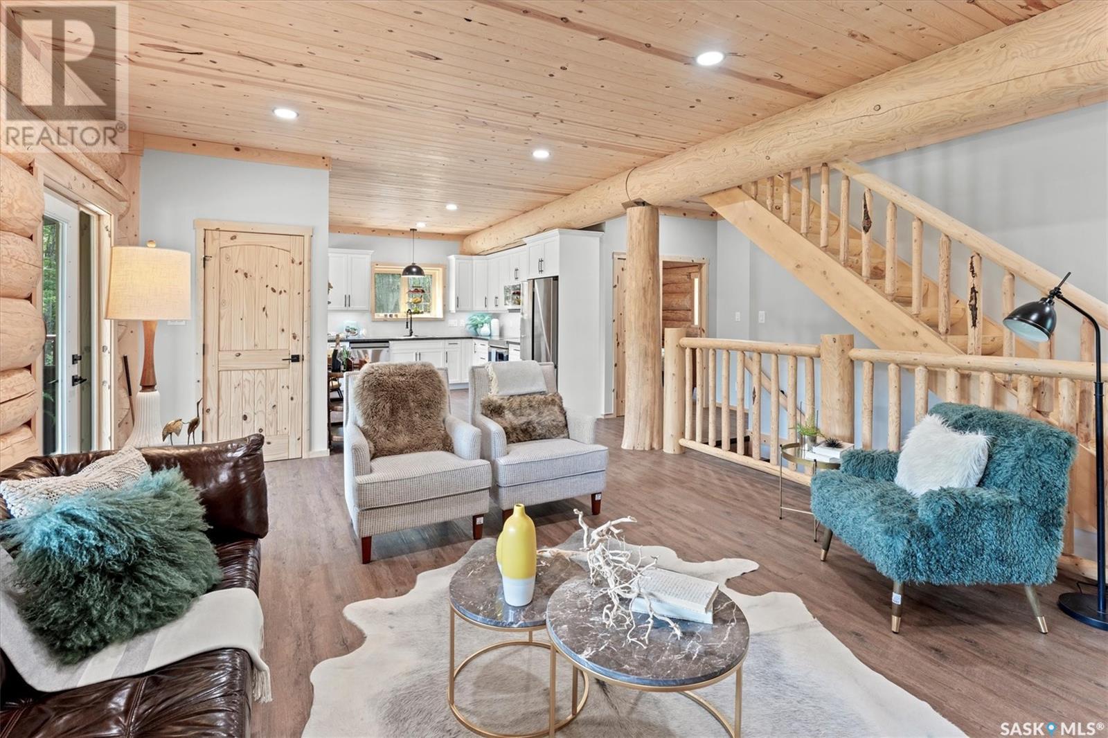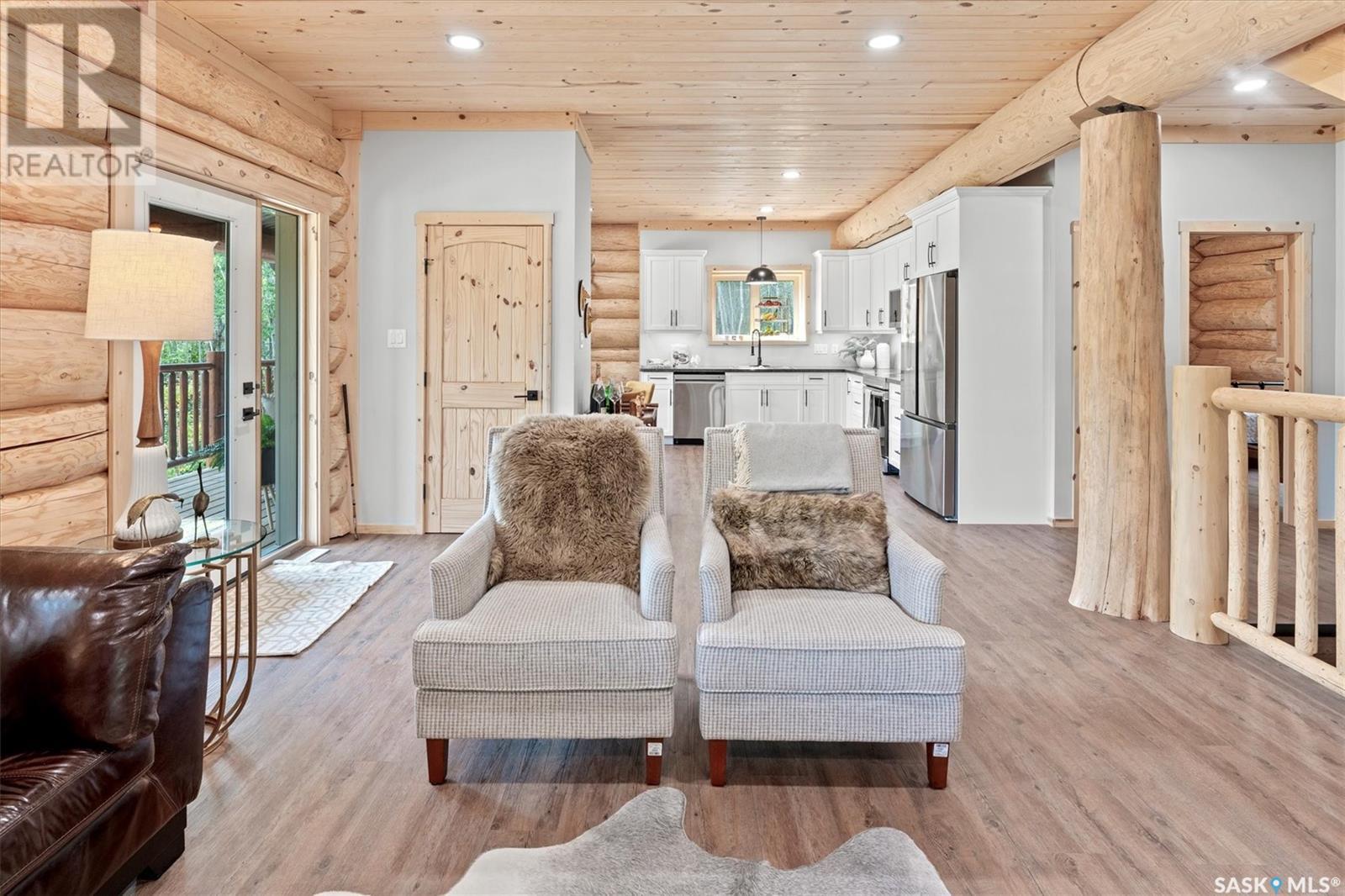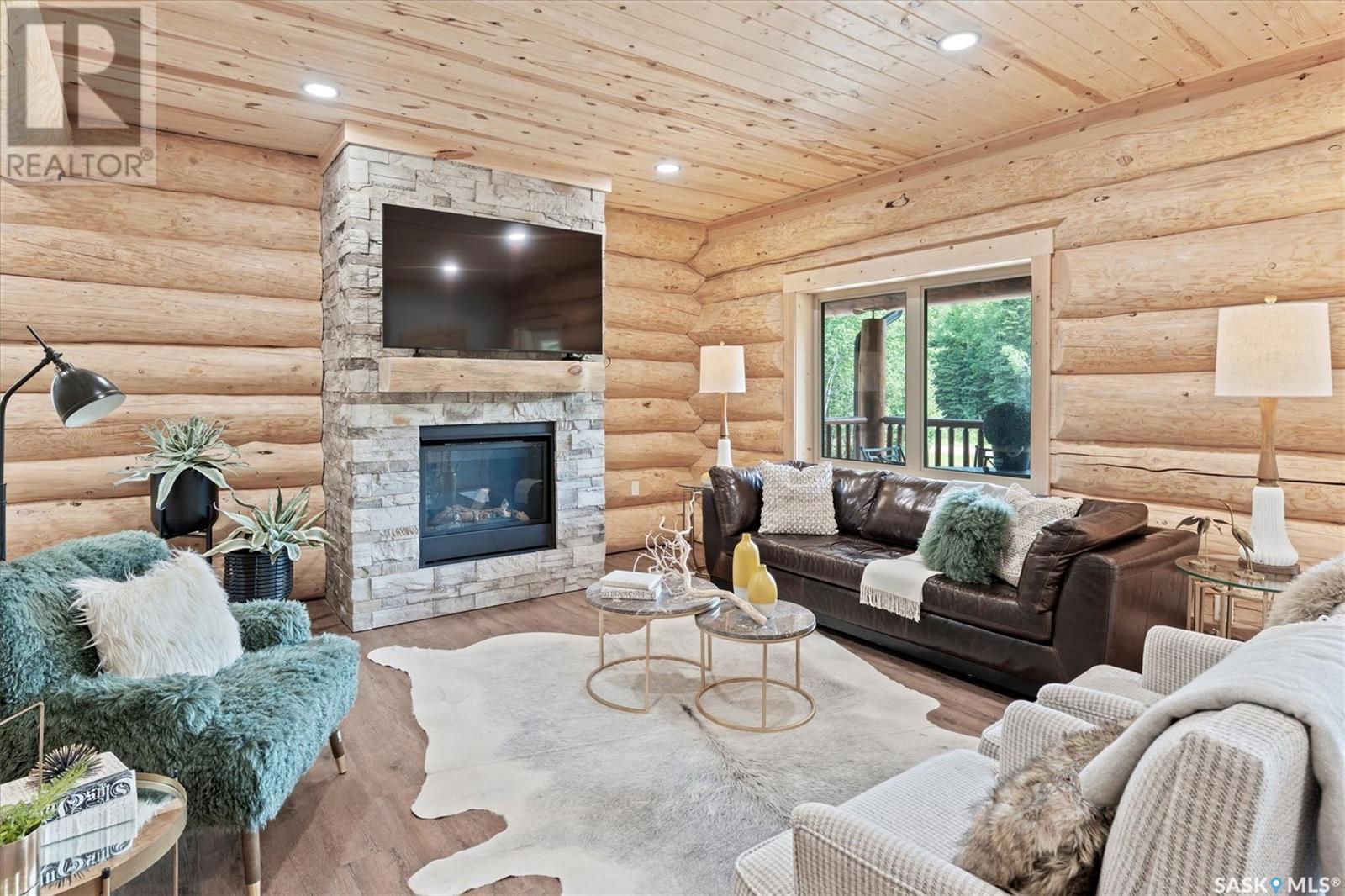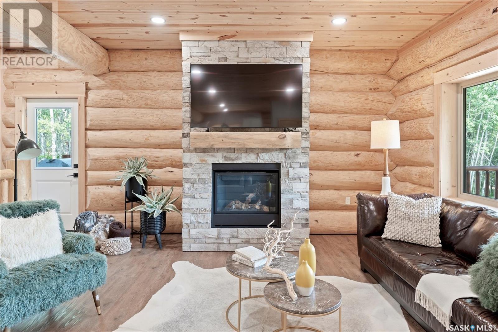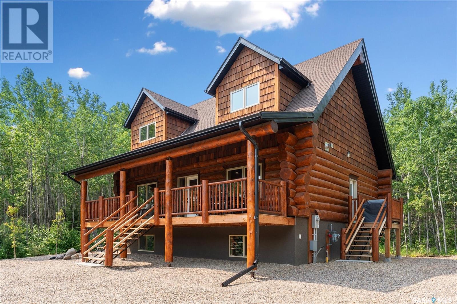 Stunning Authentic Four-Season Log Home by Lakeland Log & Timber – 2.4 Acres at Emma Lake! Welcome to Timber Estates. This exceptional log home, built by the renowned Lakeland Log & Timber, is nestled on a private landscaped 2.4-acre lot, just steps from Murray Point and the marina. Surrounded by mature forest in a manicured enclave, this is Emma Lake living at its best. 1,808 sq ft custom-built home features 3 beds, 2 full baths, an impressive bonus room retreat, and a raised basement with large windows and tall ceilings. A covered front porch with timber details welcomes you into an open-concept main floor featuring a spacious kitchen, dining, and great room – anchored by a stone fireplace and log mantle, with log walls and exposed timber beams throughout. The kitchen features classic white shaker cabinetry, stainless steel appliances, and a spacious dining area that opens into the living room, making it perfect for cozy lake evenings. Durable, natural-look vinyl plank flooring and pine-clad ceilings throughout main; in addition two spacious main-floor bedrooms w/ log accent walls and a 4pc bathroom. A floating log staircase leads to the second floor. 2nd level features a spectacular bonus room with peaked/vaulted ceiling, timber beams/posts, dormer window nook, and pine-clad ceiling, providing a unique additional lounge and entertaining space. The 2nd flr primary suite has vaulted pine ceilings, a sitting area, custom walk-in closet, and a 4pc ensuite. Additional highlights: Four-season construction with incredible craftsmanship by LAKELAND LOG AND TIMBER Large water tank, sump pump, and weeping tile. Landscaped low maintenance cleared yard and drive, surrounded by forest. Located in prestigious Timber Estates, among other luxury log homes, a well-managed, quiet estate community. Minutes to Marina, Beach and all the recreation of Emma Lake. A rare opportunity to own a spectacular, timeless log home with exceptional traditional craftsmanship. (id:43042)