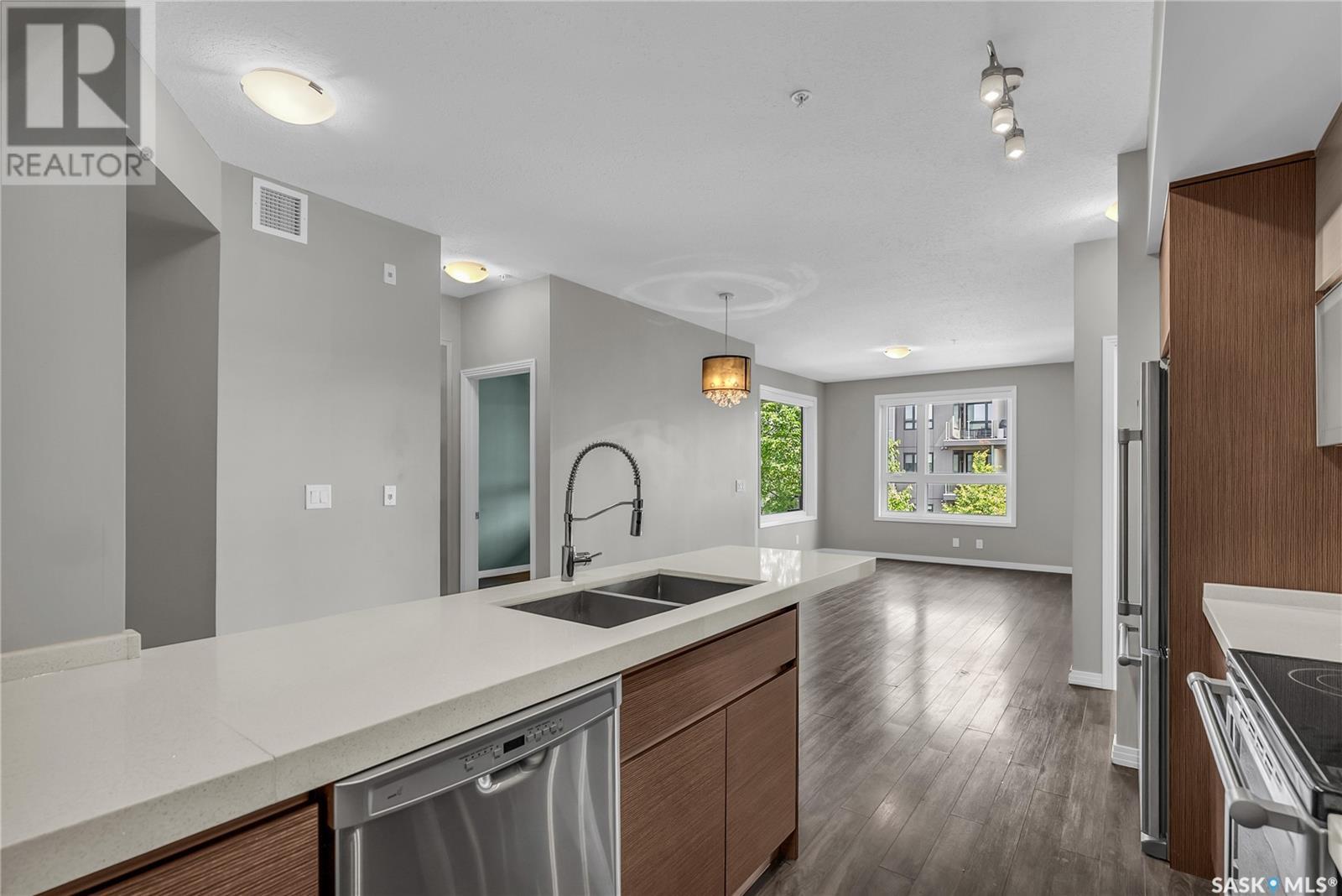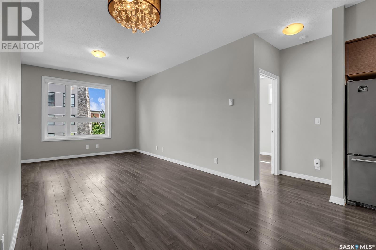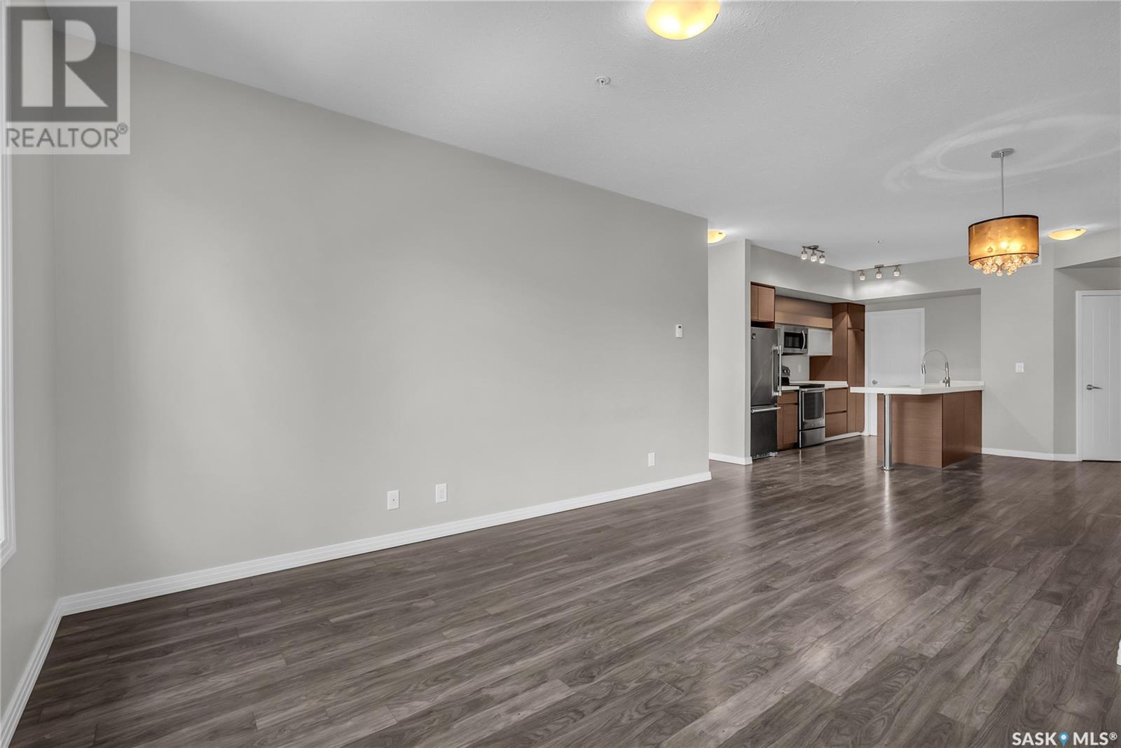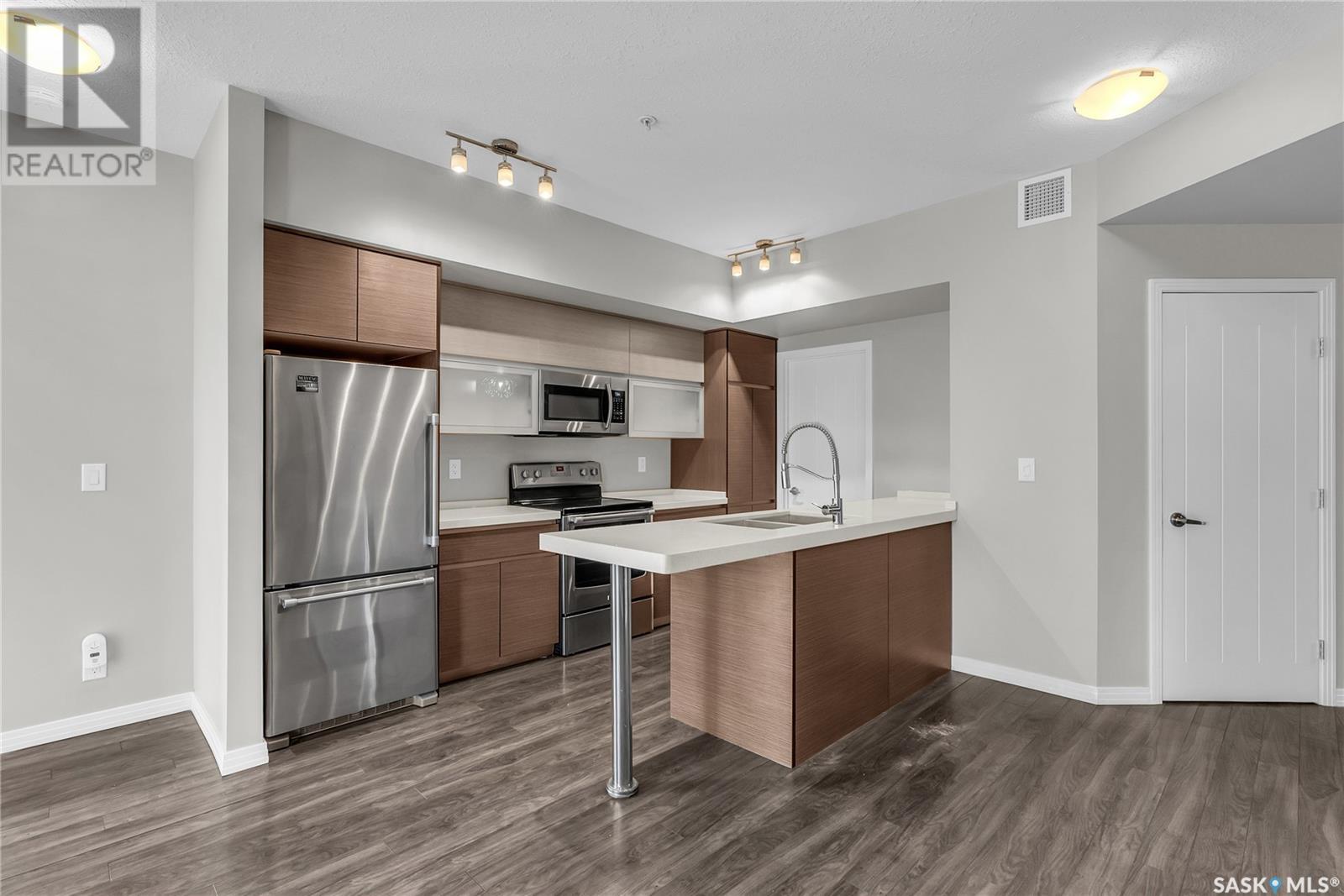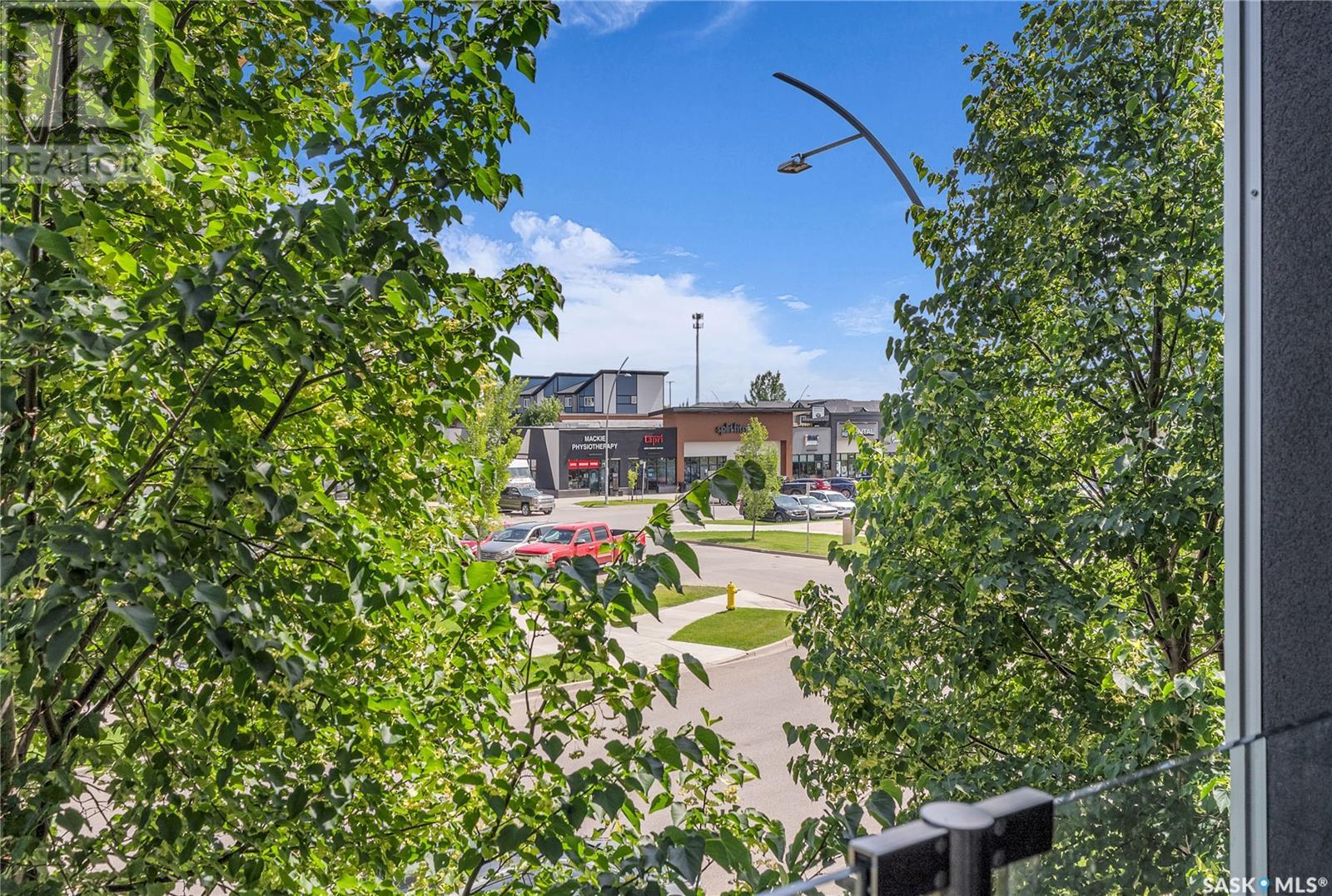 $526 MonthlyWelcome to unit #222 – 235 Evergreen Square, located in the heart of many amenities, clinics, restaurants, and quick access to schools, parks, and Circle Drive! The Sequia Rise complex features stunning curb appeal, yoga/exercise room, board room and elevator access. Stepping into the condo unit, you are met with plenty of natural light flowing throughout, 9ft ceilings, and warm laminate flooring coming into your kitchen. Kitchen features beautiful quartz countertops, tile backsplash, pantry, wood cabinets, and stainless-steel appliances. Coming to your living room, with blinds package and access to your balcony! Your luxurious primary bedroom is king accommodating, with plenty of closet space with custom organizers and shelving, as well as a 3-pc ensuite featuring glass shower, dual vanity with quartz counter, and tile flooring. An additional good-sized bedroom, 4-pc bath with matching tile floors and quartz countertops, and in-suite laundry complete this unit. Additionally, two parking stalls are included, visitor parking, and central air. Must see, beautiful condo in the desirable neighborhood of Evergreen! (id:43042)