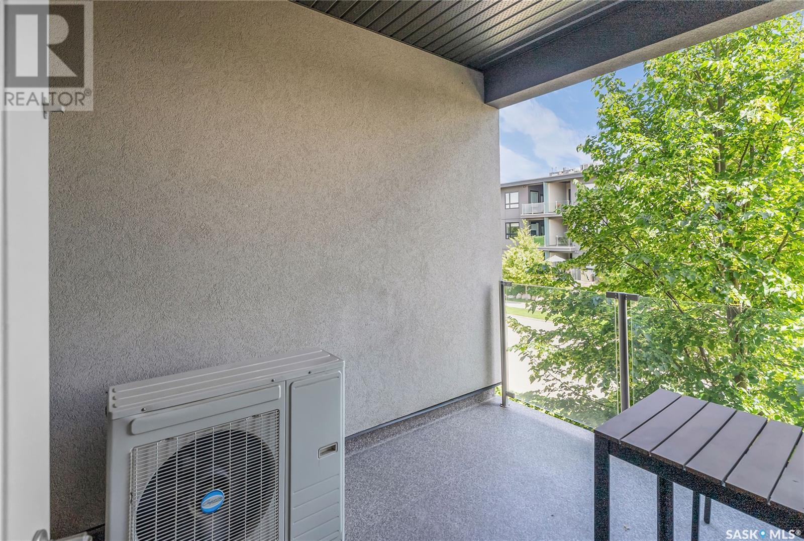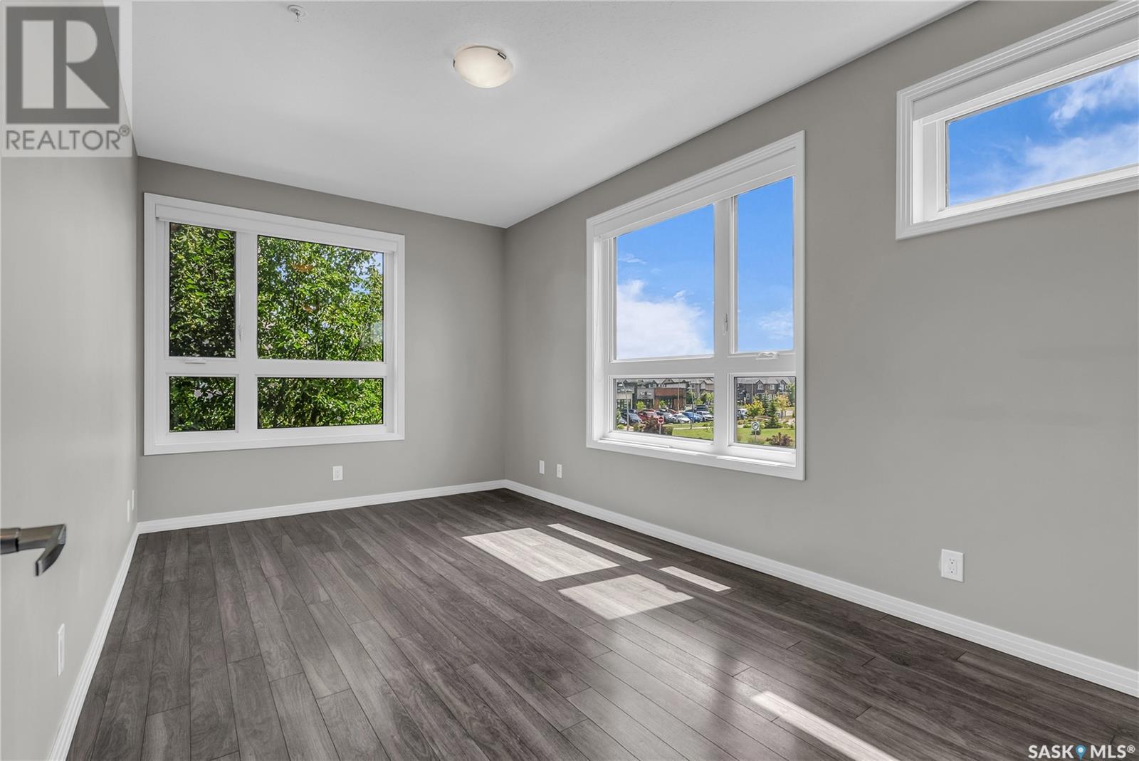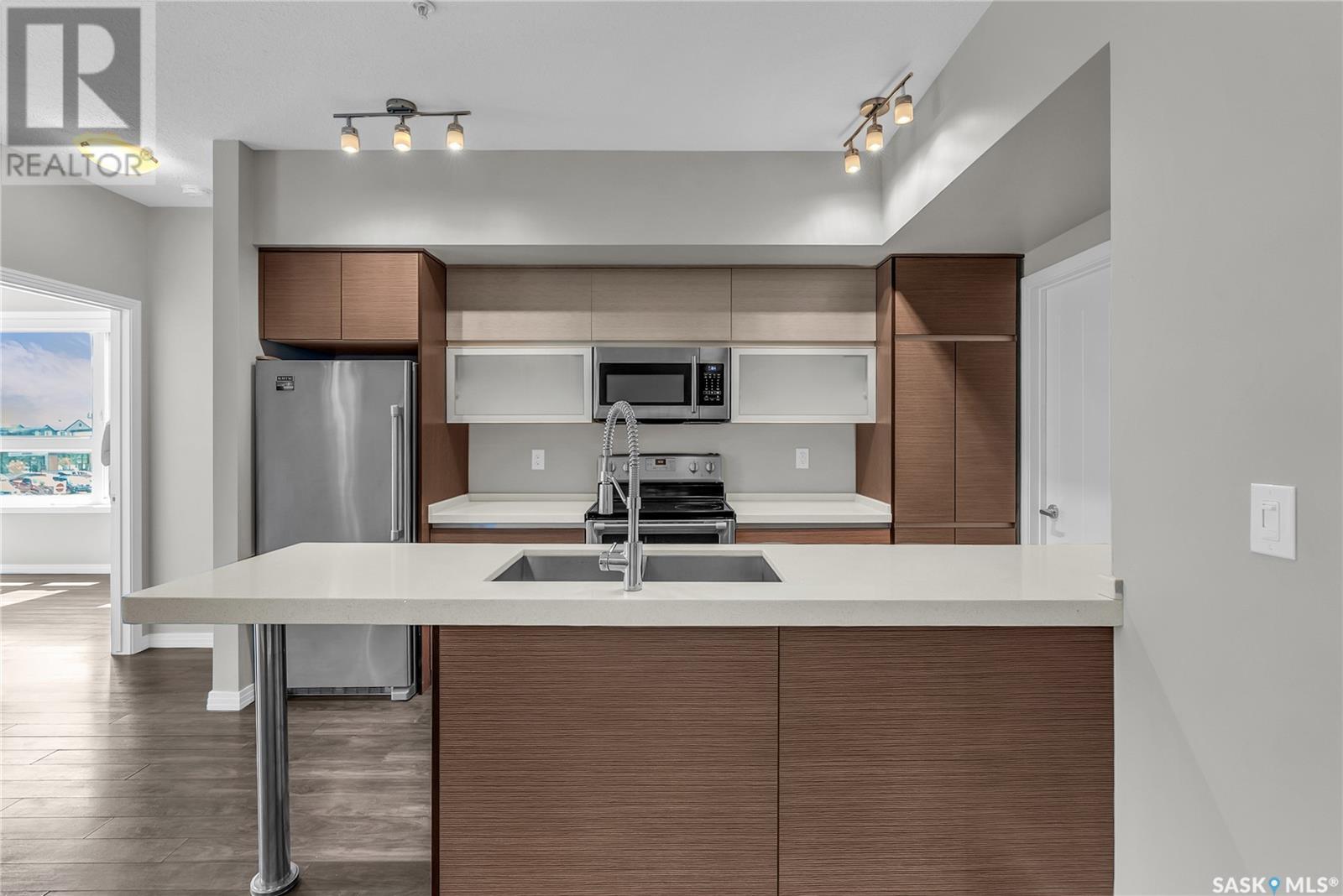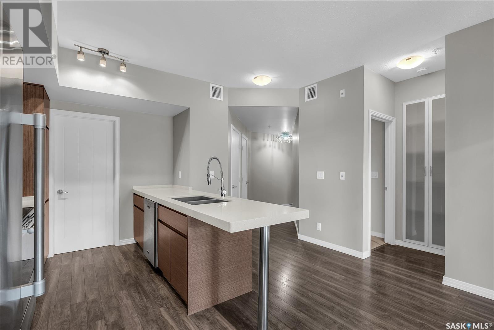 $526 MonthlyWelcome to unit #222 – 235 Evergreen Square, located in the heart of many amenities, clinics, restaurants, and quick access to schools, parks, and Circle Drive! The Sequia Rise complex features stunning curb appeal, yoga/exercise room, board room and elevator access. Stepping into the condo unit, you are met with plenty of natural light flowing throughout, 9ft ceilings, and warm laminate flooring coming into your kitchen. Kitchen features beautiful quartz countertops, tile backsplash, pantry, wood cabinets, and stainless-steel appliances. Coming to your living room, with blinds package and access to your balcony! Your luxurious primary bedroom is king accommodating, with plenty of closet space with custom organizers and shelving, as well as a 3-pc ensuite featuring glass shower, dual vanity with quartz counter, and tile flooring. An additional good-sized bedroom, 4-pc bath with matching tile floors and quartz countertops, and in-suite laundry complete this unit. Additionally, two parking stalls are included, visitor parking, and central air. Must see, beautiful condo in the desirable neighborhood of Evergreen! (id:43042)