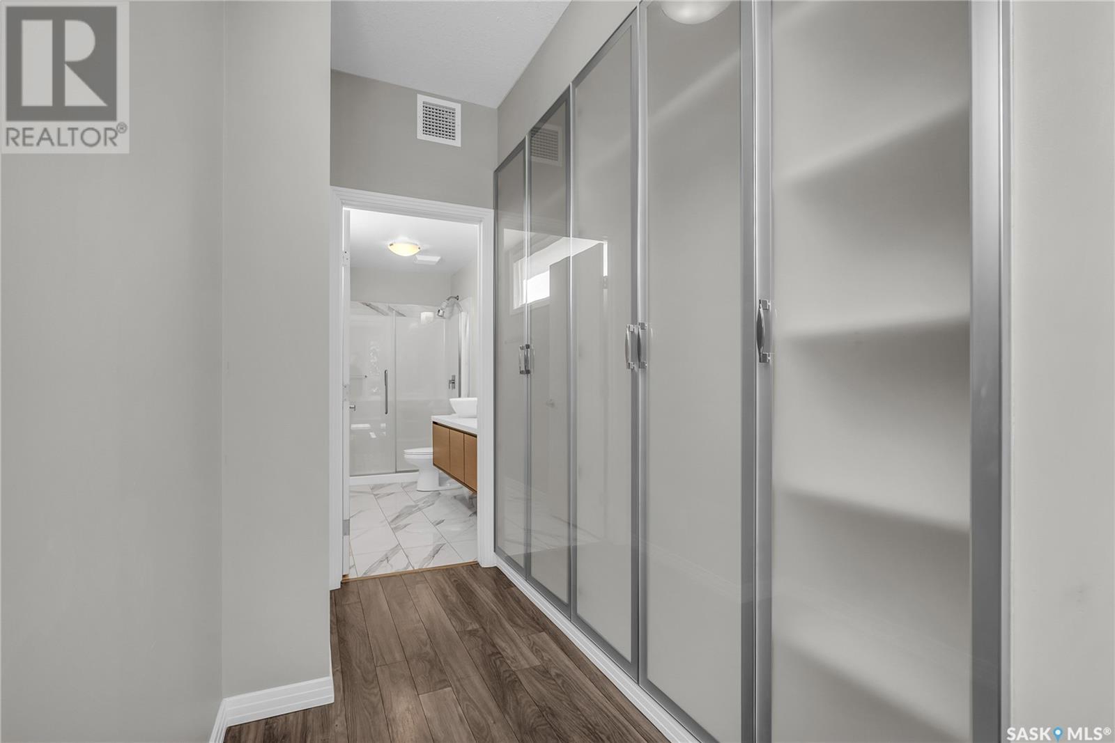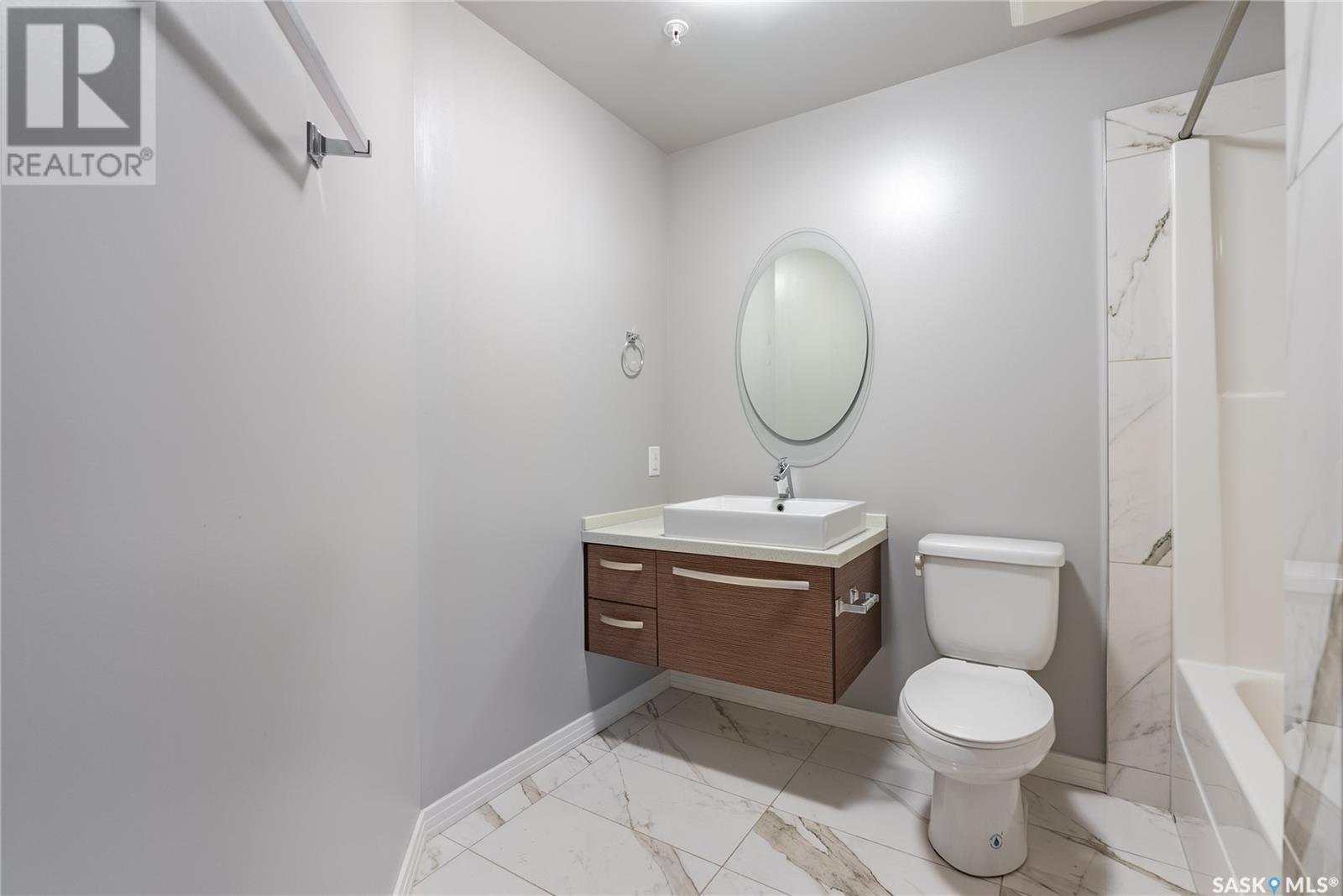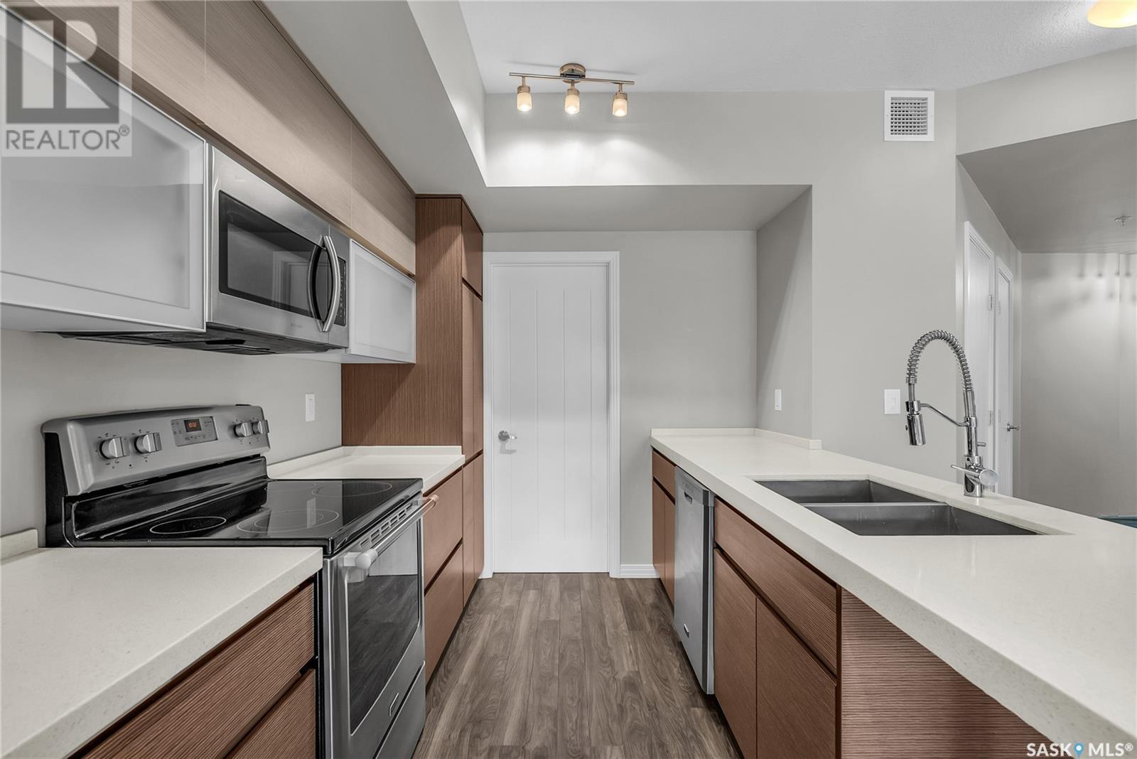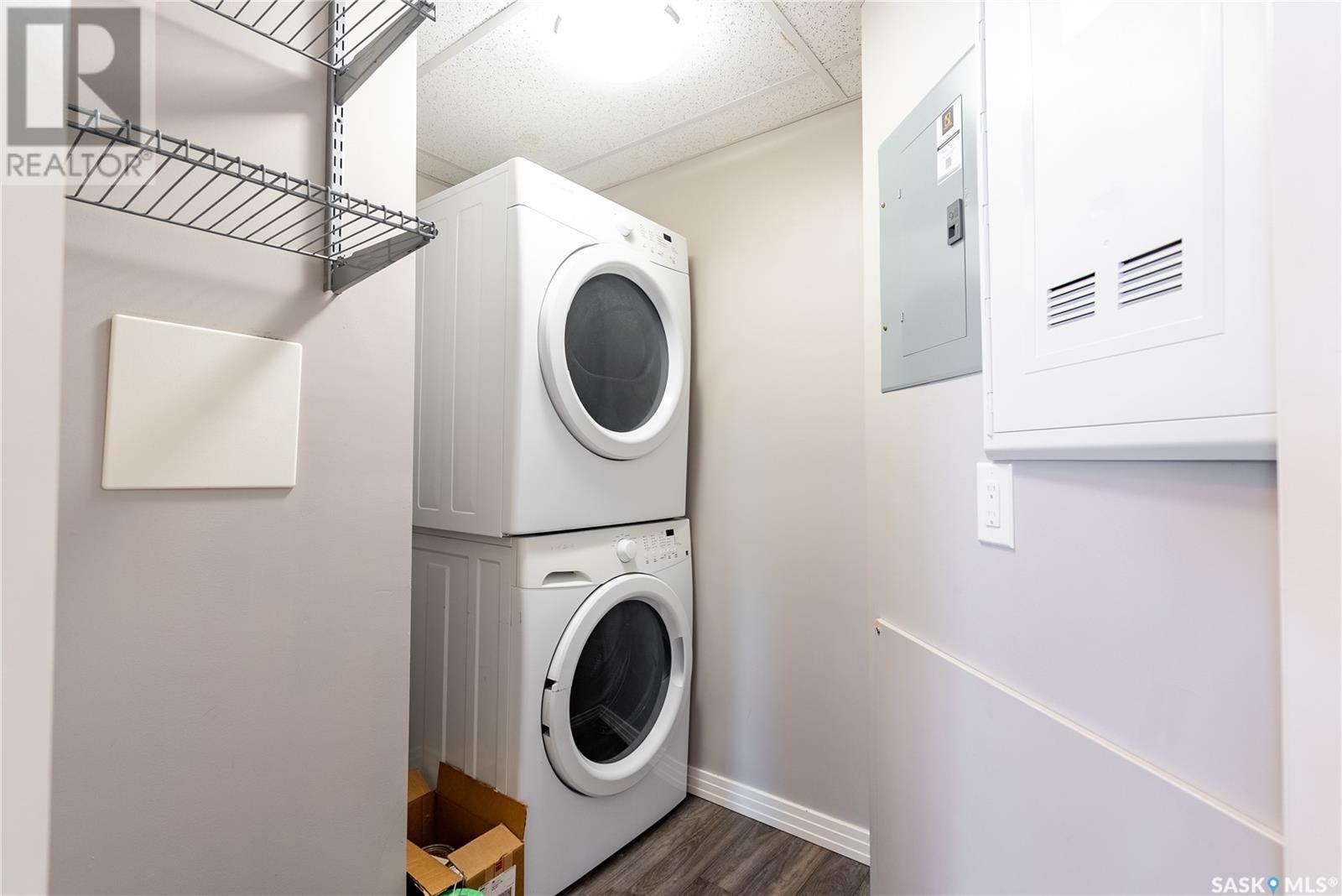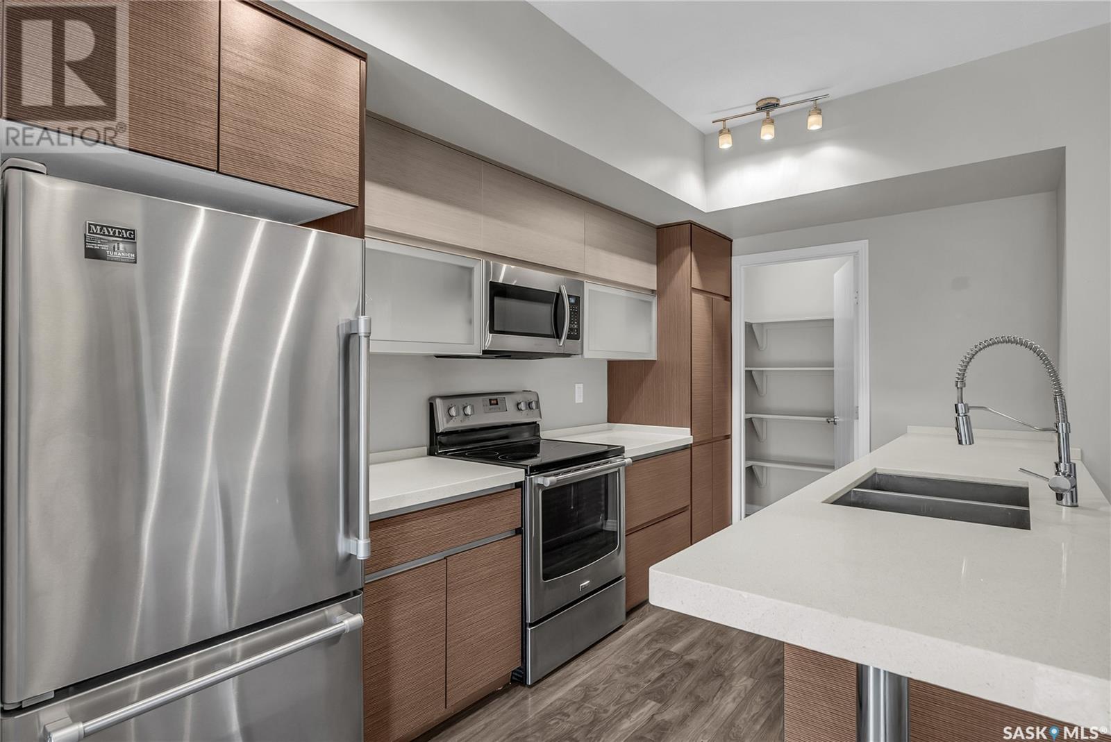 $526 MonthlyWelcome to unit #222 – 235 Evergreen Square, located in the heart of many amenities, clinics, restaurants, and quick access to schools, parks, and Circle Drive! The Sequia Rise complex features stunning curb appeal, yoga/exercise room, board room and elevator access. Stepping into the condo unit, you are met with plenty of natural light flowing throughout, 9ft ceilings, and warm laminate flooring coming into your kitchen. Kitchen features beautiful quartz countertops, tile backsplash, pantry, wood cabinets, and stainless-steel appliances. Coming to your living room, with blinds package and access to your balcony! Your luxurious primary bedroom is king accommodating, with plenty of closet space with custom organizers and shelving, as well as a 3-pc ensuite featuring glass shower, dual vanity with quartz counter, and tile flooring. An additional good-sized bedroom, 4-pc bath with matching tile floors and quartz countertops, and in-suite laundry complete this unit. Additionally, two parking stalls are included, visitor parking, and central air. Must see, beautiful condo in the desirable neighborhood of Evergreen! (id:43042)