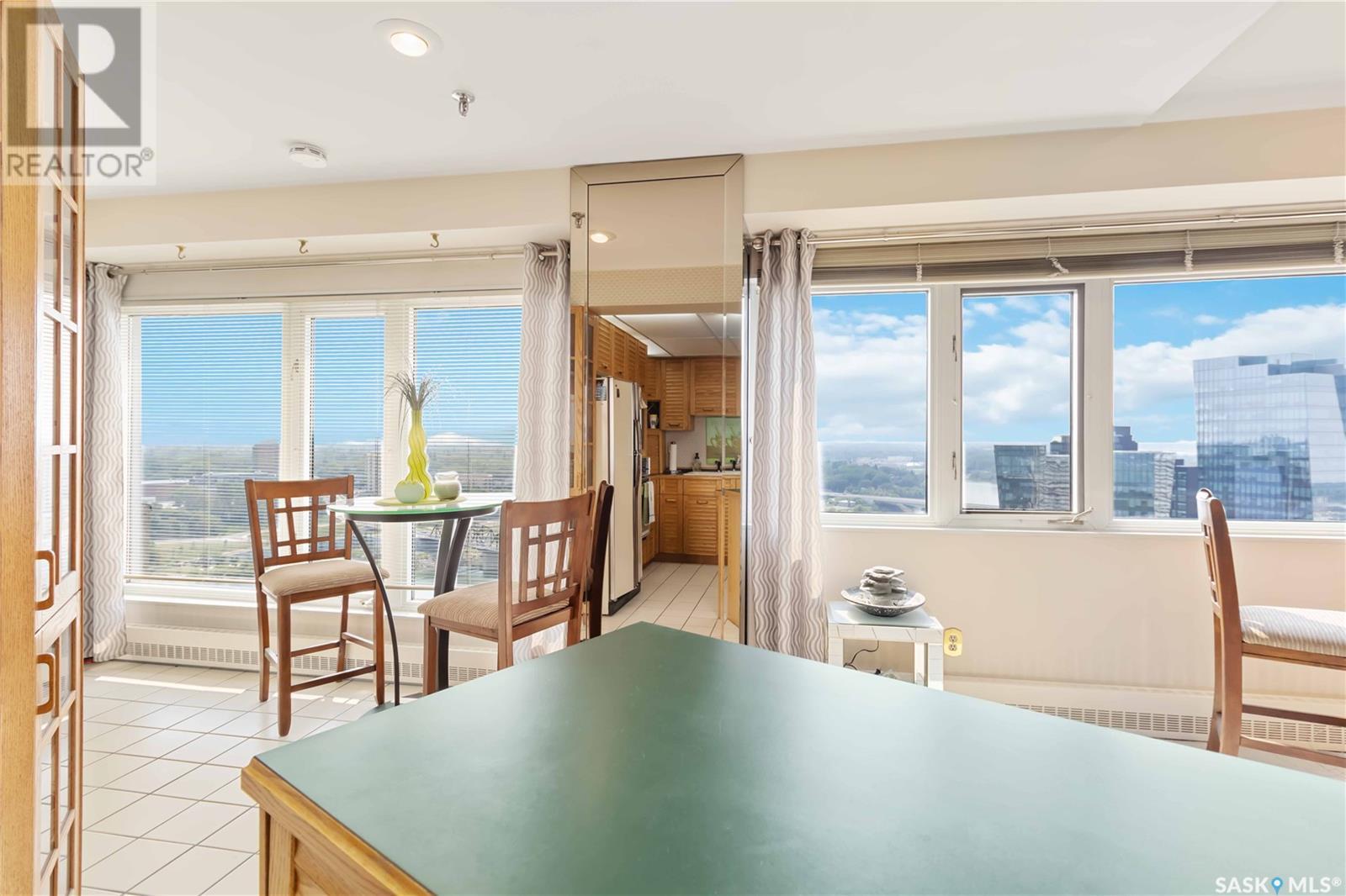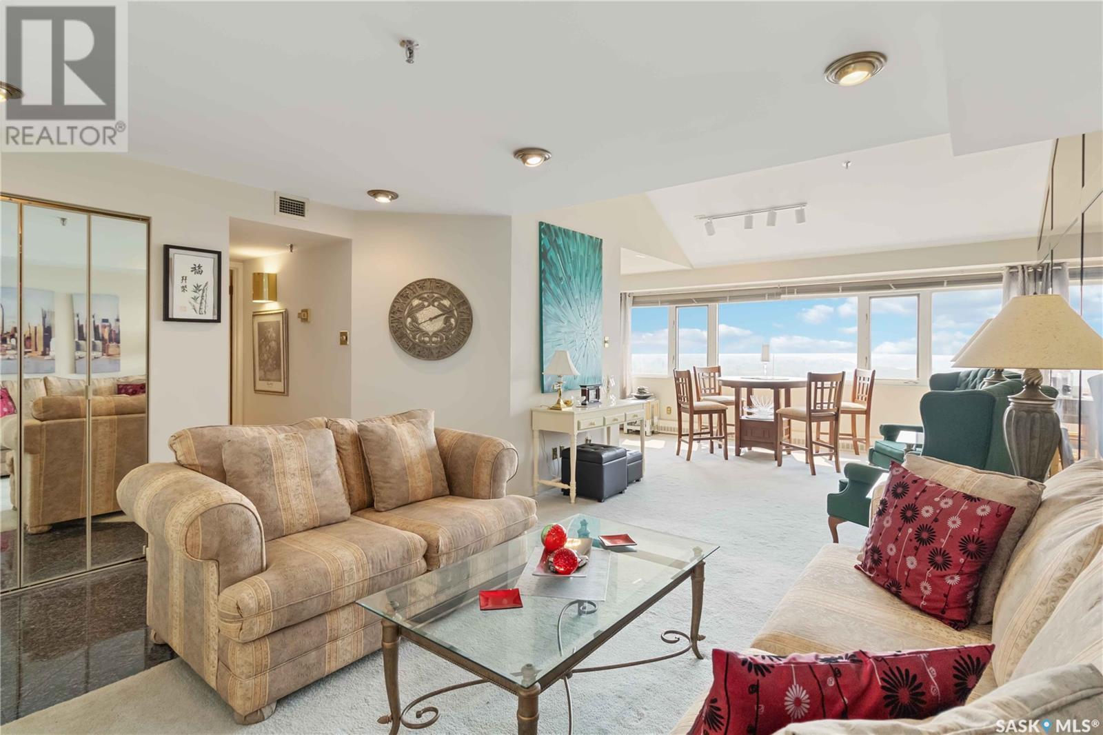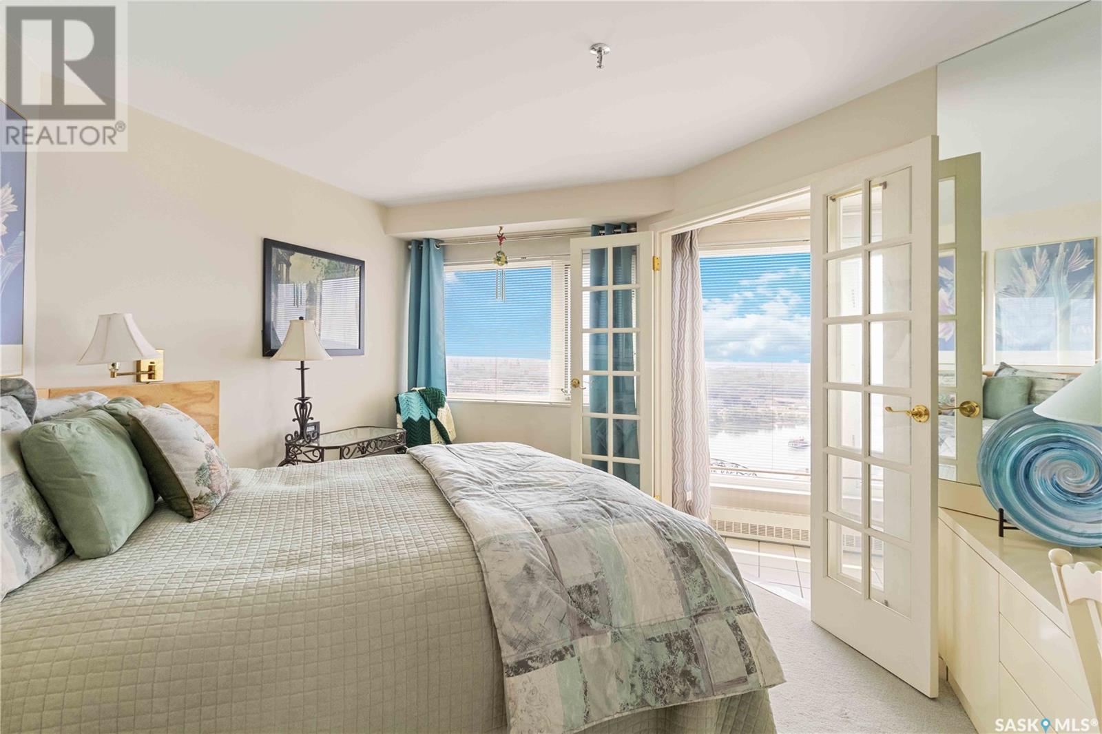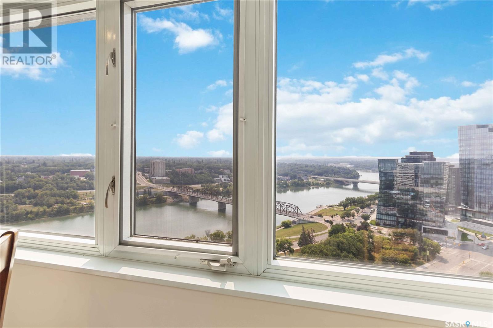 Penthouse suite! Absolutely one of a kind condo with some of the most amazing views in Saskatoon. This luxurious condo has gorgeous vaulted ceilings which offer the most spectacular framing of the incredible view. The master bedroom also has an unparalleled view and offers a large walk through closet and 5 piece bath complete with bidet and cultured marble jetted tub. The kitchen features built-in appliances and oak cabinetry, all of which display pride of ownership at its finest. This condominium provides the owner with access to the amenities at the hotel, including swimming pool, exercise area and discounts for owners in the restaurant. Also included is an underground parking stall and storage unit. Prepare yourself to experience this unique and rare opportunity! (id:43042)