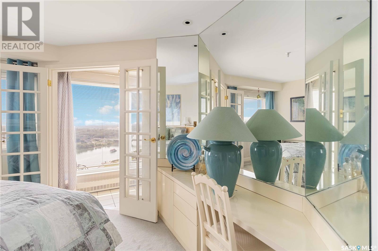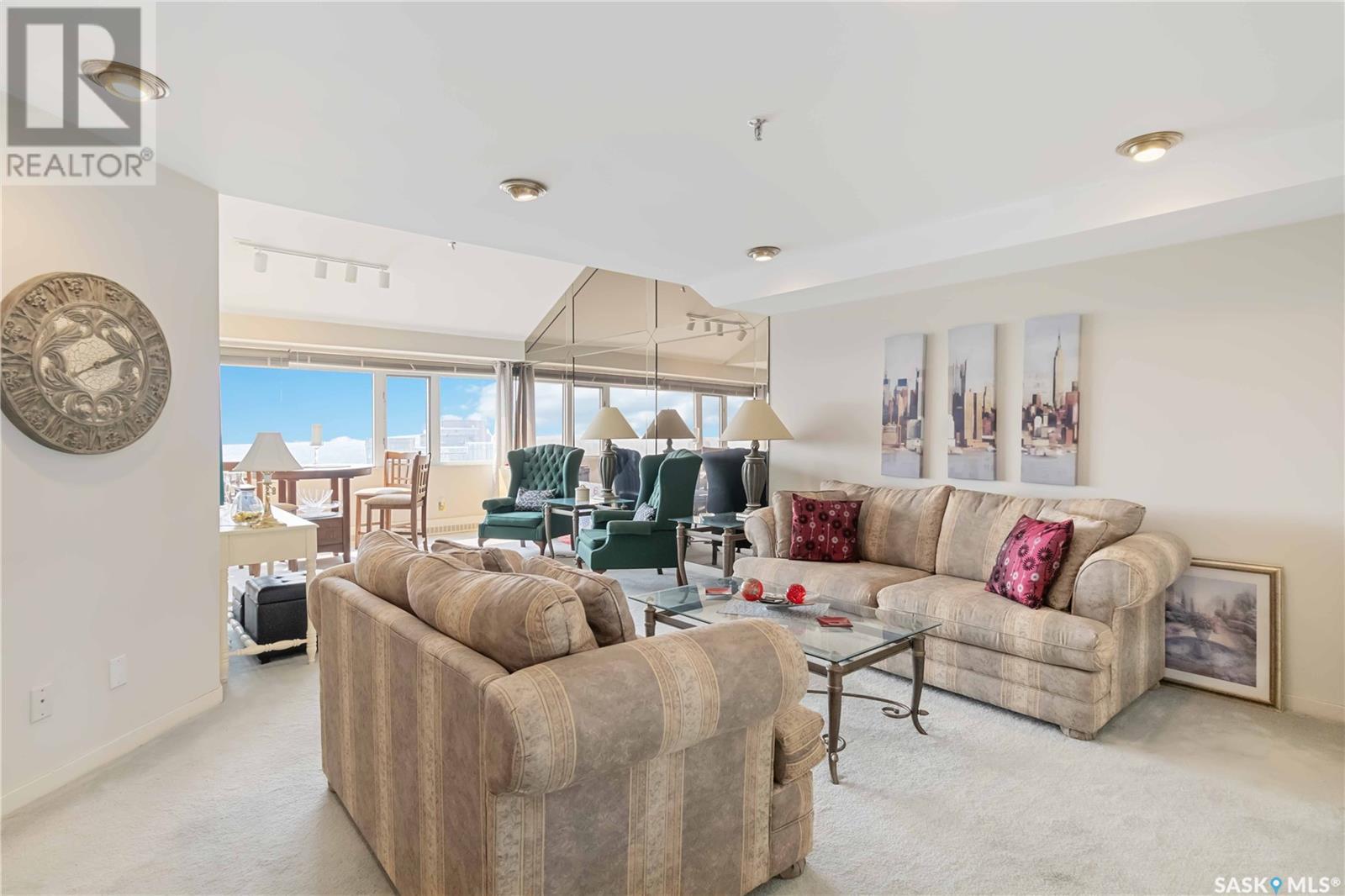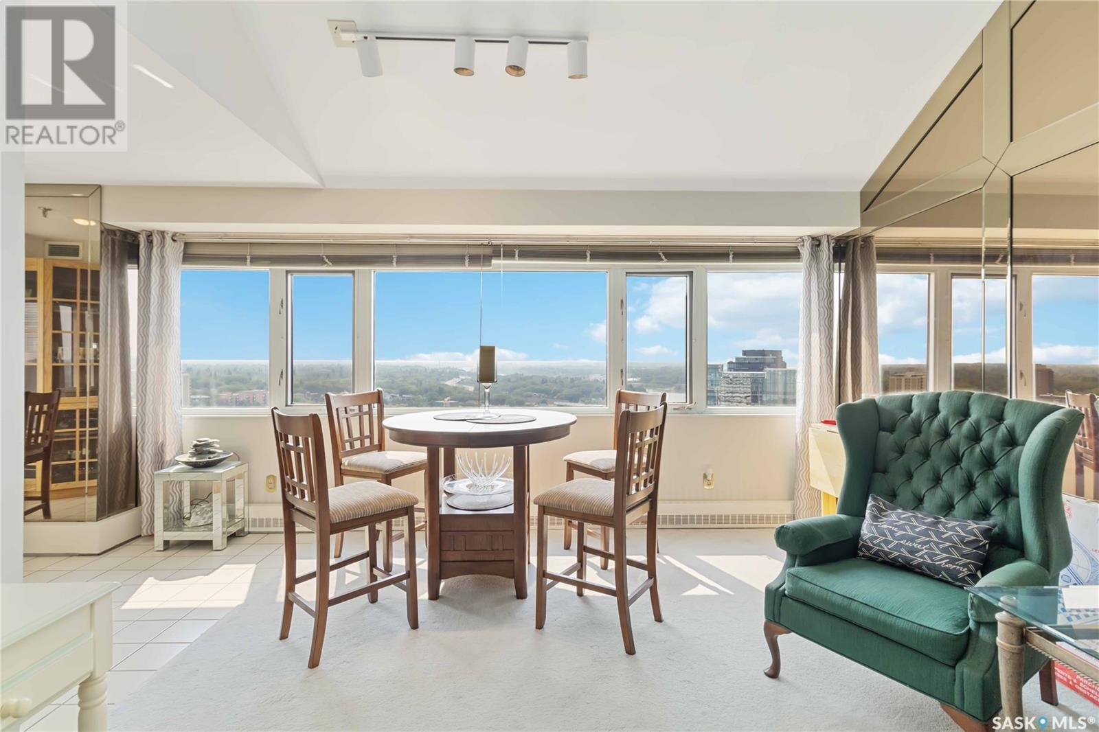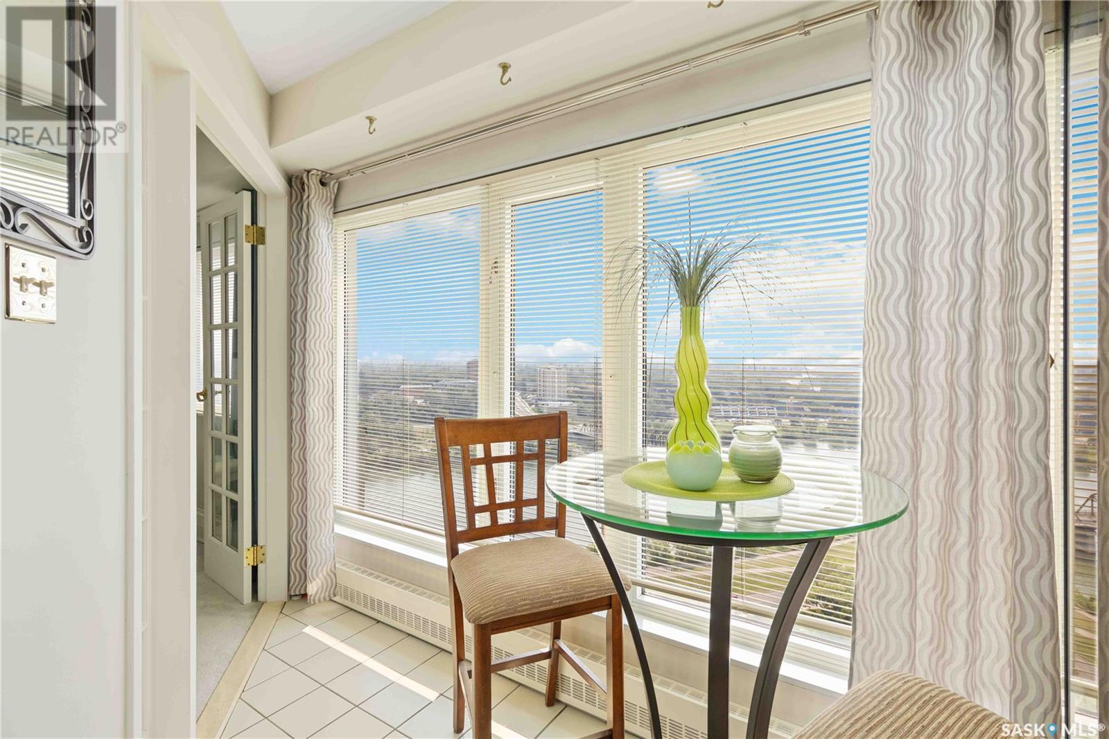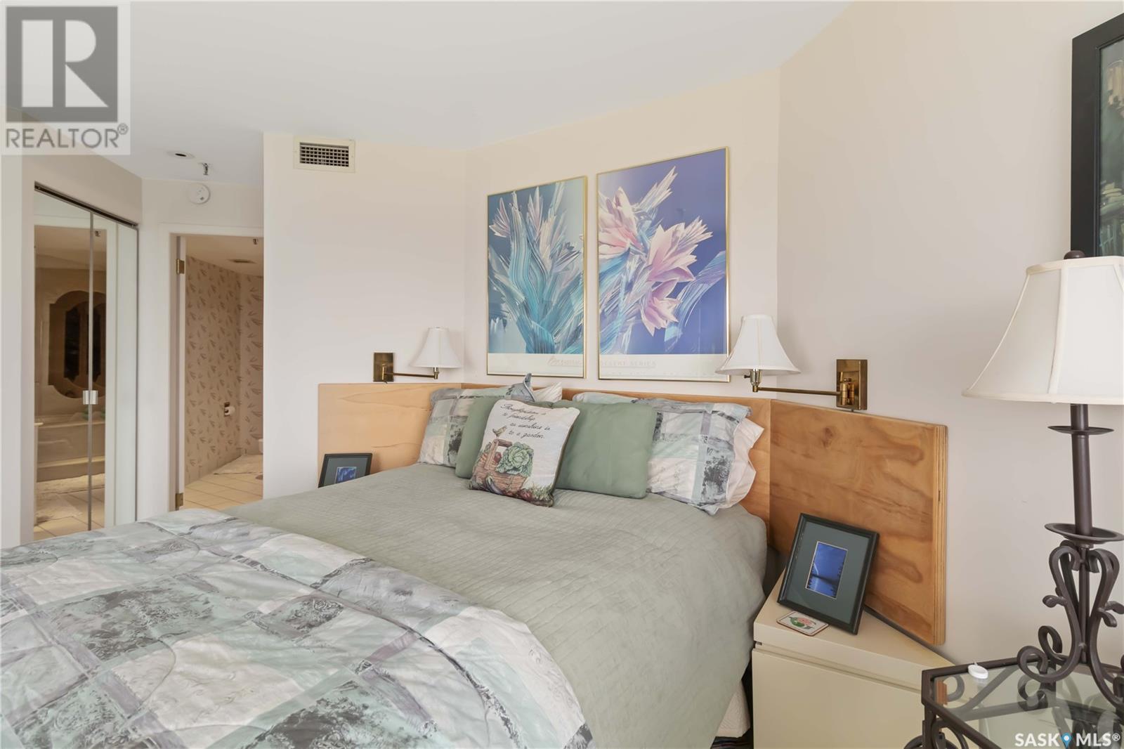 Penthouse suite! Absolutely one of a kind condo with some of the most amazing views in Saskatoon. This luxurious condo has gorgeous vaulted ceilings which offer the most spectacular framing of the incredible view. The master bedroom also has an unparalleled view and offers a large walk through closet and 5 piece bath complete with bidet and cultured marble jetted tub. The kitchen features built-in appliances and oak cabinetry, all of which display pride of ownership at its finest. This condominium provides the owner with access to the amenities at the hotel, including swimming pool, exercise area and discounts for owners in the restaurant. Also included is an underground parking stall and storage unit. Prepare yourself to experience this unique and rare opportunity! (id:43042)