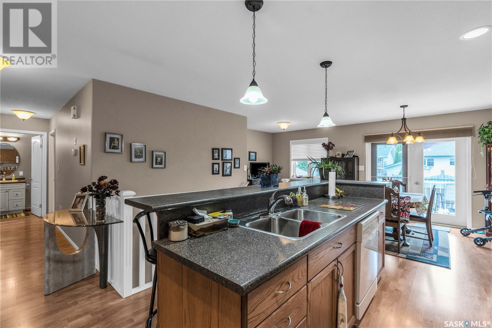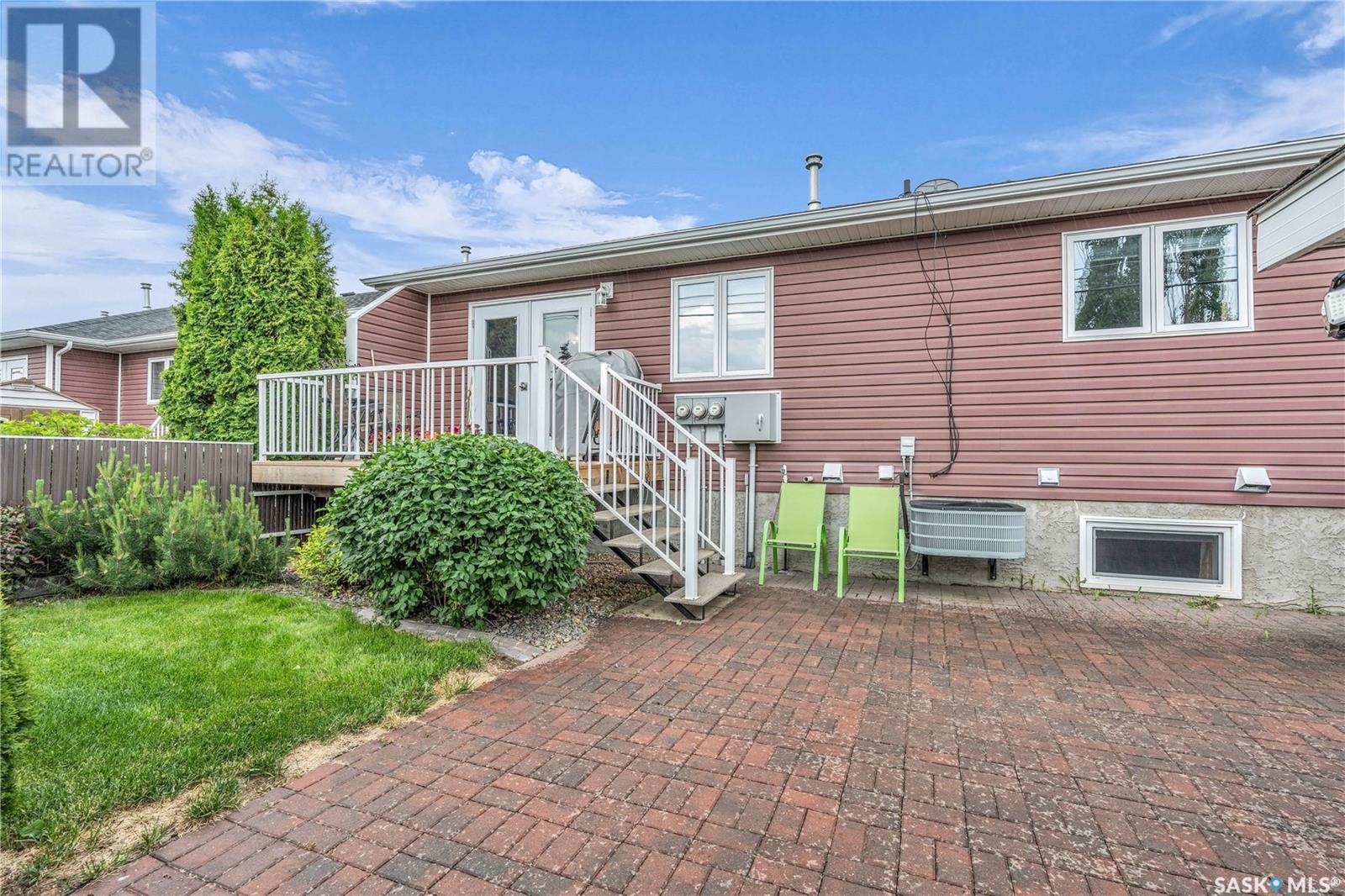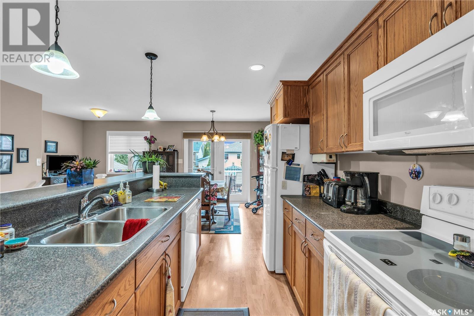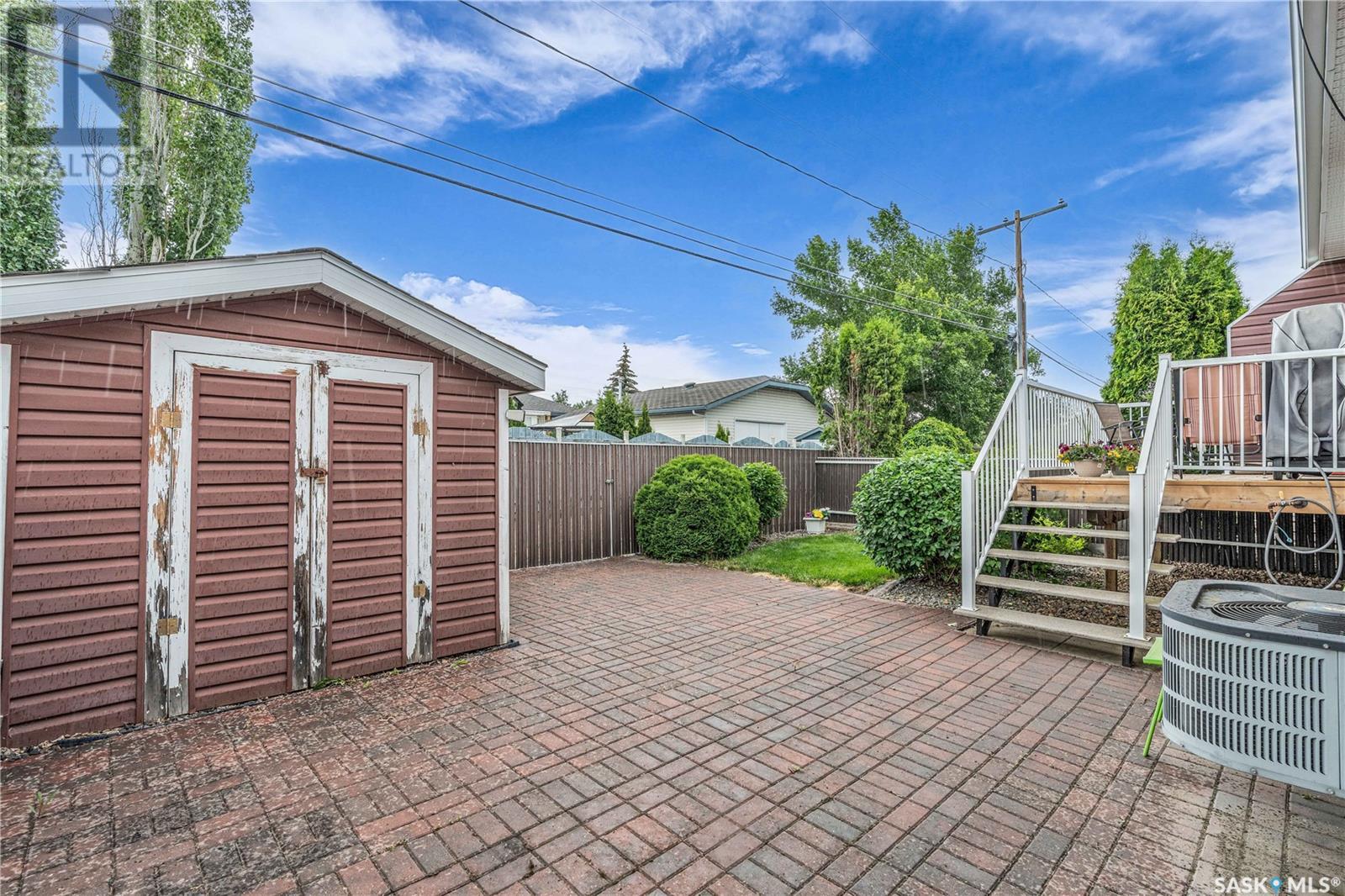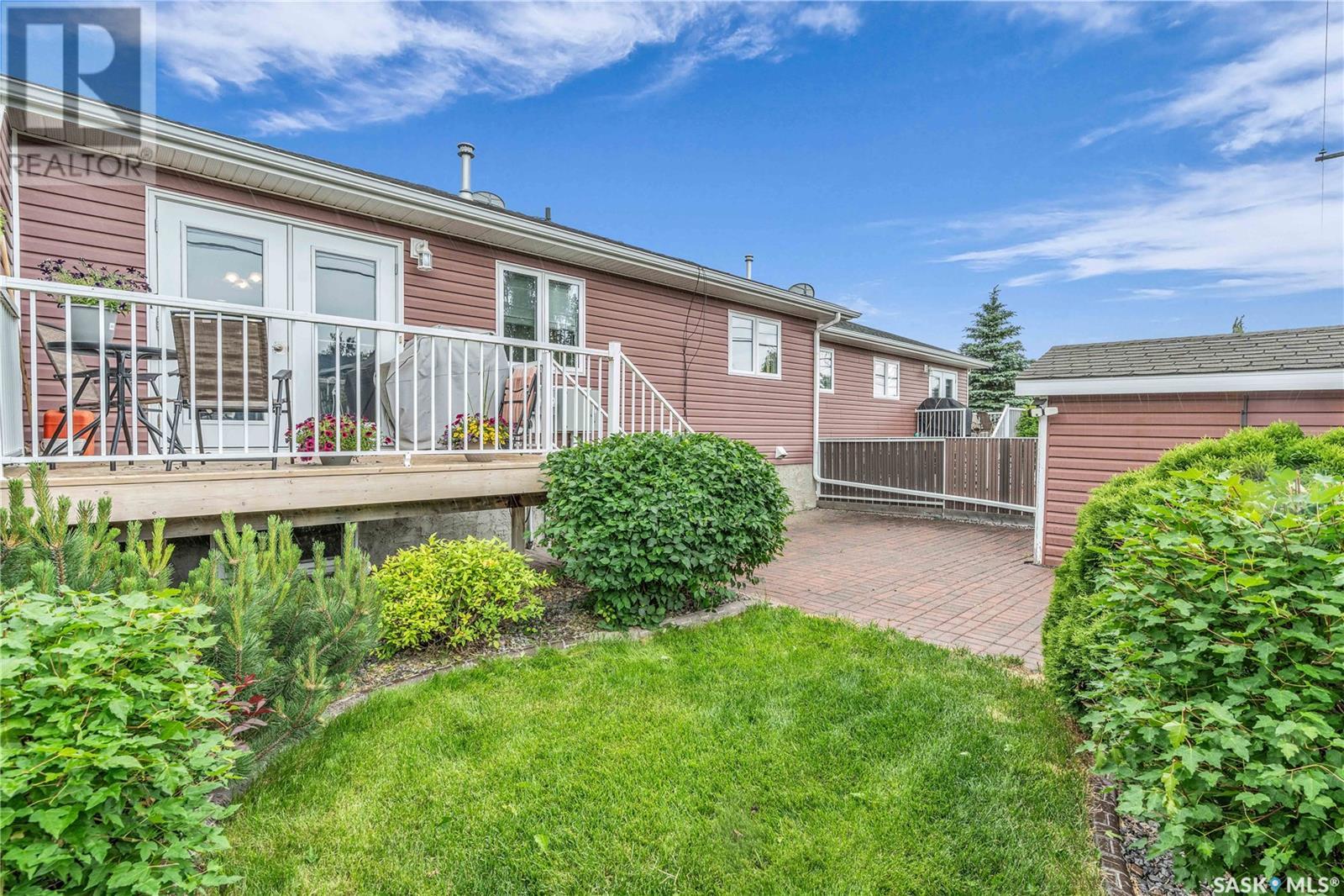 $250 MonthlyThis well-maintained and thoughtfully customized condo is located on a quiet, well-established street in the Town of Battleford. The property offers comfortable and functional living in a prime location, ideal for those looking to downsize without sacrificing space or convenience. The main level features a bright and open layout, with a custom staircase design that sets this unit apart from others in the development. By reversing the stair orientation, the main living area feels more spacious and functional. The large kitchen offers ample cabinetry, updated appliances, and an eat-up island that flows seamlessly into the dining area. From the dining room, step out into a fully landscaped backyard complete with a deck, stone patio, and large storage shed. The home includes main floor laundry, a generous primary suite with a 5-piece ensuite and walk-in closet, and direct entry to an attached garage that’s fully insulated and finished with clean metal walls, great for year-round use, storage, or projects. The fully developed basement offers two additional bedrooms and an abundance of storage space, making this unit an excellent option for those needing extra room for guests, hobbies, or long-term organization. Lovingly cared for and in move-in ready condition, this condo offers low-maintenance living in a quiet, desirable location in Battleford. (id:43042)