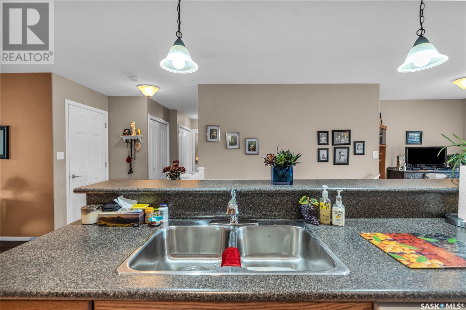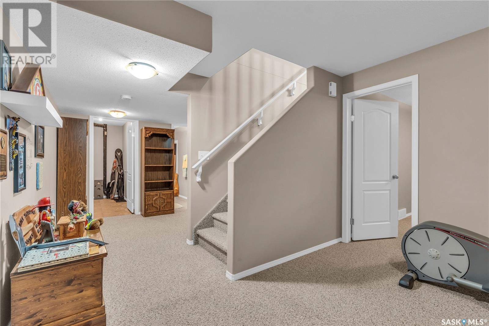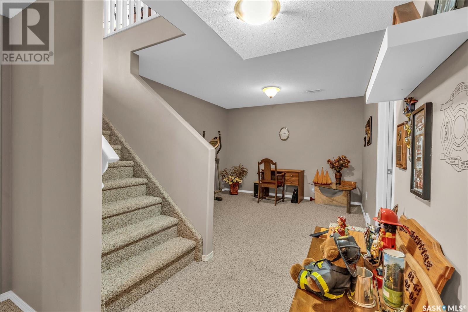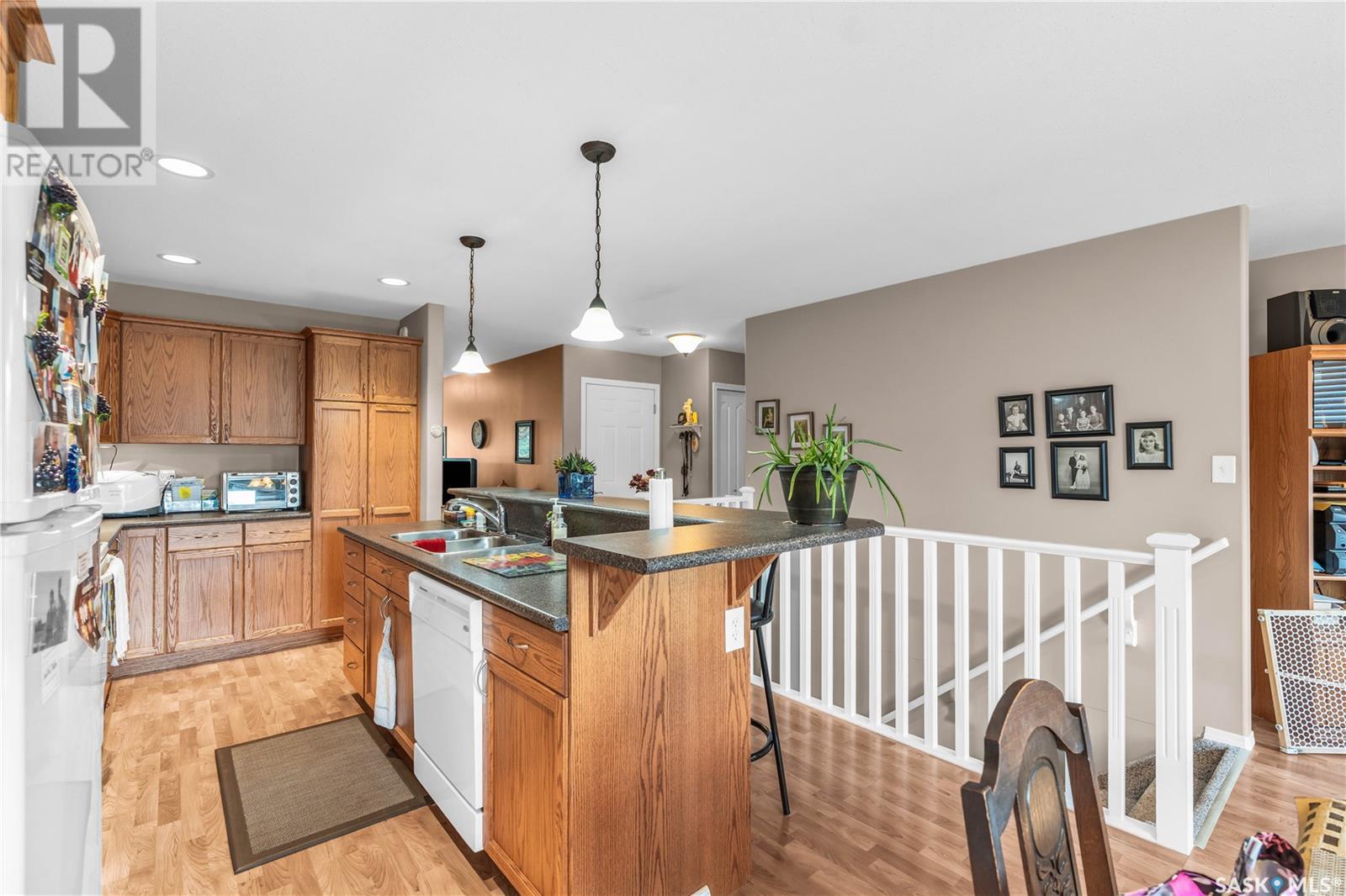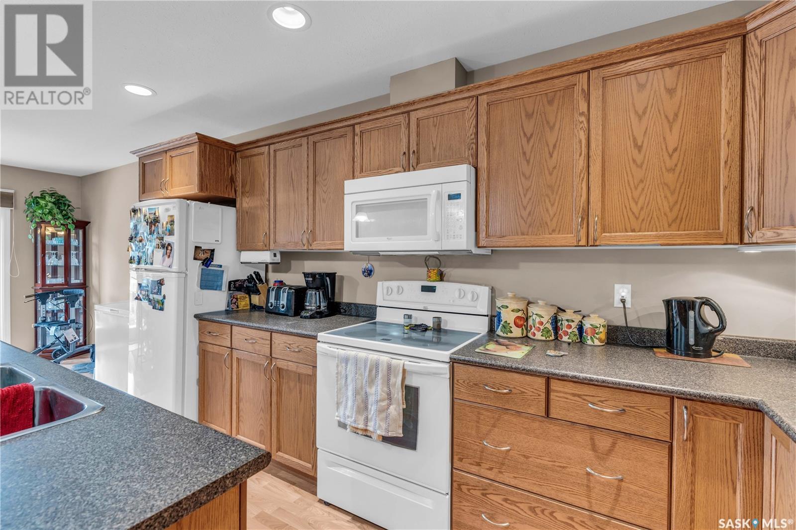 $250 MonthlyThis well-maintained and thoughtfully customized condo is located on a quiet, well-established street in the Town of Battleford. The property offers comfortable and functional living in a prime location, ideal for those looking to downsize without sacrificing space or convenience. The main level features a bright and open layout, with a custom staircase design that sets this unit apart from others in the development. By reversing the stair orientation, the main living area feels more spacious and functional. The large kitchen offers ample cabinetry, updated appliances, and an eat-up island that flows seamlessly into the dining area. From the dining room, step out into a fully landscaped backyard complete with a deck, stone patio, and large storage shed. The home includes main floor laundry, a generous primary suite with a 5-piece ensuite and walk-in closet, and direct entry to an attached garage that’s fully insulated and finished with clean metal walls, great for year-round use, storage, or projects. The fully developed basement offers two additional bedrooms and an abundance of storage space, making this unit an excellent option for those needing extra room for guests, hobbies, or long-term organization. Lovingly cared for and in move-in ready condition, this condo offers low-maintenance living in a quiet, desirable location in Battleford. (id:43042)
