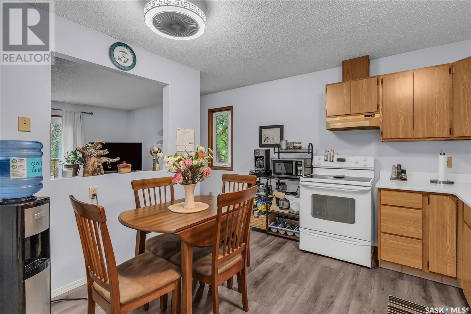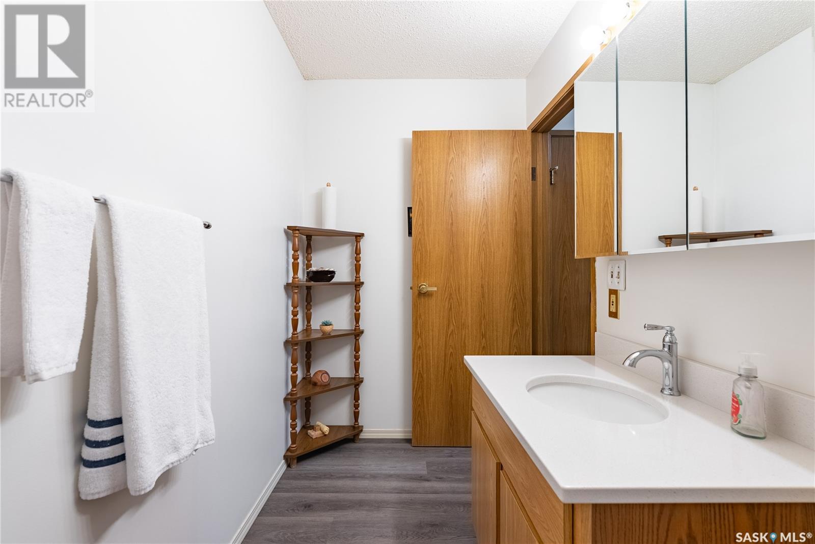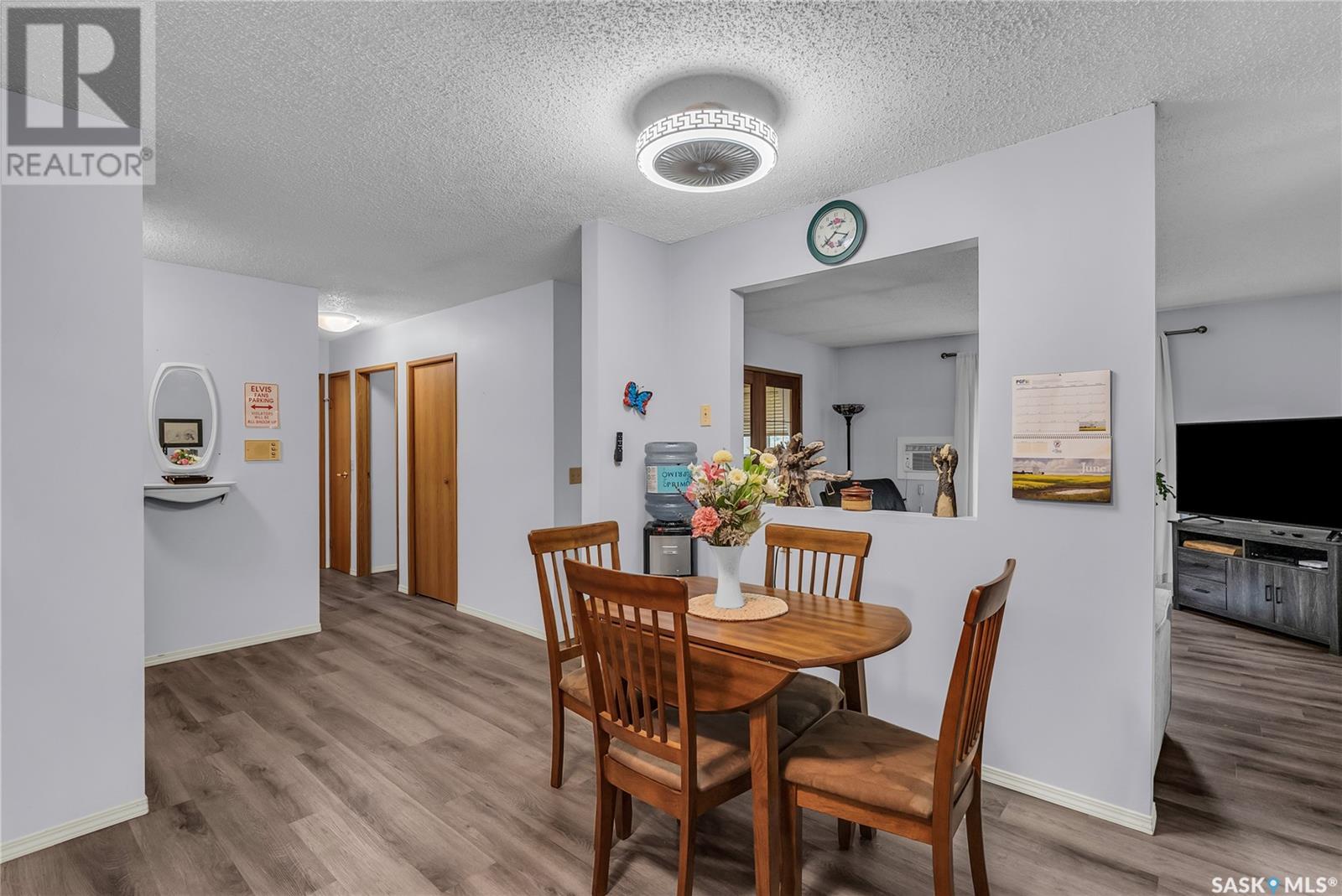 Located in the desirable Varsity View neighborhood, this nicely updated and spotlessly clean top-floor corner condo at 302 – 1006 9th Street East offers an inviting and spacious living area just minutes from the University of Saskatchewan. The open concept layout features a large living room with patio door leading to a private balcony, and just off the living room are garden doors to a versatile den, ideal for use as an office or extra bedroom. The bright, modern kitchen boasts newer quartz counter tops, a vented hood fan, appliances, and a generous eating area. The sizable master bedroom sits next to a full bathroom with a recent newer Bath Fitter tub surround and quartz vanity top. Additional highlights include in-suite laundry with plenty of storage, many recent upgrades such as vinyl plank flooring, paint, lighting, plumbing, and an air conditioner. The building offers convenient amenities like underground parking, an elevator, and visitor parking and its prime location provides easy access to the U of S, parks, shopping, the Broadway district, public transit and all conveniences, making it a perfect place to call home. (id:43042)