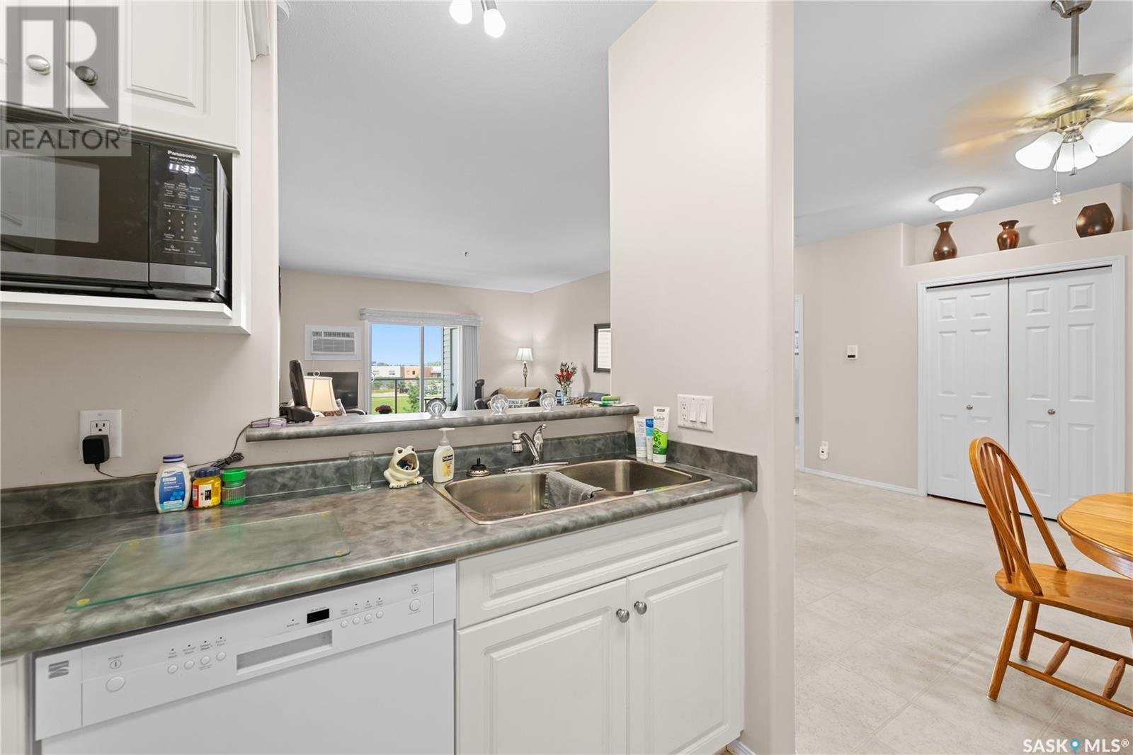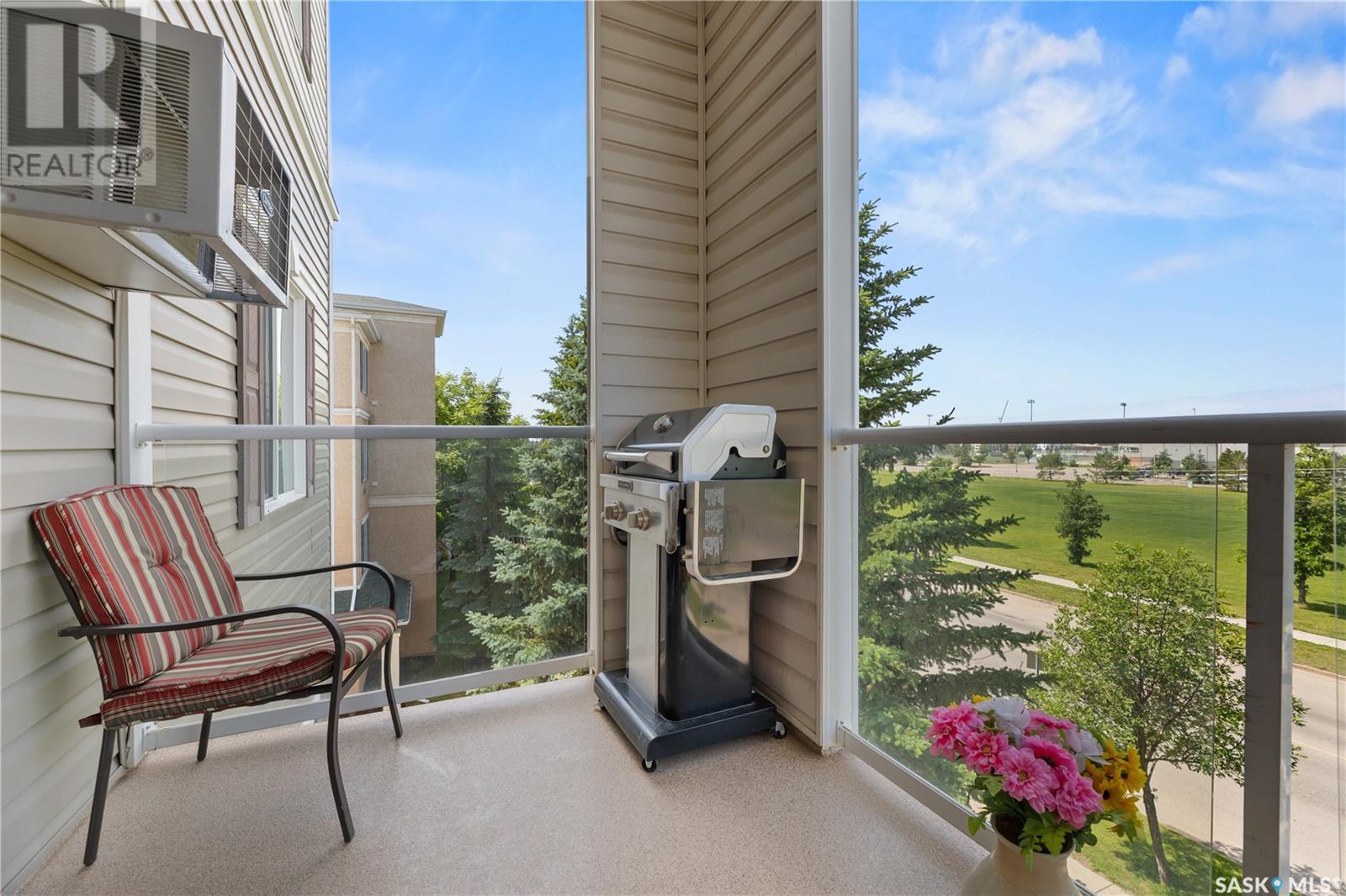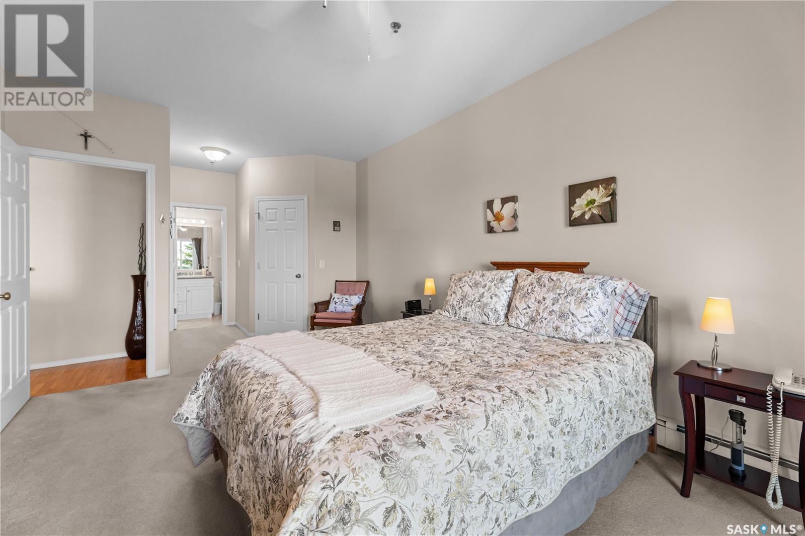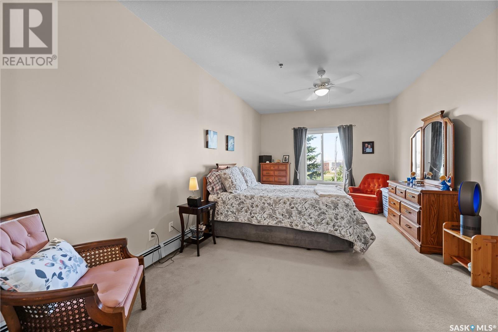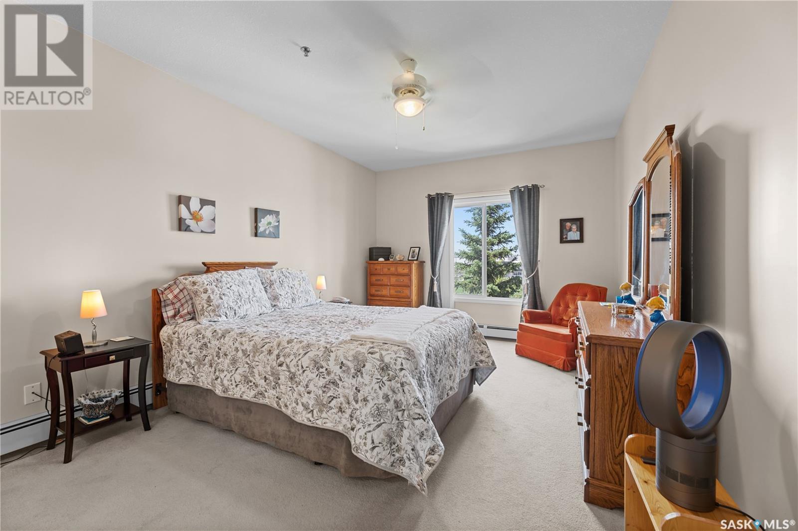 $525 MonthlySuperb 3rd floor sout-west facing corner unit overlooking Saskatoon Soccer centre and Forestry Farm. This bright unit features a white heritage kitchen, dining area, large living room overlooking park, main bathroom, massive primary bedroom with full ensuite bathroom, another bedroom, as well as a laundry/storage room. Other features include a private balcony with storage area, air conditioning, access to amenities room, elevator, and room to to park 2 vehicles in either the included garage stall or the electrified surface parking stall. Don't miss out on this great opportunity. (id:43042)