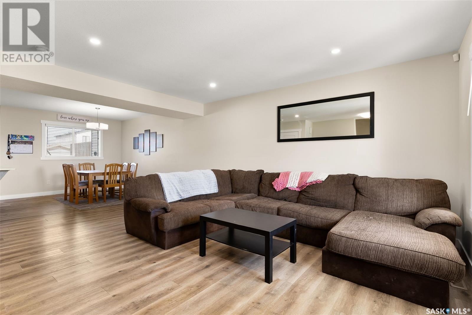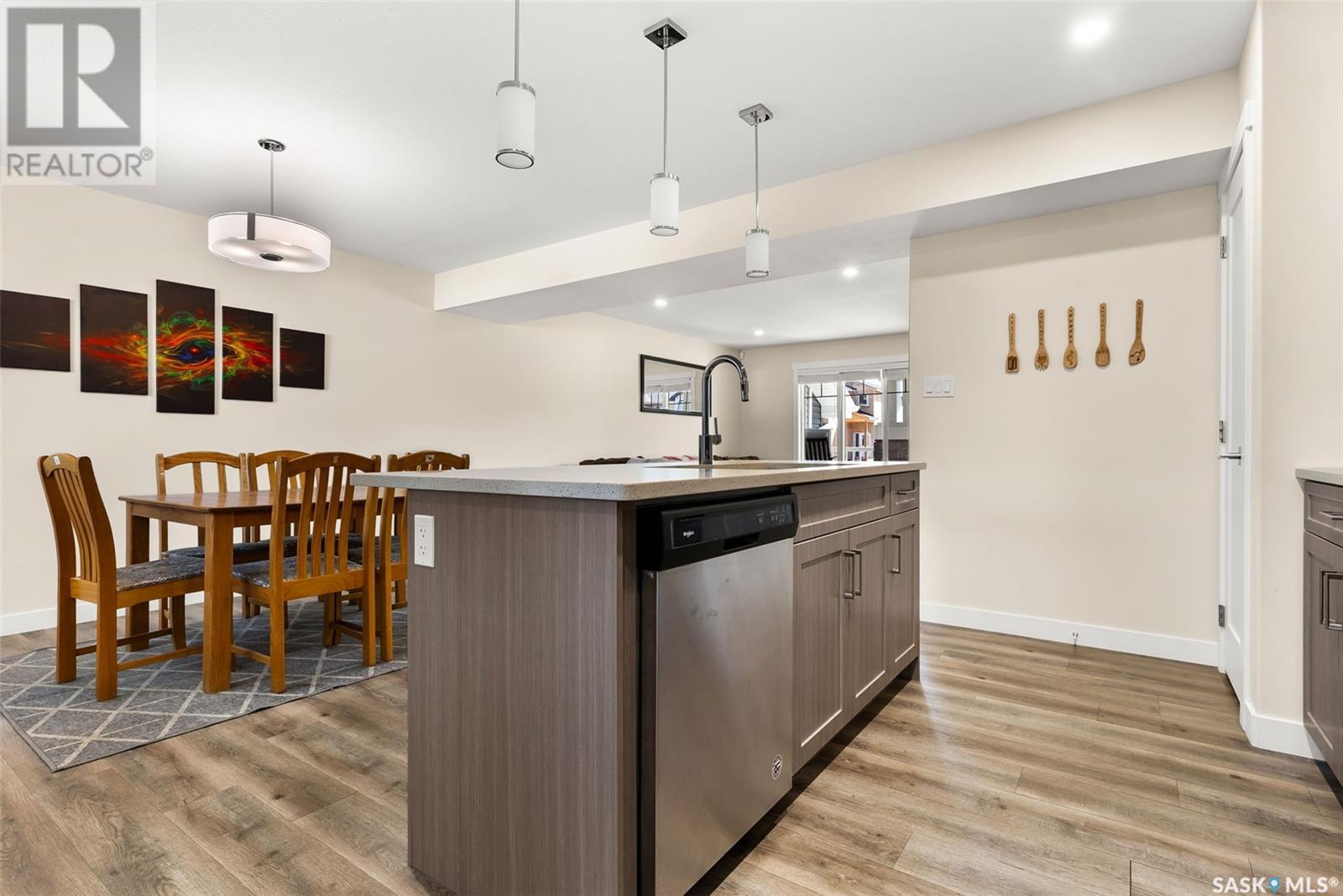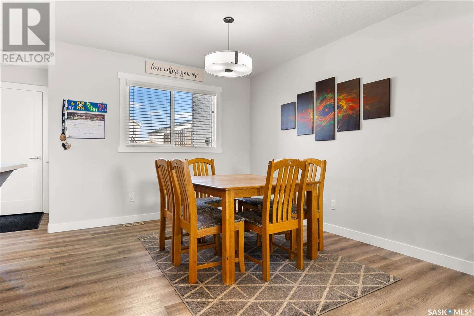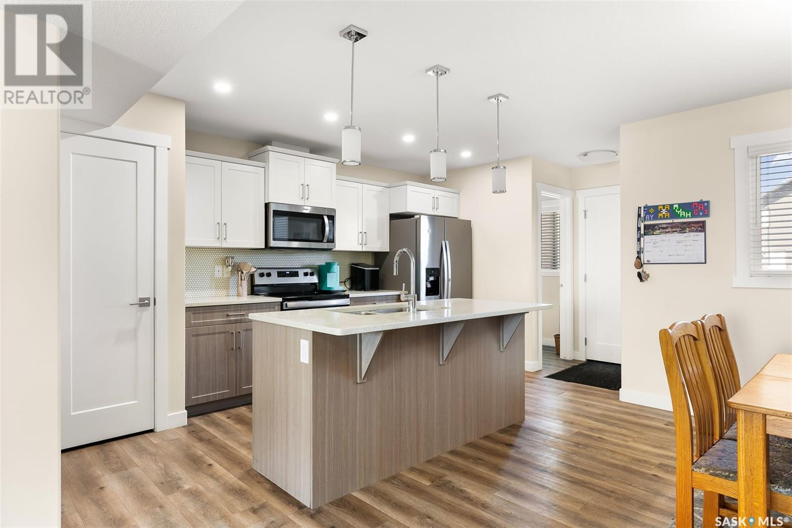 Welcome to 3150 Green Stone Road, a beautifully maintained multi-level townhome located in the vibrant and family-friendly neighbourhood of The Towns in Regina. This stylish 1,386 sq ft home features a modern and functional layout, ideal for growing families, professionals, or first-time buyers. Step inside to an inviting open-concept main floor adorned with durable vinyl plank flooring and large windows that fill the space with natural light. The spacious living room is perfect for relaxing or entertaining guests, while the adjacent dining area offers room for family dinners and casual gatherings. The kitchen is both stylish and functional, boasting quartz countertops, contemporary cabinetry, tile backsplash, stainless steel appliances, and a centre island with pendant lighting—ideal for meal prep or casual dining. A convenient two-piece bath completes the main floor. Upstairs, you'll find three comfortable bedrooms, including a spacious primary retreat with a walk-in closet and a private 4-piece ensuite. Two additional bedrooms and another full bathroom provide ample space for children, guests, or a home office. A bonus room adds versatility for a play area, study zone, or cozy TV nook. The upstairs laundry with stackable Samsung washer and dryer adds everyday convenience. Enjoy outdoor living on the private back deck—perfect for summer BBQs or morning coffee. Located near parks, schools, walking paths, and all East Regina amenities, this home offers the perfect combination of comfort, style, and location. Don't miss your opportunity to own a move-in-ready home in one of Regina’s most sought-after communities! (id:43042)
