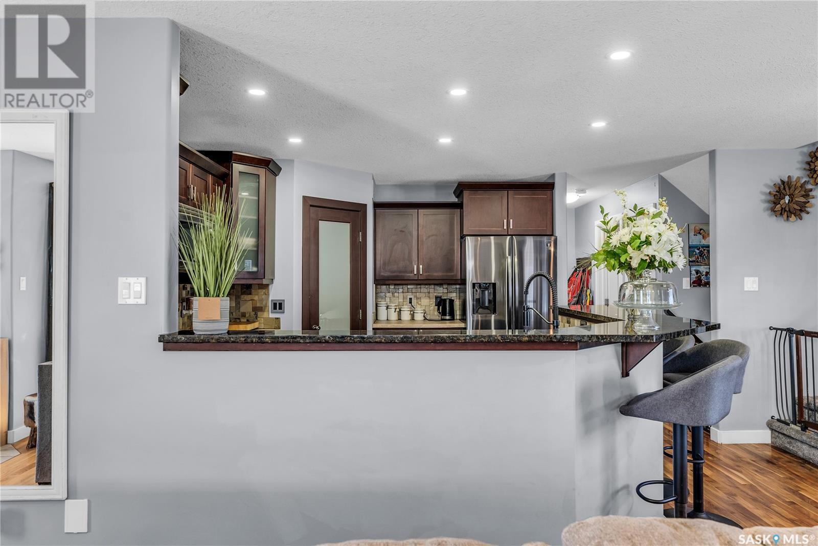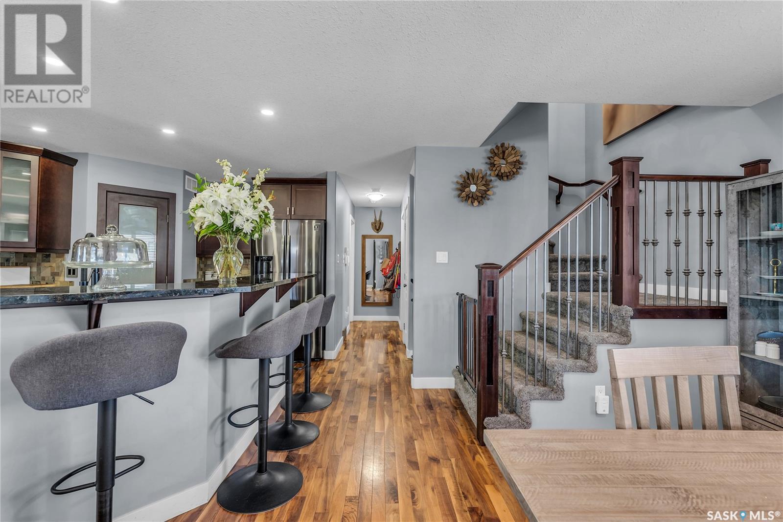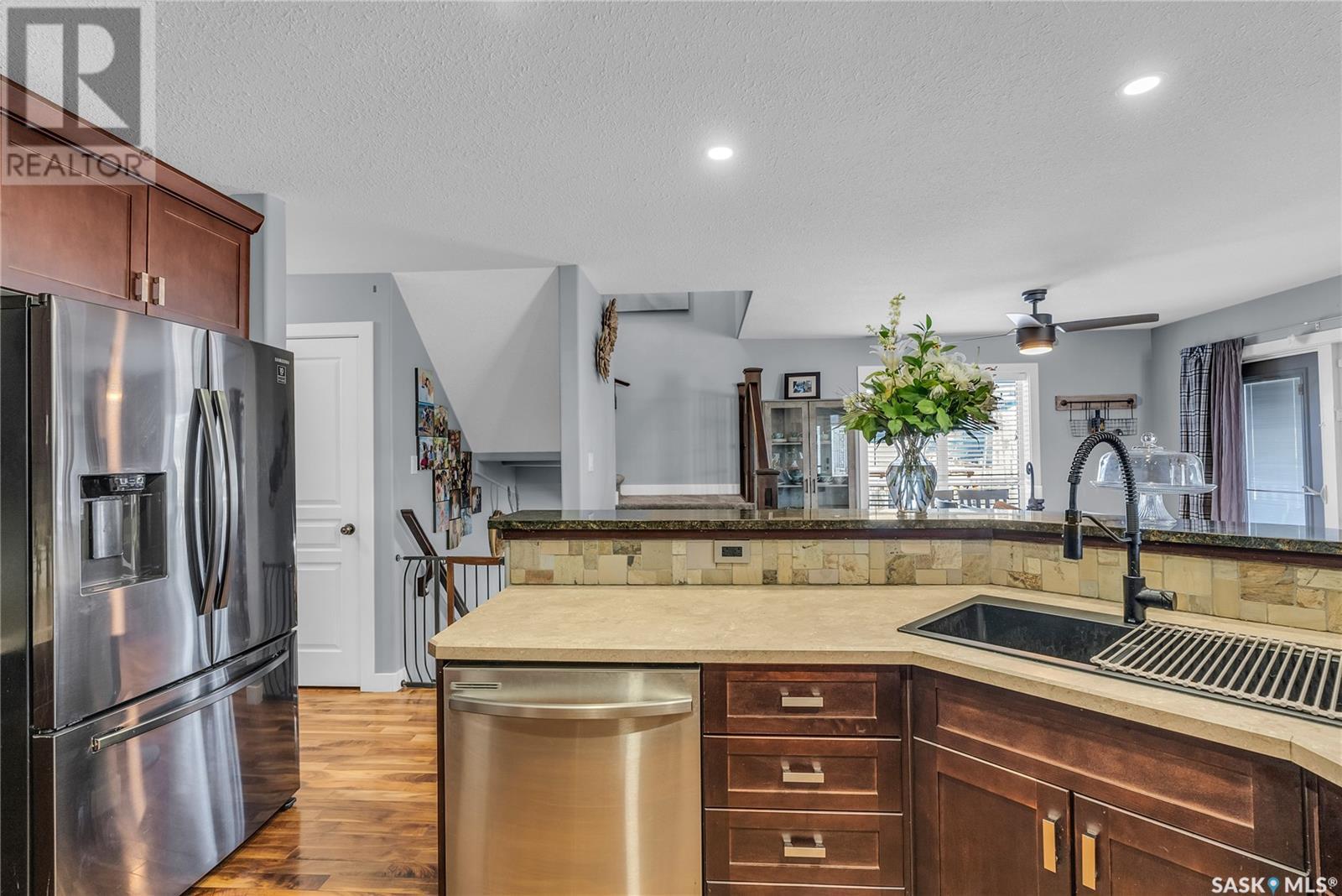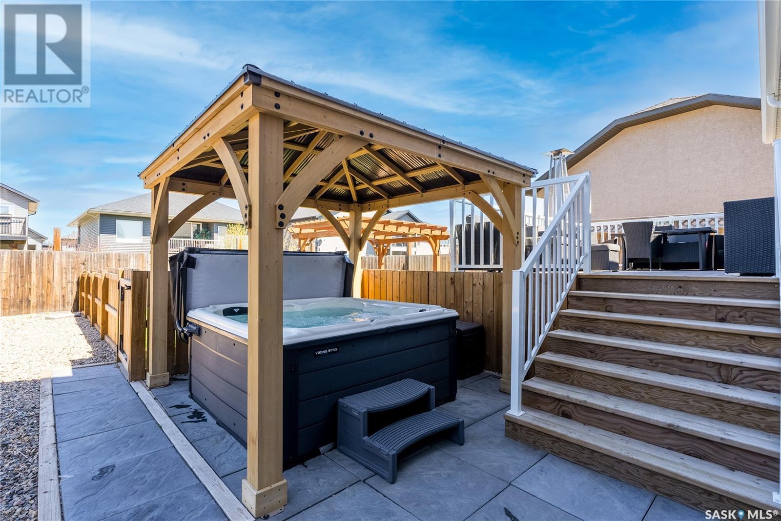 Take a look at this one of a kind fully developed 4-bedroom, 4-bathroom 2 Storey split home with a double attached 26x26 heated garage that has many upgrades located in the prestigious Crystal Springs area of Warman! This location is surrounded by walking paths, man-made lakes, a disc golf course and it is close to school bus routes. It features an exceptional floor plan with an open living room that brings in a lot of natural light, a stunning kitchen perfect for entertaining with a large sit up island/bar that has granite countertops, tile backsplash and a newer Fridge/stove & built in dishwasher. The kitchen has a very thought out walk though pantry to the mudroom that has access from the garage. The main floor also has a 2-piece bathroom and laundry room with a newer washer/dryer. The dining area is spacious and walks out onto a large partially covered deck that overlooks a beautifully landscaped backyard. The backyard is fully fenced and features a dog run, a firepit area, a gazebo, a newer hot tub and shed. The 2nd floor of this home has huge 4-piece bathroom, 3 good sized bedrooms with the primary having a walk-in closet and a gorgeous 3-piece ensuite bathroom with walk-in tiled shower. The basement is fully finished with 9-foot ceilings, newer vinyl plank flooring and it has a family room that features a natural gas fireplace and projector screen perfect for warm movie nights in with the family. The basement also has a 3-piece bathroom, a 4th bedroom and the utility room. The 26x26 double attached heated garage is in pristine condition as it features newer epoxy flooring. This perfect family home that has newly redone shingles and eavestroughs comes complete with all appliances, central air conditioning, an owned alarm system, a hot tub, 1 gazebo, 1 pergola, a pool table, all window coverings and so much more! Don’t wait! Call to view! Bar unit in garage not included - negotiable. (id:43042)