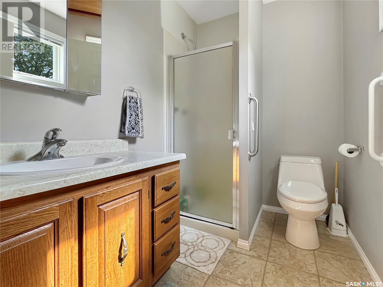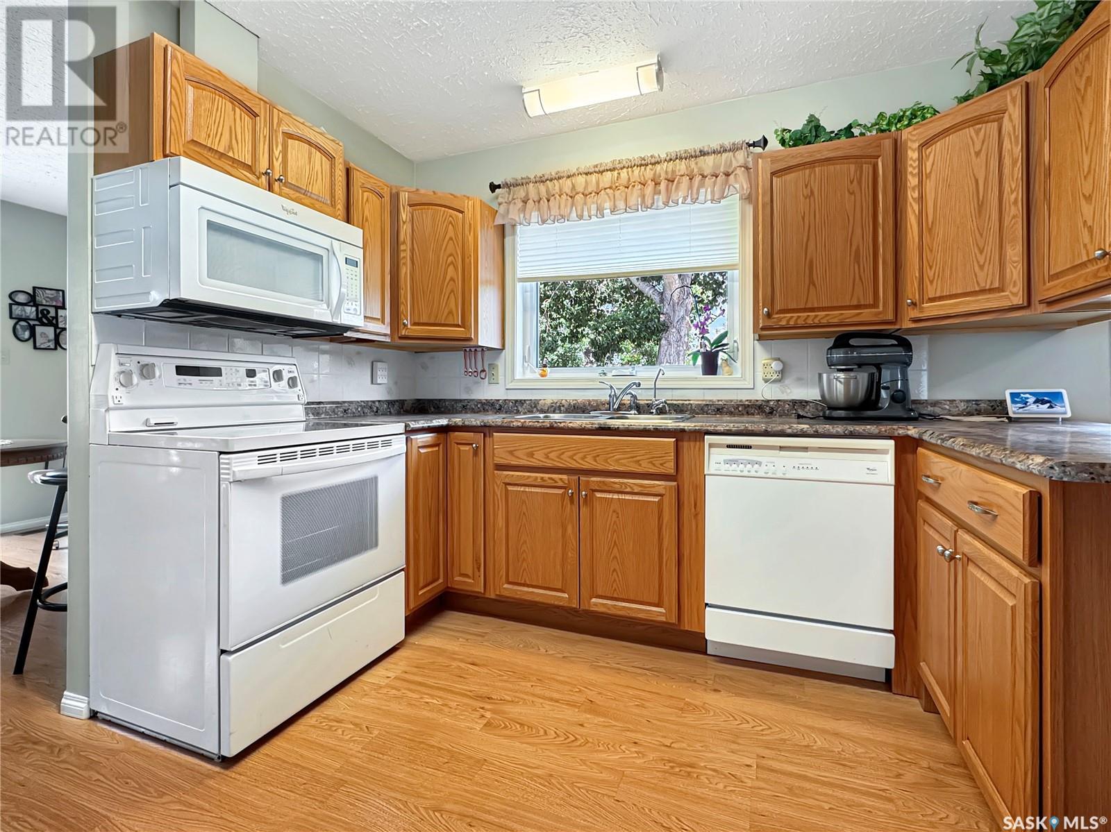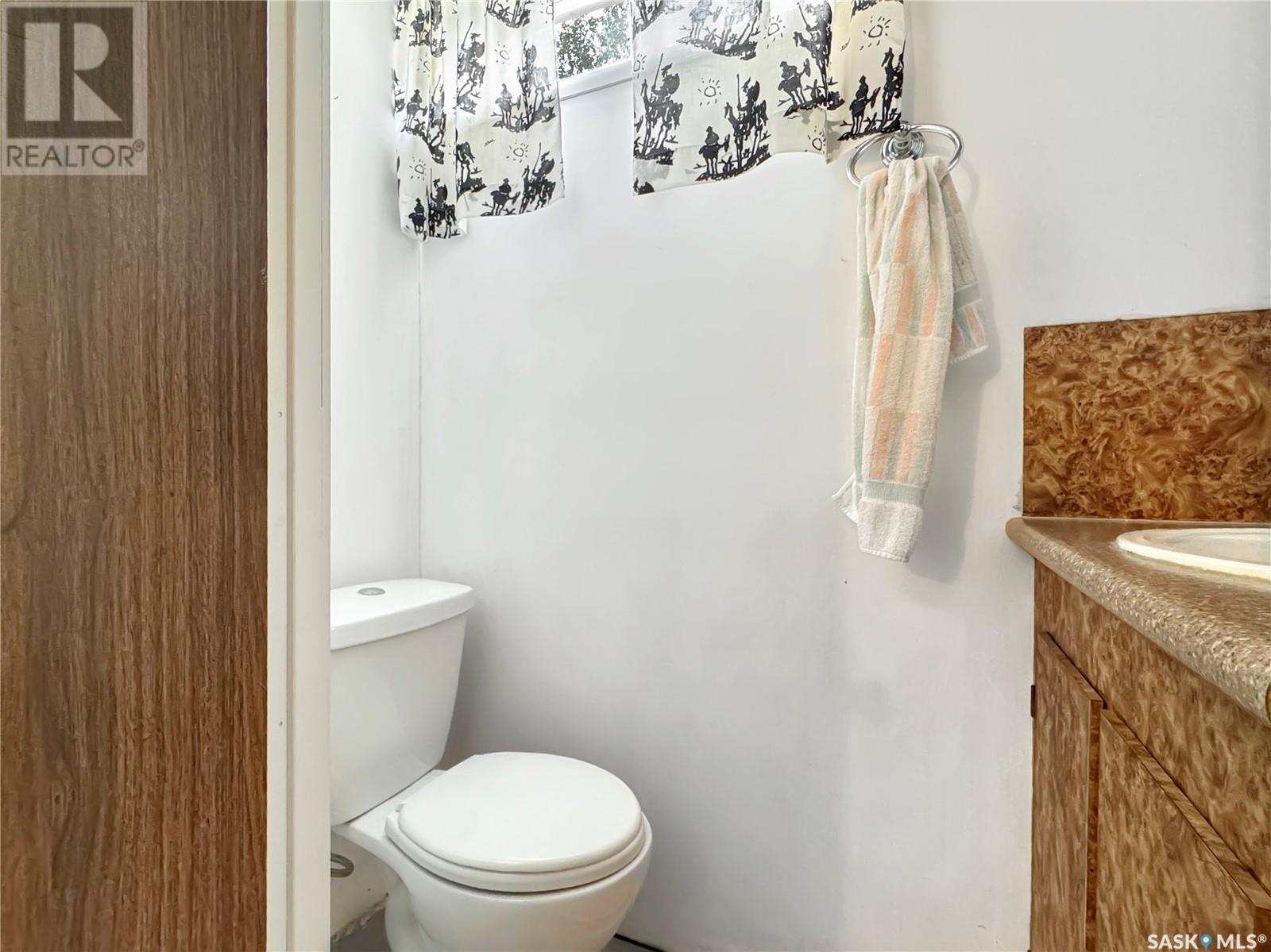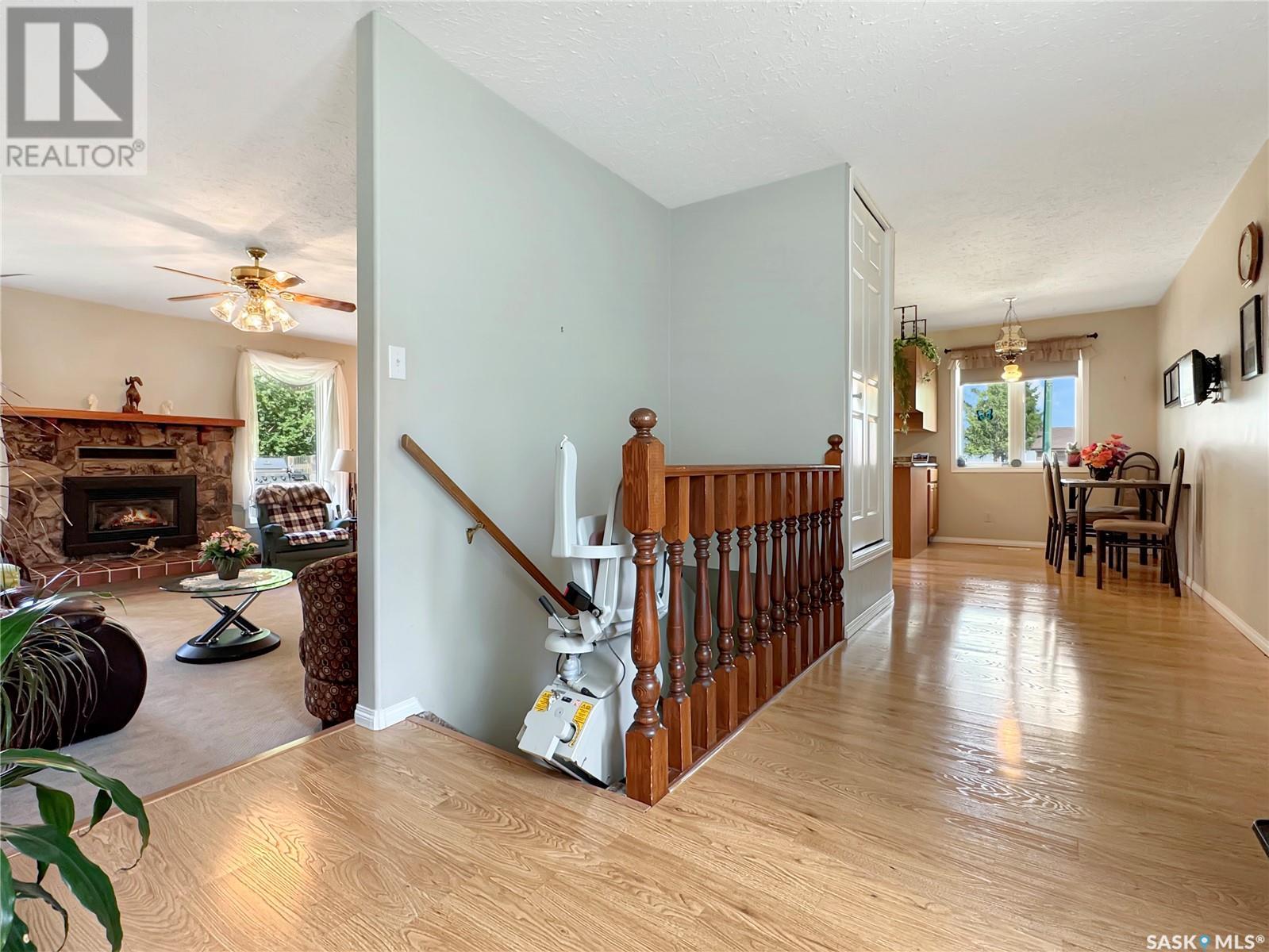 Welcome to this fantastic family home located on a quiet street in the town of Cut Knife. Built in 1981, this 1,393 sq. ft. bungalow offers 3 bedrooms and 2 bathrooms on the main floor. One bedroom is currently used as a main floor laundry, but with laundry also available in the basement, it can easily be converted back to suit your needs and primary bedroom offering a 3 pc ensuite. The spacious kitchen offers plenty of cupboard space, while the dining area leads to a backyard deck—perfect for relaxing or entertaining. A cozy sunken living room with a natural gas fireplace creates a warm and inviting space. The basement features a wood-burning fireplace, a two-piece bathroom, and lots of storage. Updates include replaced windows, a new water heater (2020), front door, deck (2011), and cupboards and countertops. This home is wheelchair accessible and includes a mobility lift to the basement. The low-maintenance yard includes paved front access, and the backyard backs onto open fields for a peaceful, acreage-like feel. A double attached garage completes this well-rounded property. Don’t miss your chance to own this move-in-ready gem—book your showing today! (id:43042)
