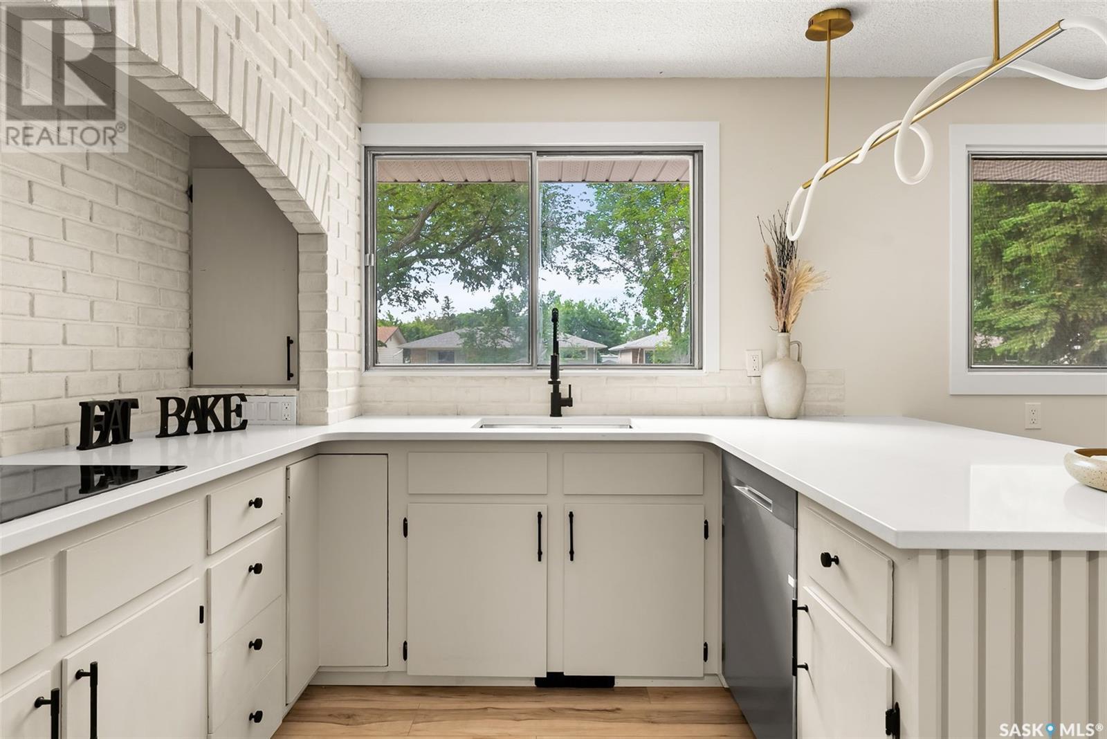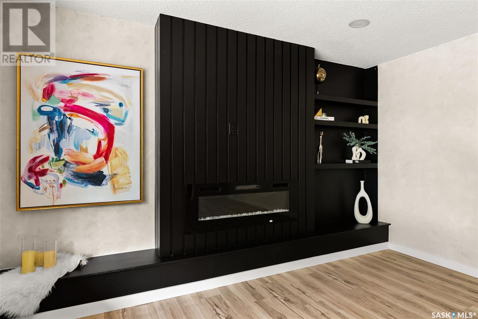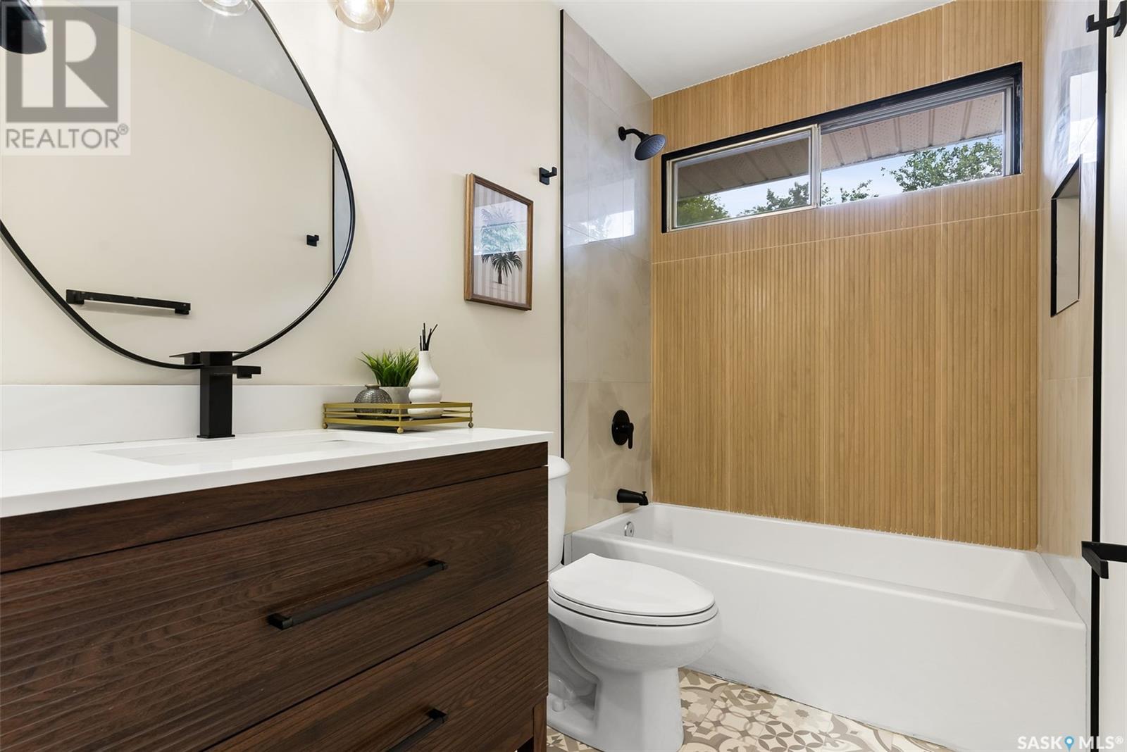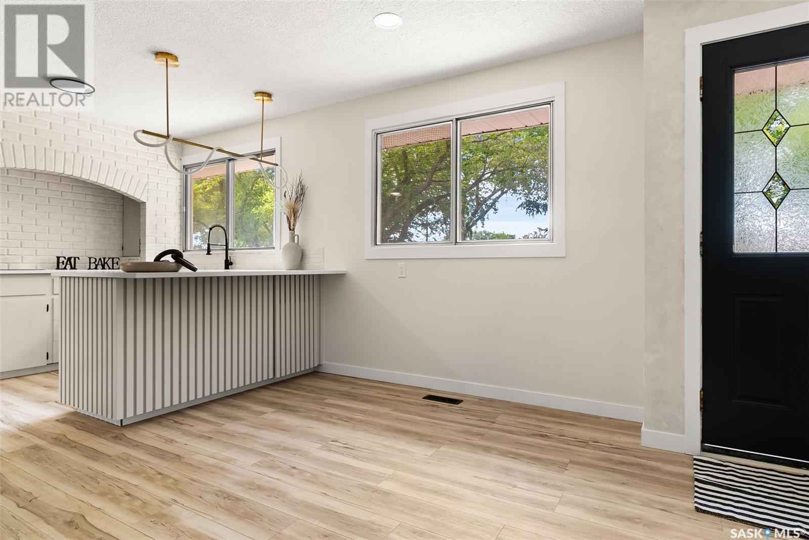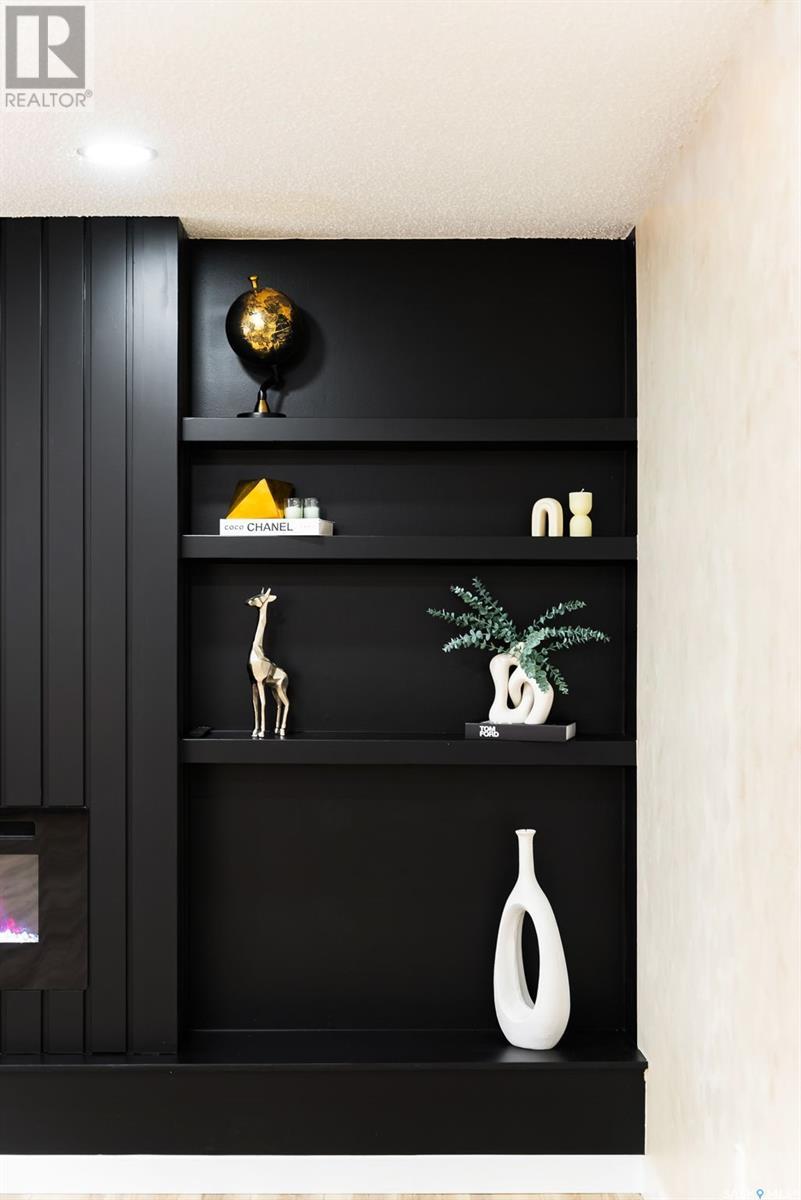 Welcome to 3230 6th Avenue North, a beautifully renovated bungalow nestled in the heart of Regina’s family-friendly Coronation Park. This stunning 1,147 sq ft home blends timeless charm with stylish modern upgrades and is move-in ready from top to bottom. Step inside to a spacious living room where natural light pours through large front windows, highlighting the elegant vinyl plank flooring and a custom black feature wall with built-in shelving and an electric fireplace that adds warmth and flair. The bright kitchen is a true standout with its arched white brick surround, striking island with vertical panel detailing and updated lighting and a cozy dining area with views of the mature front yard complete the main space. The main floor offers three well-sized bedrooms and a gorgeous 4-piece bathroom featuring designer tile work, a floating vanity, matte black fixtures, and a unique wood-accented shower wall. Downstairs, the fully developed basement boasts a massive rec room with new carpet and a striking black stone fireplace, an additional 3-piece bathroom with stylish finishes, and a den ideal for a home office or guest room. Outside, the low-maintenance yard offers plenty of potential and leads to a rare double detached garage with back lane access, providing ample storage and parking. Located on a quiet, tree-lined street close to schools, parks, and all north-end amenities, this home is perfect for families, first-time buyers, or anyone looking for a turnkey property with style and function. Don’t miss your opportunity to own this beautifully updated home! (id:43042)
