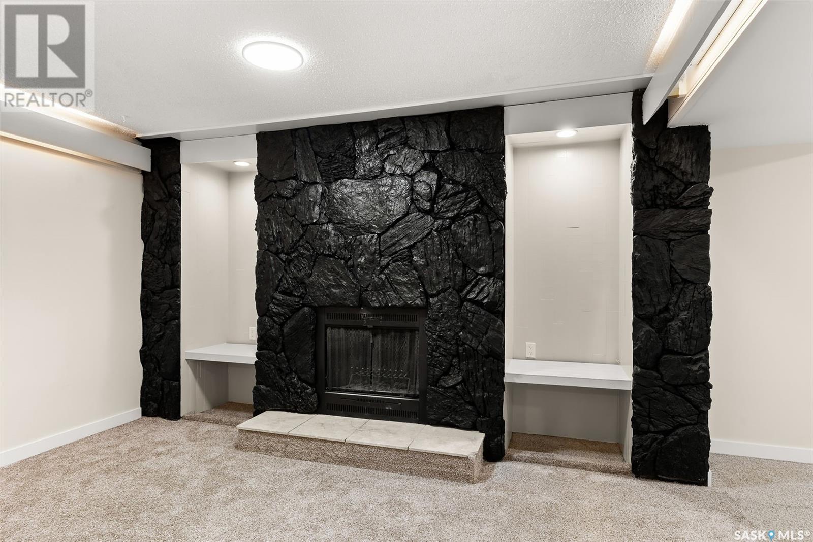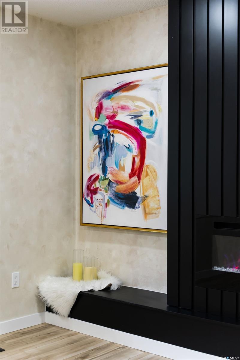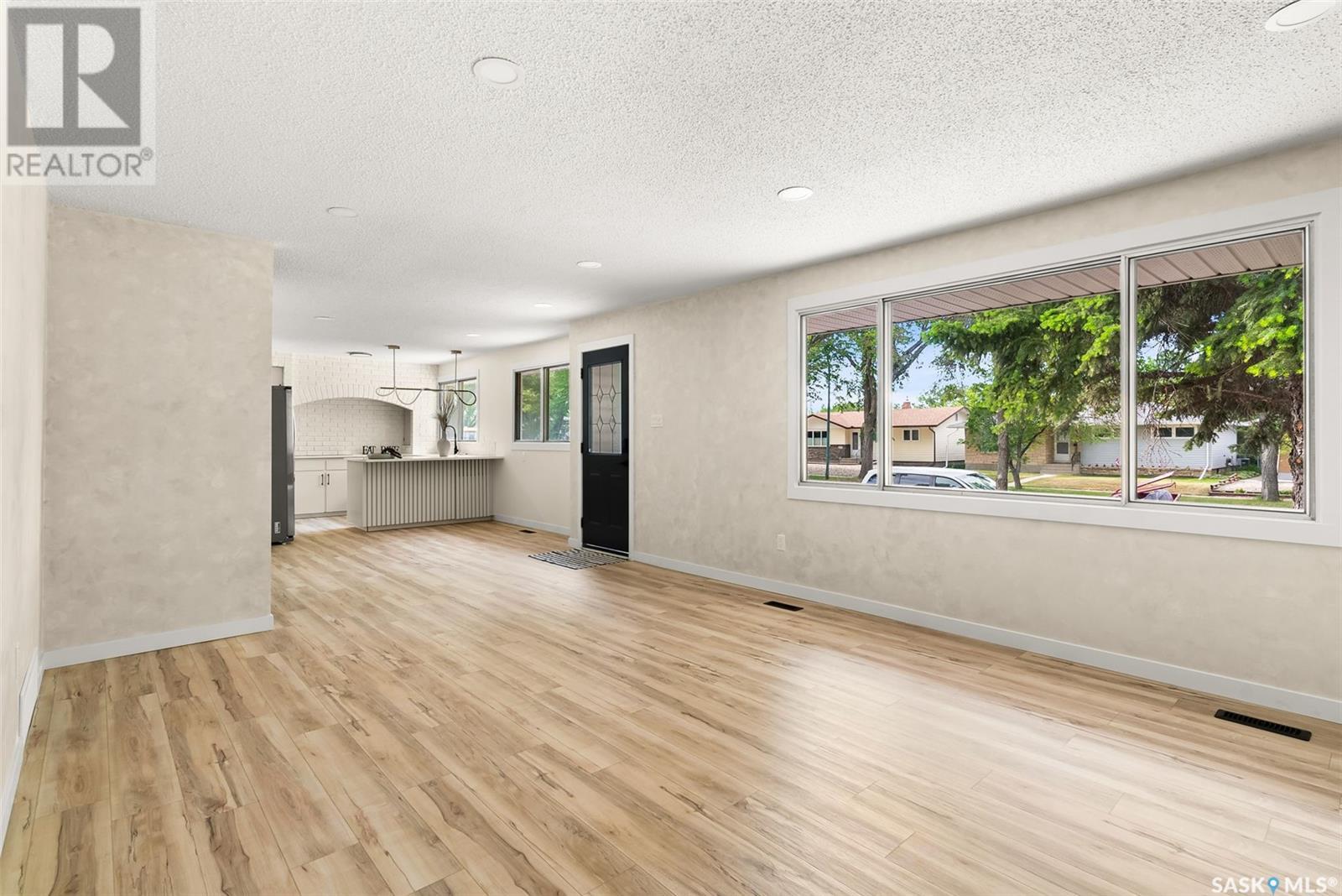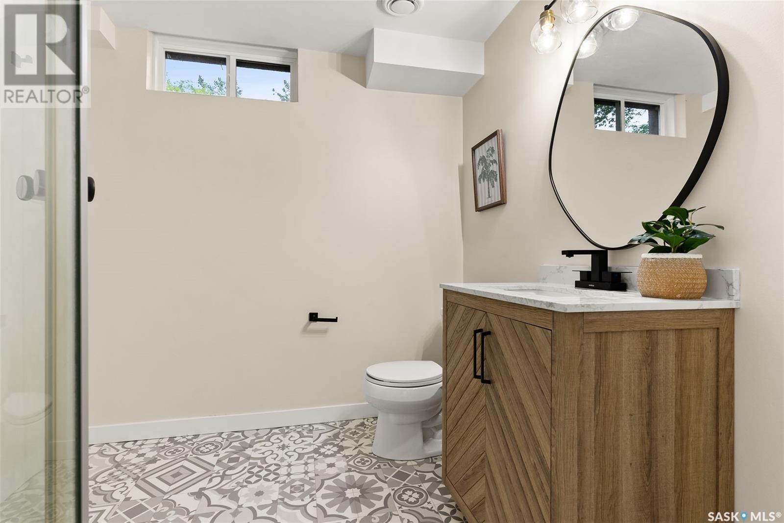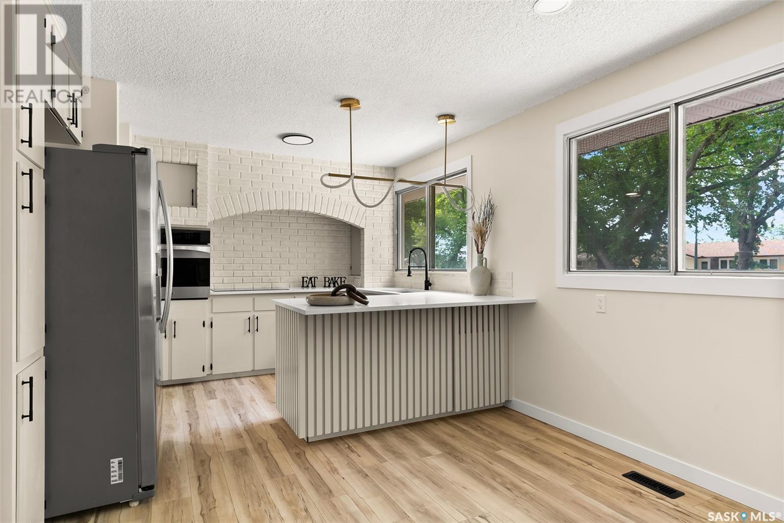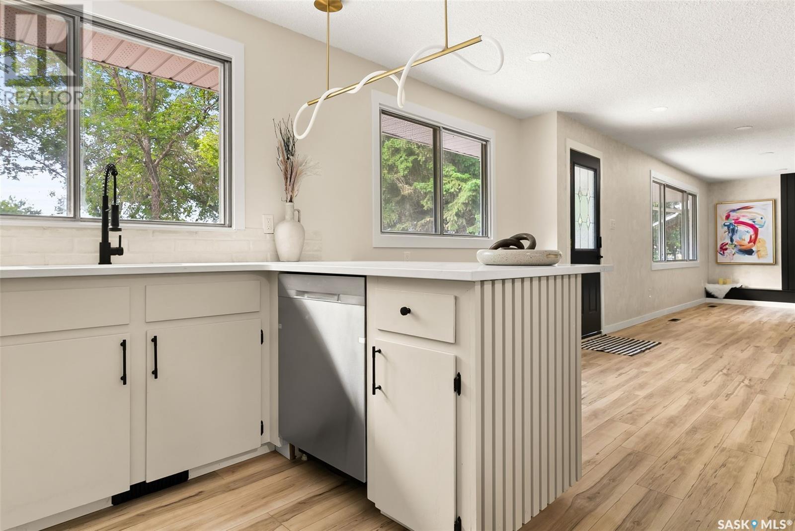 Welcome to 3230 6th Avenue North, a beautifully renovated bungalow nestled in the heart of Regina’s family-friendly Coronation Park. This stunning 1,147 sq ft home blends timeless charm with stylish modern upgrades and is move-in ready from top to bottom. Step inside to a spacious living room where natural light pours through large front windows, highlighting the elegant vinyl plank flooring and a custom black feature wall with built-in shelving and an electric fireplace that adds warmth and flair. The bright kitchen is a true standout with its arched white brick surround, striking island with vertical panel detailing and updated lighting and a cozy dining area with views of the mature front yard complete the main space. The main floor offers three well-sized bedrooms and a gorgeous 4-piece bathroom featuring designer tile work, a floating vanity, matte black fixtures, and a unique wood-accented shower wall. Downstairs, the fully developed basement boasts a massive rec room with new carpet and a striking black stone fireplace, an additional 3-piece bathroom with stylish finishes, and a den ideal for a home office or guest room. Outside, the low-maintenance yard offers plenty of potential and leads to a rare double detached garage with back lane access, providing ample storage and parking. Located on a quiet, tree-lined street close to schools, parks, and all north-end amenities, this home is perfect for families, first-time buyers, or anyone looking for a turnkey property with style and function. Don’t miss your opportunity to own this beautifully updated home! (id:43042)
