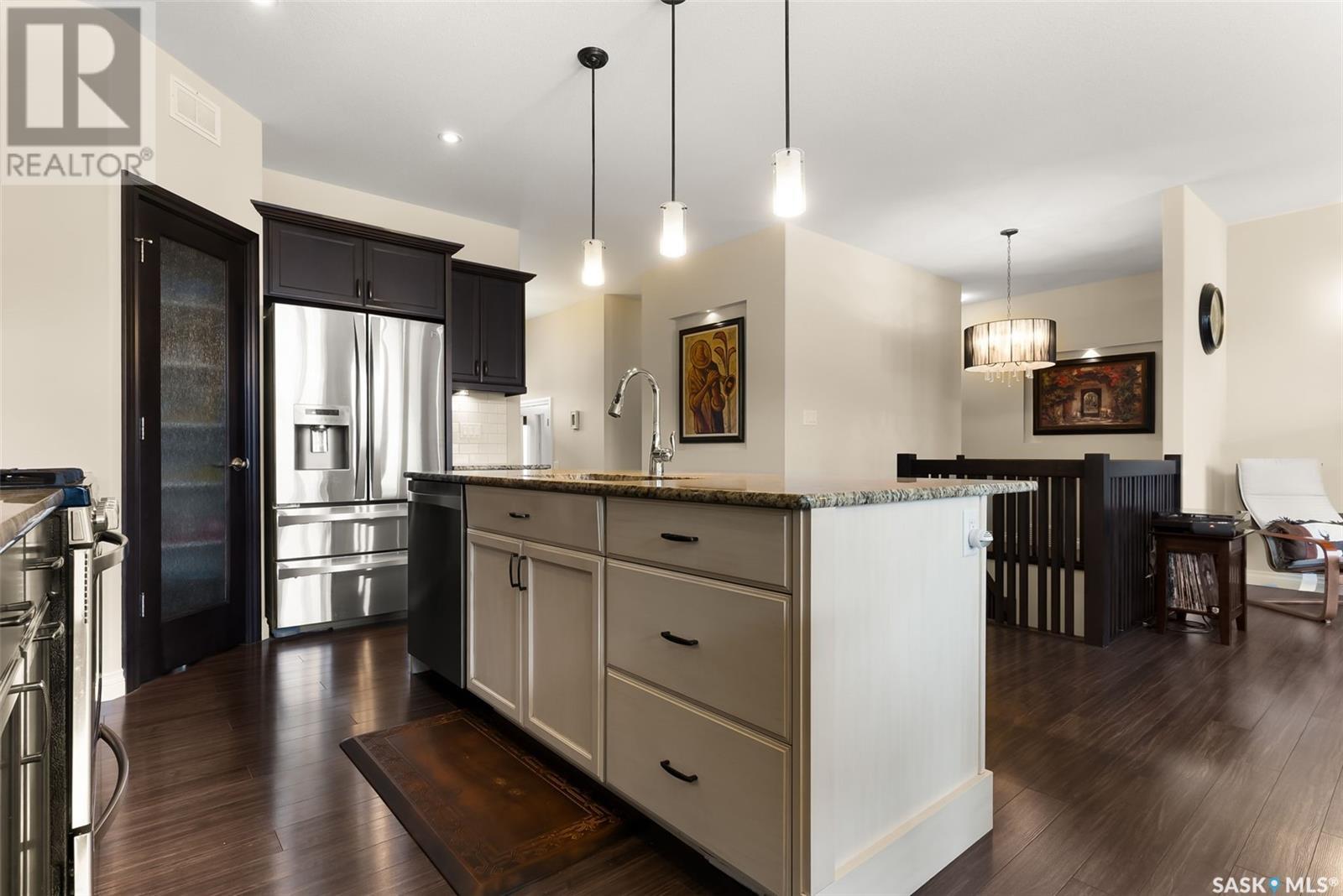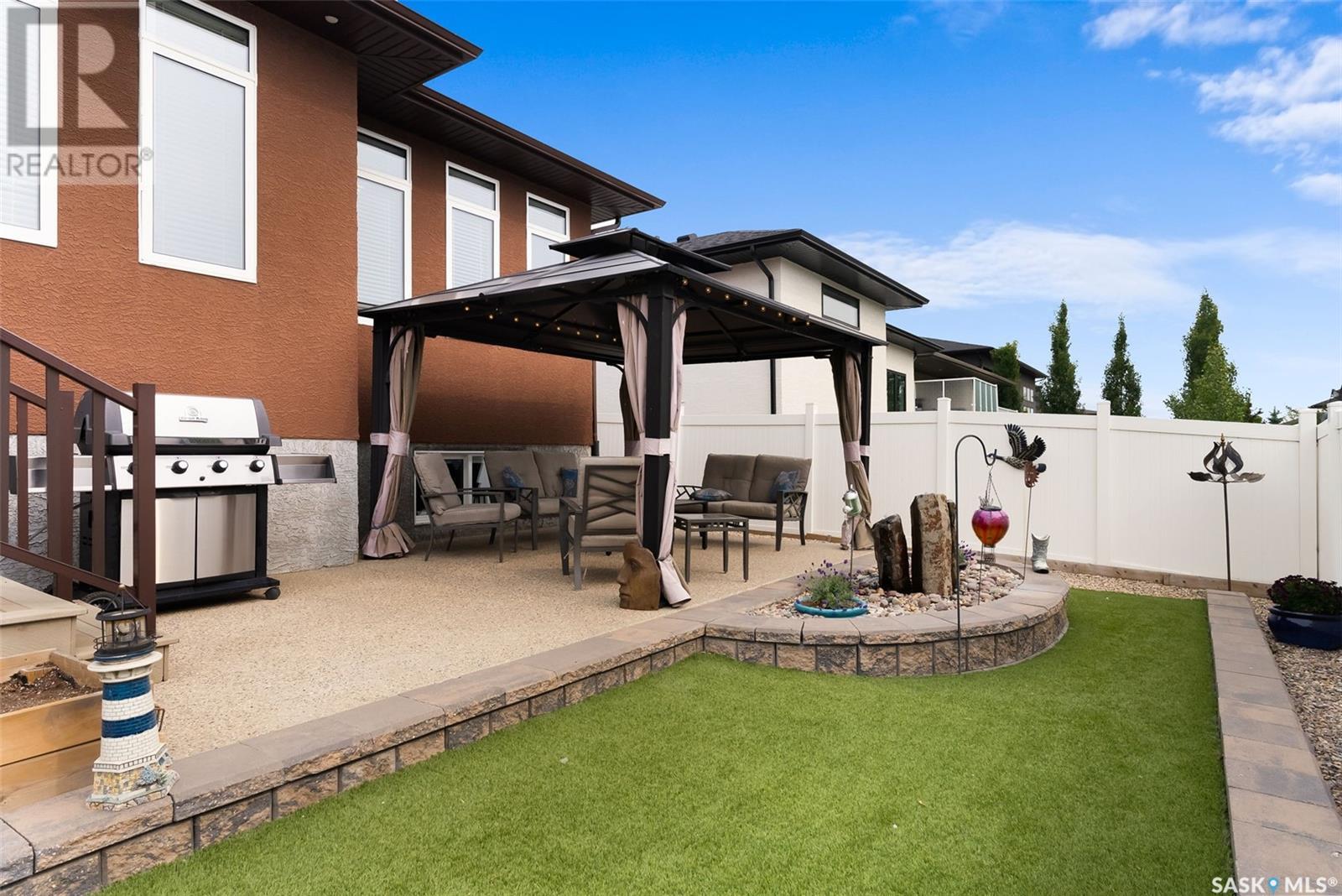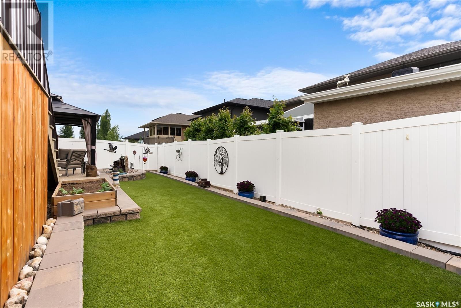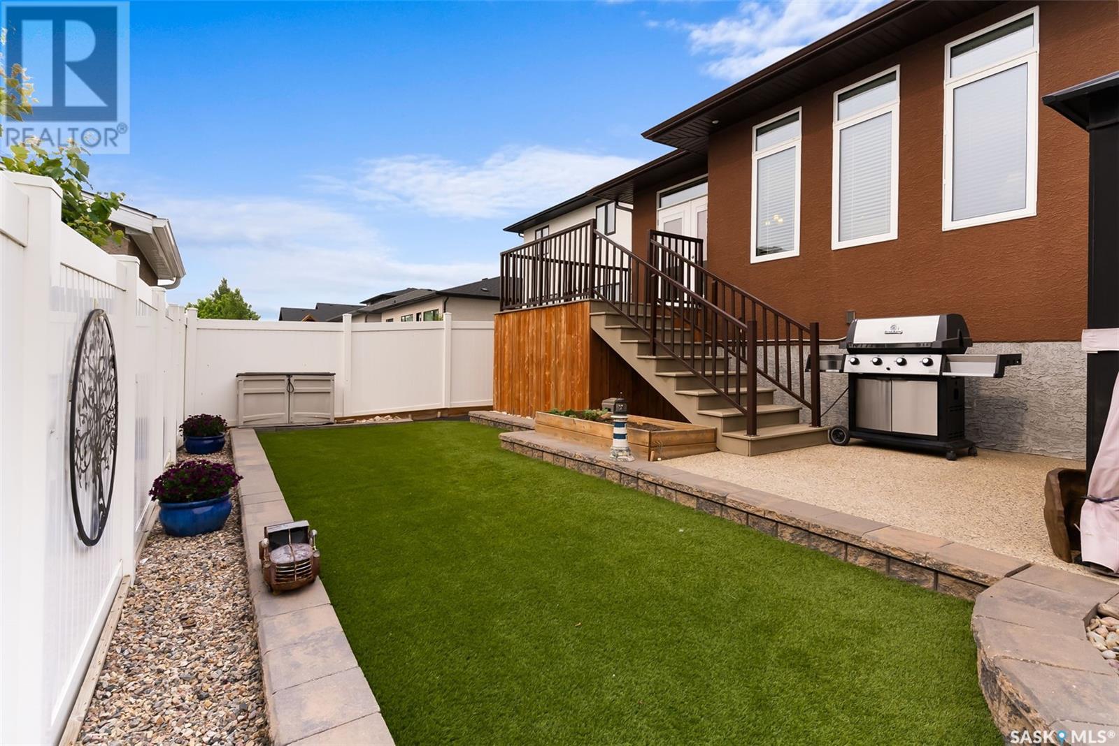 This pristine custom built 1,490 sq/ft bungalow in The Greens on Gardiner was expertly crafted and showcases quality, comfort, and thoughtful design throughout. Premium upgrades, energy-efficient systems, and an exceptionally functional layout perfect for families or downsizers. Exceptional street appeal with xeriscaped front yard with river rock, stack stone and arcylic stucco exterior, large exposed aggregate driveway to the triple attached heated garage. The open-concept main floor features 9-foot ceilings, and triple-pane windows that flood the space with natural light. The chef’s kitchen is beautifully appointed with rich maple cabinetry, gas range stove, soft-close doors and drawers, crown moulding, under-cabinet lighting, granite countertops, and a large central island with pendant lighting. The bright living room includes a gas fireplace with built-in shelving and tile surround. Spacious dining room with direct access to the backyard and additional light via the piano window. A front-facing den/office behind glass French doors offers privacy without sacrificing natural light. The office could be converted to a spare bedroom on the main floor. The spacious primary bedroom features a walk-in closet and luxurious ensuite with dual sinks, and a 5-ft walk-in shower. Completing the main floor is mudroom and designated main floor laundry area with tons of storage. The fully finished basement includes large rec room with two separate living spaces, two additional bedrooms with walk-in closets and a 4-pc bath. Oversized windows in the basement provide a comfortable feel with the additional natural light to shine through. Navien tankless water heater, high-efficiency furnace, HRV and open web truss floor system. Enjoy the beautifully landscaped, low-maintenance backyard with artificial turf, raised garden beds, gazebo and PVC fencing. The oversized triple garage is heated and finished, with a floor drain, built-in storage. Close to all east end amenities! (id:43042)