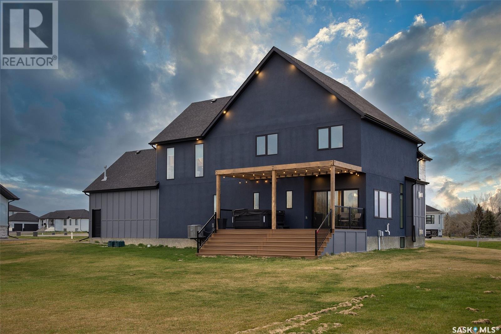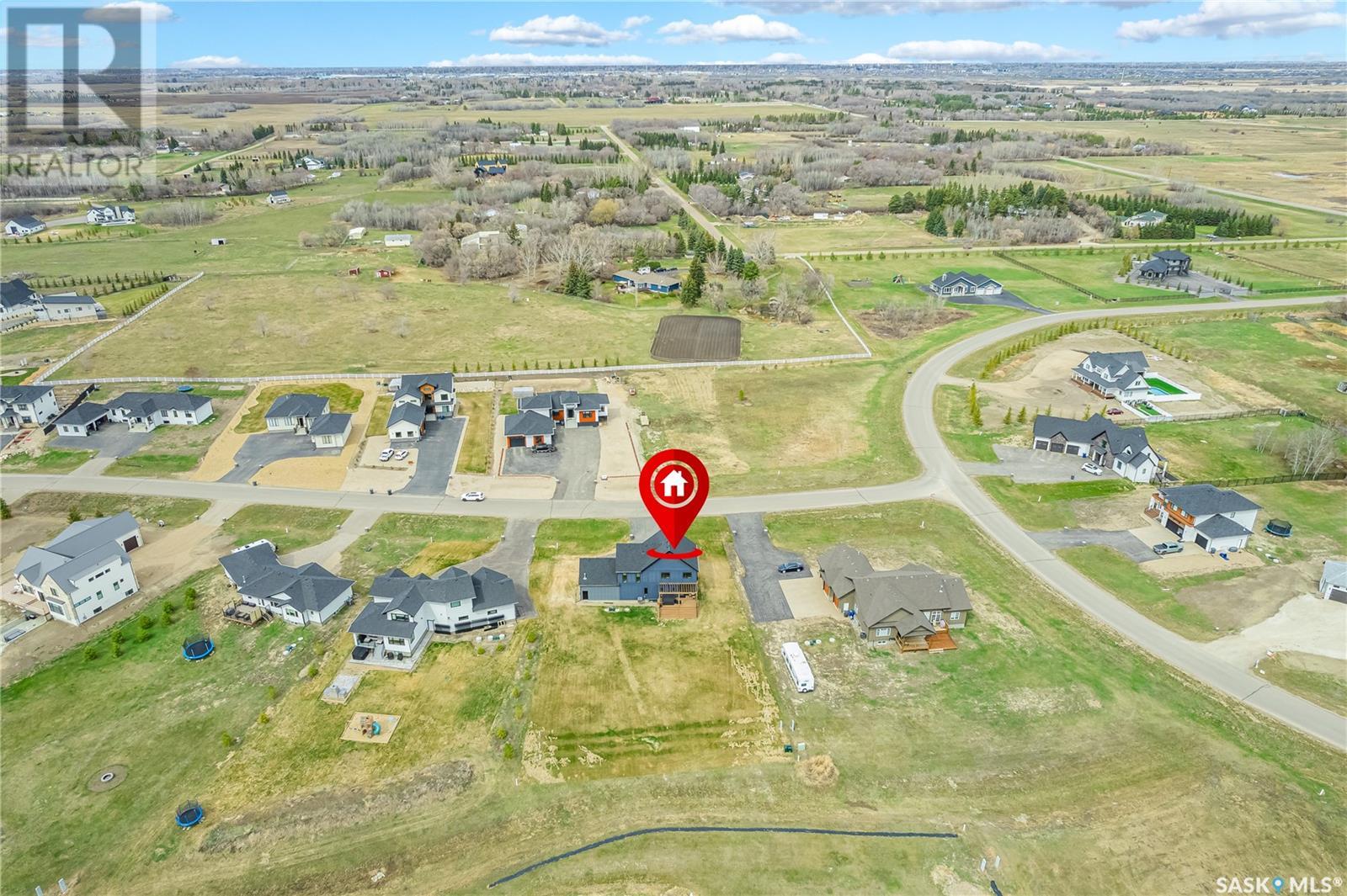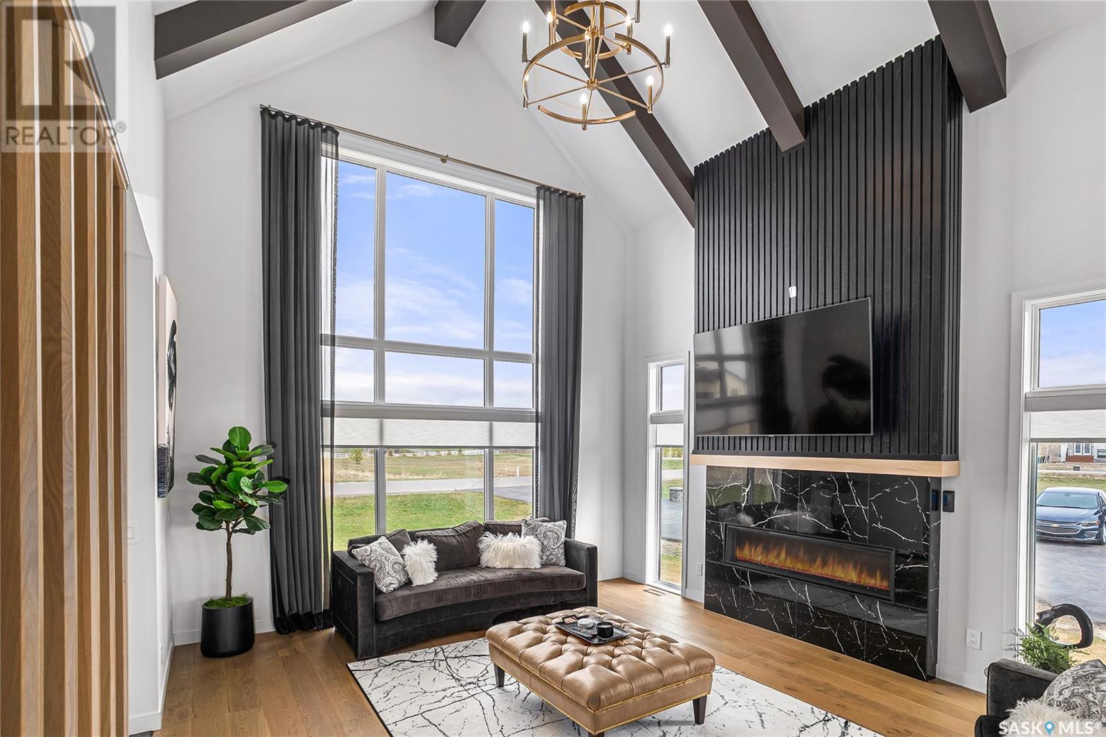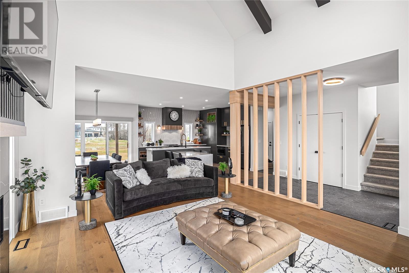Welcome to luxury living in the prestigious community of Edgemont Estates, just minutes south of Saskatoon. This exceptional Fraser Homes built acreage property is designed to impress, from the moment you step into the breathtaking main living room featuring soaring vaulted ceilings, oversized triple-pane windows, and exquisite waterproof engineered hardwood flooring. Gather around one of two gorgeous natural gas fireplaces that set the perfect ambiance for cozy evenings or sophisticated entertaining. The custom-designed, one-of-a-kind kitchen boasts stunning stone countertops, high-end fixtures, luxurious hardware, and a cleverly concealed walk-in pantry, ideal for both daily living and hosting grand events. The home's thoughtful layout includes an incredibly spacious upstairs laundry room, detailed tile work throughout, and stylish LED lighting seamlessly integrated into the railings. Enjoy the fully finished basement that offers versatile space for recreation or relaxation with an extra bedroom and wetbar. Situated on a generous 0.55-acre lot, the property includes an oversized triple car garage 24/26x32, underground sprinklers, and maintenance-free composite decking, complemented perfectly by a high-end hot tub for ultimate relaxation. The window coverings are included and some of them are motorized too! Did you see the app Controlled LED Jewel lights on the front of the house too? How cool are those! Stay comfortable year-round with air conditioning and energy-efficient triple-pane windows, along with the convenience of city water on a drip system. Residents of this exclusive community also enjoy access to a private playground and park area, making it the ideal location for families looking for elegance, privacy, and a refined lifestyle. Quick possession and furnishings available on request too! (id:43042)