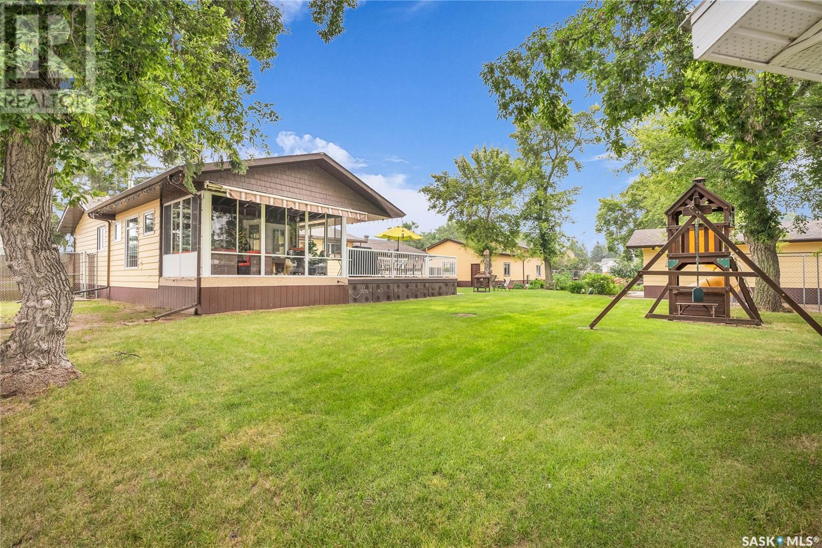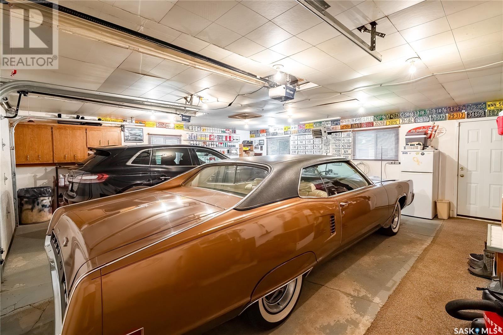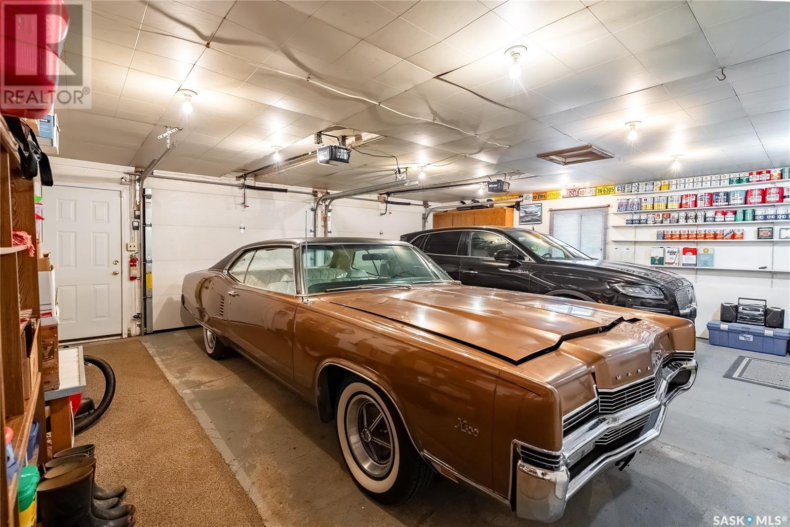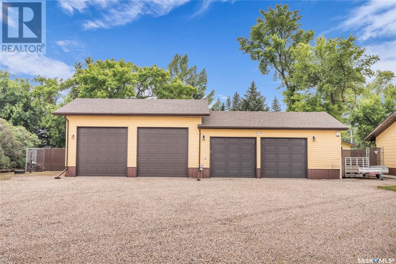 Calling all auto enthusiasts, mechanics, and car collectors! With a rare 170-ft frontage on over half an acre, there's more than enough space for vehicles, trailers, and future development. Garage space for up to 10 vehicles, 9 heated, this is a dream setup for car enthusiasts or mechanics! Whether you're looking to wrench, restore, or showcase your collection, this setup delivers. It features a heated attached 2-car garage (24x26), a heated detached garage/workshop (24x56) that can fit up to 7 vehicles, and a third detached 16x24 garage with an attached garden shed for added storage. The workshop has room for 2 hoists, hobby space, and more! Built in 1965, this home has seen substantial updates over the years, including a spacious addition off the kitchen with a gas fireplace, an enclosed sunroom, and a 350 sq ft back deck-all added in 2010. The main level features a cozy front living room with a gas fireplace and large windows, plus an additional sitting/dining area off the kitchen with vaulted ceilings, garden doors, and abundant natural light-perfect for hosting or relaxing. There are two bedrooms on the main floor, including a primary with an updated 3-piece bath. A second full bathroom and a spacious laundry room complete the main level. The finished basement offers a comfortable family room (new flooring, baseboards, paint), two bedrooms, an office, and another full bath. The expansive backyard is beautifully landscaped, fully fenced and includes a firepit, play structure, garden area, and perennials-plus a well and hydrant for outdoor watering. Upgrades:new 30 yr shingles(222) and additional attic insulation, triple glazed windows(2010), on-demand water heater(2025), and medium efficiency furnace/AC(2008). Located across from the school in Harris, this home has small-town charm with big-time garage space-just a short drive to Rosetown, Delisle, and the Nutrien mines and only 40 minutes to Saskatoon. **collectibles in garage are not for sale and are removed. (id:43042)