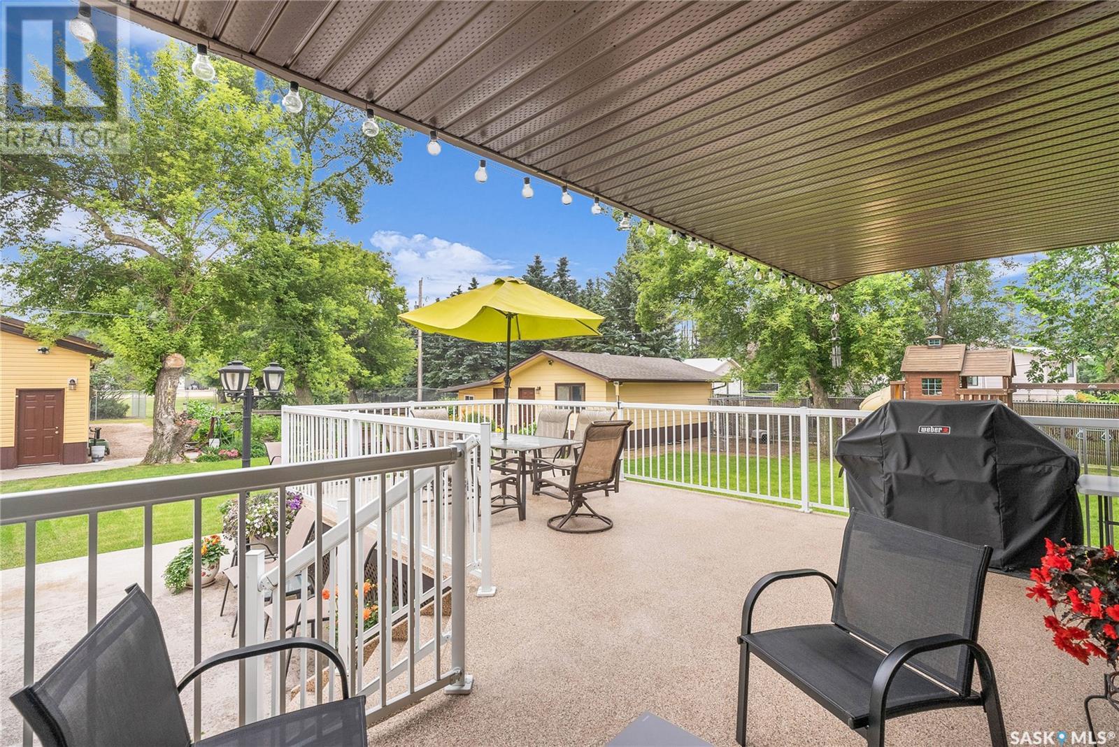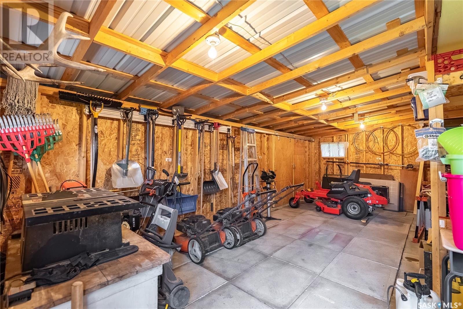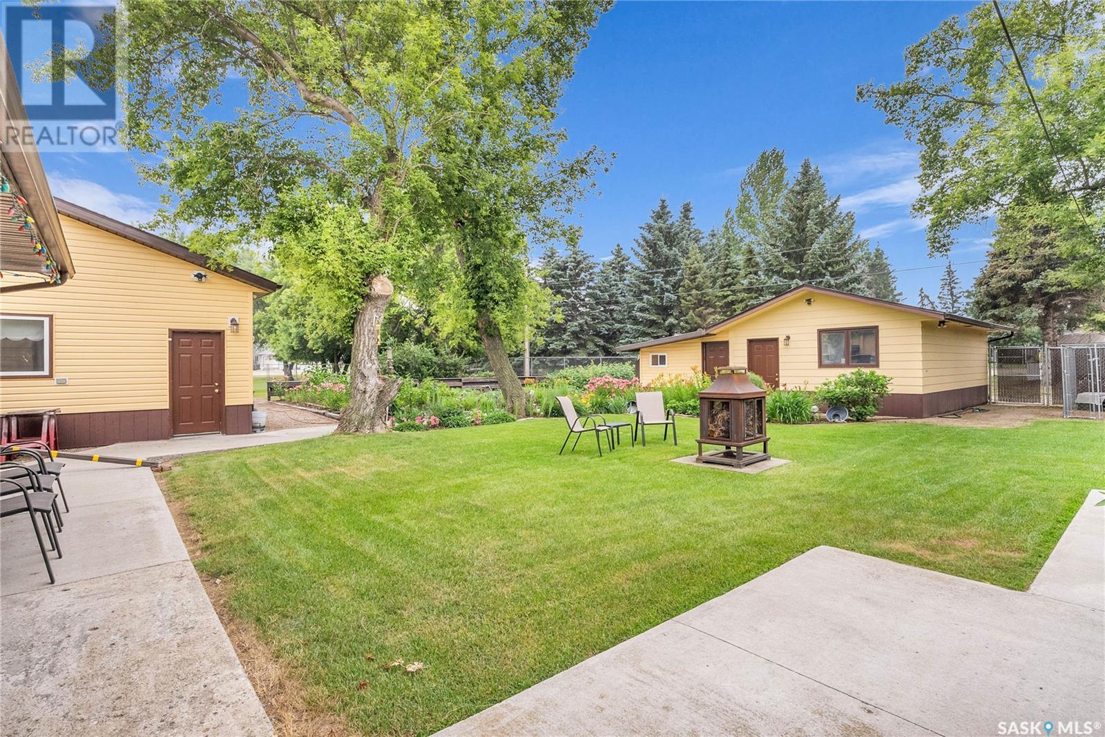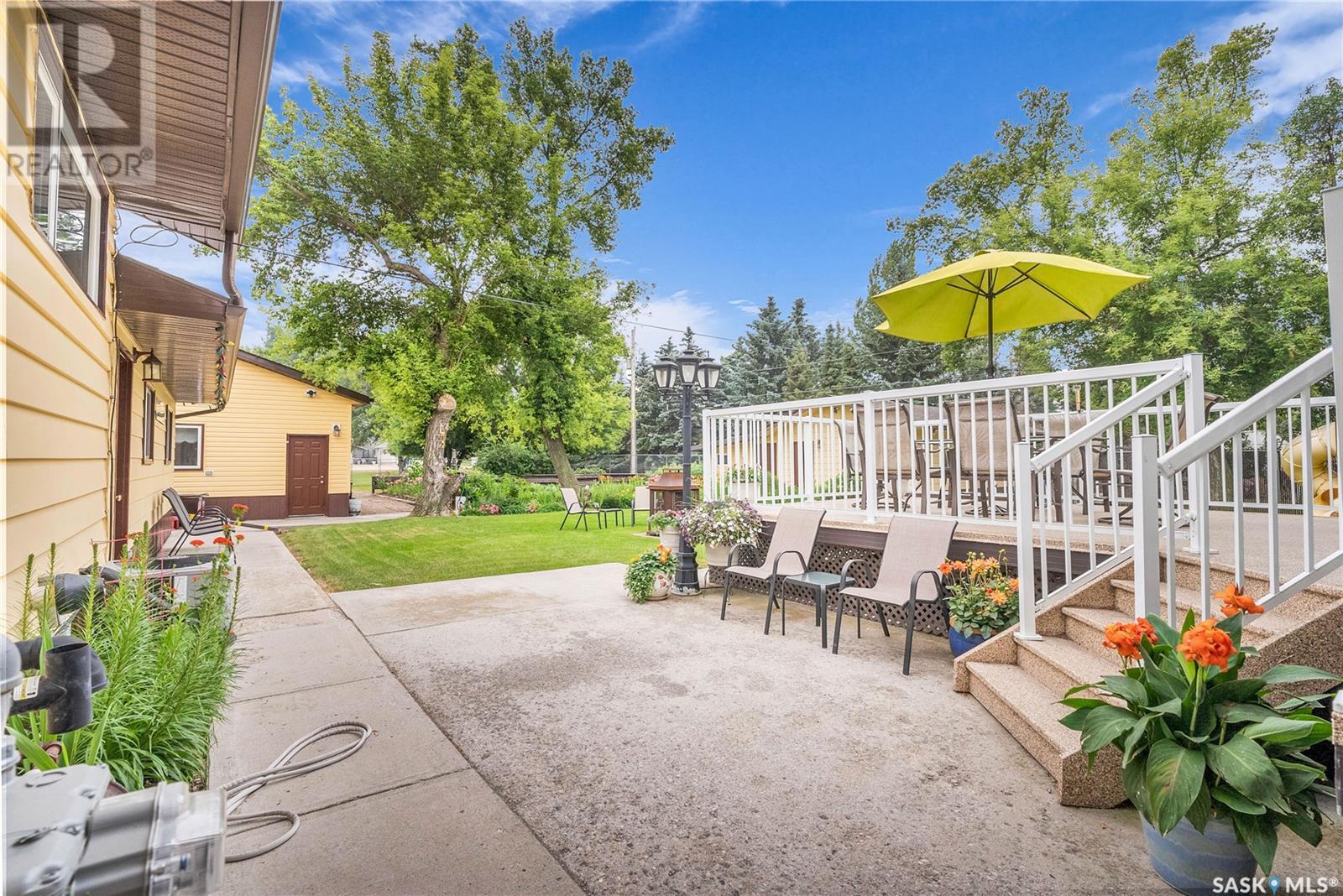 Calling all auto enthusiasts, mechanics, and car collectors! With a rare 170-ft frontage on over half an acre, there's more than enough space for vehicles, trailers, and future development. Garage space for up to 10 vehicles, 9 heated, this is a dream setup for car enthusiasts or mechanics! Whether you're looking to wrench, restore, or showcase your collection, this setup delivers. It features a heated attached 2-car garage (24x26), a heated detached garage/workshop (24x56) that can fit up to 7 vehicles, and a third detached 16x24 garage with an attached garden shed for added storage. The workshop has room for 2 hoists, hobby space, and more! Built in 1965, this home has seen substantial updates over the years, including a spacious addition off the kitchen with a gas fireplace, an enclosed sunroom, and a 350 sq ft back deck-all added in 2010. The main level features a cozy front living room with a gas fireplace and large windows, plus an additional sitting/dining area off the kitchen with vaulted ceilings, garden doors, and abundant natural light-perfect for hosting or relaxing. There are two bedrooms on the main floor, including a primary with an updated 3-piece bath. A second full bathroom and a spacious laundry room complete the main level. The finished basement offers a comfortable family room (new flooring, baseboards, paint), two bedrooms, an office, and another full bath. The expansive backyard is beautifully landscaped, fully fenced and includes a firepit, play structure, garden area, and perennials-plus a well and hydrant for outdoor watering. Upgrades:new 30 yr shingles(222) and additional attic insulation, triple glazed windows(2010), on-demand water heater(2025), and medium efficiency furnace/AC(2008). Located across from the school in Harris, this home has small-town charm with big-time garage space-just a short drive to Rosetown, Delisle, and the Nutrien mines and only 40 minutes to Saskatoon. **collectibles in garage are not for sale and are removed. (id:43042)