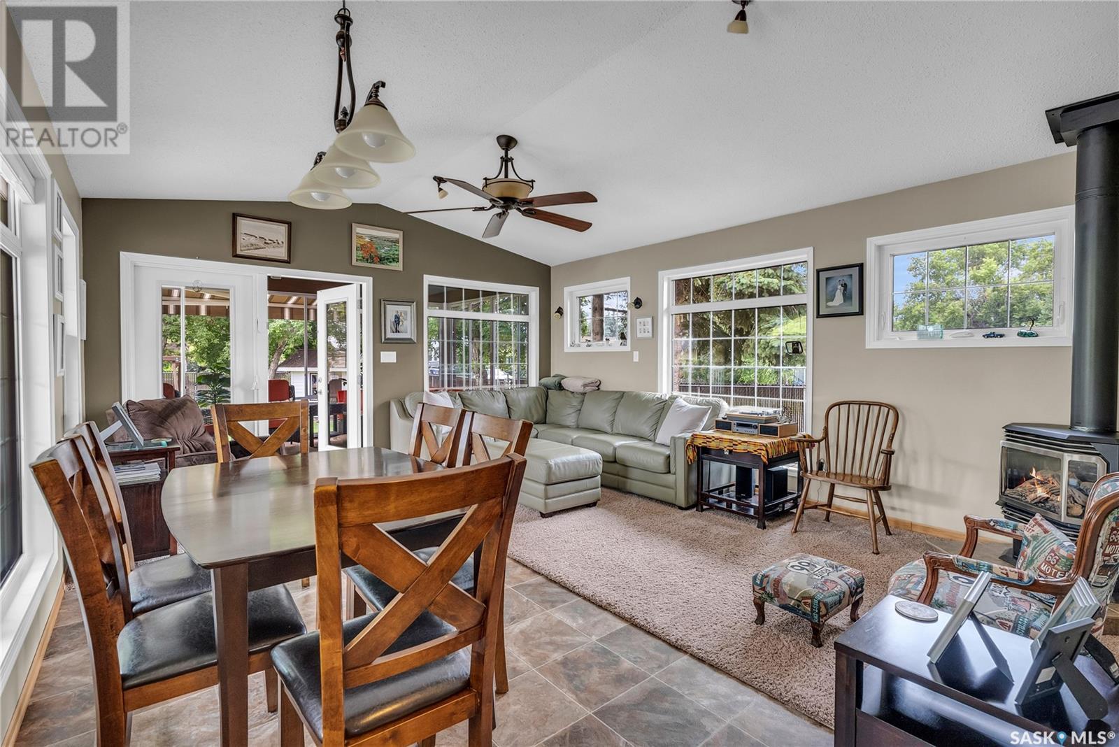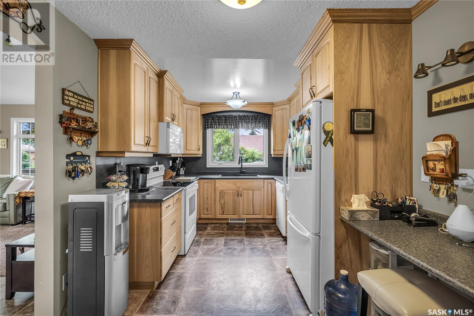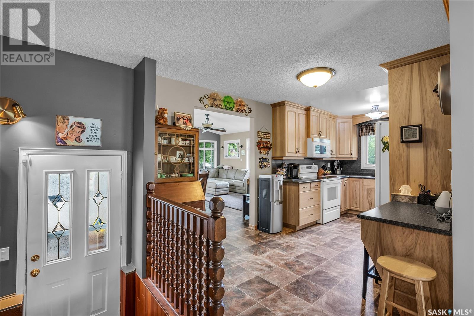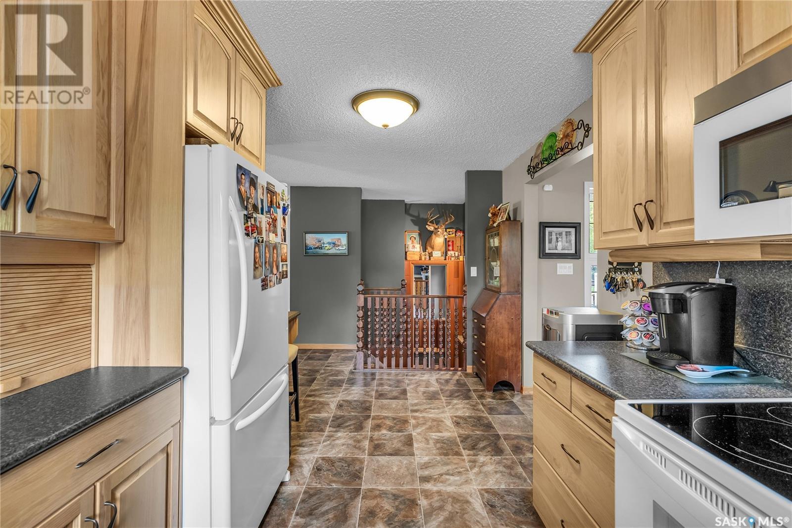 Calling all auto enthusiasts, mechanics, and car collectors! With a rare 170-ft frontage on over half an acre, there's more than enough space for vehicles, trailers, and future development. Garage space for up to 10 vehicles, 9 heated, this is a dream setup for car enthusiasts or mechanics! Whether you're looking to wrench, restore, or showcase your collection, this setup delivers. It features a heated attached 2-car garage (24x26), a heated detached garage/workshop (24x56) that can fit up to 7 vehicles, and a third detached 16x24 garage with an attached garden shed for added storage. The workshop has room for 2 hoists, hobby space, and more! Built in 1965, this home has seen substantial updates over the years, including a spacious addition off the kitchen with a gas fireplace, an enclosed sunroom, and a 350 sq ft back deck-all added in 2010. The main level features a cozy front living room with a gas fireplace and large windows, plus an additional sitting/dining area off the kitchen with vaulted ceilings, garden doors, and abundant natural light-perfect for hosting or relaxing. There are two bedrooms on the main floor, including a primary with an updated 3-piece bath. A second full bathroom and a spacious laundry room complete the main level. The finished basement offers a comfortable family room (new flooring, baseboards, paint), two bedrooms, an office, and another full bath. The expansive backyard is beautifully landscaped, fully fenced and includes a firepit, play structure, garden area, and perennials-plus a well and hydrant for outdoor watering. Upgrades:new 30 yr shingles(222) and additional attic insulation, triple glazed windows(2010), on-demand water heater(2025), and medium efficiency furnace/AC(2008). Located across from the school in Harris, this home has small-town charm with big-time garage space-just a short drive to Rosetown, Delisle, and the Nutrien mines and only 40 minutes to Saskatoon. **collectibles in garage are not for sale and are removed. (id:43042)