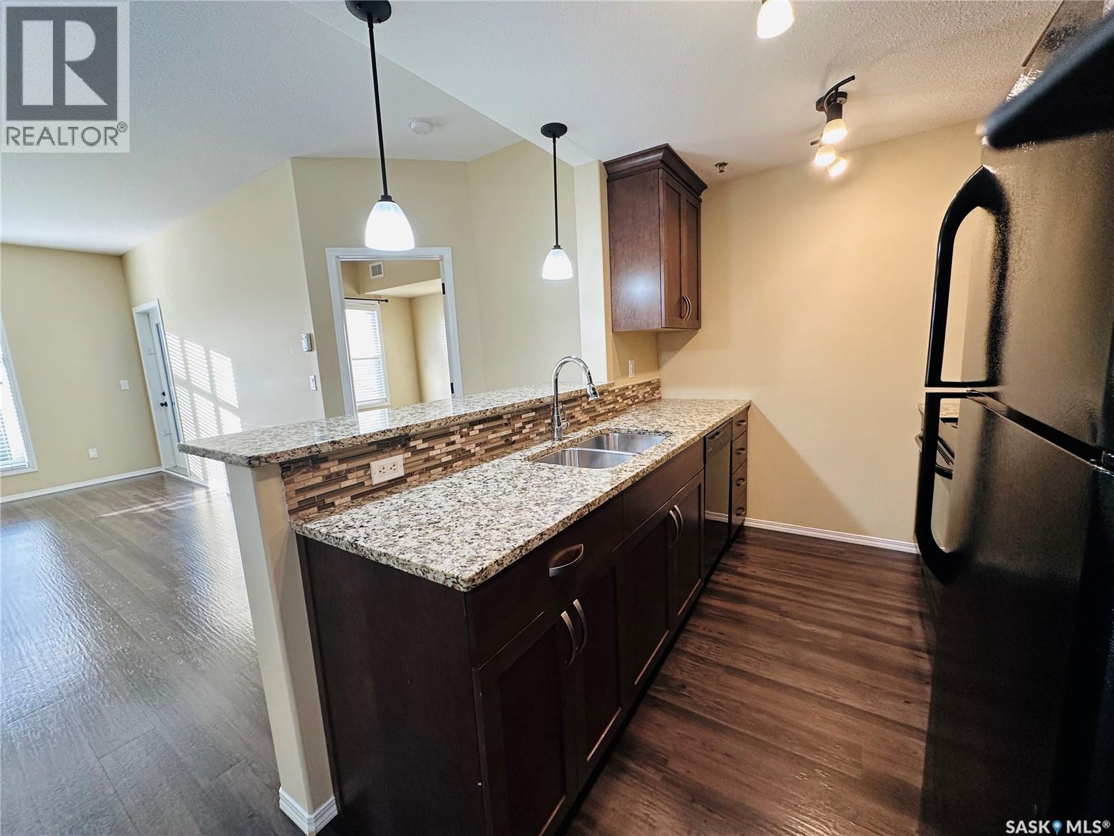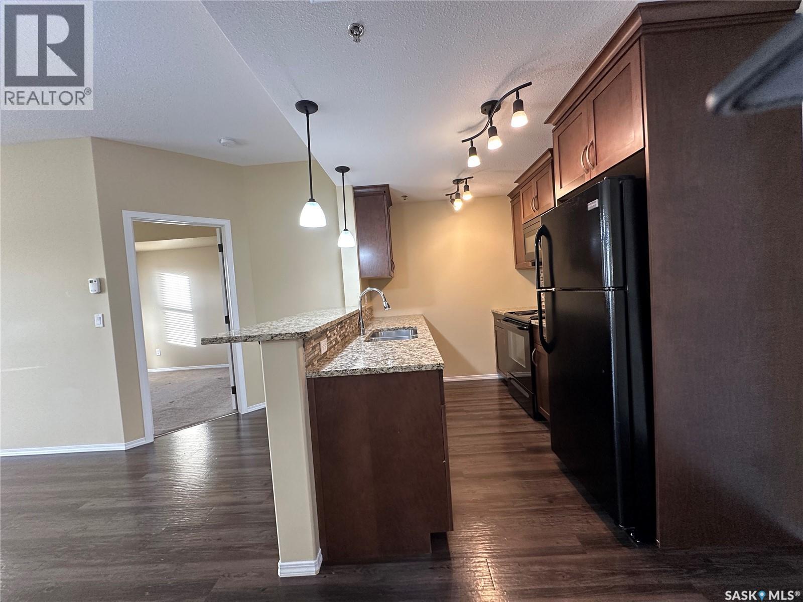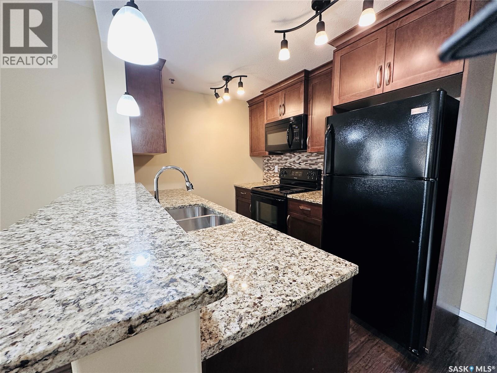 $596.66 MonthlyExecutive Top FLoor Condo located in the beautiful Bellagio Terrace in Hillsdale. Two bedrooms, two bathrooms and two parking stalls. The primary bedroom suite is perfect with a walk through closet and ensuite bathroom. Other bedroom and 4 piece bathroom on the other side of the condo, the ideal floor plan! A spacious entry and good size laundry room with storage space. The kitchen is complete with all appliances, maple cabinets, granite countertop and eat at island. Luxury Vinyl Plank flooring. Dining area and living room open with natural lighting from good size window. Garden door out to the deck to enjoy your own outdoor quiet area with a north west view. A modern clean move in ready condo, has been well maintained! Central Air. Heated underground parking with elevator. Common area includes a fitness centre. This property is a perfect couples condo or two people - your own bedroom, bathroom and parking space. Not all rooms are in the photos. Located near Wascana Park, close to downtown and the University. Condo fees include common area maintenance & insurance, exterior building, garbage, heat, water, sewer, lawn care & snow removal. A very nice quiet building and grounds well kept! This property could be yours, a comfortable lifestyle in a great location (id:43042)