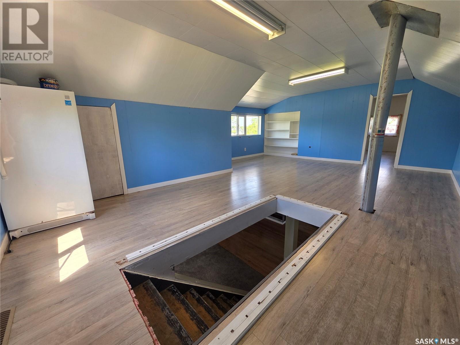 Discover the charm of Cabri, a cozy community just 40 minutes from Swift Current, with this one-and-a-half-story home blending charming character with modern updates. Step inside to an open-concept main floor showcasing rustic wood floors, flowing from the entry to the living and dining areas. The dining space features a striking barnwood feature wall and has seamless sightlines to the U-shaped kitchen with ample counter space and oak cupboards. The main floor primary bedroom boasts dual closets framed by a shiplap feature wall, while the four-piece bathroom/laundry room combination wows with a unique vaulted ceiling. Upstairs, is a fantastic feature with a secondary living room area as well as a second bedroom that would be perfect for an older child to have their own space. Outside, you’ll find stone walkways, a built-in fire pit, landscaped flower beds, a partially fenced yard, mature trees, and plenty of green space. The double detached garage is mainly insulated but does not have power running to it. The foundation on this house has experienced some failure, so full disclosure that there may need to be some support required. If you have any questions or would like to see this home for yourself, feel free to call your real estate professional. (id:43042)
