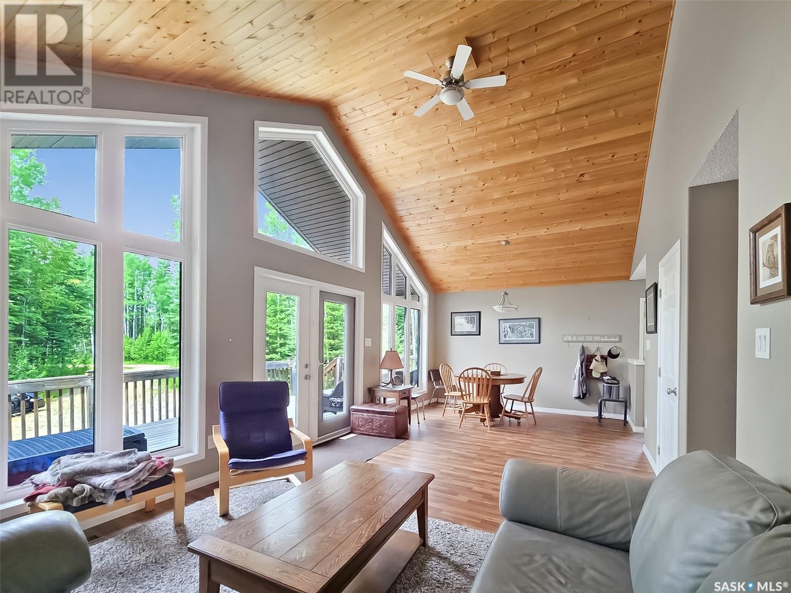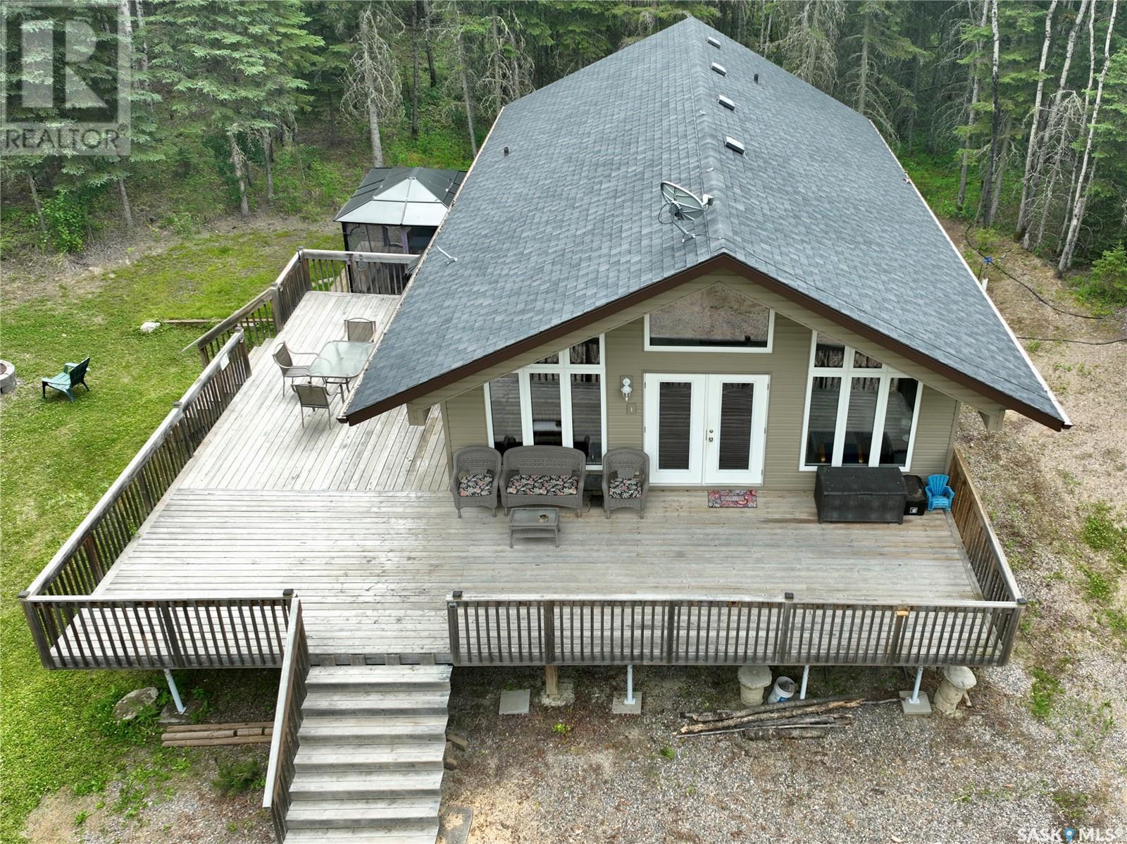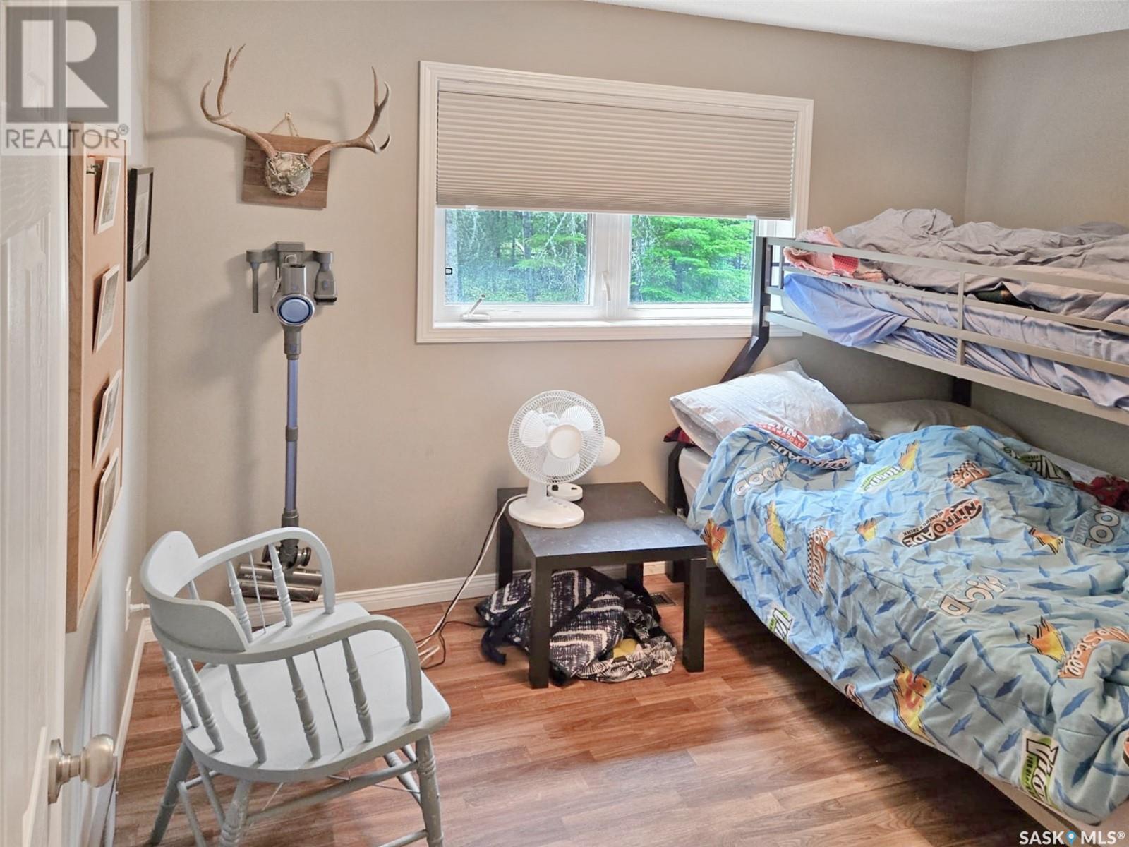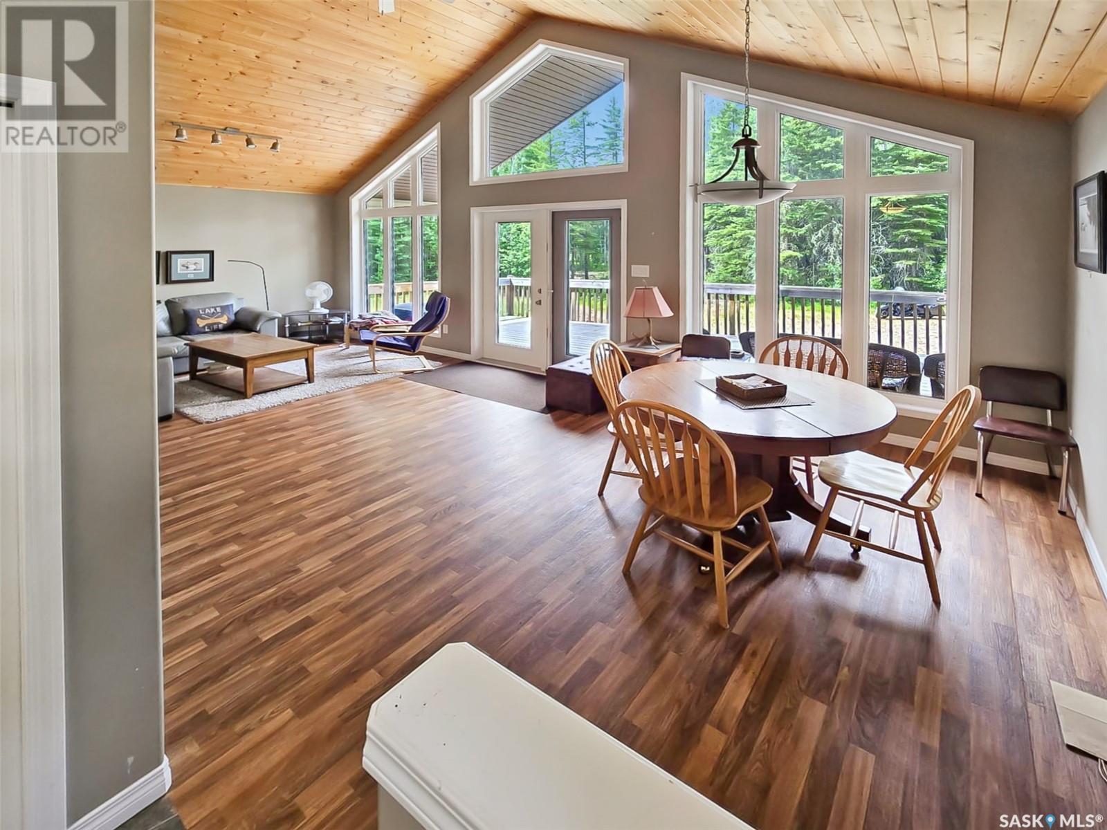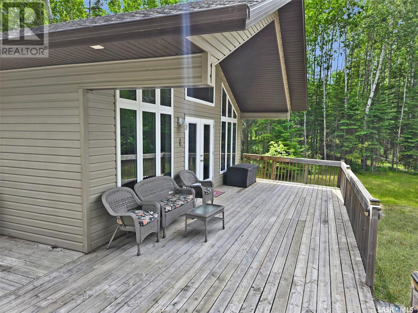 Escape to Aspen Estates and discover this Warman RTM gem! With 1,040 sqft of smartly designed living space, this 3-bedroom, 1-bathroom home features vaulted ceilings, abundant natural light, convenient laundry, and plenty of storage throughout. Nestled on a sprawling 1.24-acre lot surrounded by trees and tranquility, this home offers the perfect blend of comfort and nature. Step outside onto the massive wraparound deck—ideal for morning coffee or evening BBQs. Enjoy the private gazebo, cozy firepit area, and peaceful views under the open sky. Additional perks include your own private well (unlimited water!), a septic mound, and a cleared space ready for a garage or RV parking. High and dry, low-maintenance, and move-in ready—this property checks all the boxes. Aspen Estates is a welcoming, peaceful community where you can truly unwind. This could be #yourhappyplace (id:43042)