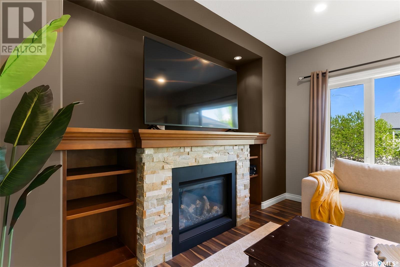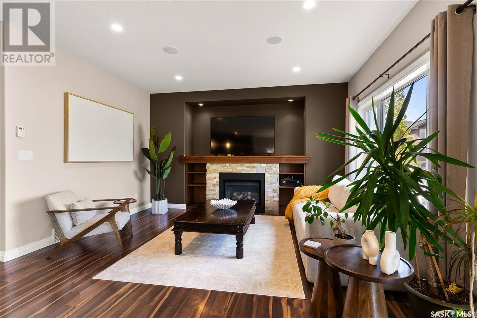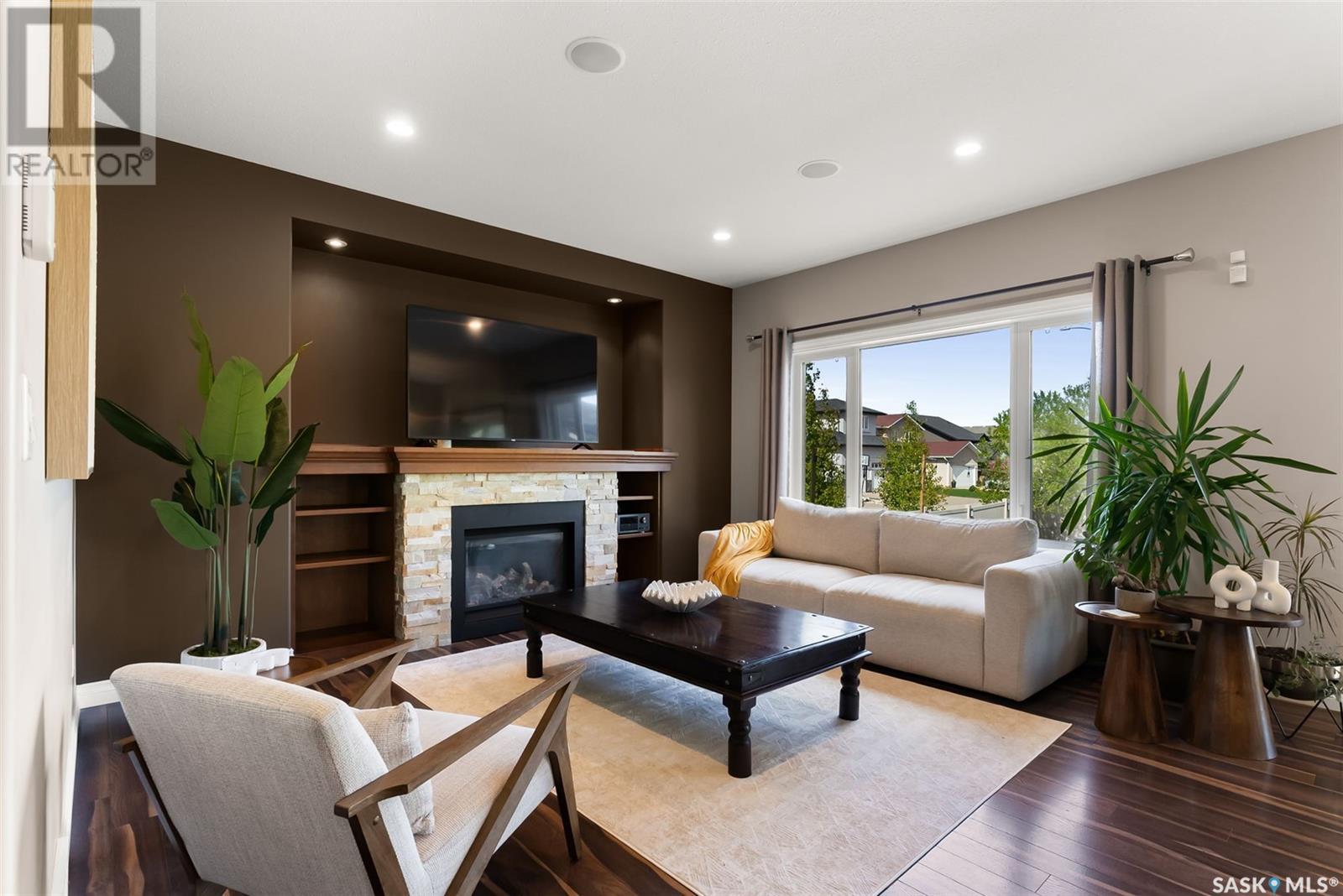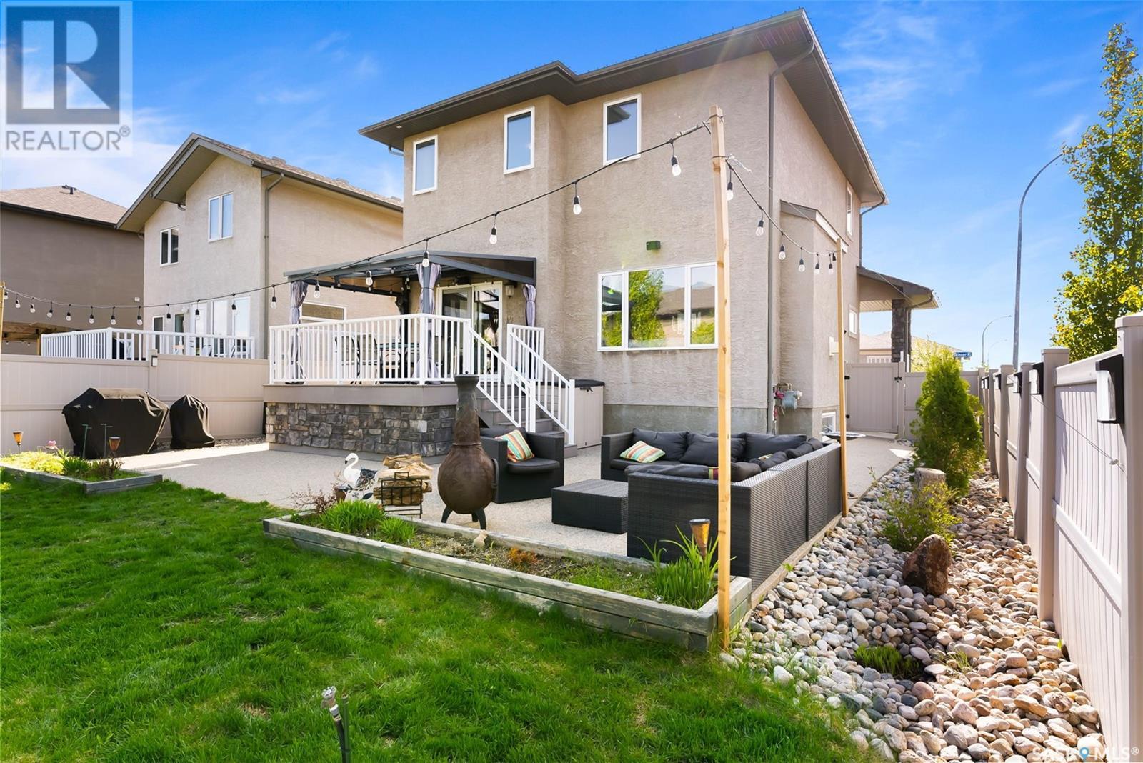 Get all the benefits of a large corner lot—without the hassle. Welcome to 4302 Skinner Place, a custom Crawford home on a quiet crescent in Harbour Landing. Lovingly maintained by its original owners, this 2-storey offers over 2,000 sq ft plus a fully finished basement—blending smart design with premium upgrades. This home is built on piles for added structural integrity. The main floor includes a spacious foyer, private office, and an open-concept living, dining, and kitchen area. The chef’s kitchen features real wood soft-close cabinetry, granite counters, deep drawers, dual spice racks, extended-height cabinets, a walk-in pantry, and built-in ceiling speakers extending to the dining, living room, and backyard. Upstairs offers three bedrooms, each with custom walk-in closets, a bonus room (potential 4th bedroom), full bath, and laundry room with soundproofing. The primary suite includes a 5-pc ensuite and added sound insulation. The basement boasts high ceilings, a projector-ready media area with ceiling speakers, a custom wet bar, and large rec room with space to add a bedroom. All rooms include ethernet ports, cable conduits, high-power outlets, and reinforced walls for clean TV mounting. Enjoy a spacious backyard with a composite deck, raised gardens, mature trees, firewood/tool shed, string lights, and a 20-ft concrete pad under the deck for storage. A concrete walkway wraps the home with gated access on both sides. The extended front porch features dual stairs and coordinated stonework. Extras: granite counters throughout, oversized windows, spray-foam insulated garage, and no sidewalk—saving you winter work. This custom home shows pride of ownership and is a rare Harbour Landing gem. (id:43042)