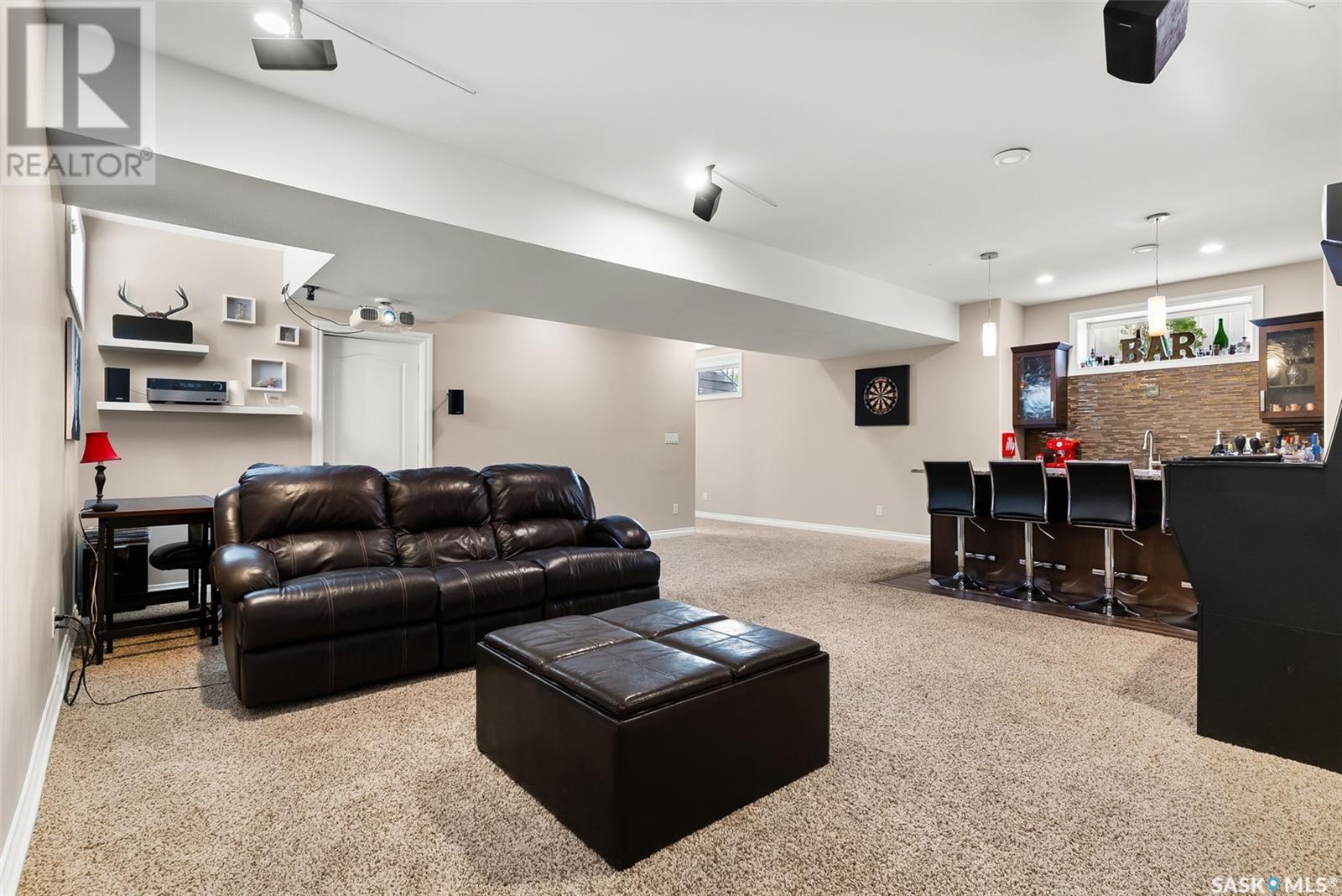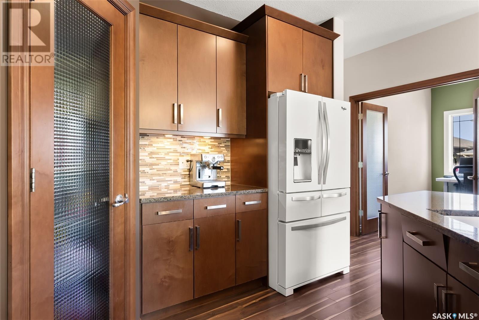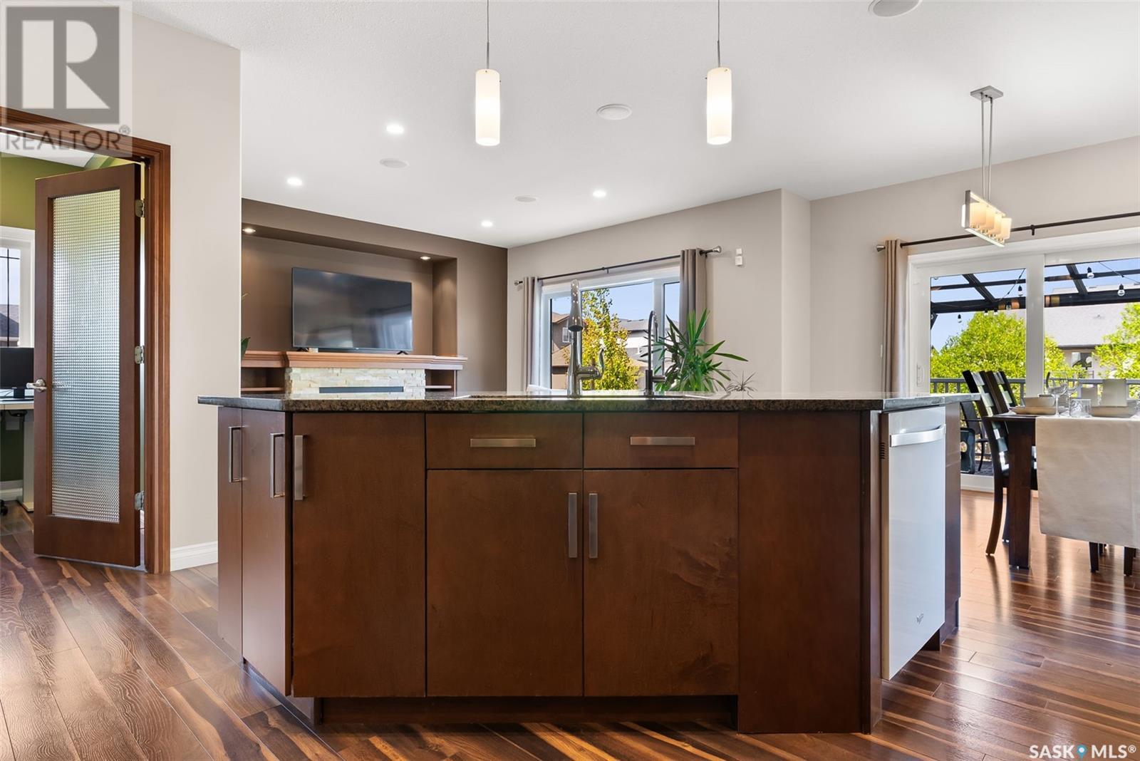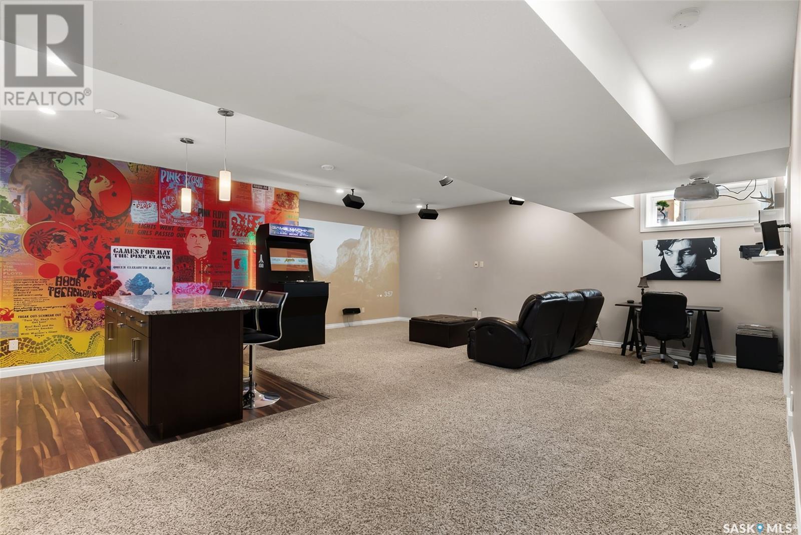 Get all the benefits of a large corner lot—without the hassle. Welcome to 4302 Skinner Place, a custom Crawford home on a quiet crescent in Harbour Landing. Lovingly maintained by its original owners, this 2-storey offers over 2,000 sq ft plus a fully finished basement—blending smart design with premium upgrades. This home is built on piles for added structural integrity. The main floor includes a spacious foyer, private office, and an open-concept living, dining, and kitchen area. The chef’s kitchen features real wood soft-close cabinetry, granite counters, deep drawers, dual spice racks, extended-height cabinets, a walk-in pantry, and built-in ceiling speakers extending to the dining, living room, and backyard. Upstairs offers three bedrooms, each with custom walk-in closets, a bonus room (potential 4th bedroom), full bath, and laundry room with soundproofing. The primary suite includes a 5-pc ensuite and added sound insulation. The basement boasts high ceilings, a projector-ready media area with ceiling speakers, a custom wet bar, and large rec room with space to add a bedroom. All rooms include ethernet ports, cable conduits, high-power outlets, and reinforced walls for clean TV mounting. Enjoy a spacious backyard with a composite deck, raised gardens, mature trees, firewood/tool shed, string lights, and a 20-ft concrete pad under the deck for storage. A concrete walkway wraps the home with gated access on both sides. The extended front porch features dual stairs and coordinated stonework. Extras: granite counters throughout, oversized windows, spray-foam insulated garage, and no sidewalk—saving you winter work. This custom home shows pride of ownership and is a rare Harbour Landing gem. (id:43042)