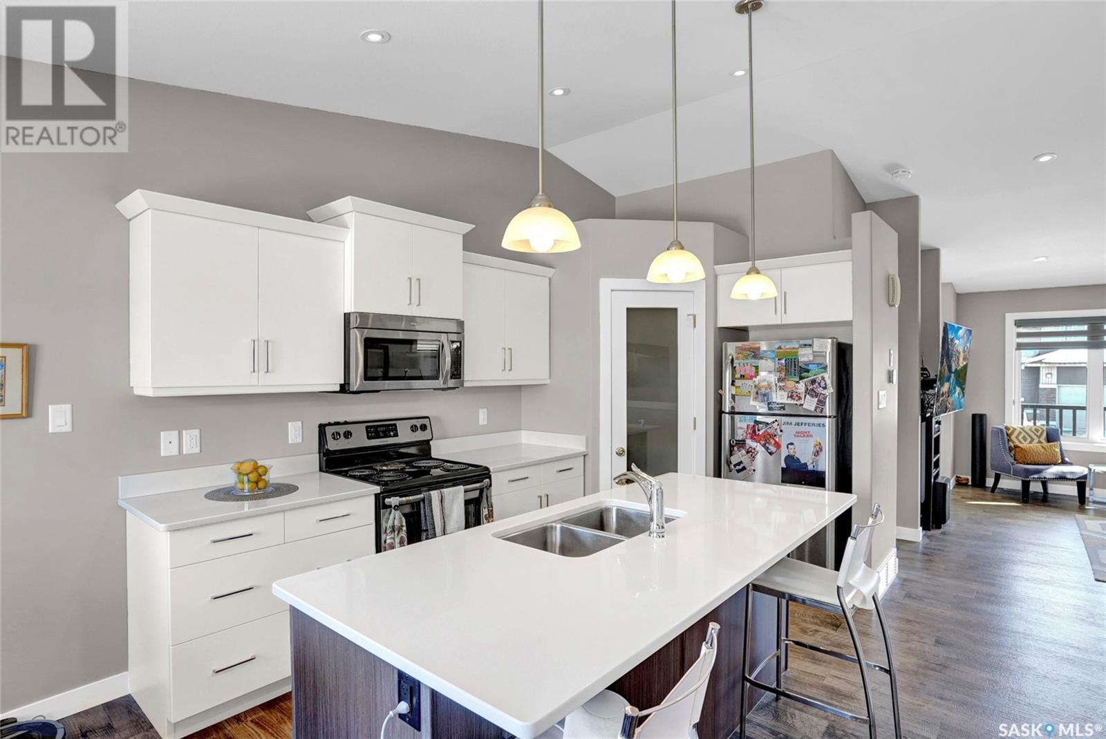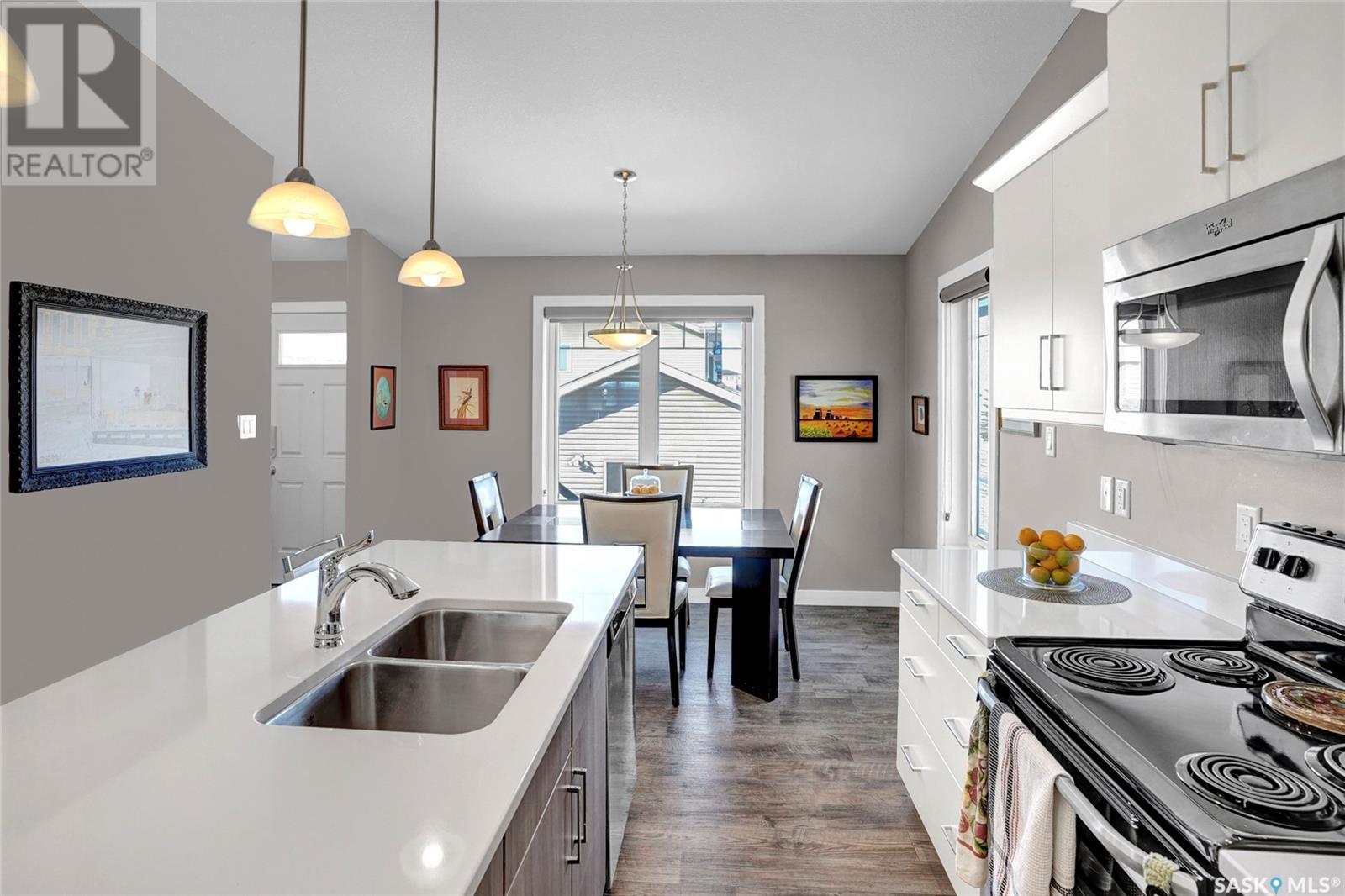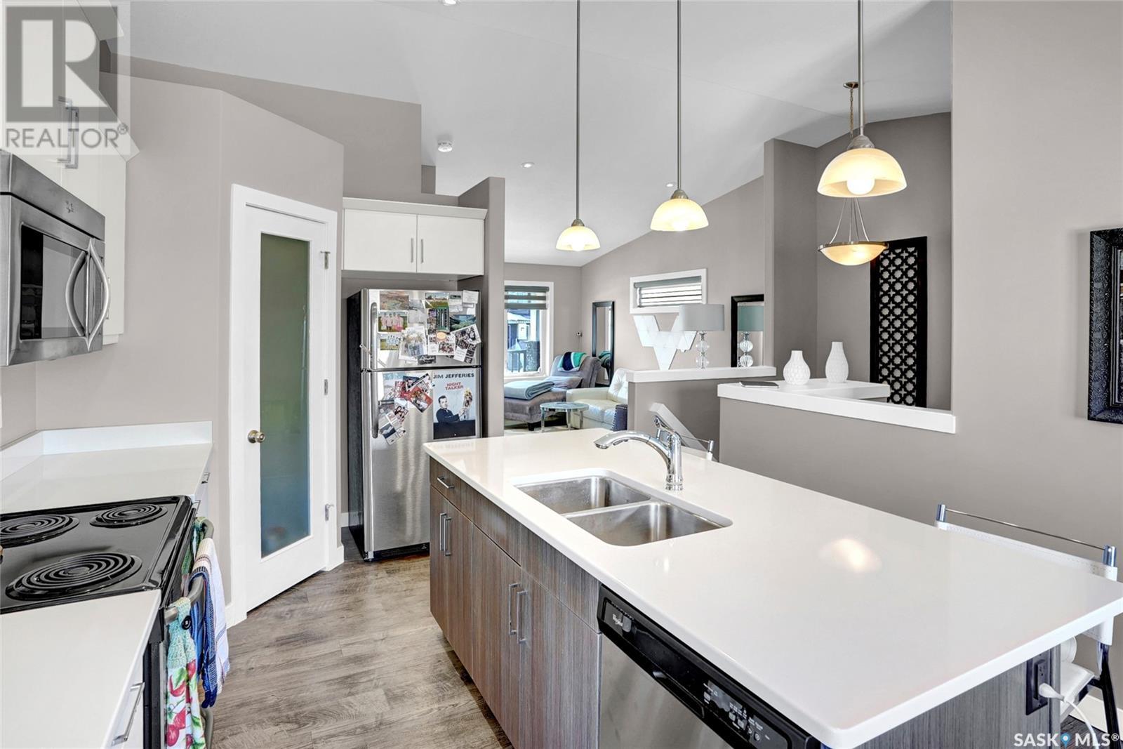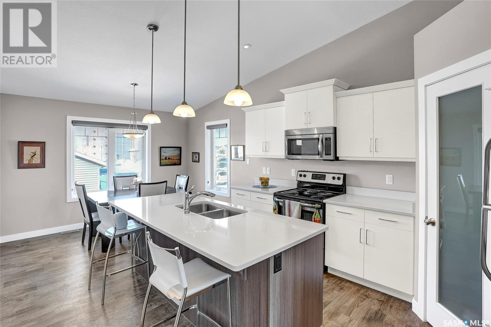Excellently maintained former show home located in Harbour Landing. Three bedroom bungalow with a huge front foyer. Bright home with loads of natural light flooding into the home. The main floor is living space and the lower level is developed for your sleeping space. Open floor plan with vaulted ceilings in spacious living room, beautiful kitchen with vaulted ceilings, loads white shaker style cabinets, quartz counter tops, corner walk-in pantry, huge island with accent darker cabinets, undermount sink, built-in microwave and SS appliances. Half bath completes the main floor. Bright lower level features three bedrooms, full 5 piece bathroom with dual sinks, and laundry room. Basement has spray foam insulation. Gorgeous backyard that is nicely landscaped with a great deck & lawn area. Double detached garage off back lane is insulated, heated, and has a NEMA 14-50 plug for electric vehicle. Underground sprinklers in front and side yard. PVC fencing. Truly a great place to call home! (id:43042)