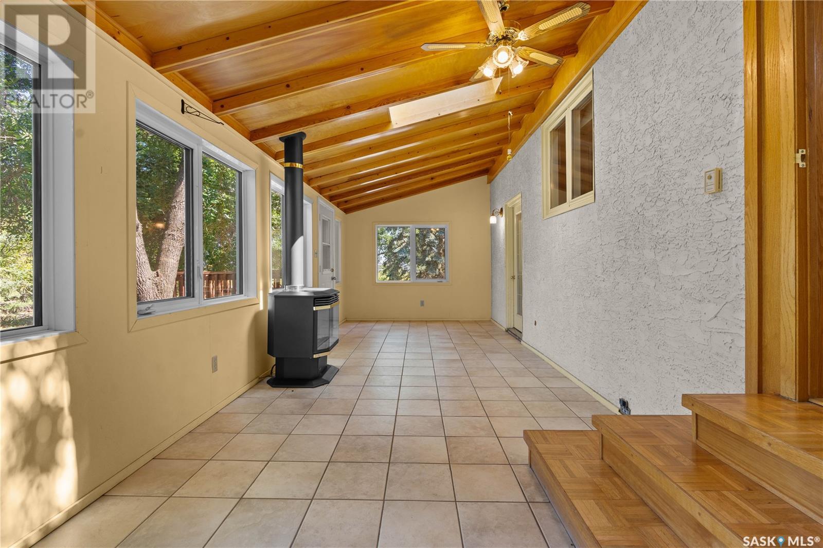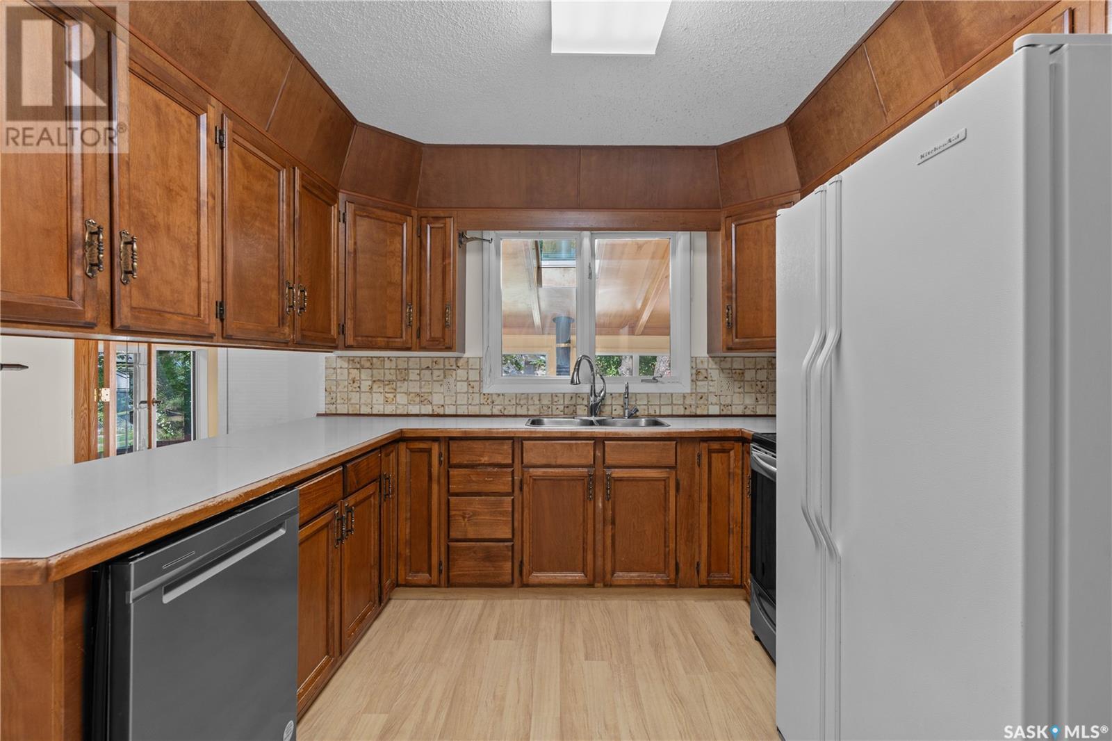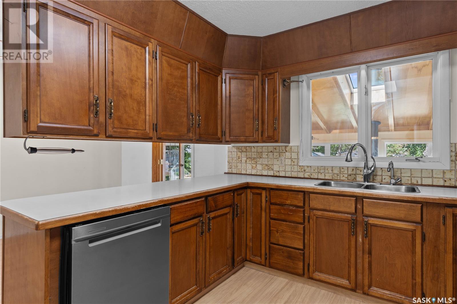 This 1176 square foot original owner, 5 bedroom bungalow has been lovingly cared for and features large living room, maple wood kitchen cabinets with large separate eating area, and built-in dishwasher. 3 good bedrooms and 4 piece bath on the main, main floor dedicated laundry room. Basement has large rumpus room, 2 bedrooms, 2 dens, and dedicated storage. Home has large 4 season sunroom with natural gas fireplace. Improvements throughout the years include new stucco, with 2 inches of Styrofoam insulation beneath high efficiency furnace, Central air conditioning, sunroom, triple pane, vinyl windows throughout Large deck off sunroom. All on a 100 x 125 lot, this flat and level home is ready for its new owners. (id:43042)
