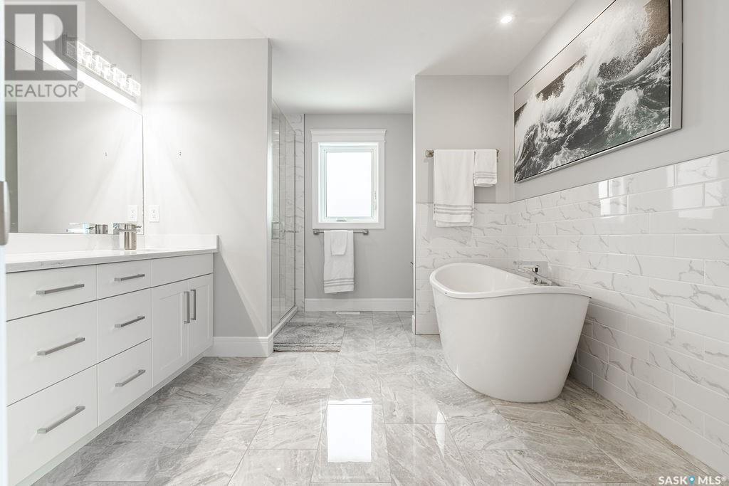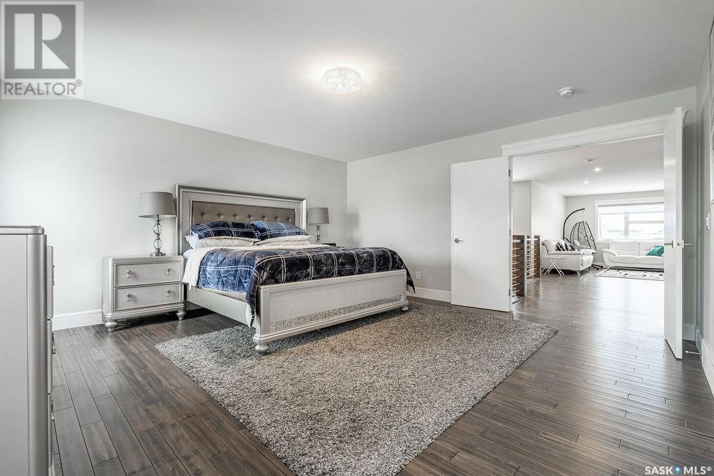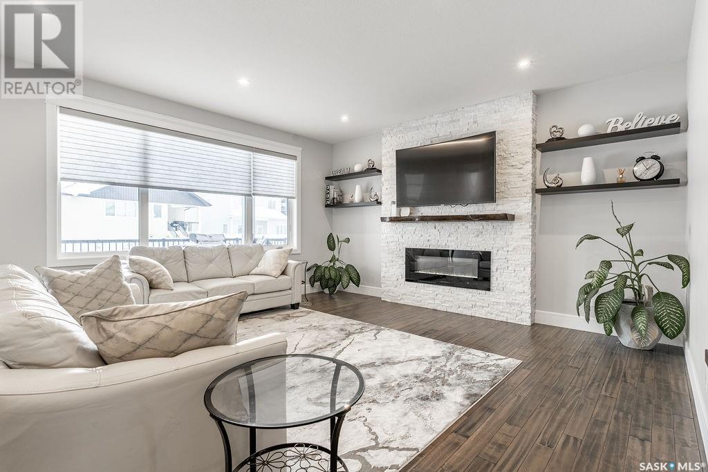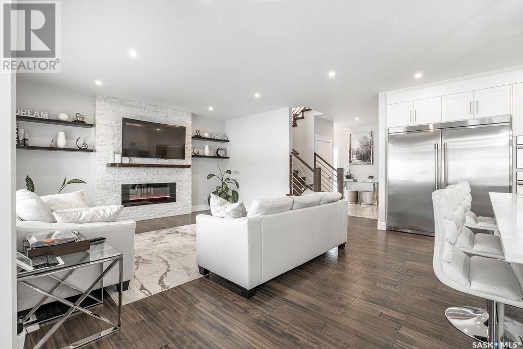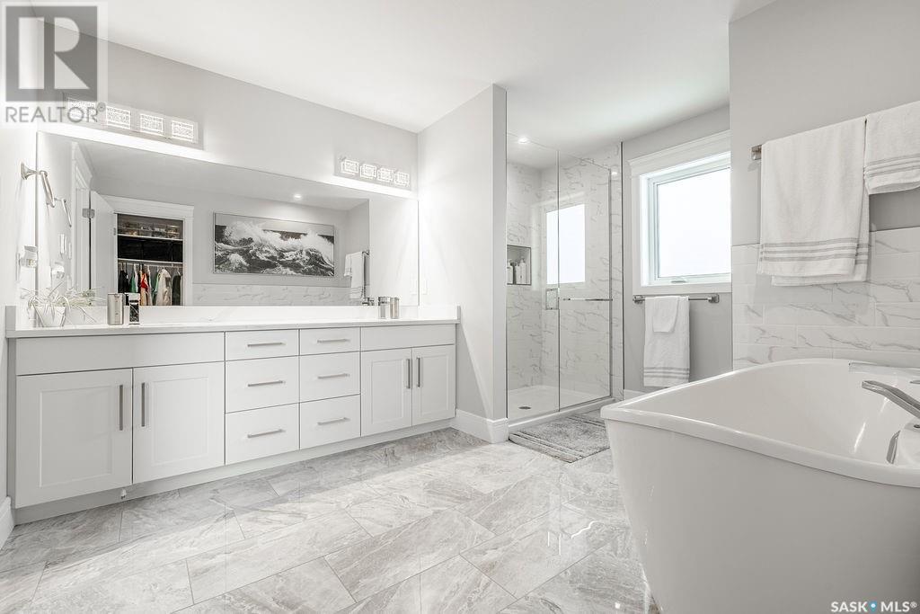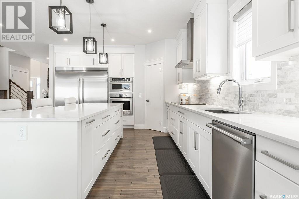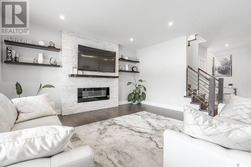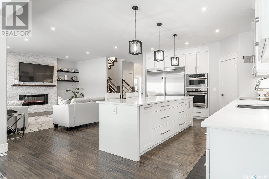 Elegance and function- Are you looking for the full package!? Extra-large 4 car garage, luxury finishes, bonus room, finished basement, oversized en suite and primary bedroom! Look no further, welcome to 515 Kenaschuk Way! No expense has been spared on this luxurious large fully-finished two-story. Porcelain tile and hand scraped hardwood throughout. Walk into a soaring two-story front entryway leading into your open concept main floor. The living room has a beautiful electric fireplace with a stone and live edge mantle and large windows overlooking the covered deck. The kitchen has an 11 foot eat-up island, full height white cabinets, professional-style appliances including induction cooktop and separate full-sized side-by-side fridge & freezer, wall oven, and walk-through pantry. The dining area has a wall of windows overlooking the backyard. Mudroom area to the garage and 2-piece powder room round out this floor. The open staircase over-looks the foyer and leads you to the spacious 2nd floor where you will find a large bonus room, three bedrooms, two bathrooms and a gorgeous laundry room. The primary en-suite has an elegant freestanding tub, walk-in glass shower, marble porcelain tile, in floor heat, a vanity with two sinks, a walk-in closet with fitted drawers and shelving. The basement includes two more bedrooms, family room, perfect wet bar for entertaining, utility room and another four piece bathroom. The backyard is fully fenced and has trees, lawn and a garden. The massive four car heated garage has a door that drives right through to the backyard. This house has been outfitted with blinds, air conditioning and beautiful landscaping. Close to all amenities and easy access to the Chief Mistawasis bridge. Call your agent for your showing today. (id:43042)