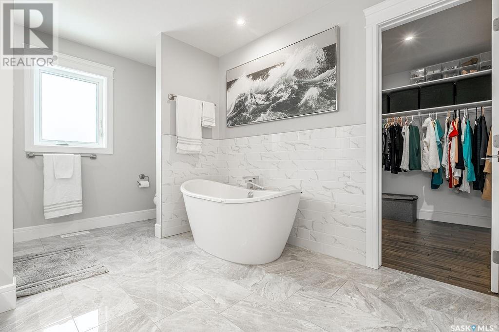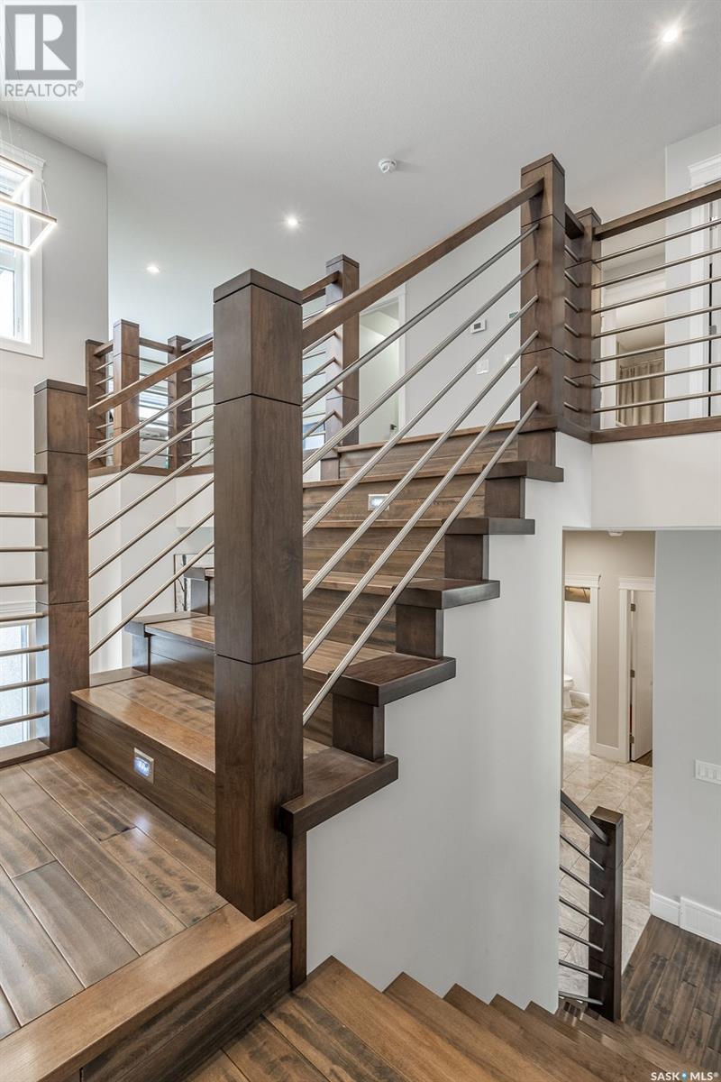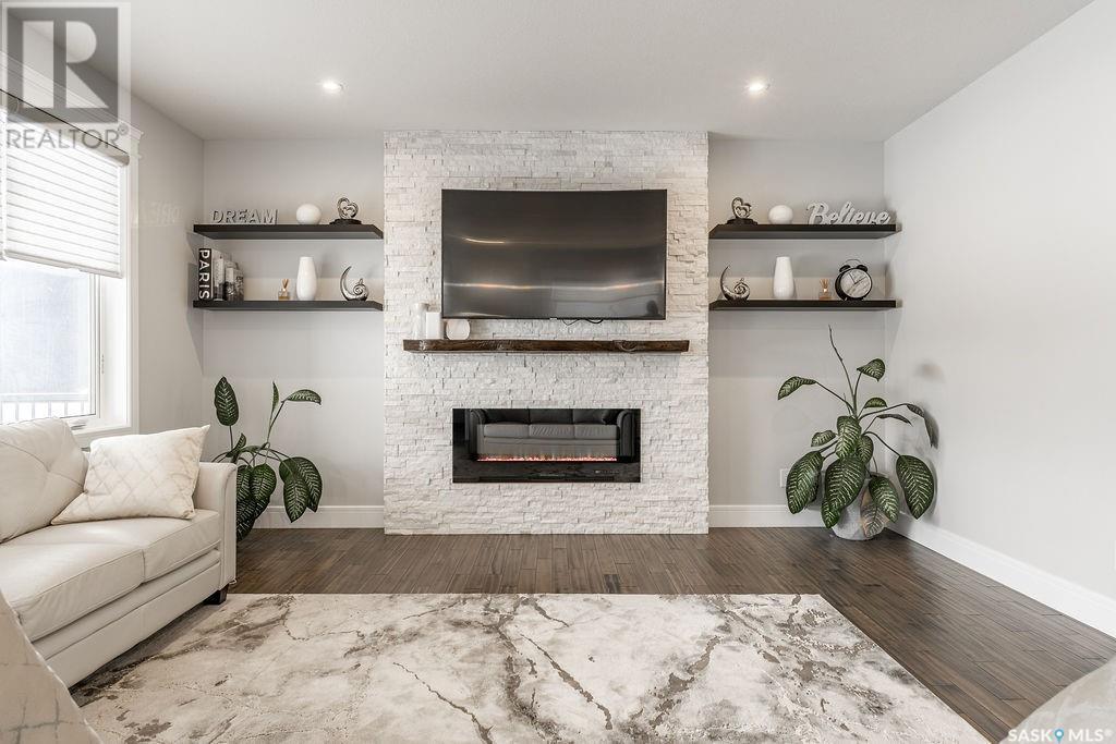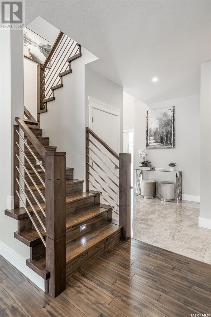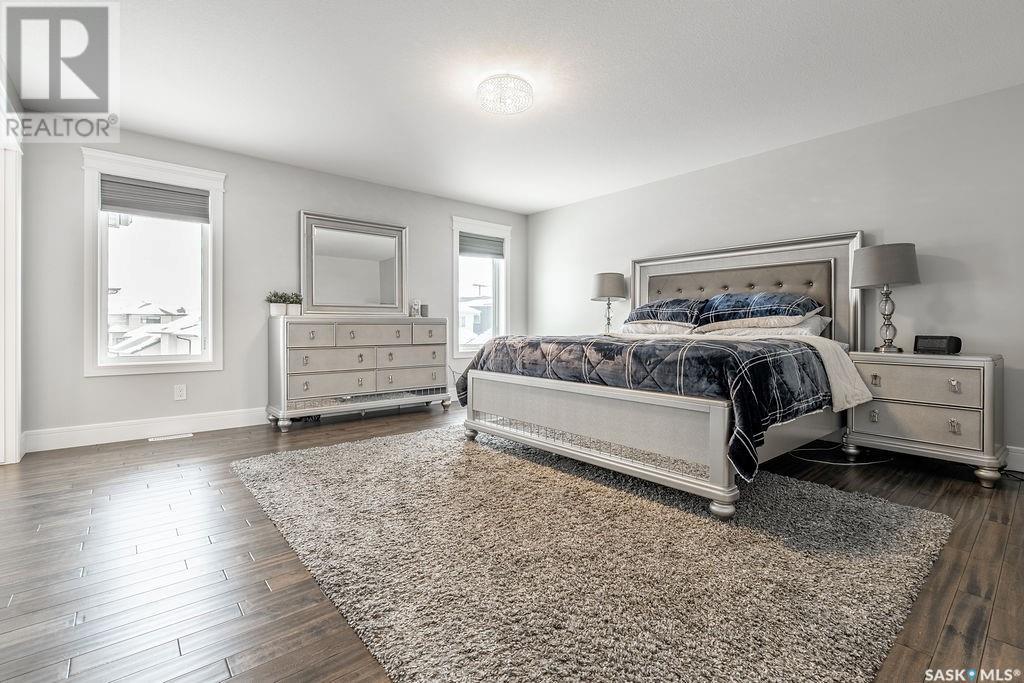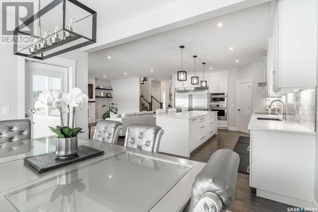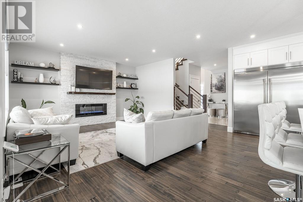Elegance and function- Are you looking for the full package!? Extra-large 4 car garage, luxury finishes, bonus room, finished basement, oversized en suite and primary bedroom! Look no further, welcome to 515 Kenaschuk Way! No expense has been spared on this luxurious large fully-finished two-story. Porcelain tile and hand scraped hardwood throughout. Walk into a soaring two-story front entryway leading into your open concept main floor. The living room has a beautiful electric fireplace with a stone and live edge mantle and large windows overlooking the covered deck. The kitchen has an 11 foot eat-up island, full height white cabinets, professional-style appliances including induction cooktop and separate full-sized side-by-side fridge & freezer, wall oven, and walk-through pantry. The dining area has a wall of windows overlooking the backyard. Mudroom area to the garage and 2-piece powder room round out this floor. The open staircase over-looks the foyer and leads you to the spacious 2nd floor where you will find a large bonus room, three bedrooms, two bathrooms and a gorgeous laundry room. The primary en-suite has an elegant freestanding tub, walk-in glass shower, marble porcelain tile, in floor heat, a vanity with two sinks, a walk-in closet with fitted drawers and shelving. The basement includes two more bedrooms, family room, perfect wet bar for entertaining, utility room and another four piece bathroom. The backyard is fully fenced and has trees, lawn and a garden. The massive four car heated garage has a door that drives right through to the backyard. This house has been outfitted with blinds, air conditioning and beautiful landscaping. Close to all amenities and easy access to the Chief Mistawasis bridge. Call your agent for your showing today. (id:43042)